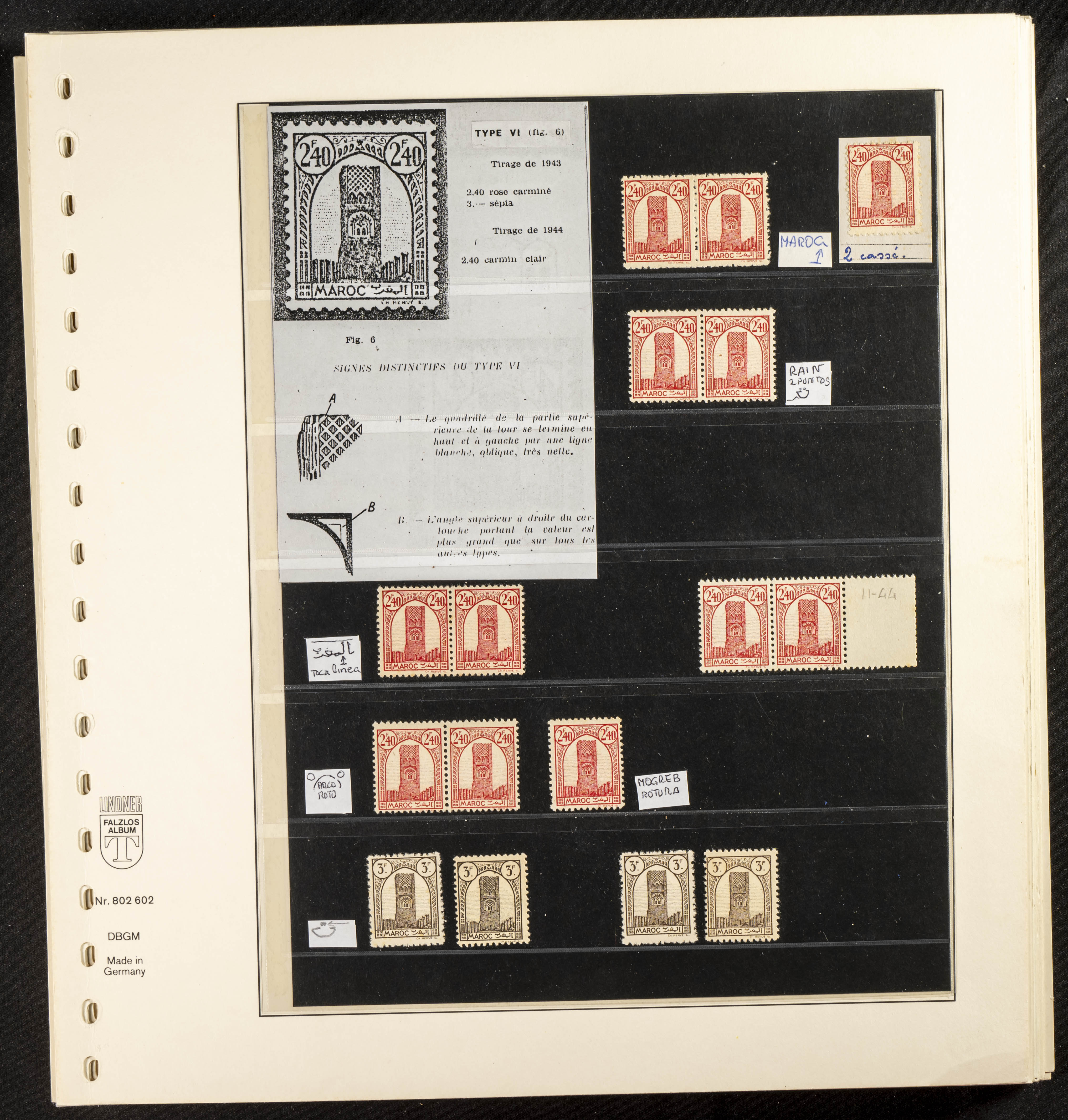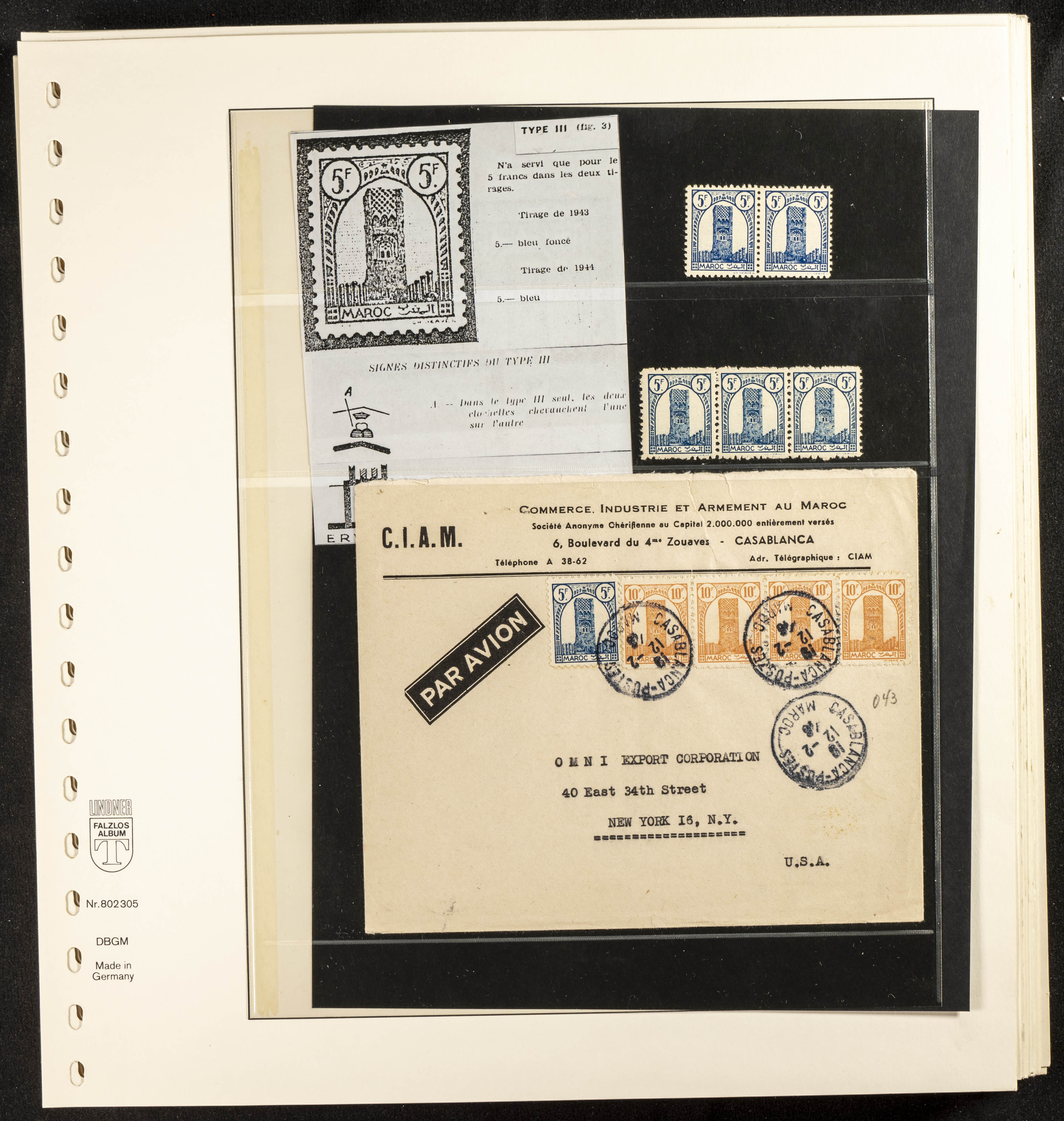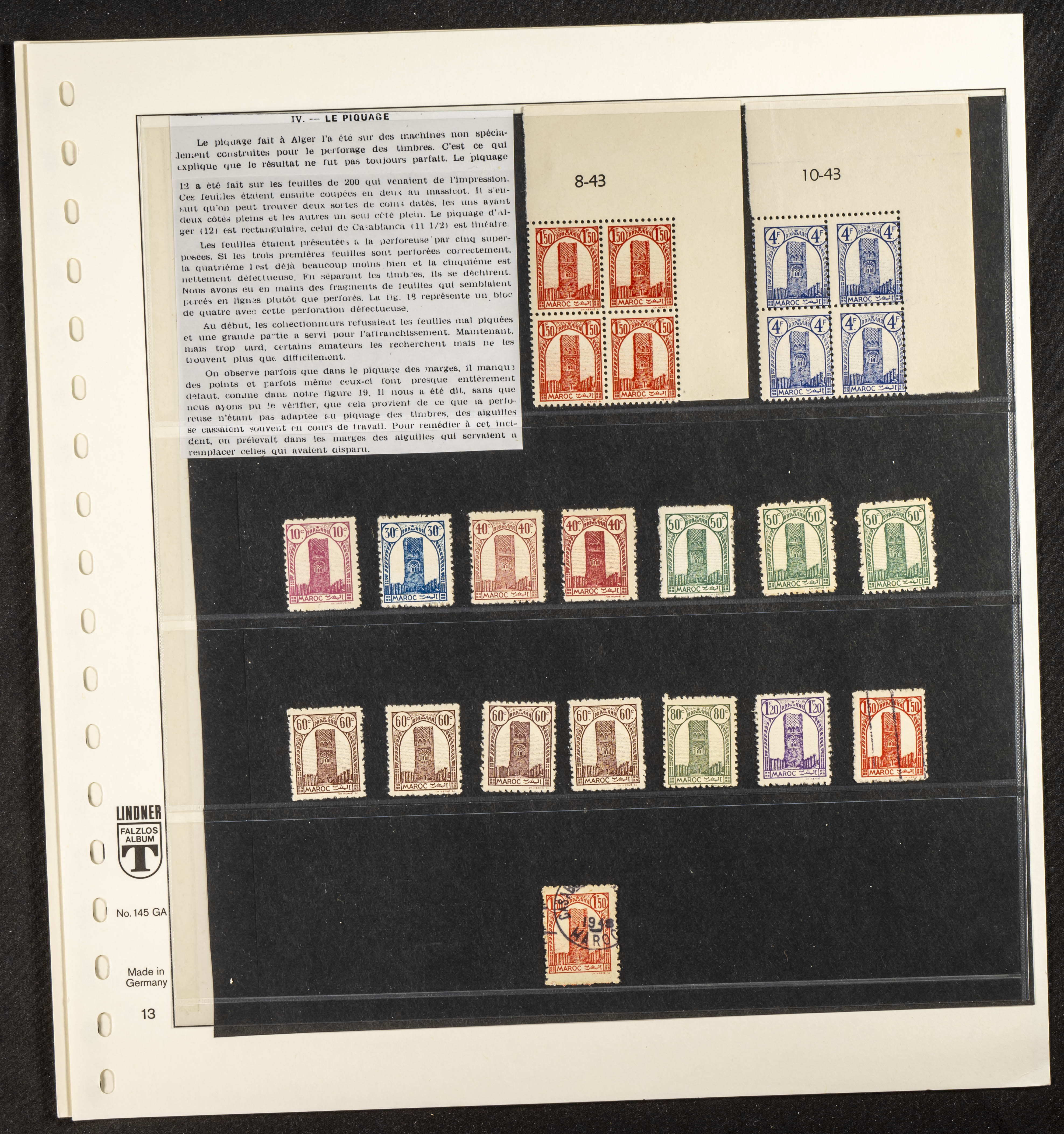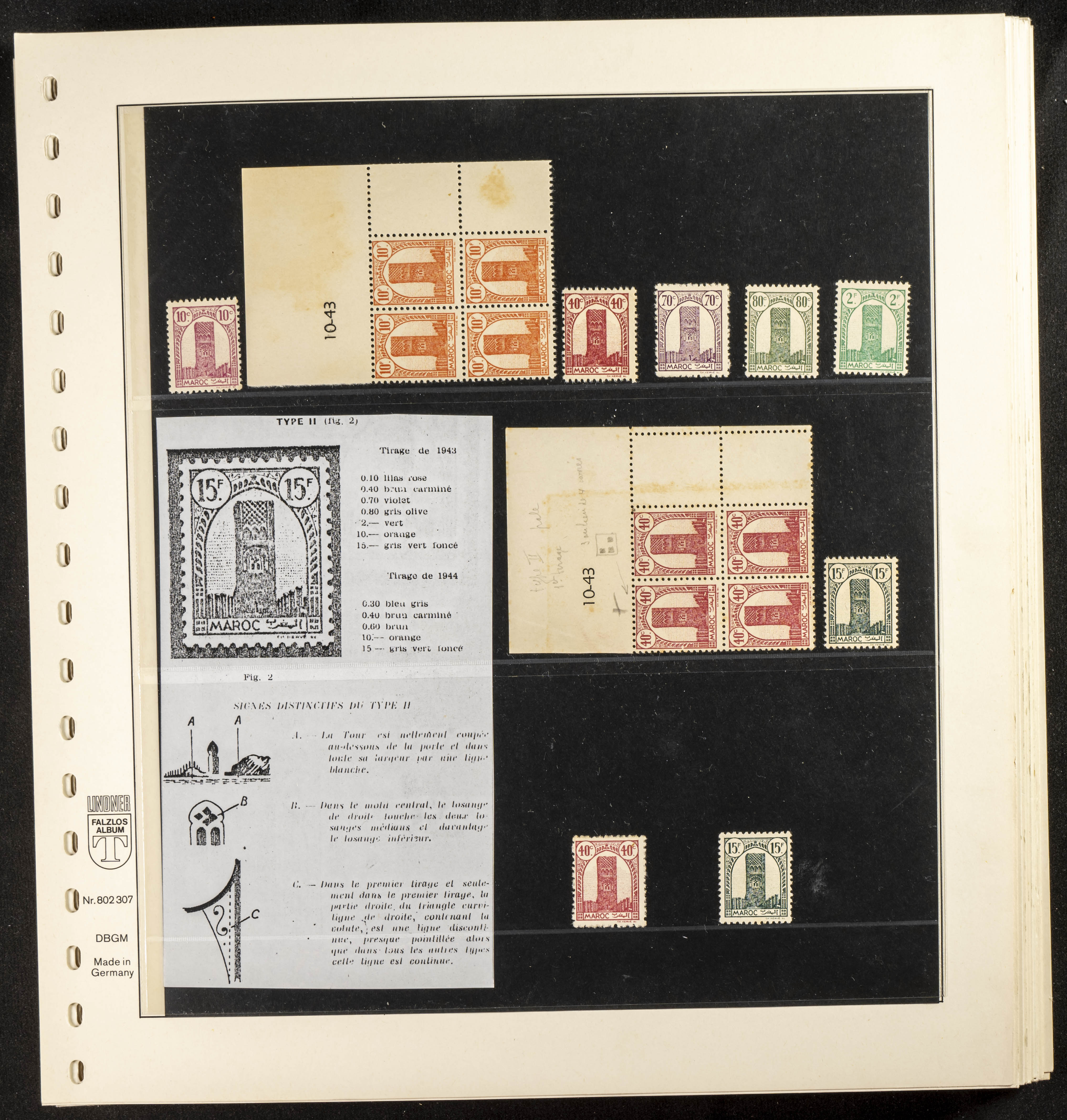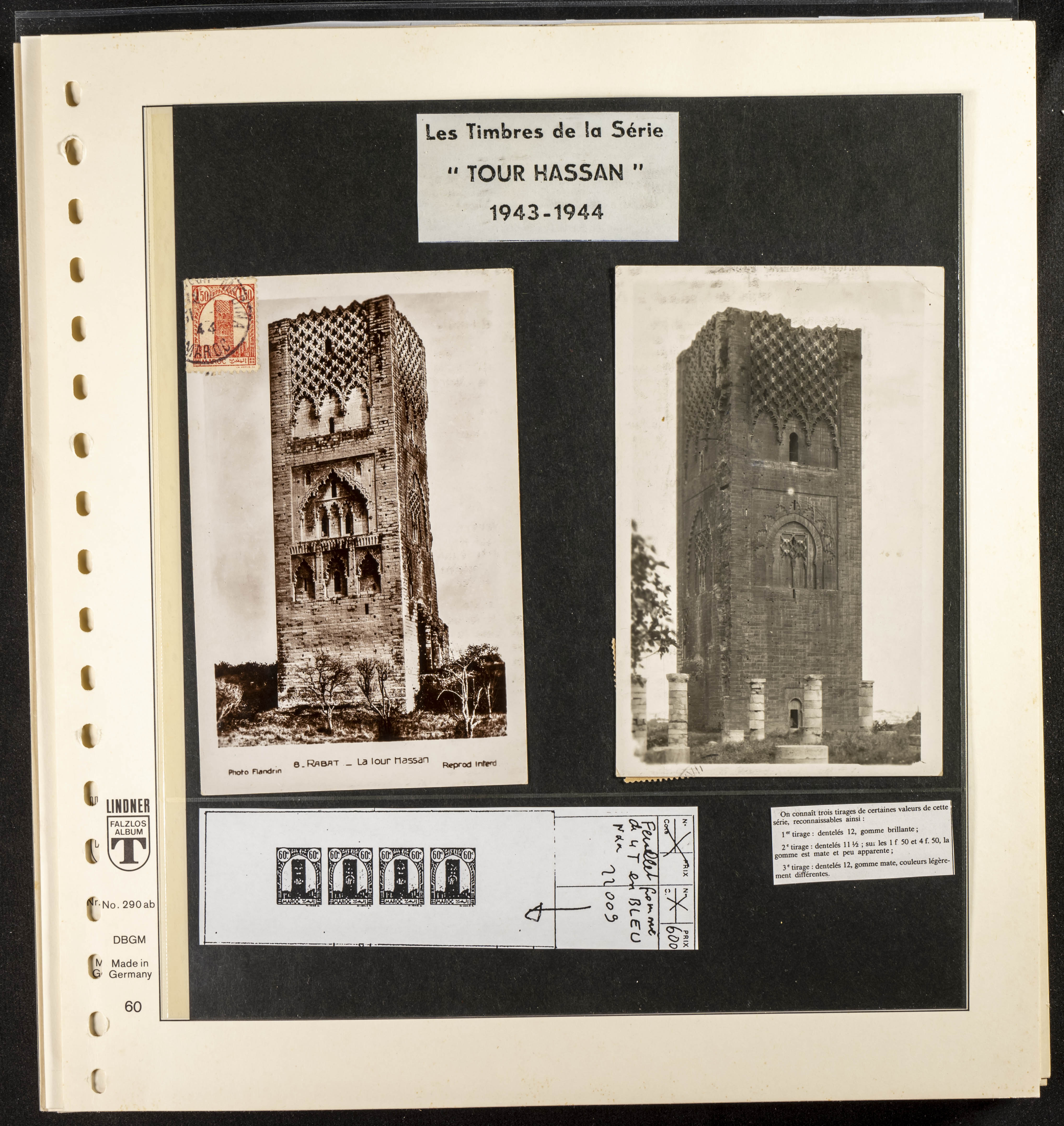 English ★/(1943ca). Spectacular collection specializing in the 1943 "Tour Hassan" issue, featuring stamp types (different print runs), perforation varieties (imperforate, partial, or offset), printing variations (backgroundless, cliché, etc.), and numerous circulated letters. HIGH CATALOG VALUE. EXAMINATION IS A MUST.