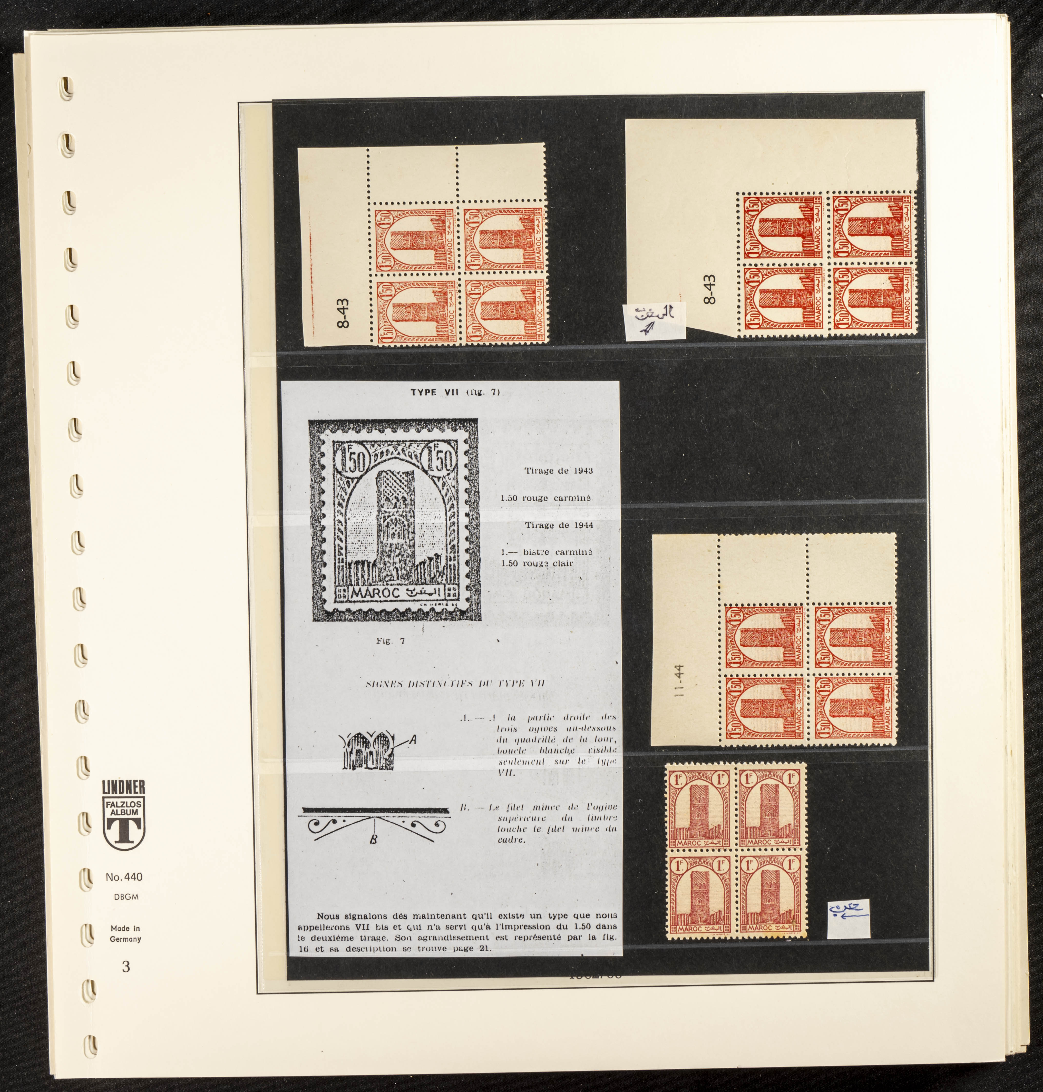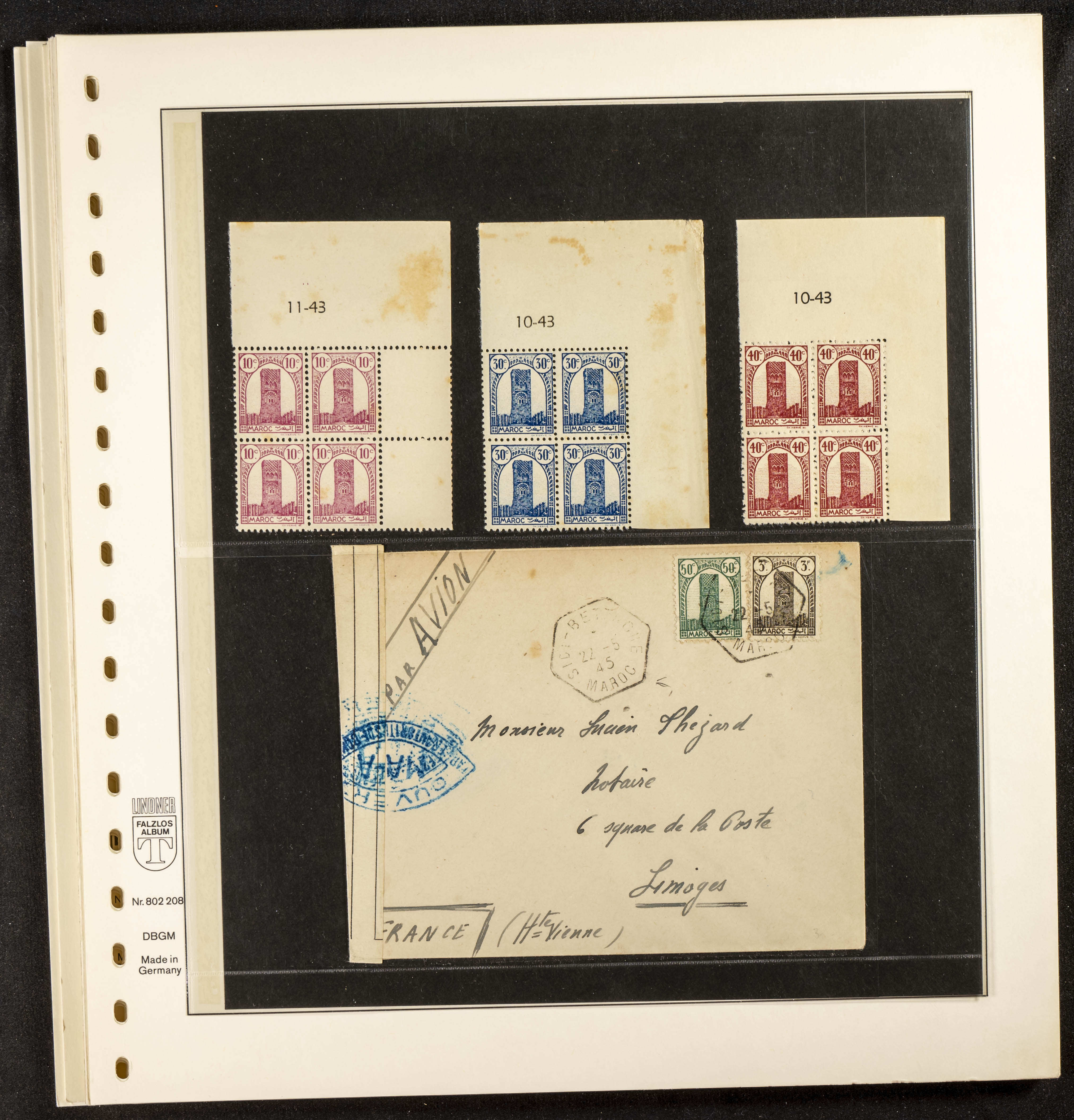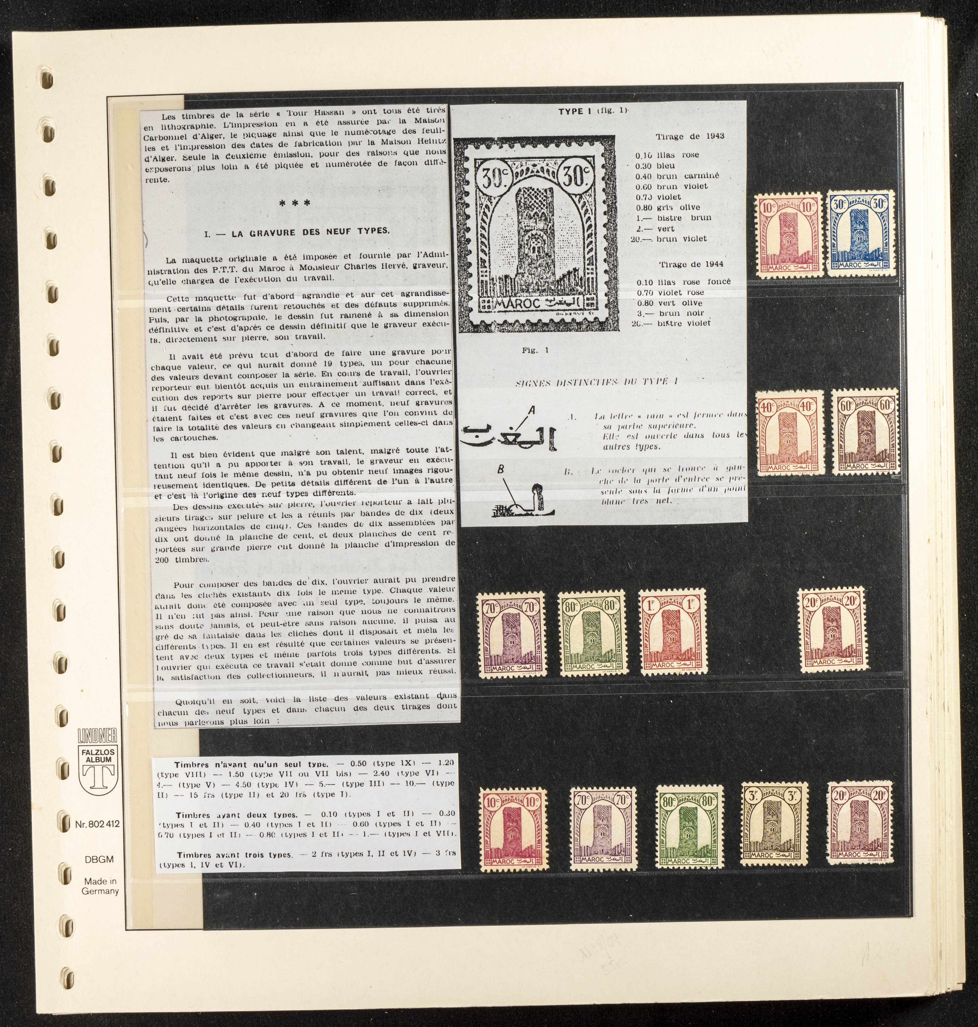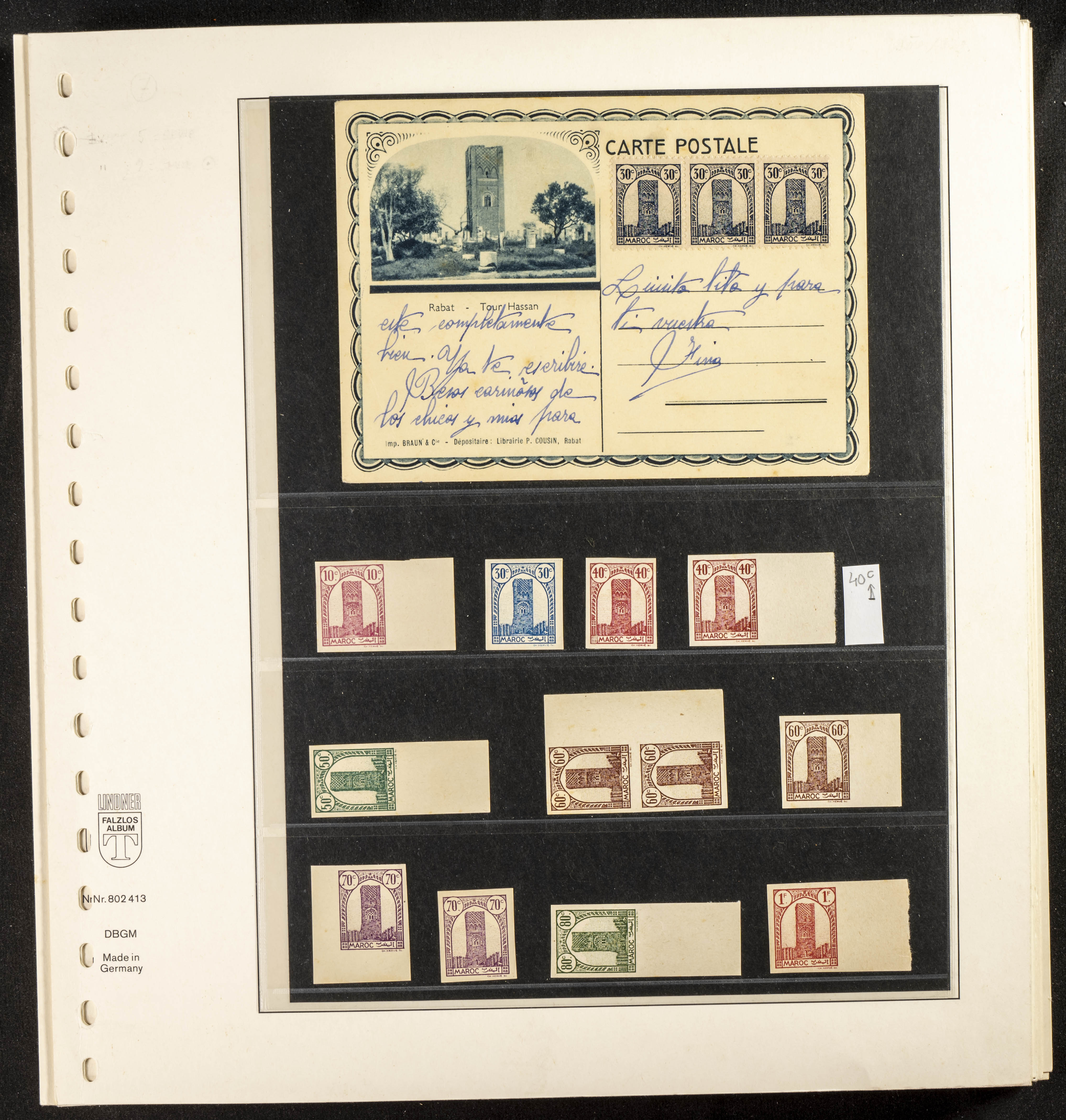 English ★/(1943ca). Spectacular collection specializing in the 1943 "Tour Hassan" issue, featuring stamp types (different print runs), perforation varieties (imperforate, partial, or offset), printing variations (backgroundless, cliché, etc.), and numerous circulated letters. HIGH CATALOG VALUE. EXAMINATION IS A MUST.