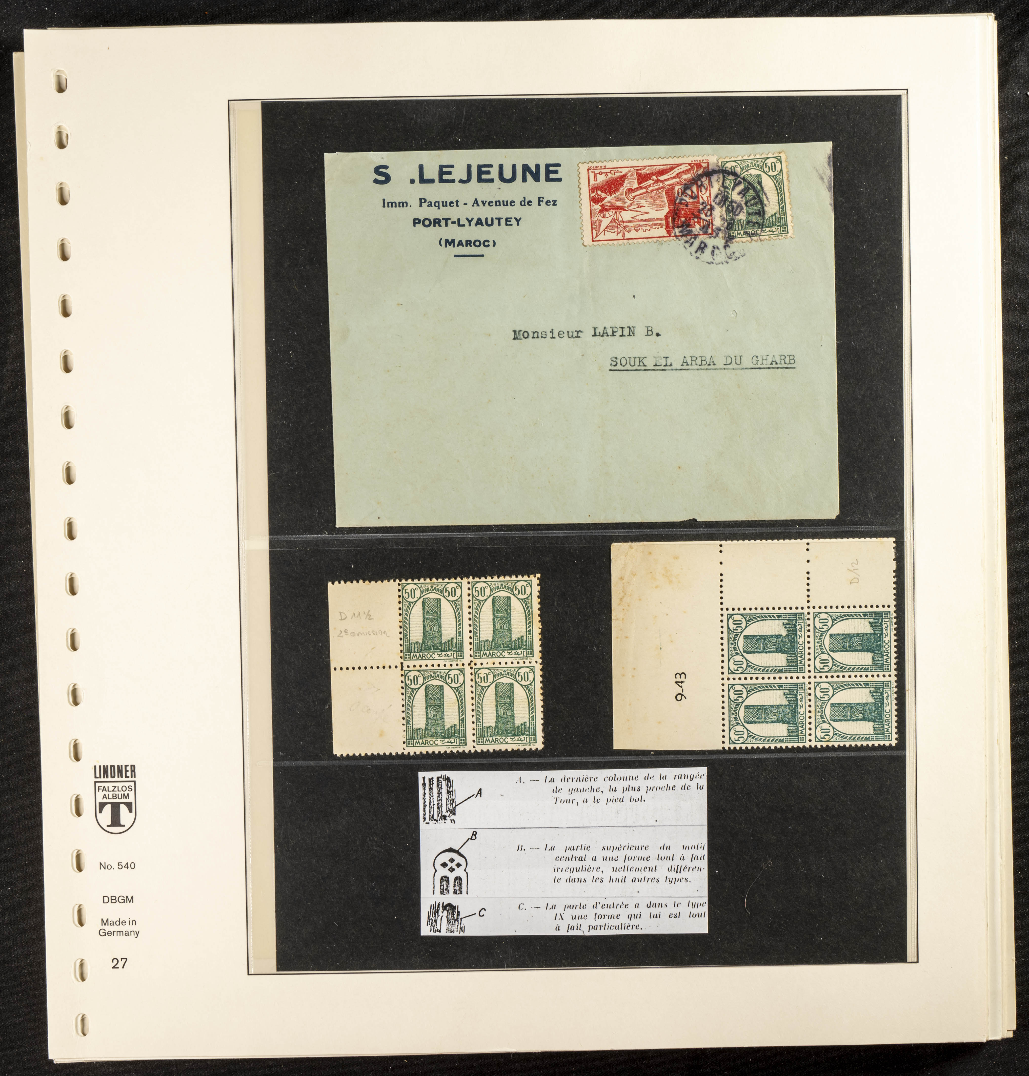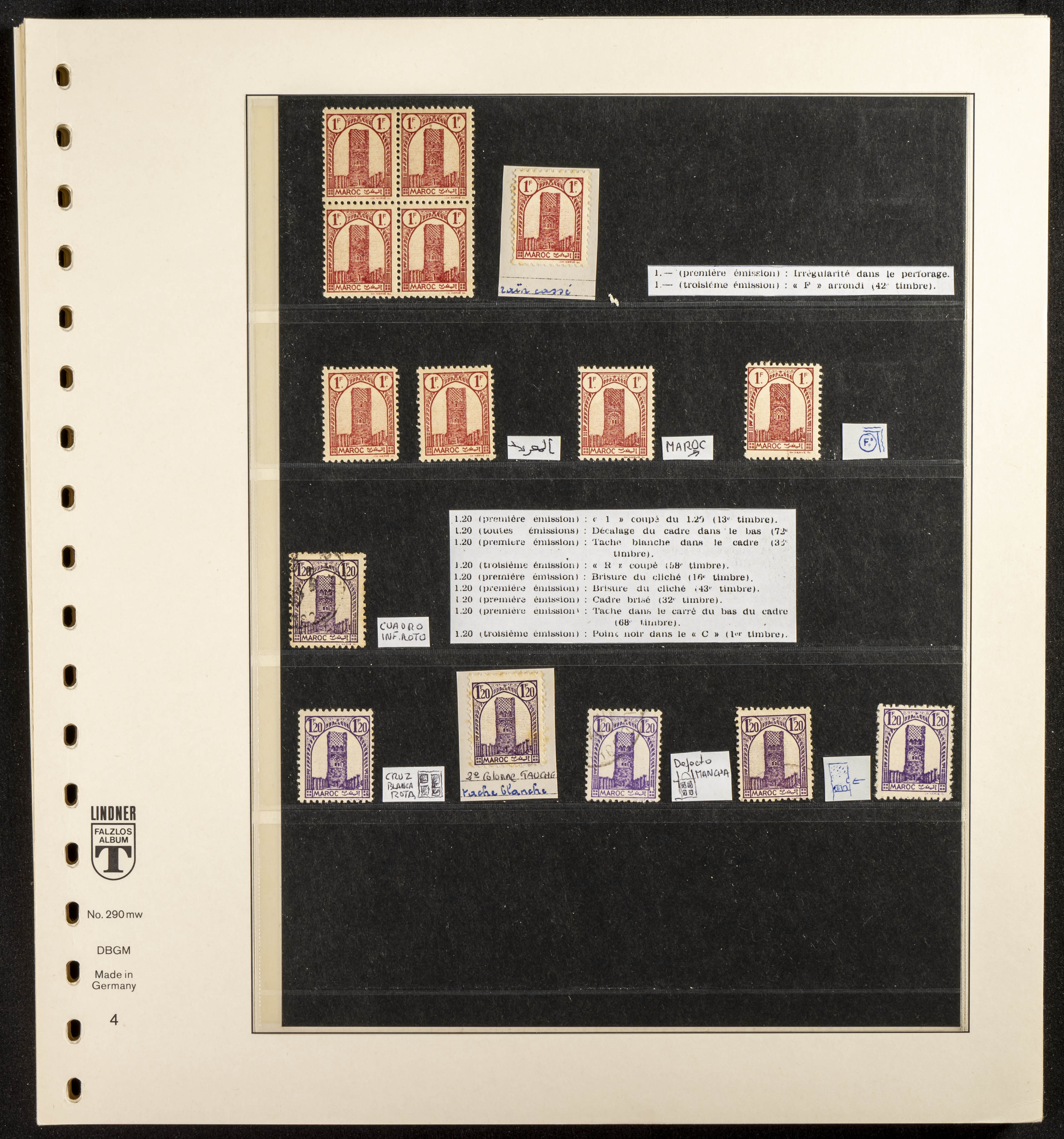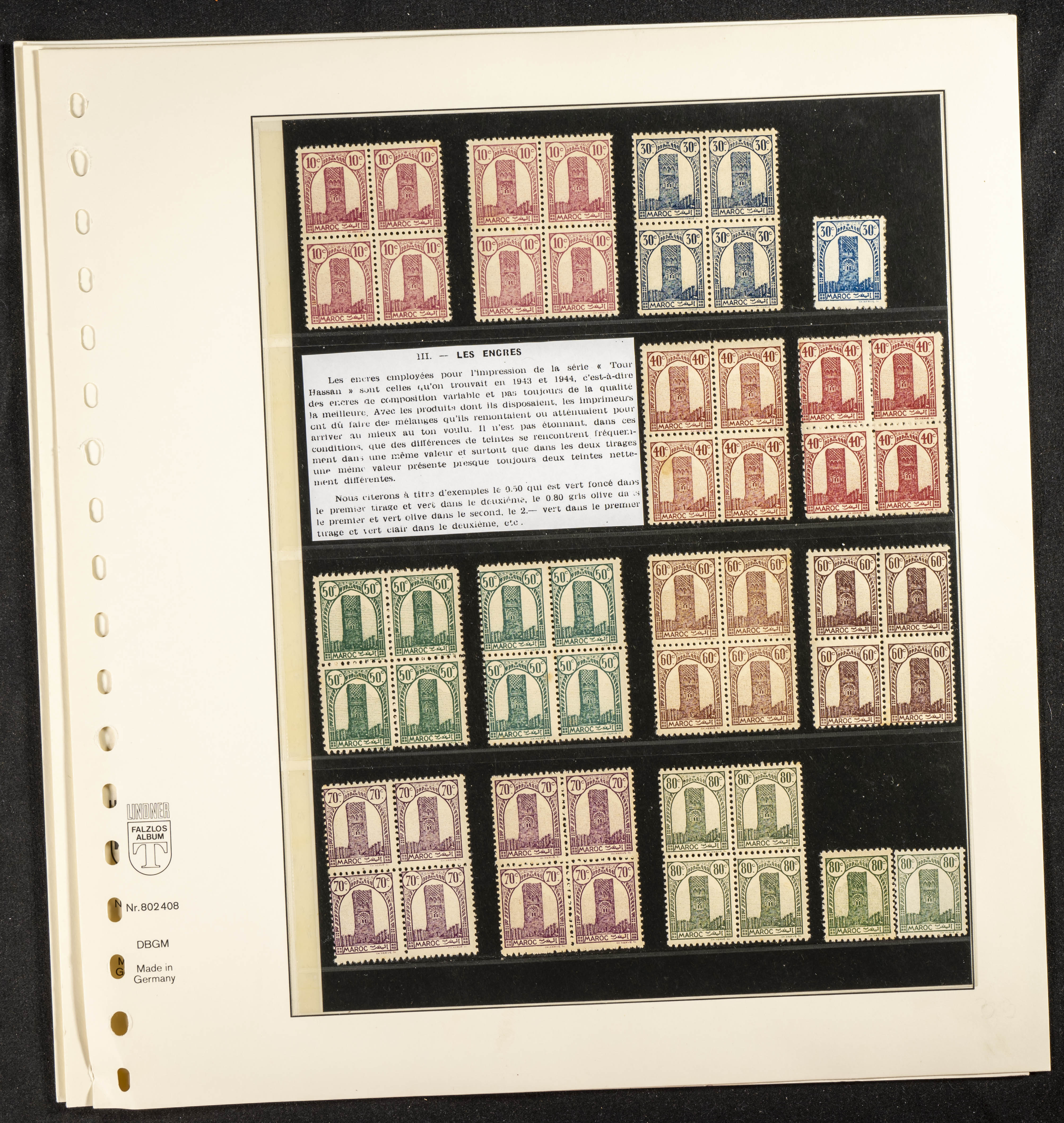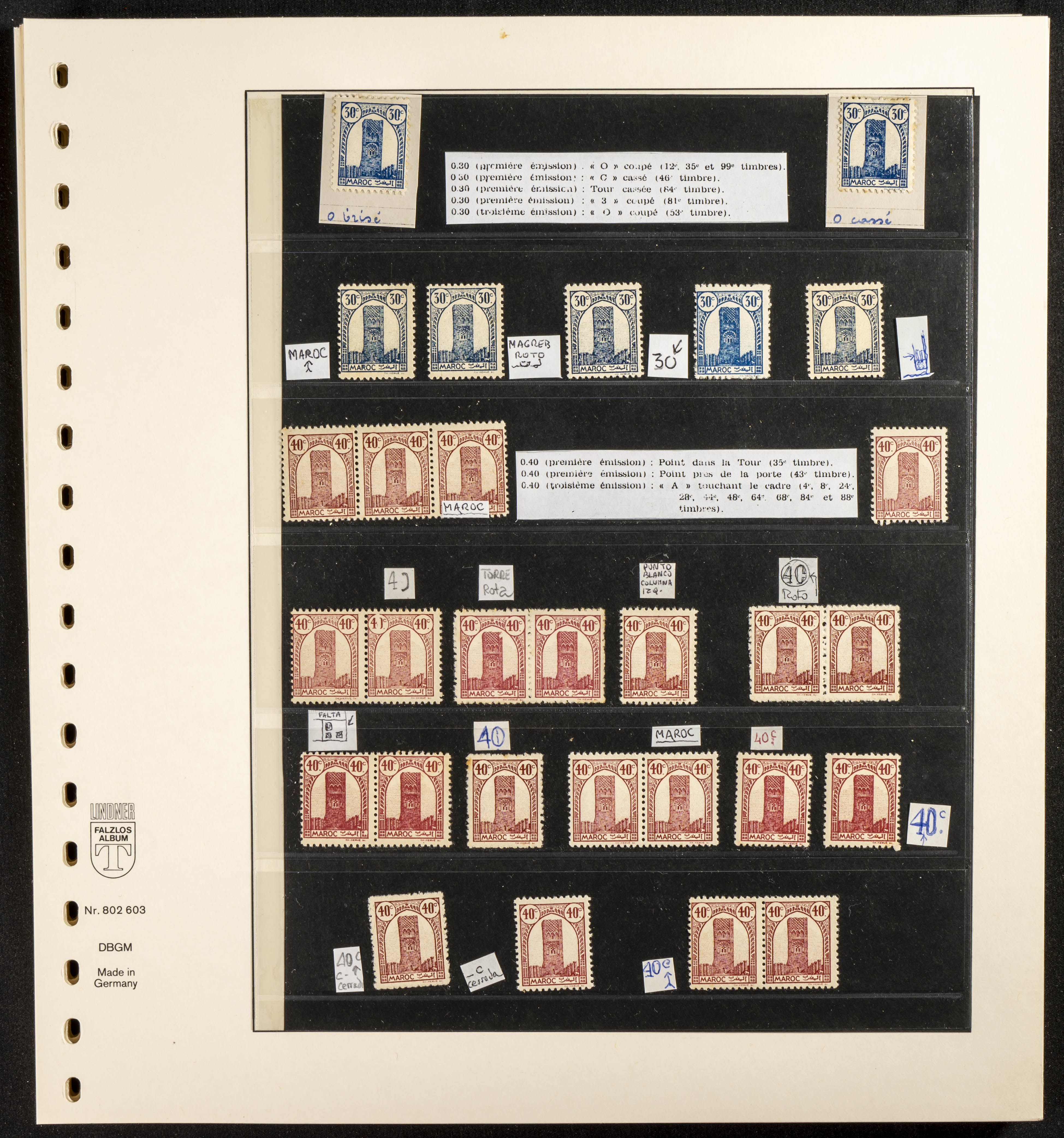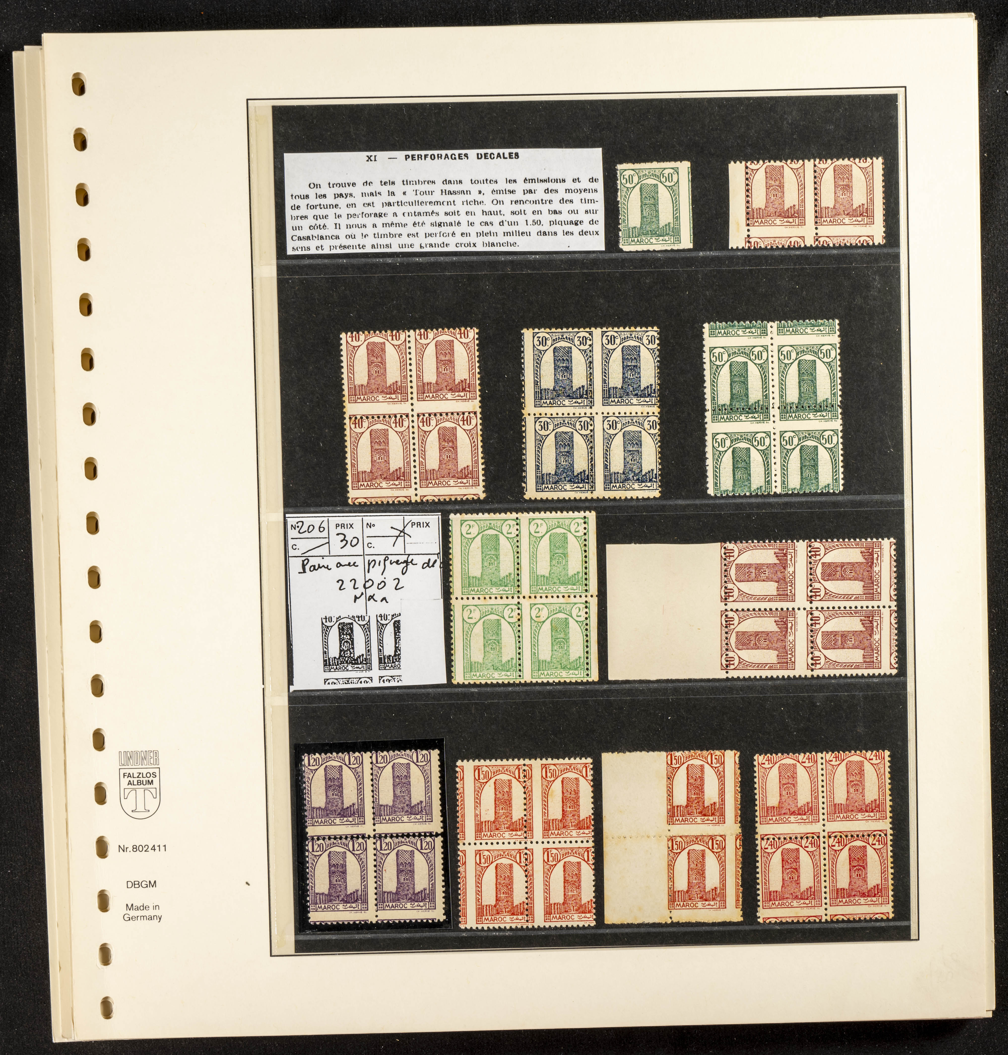 English ★/(1943ca). Spectacular collection specializing in the 1943 "Tour Hassan" issue, featuring stamp types (different print runs), perforation varieties (imperforate, partial, or offset), printing variations (backgroundless, cliché, etc.), and numerous circulated letters. HIGH CATALOG VALUE. EXAMINATION IS A MUST.