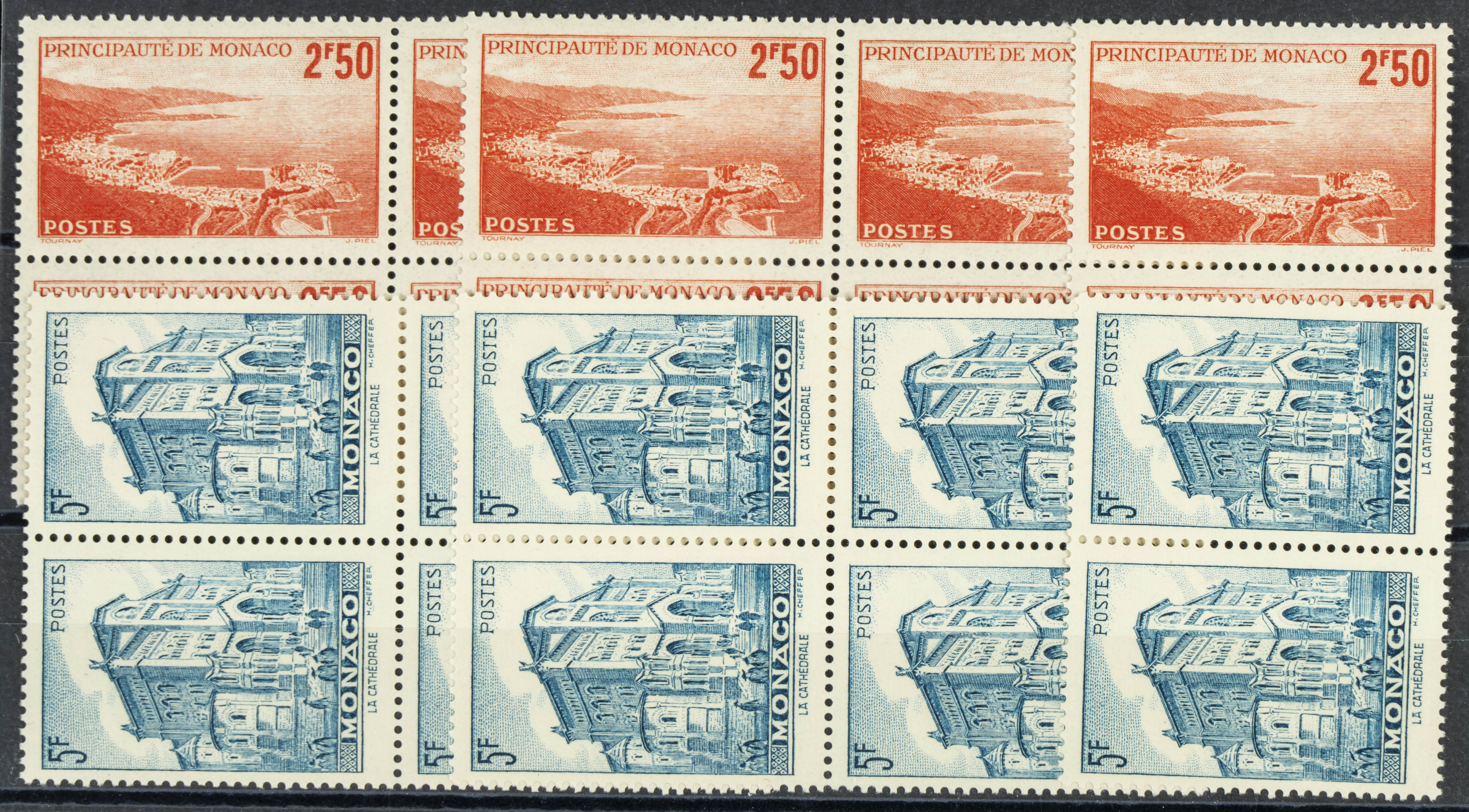 English Yvert 179(10), 181(10). 1939. Set of ten stamps of each denomination: 2.50 francs red and 5 francs blue-green (key values) from Monaco, 1939, in mint condition. TO BE EXAMINED. Yvert 2026: 640 Euros