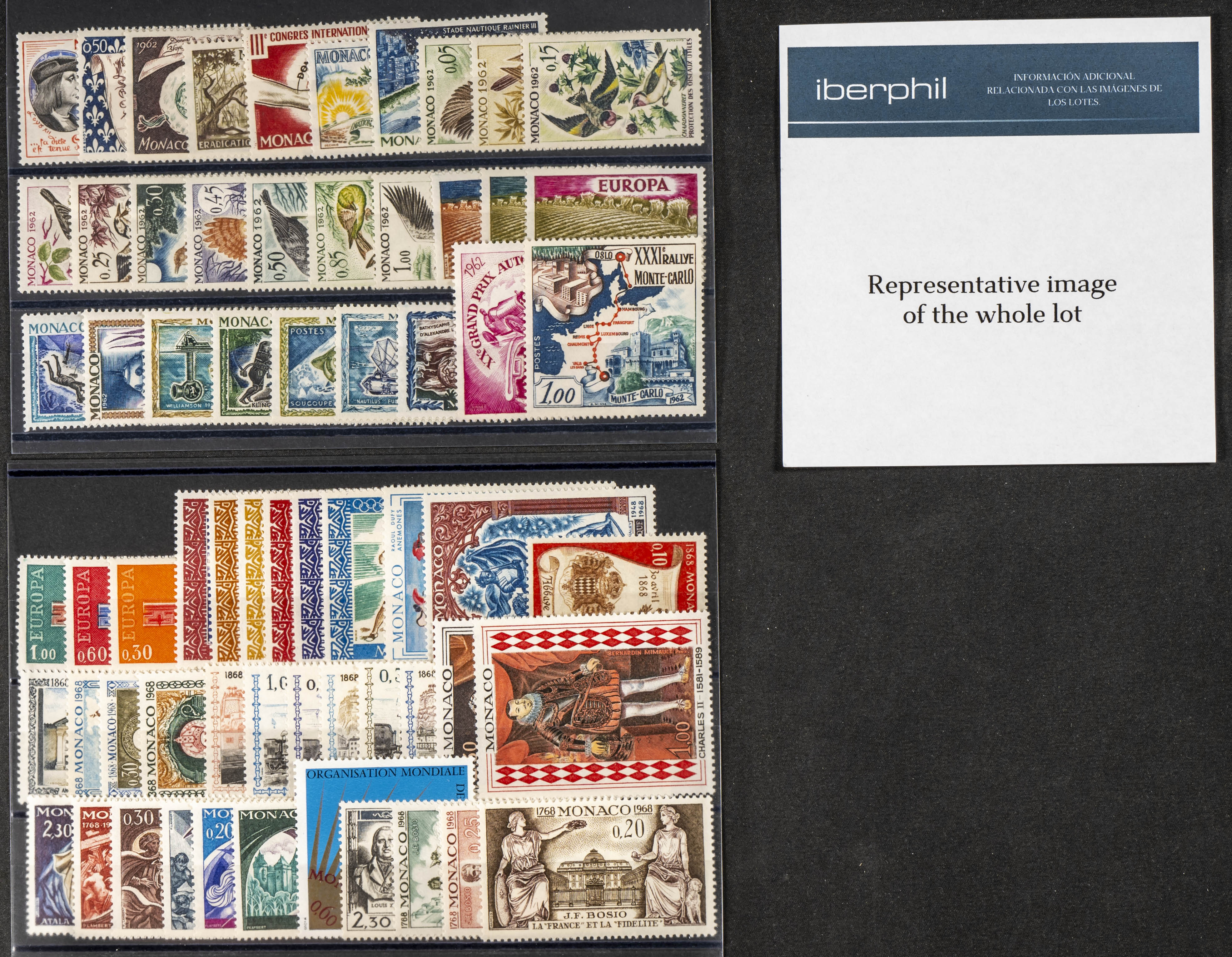 English Yvert 571/98(18). 1962. Complete set of eighteen years 1962 (ordinary mail only, twenty-eight stamps and 10-cent basic stamps) from Monaco, mint condition (mounted on tokens). TO BE EXAMINED. Yvert 2026: 684 Euros