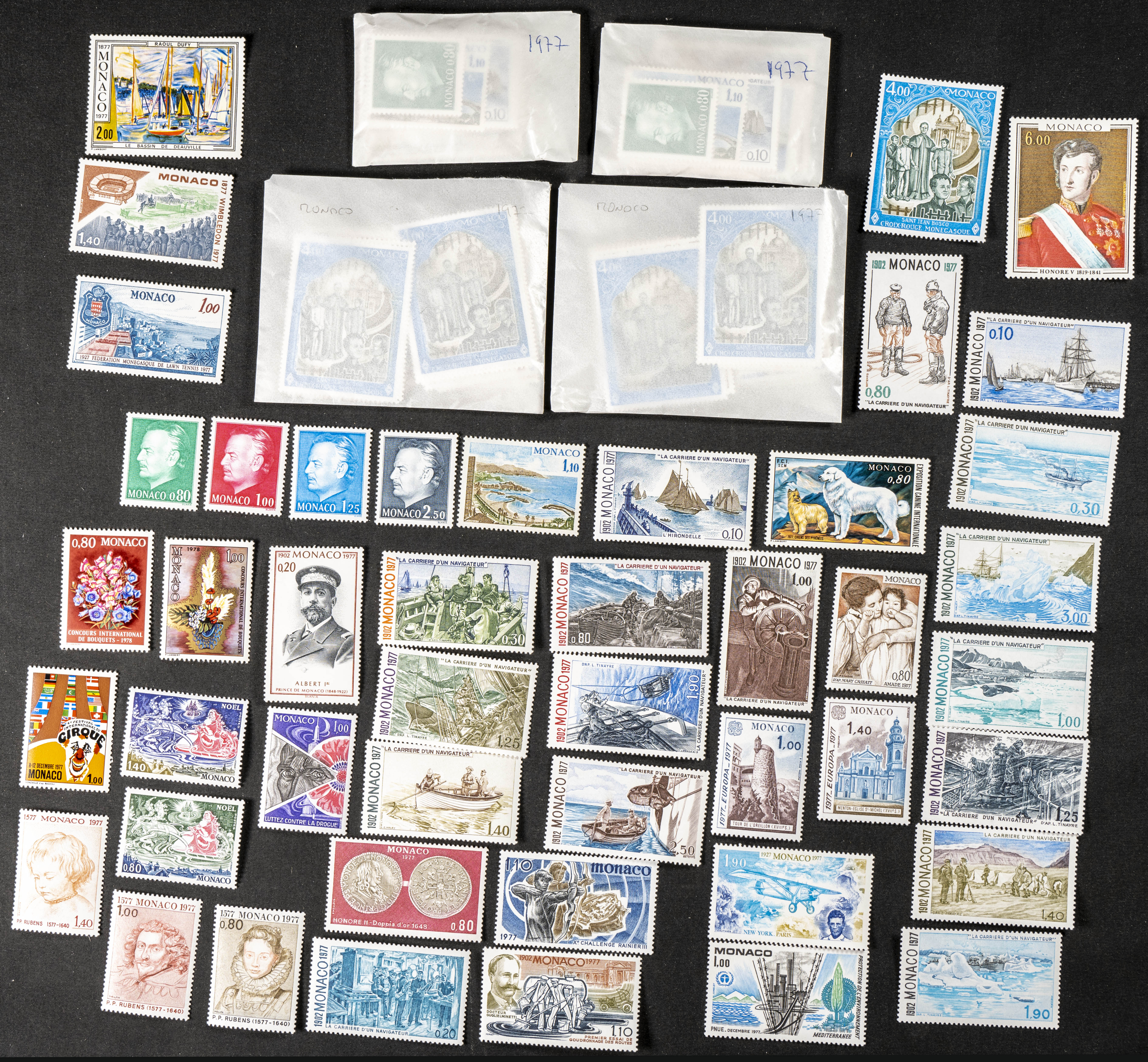 Yvert 1079/24. 1977. Complete set of seven years 1977 (ordinary mail only) from Monaco, mint condition (in glass envelopes). TO BE EXAMINED. Yvert 2026: 714 Euros