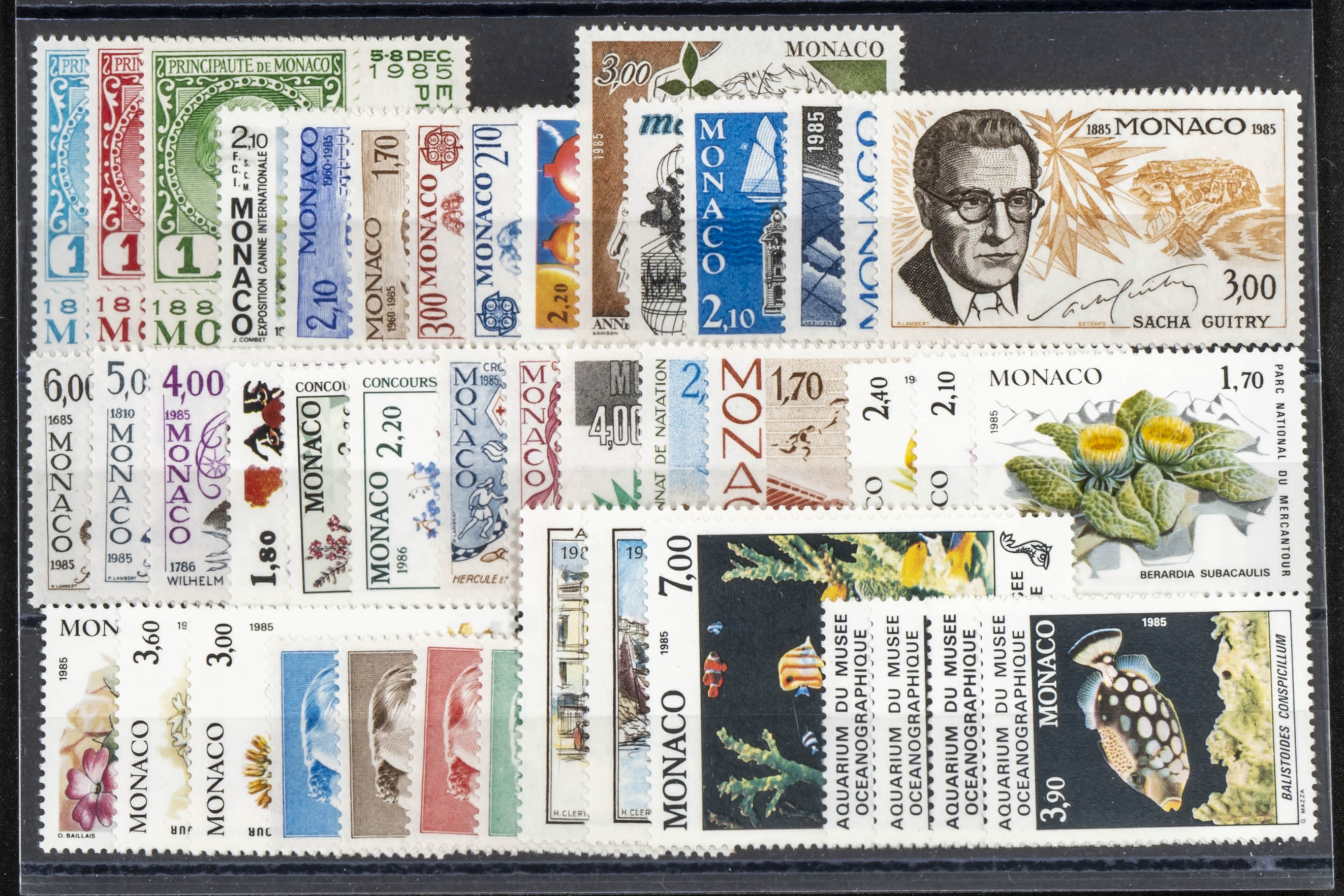 English Yvert 1456/09(9). 1985. Complete set of nine years 1985 (ordinary mail only, no souvenir sheet stamps) of Monaco, in mint condition (mounted on cards). TO BE EXAMINED. Yvert 2023: 836 Euros