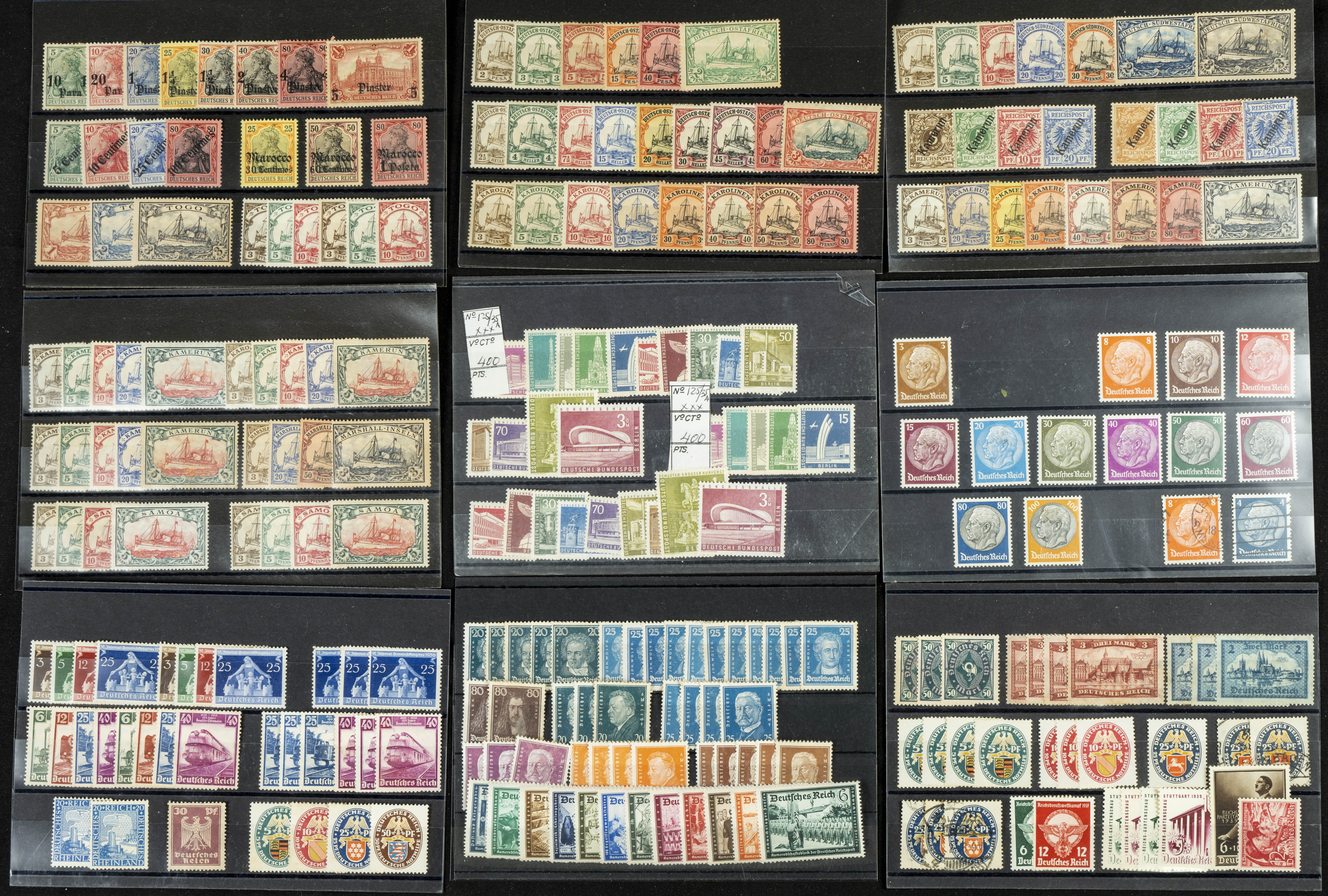 English ★/(1926ca). Interesting collection of single stamps and complete series from Imperial Germany and German Colonies, in mint and used condition, including some stamps from the Occupations and Berlin. HIGH CATALOG VALUE. TO BE EXAMINED.