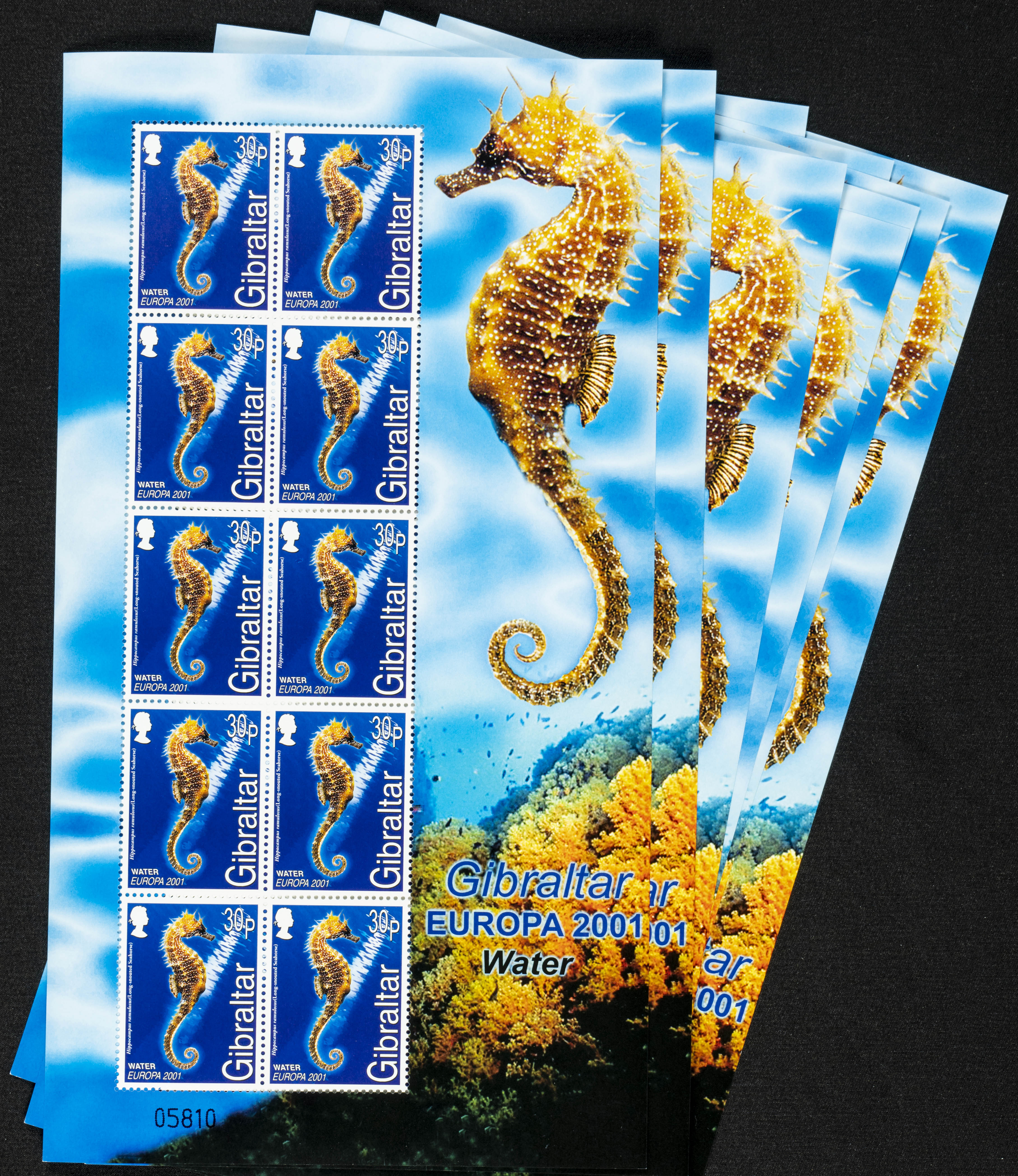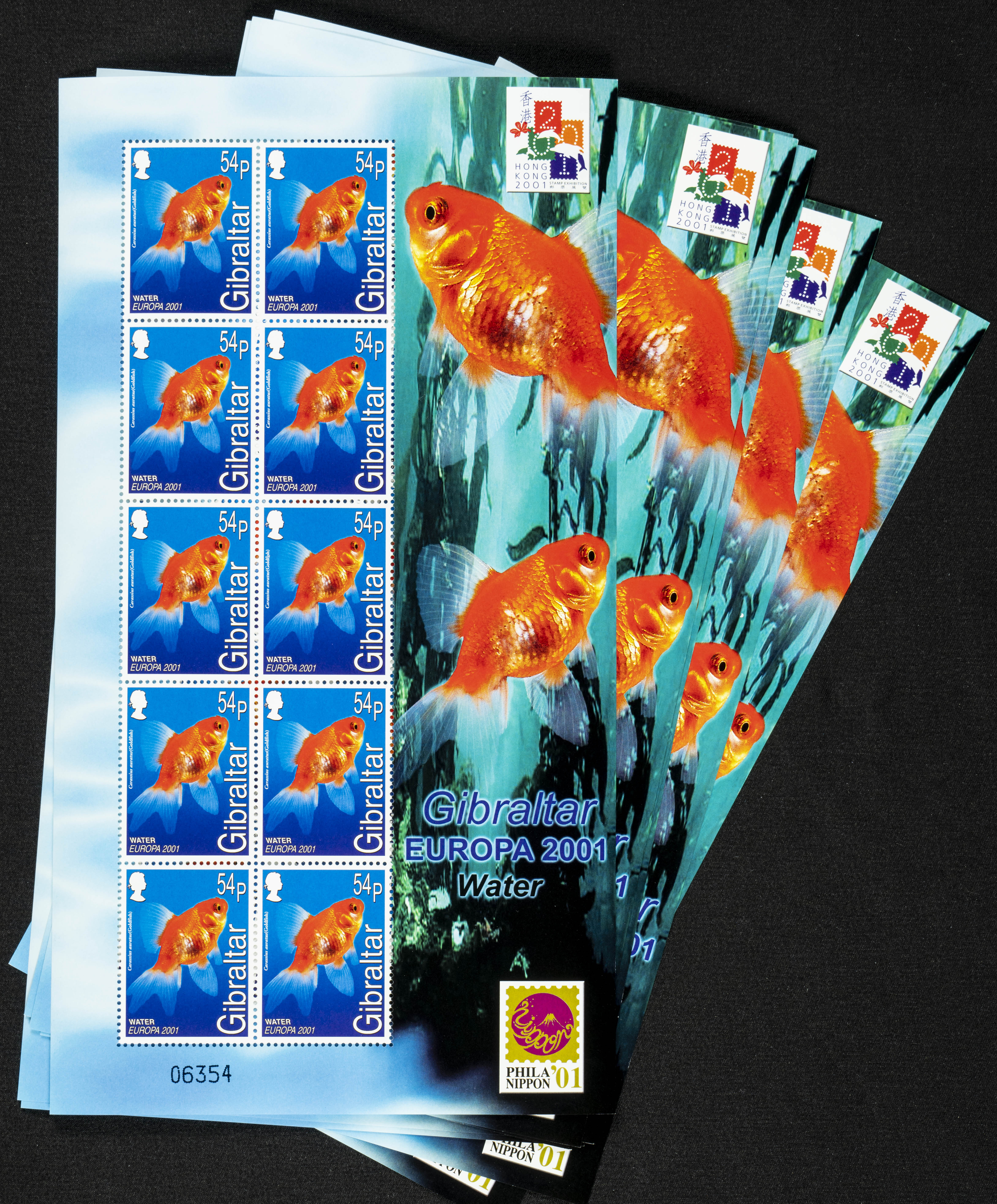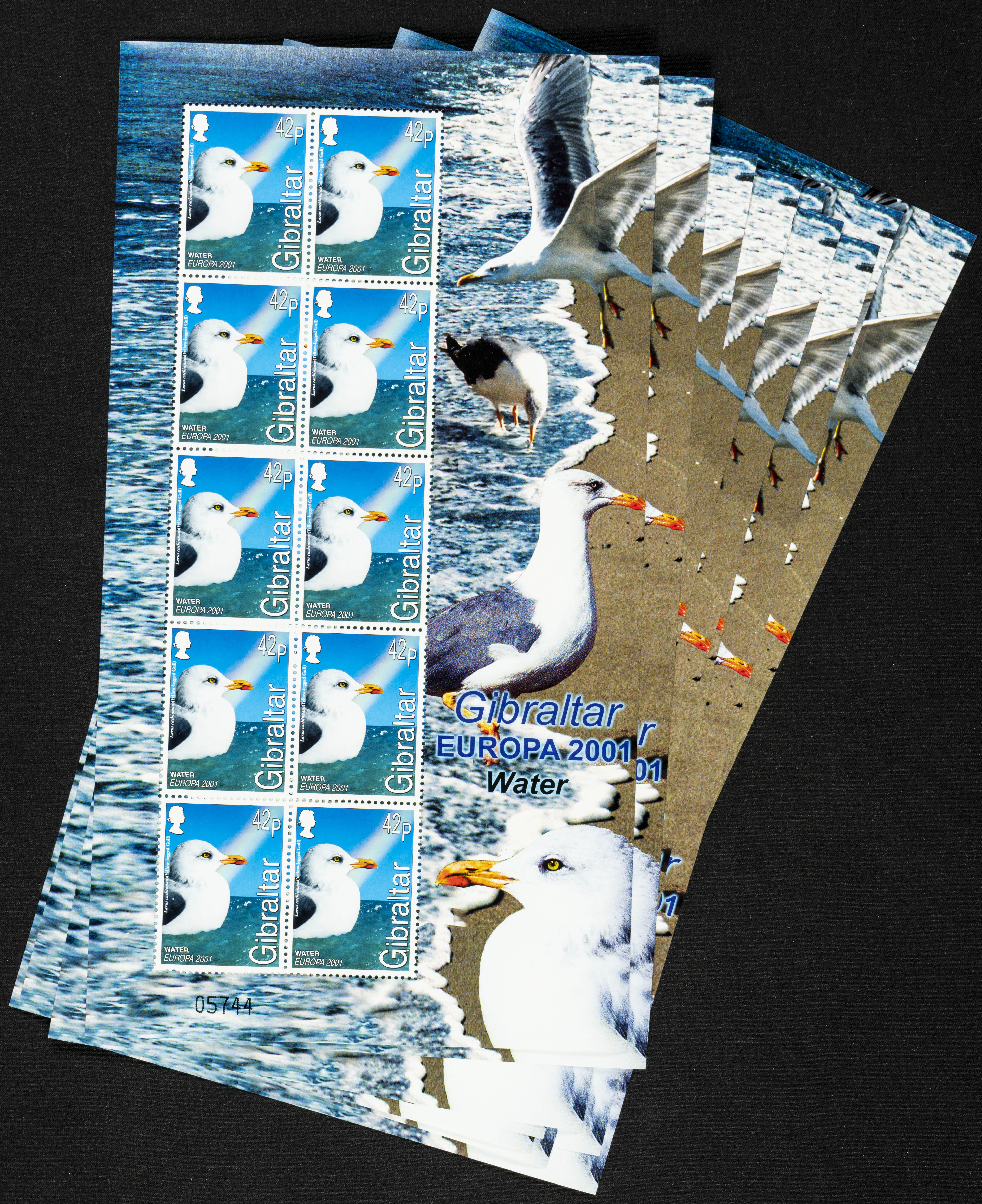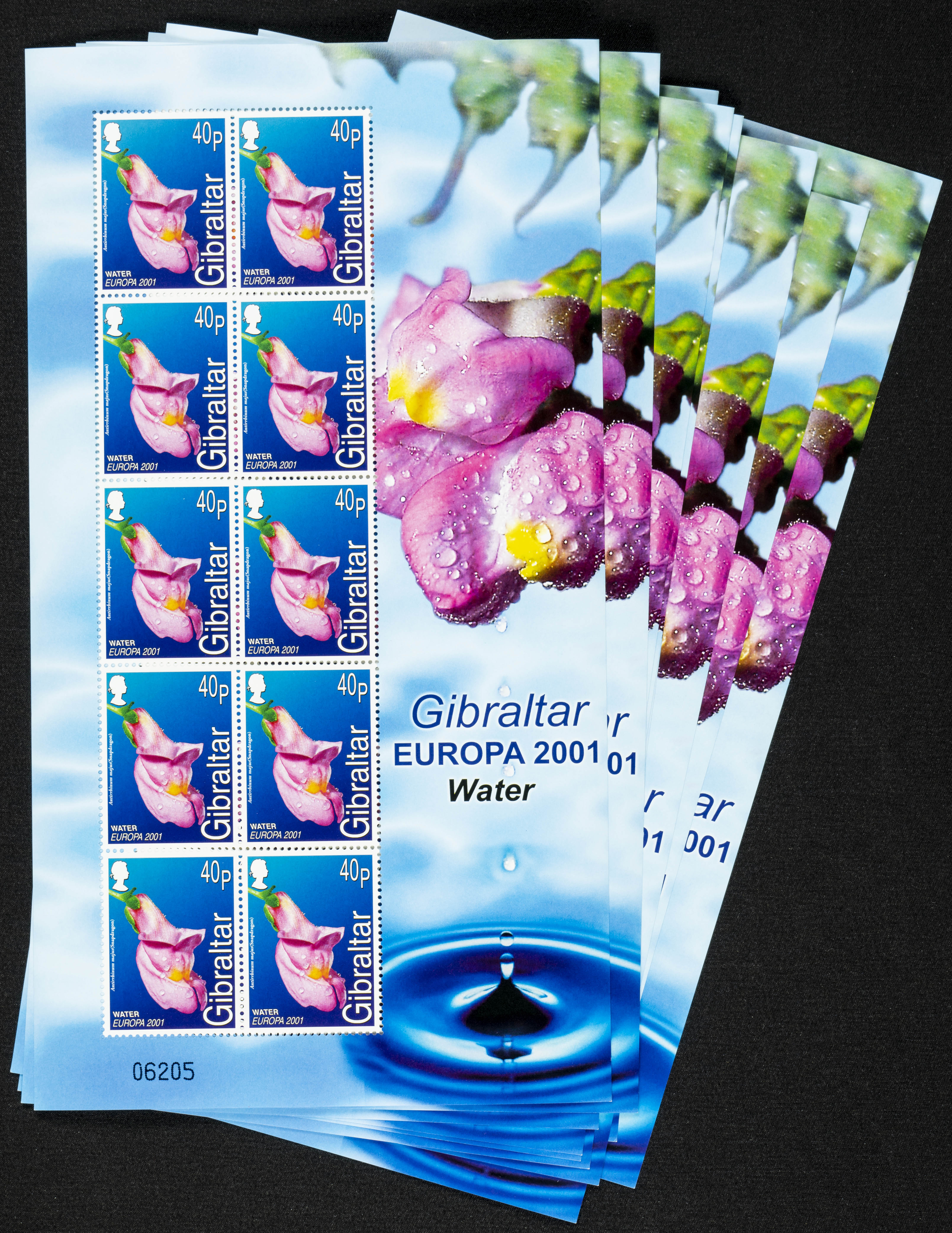 English Yvert 963/66(100). 2001. Set of one hundred complete series of Gibraltar EUROPA 2001, mint and miniature sheets. TO BE EXAMINED. Yvert 2023: 900 Euros