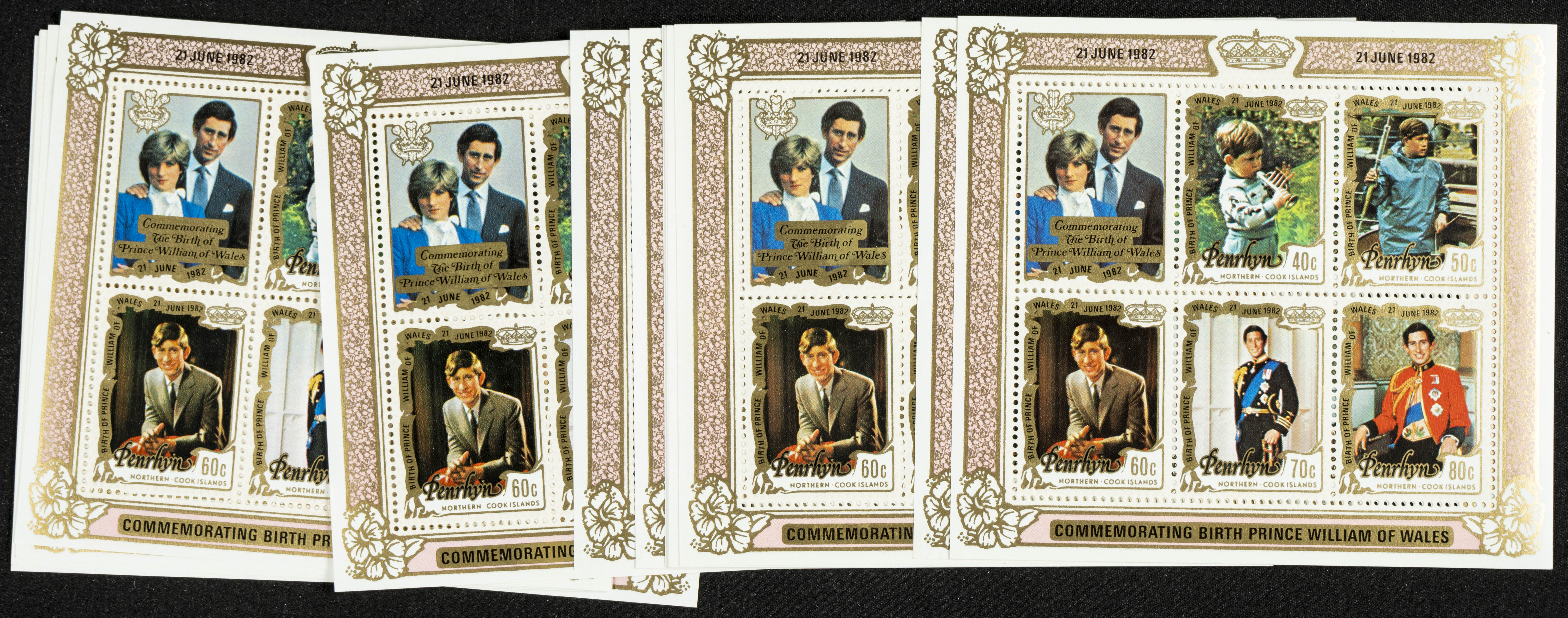 English Yvert HB40(20). 1982. Set of twenty Penrhyn notepads, BIRTH OF PRINCE WILLIAM, 1982, in mint condition. TO BE EXAMINED. Yvert 2023: 500 Euros