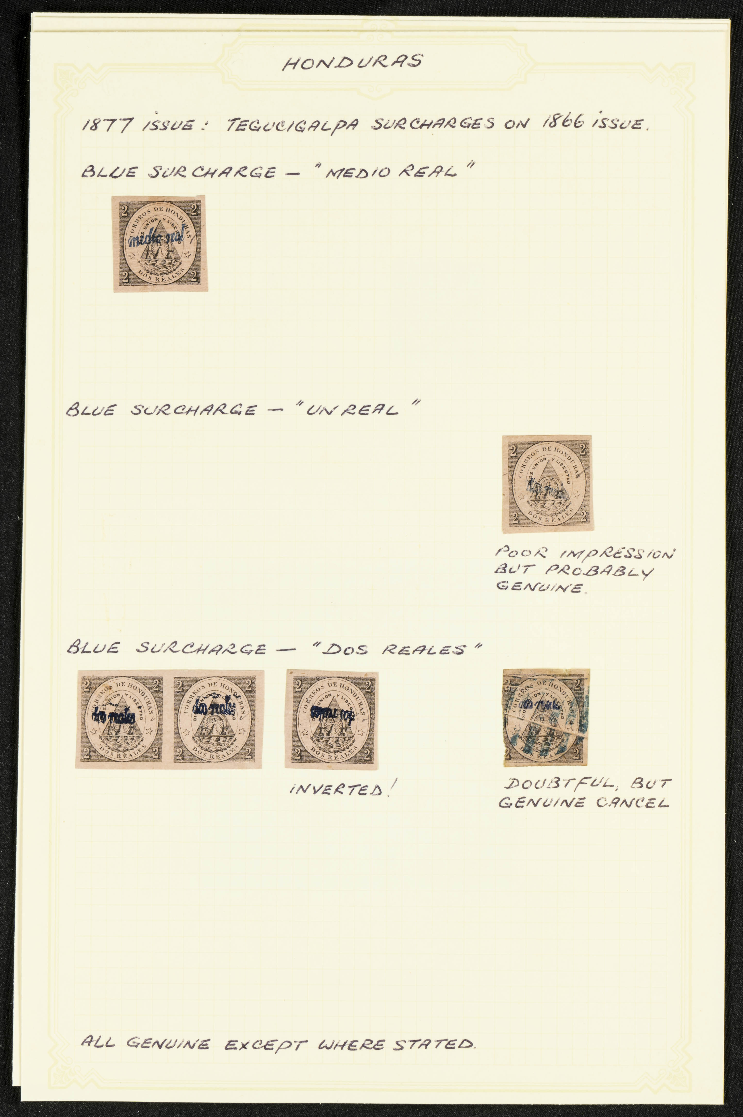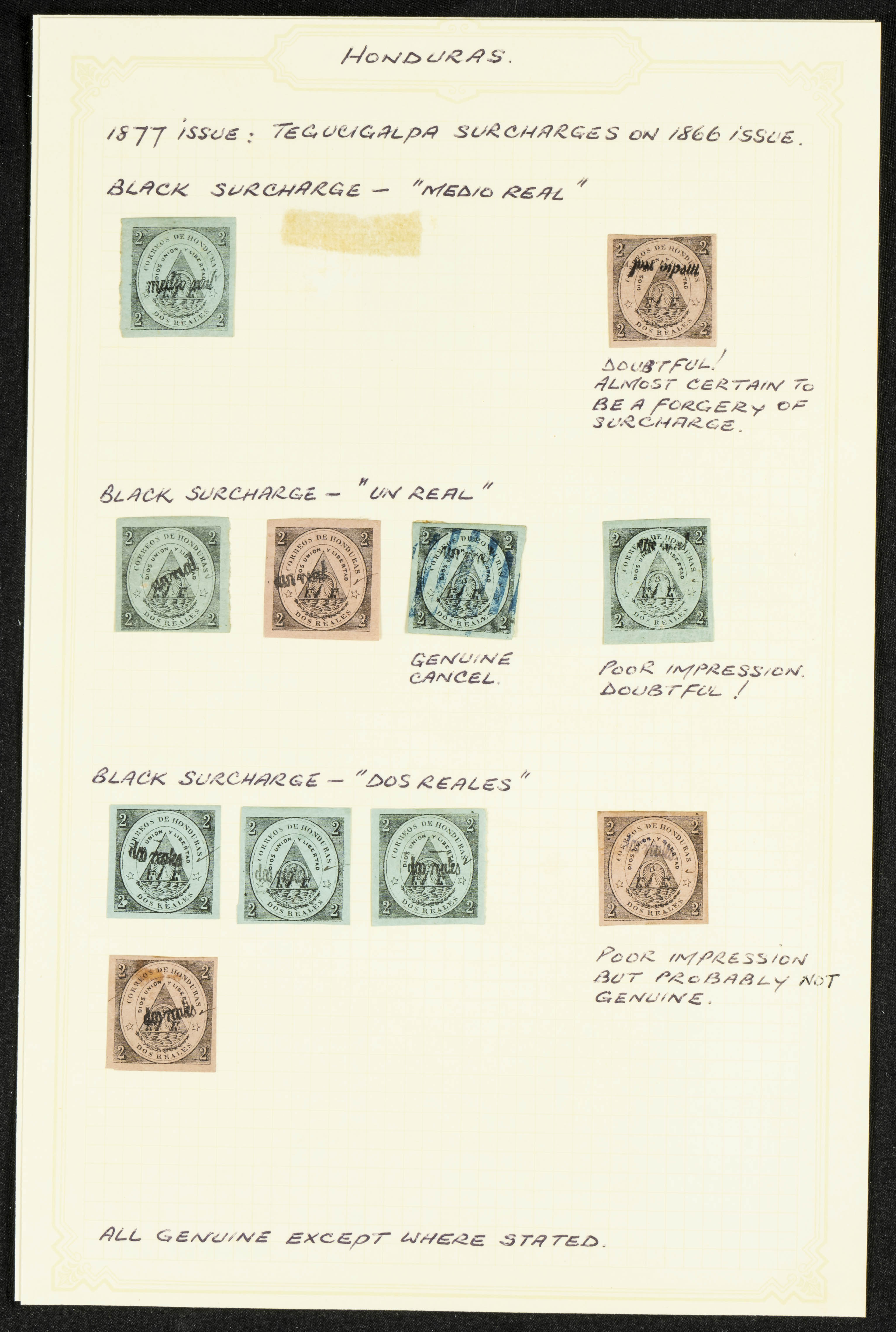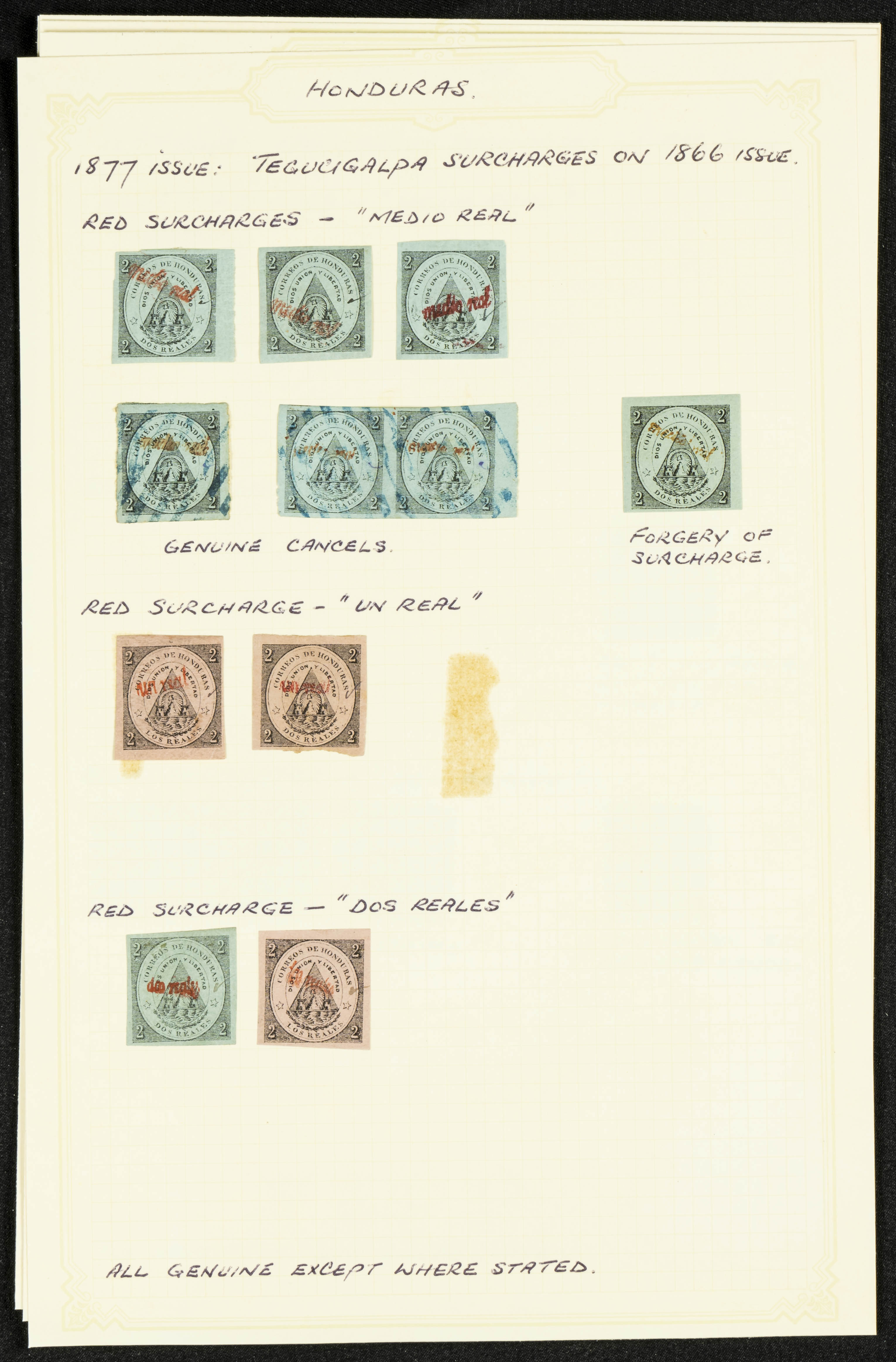 English ★/1865. Interesting collection of the first two issues of Honduras (1865-1877), mint and used, including some varieties, especially the overprinted 1877 issues, as well as some forgeries for study (mounted on album pages). ESSENTIAL TO EXAMINE.