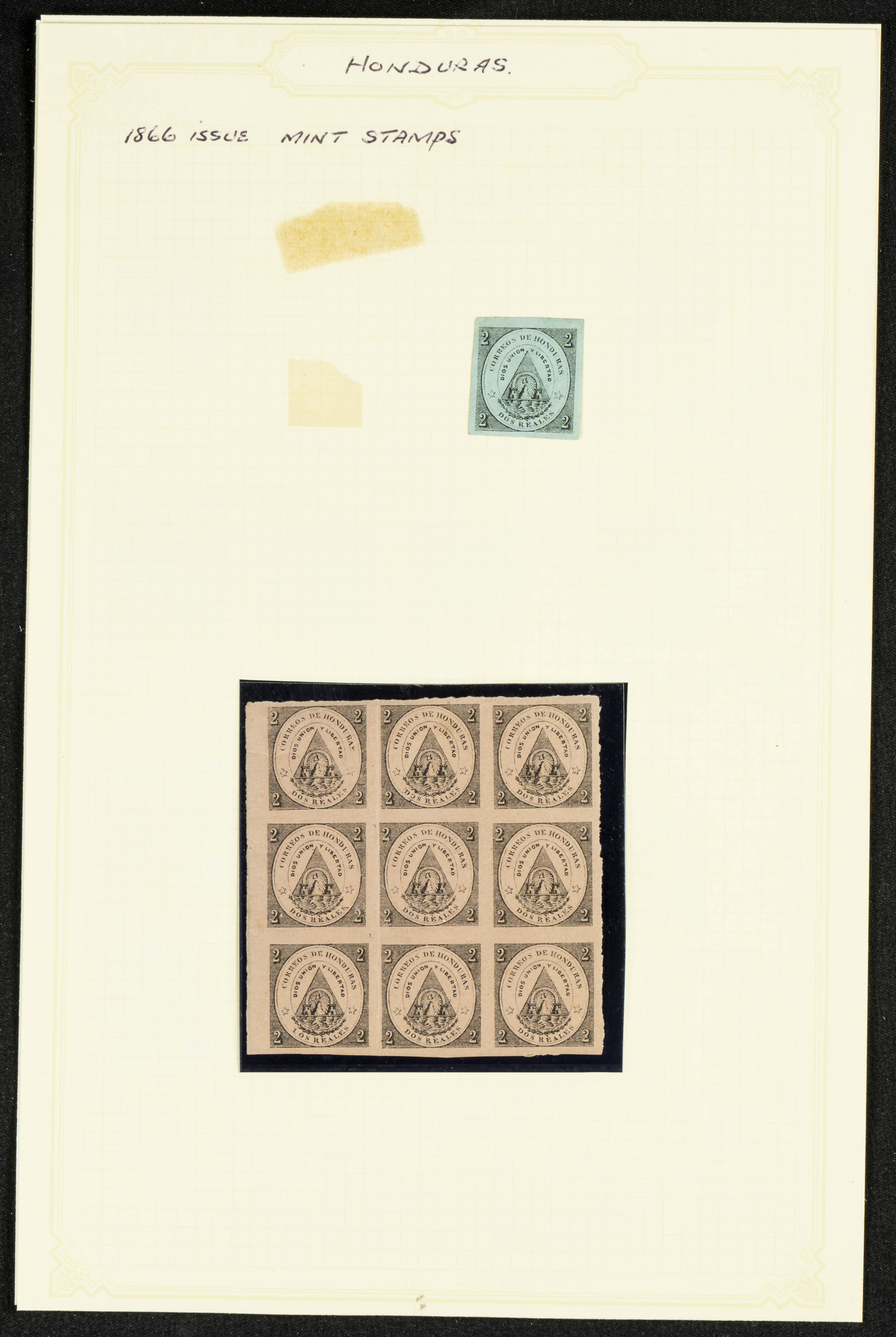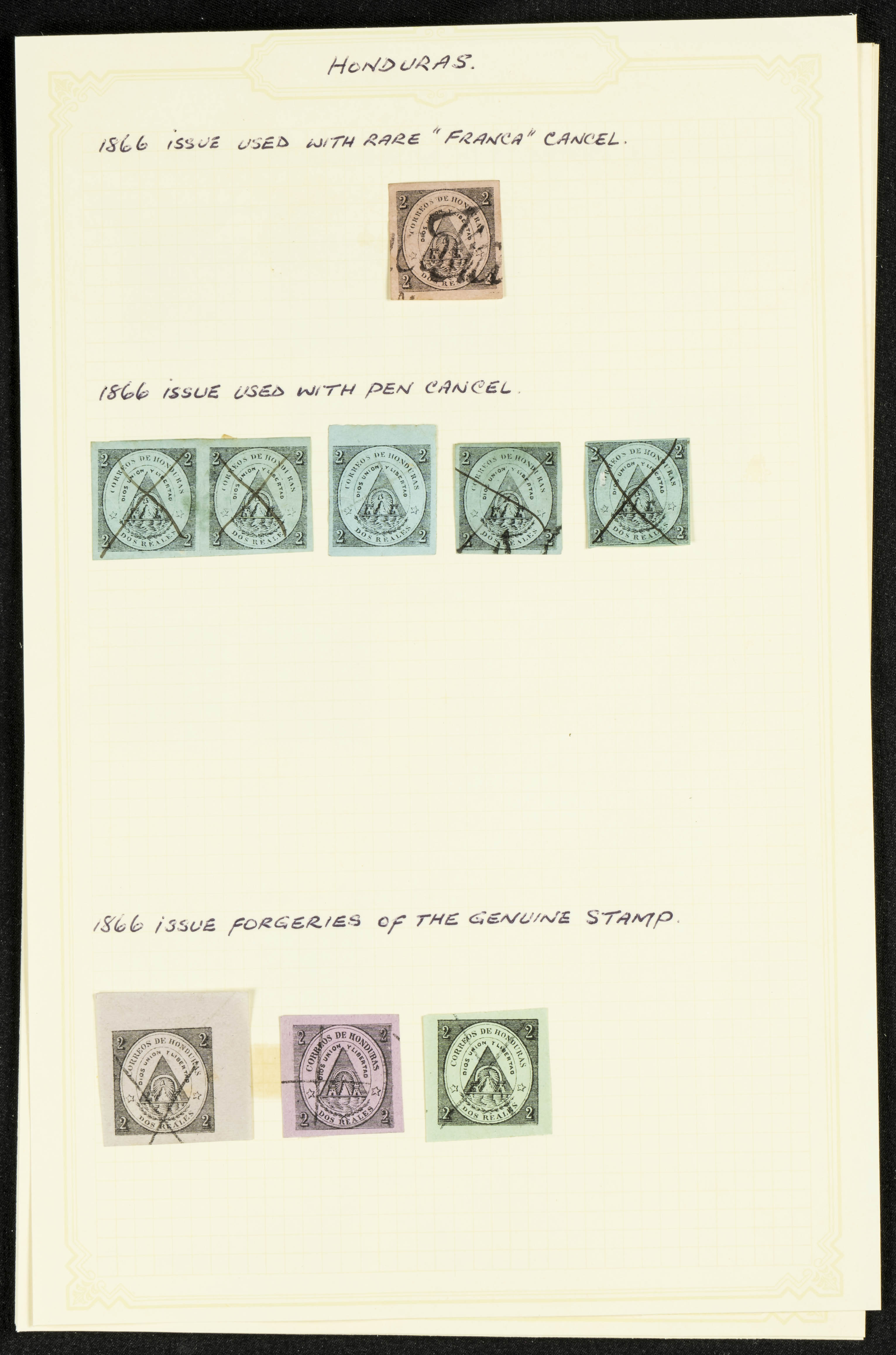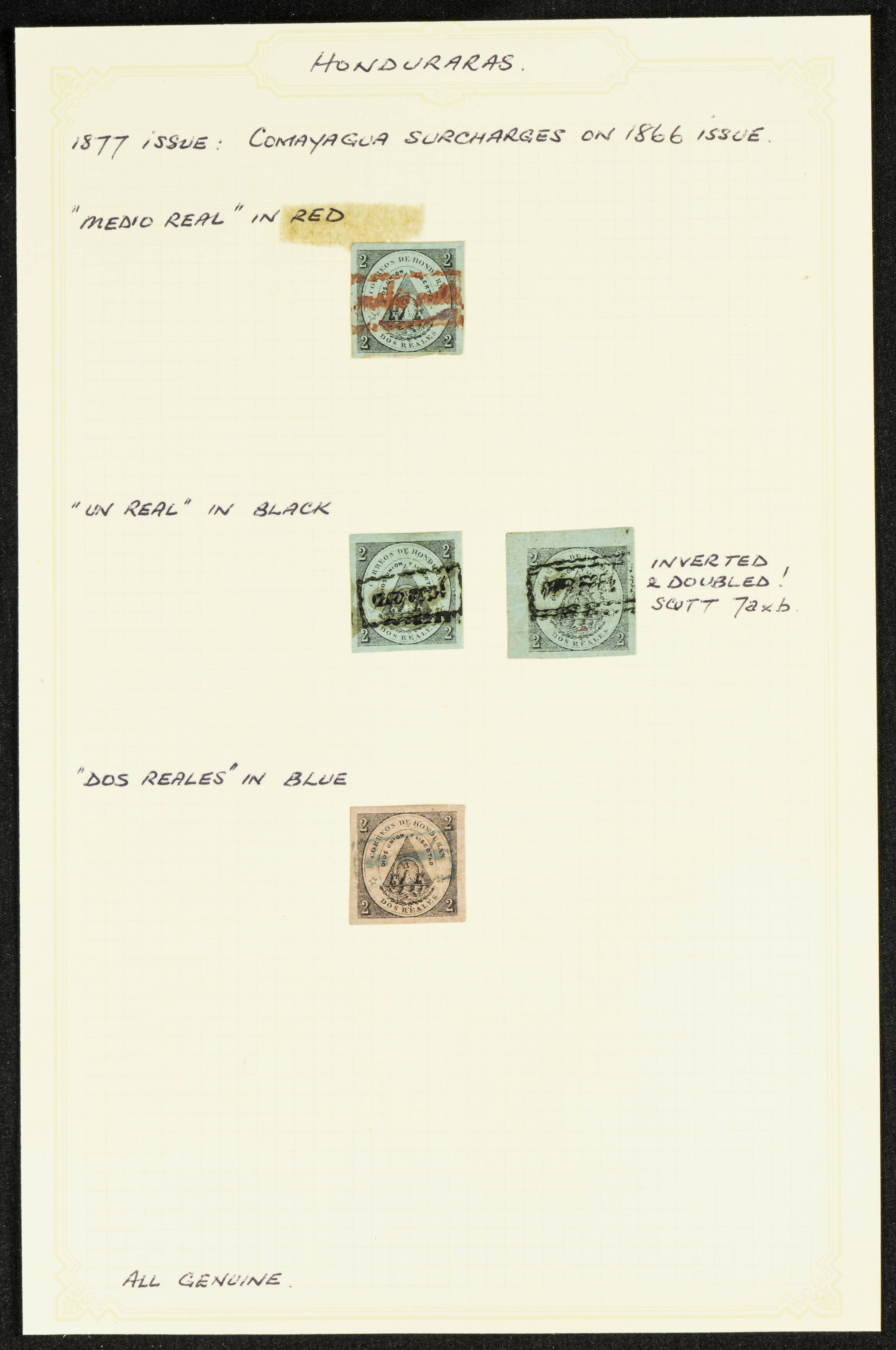 English ★/1865. Interesting collection of the first two issues of Honduras (1865-1877), mint and used, including some varieties, especially the overprinted 1877 issues, as well as some forgeries for study (mounted on album pages). ESSENTIAL TO EXAMINE.