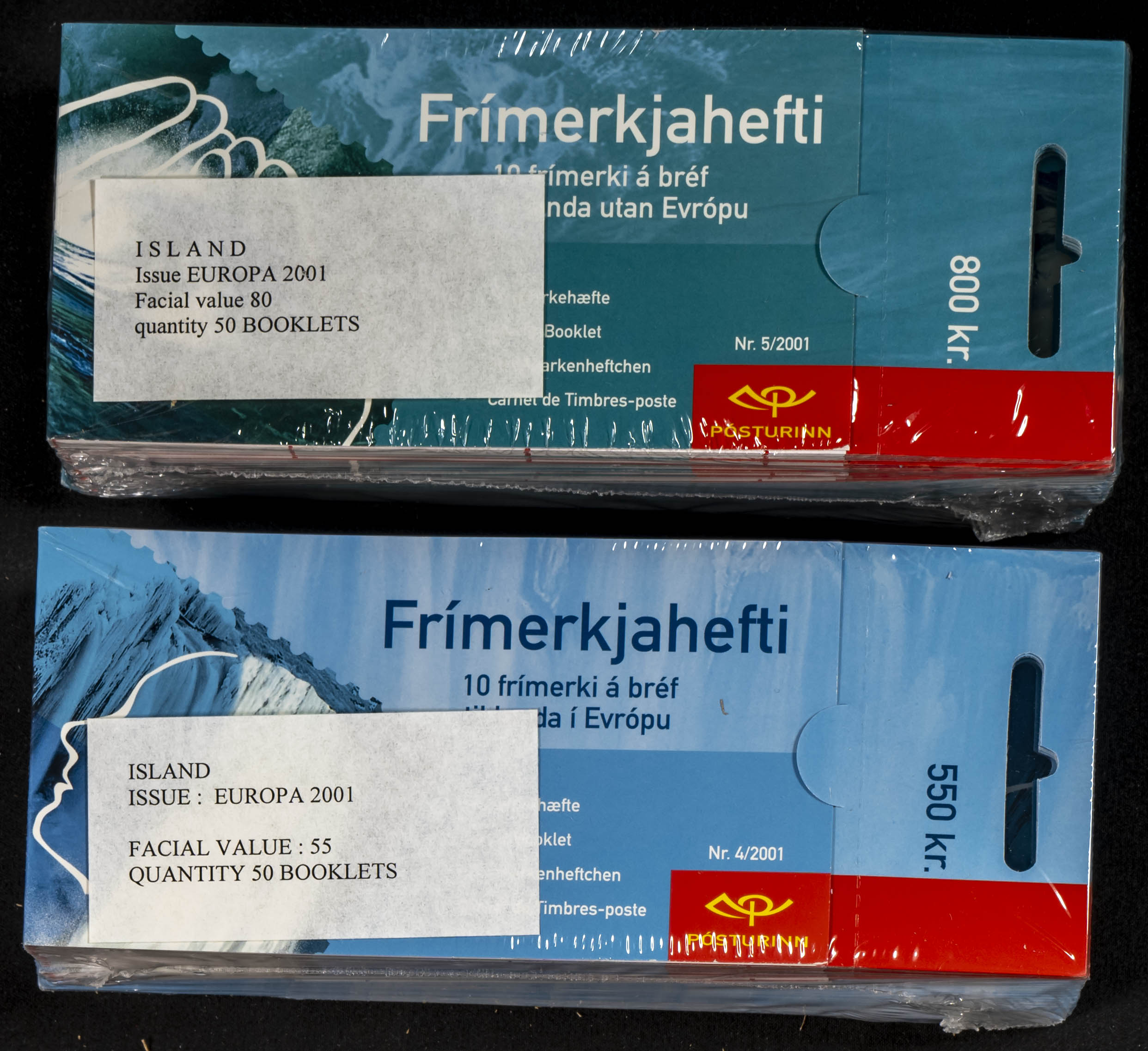 English Yvert C914/15(50). 2001. Set of fifty booklets of each denomination from the Icelandic Europe Theme 2001 series, in mint condition. TO BE EXAMINED. Yvert 2023: 3,000 Euros