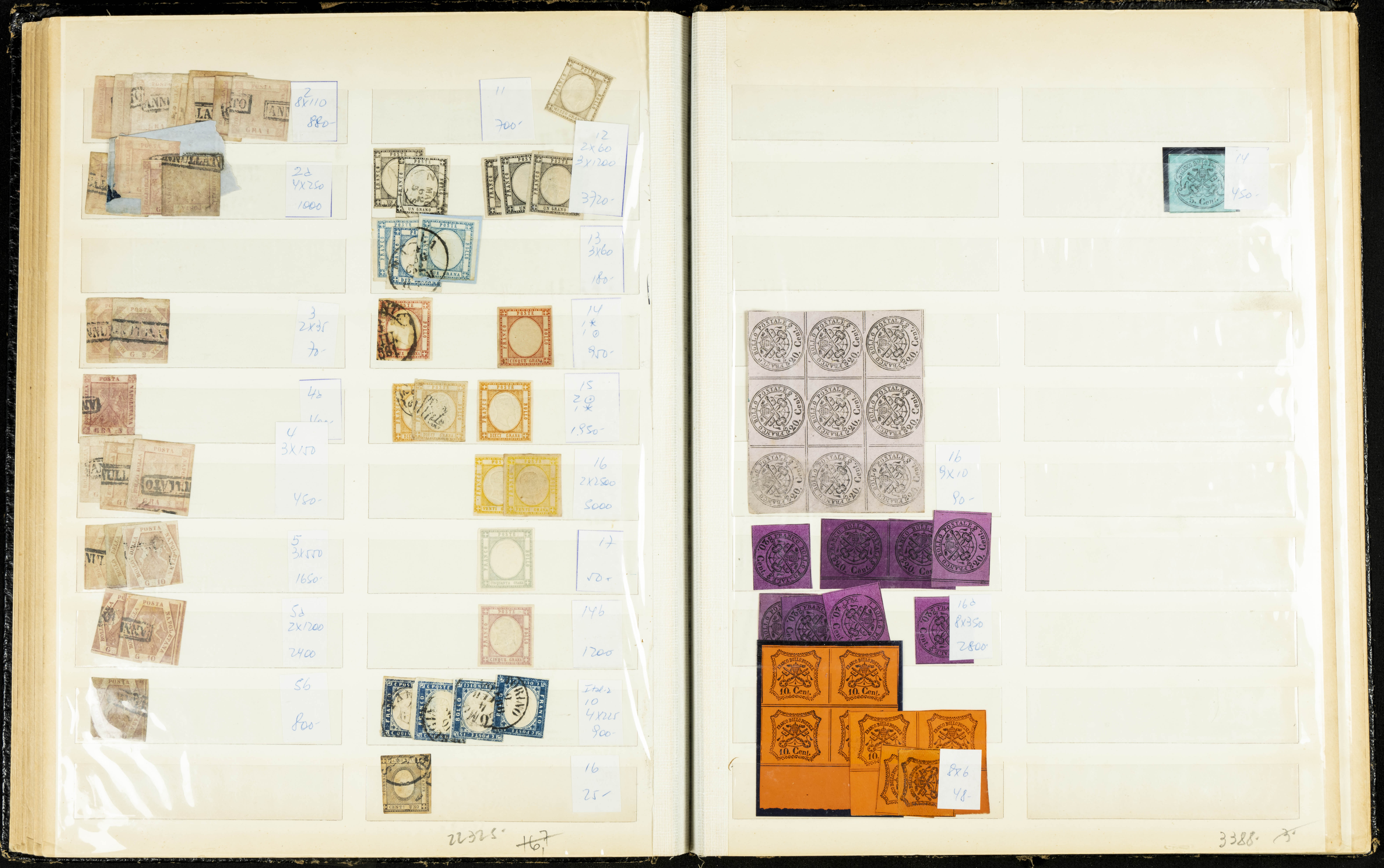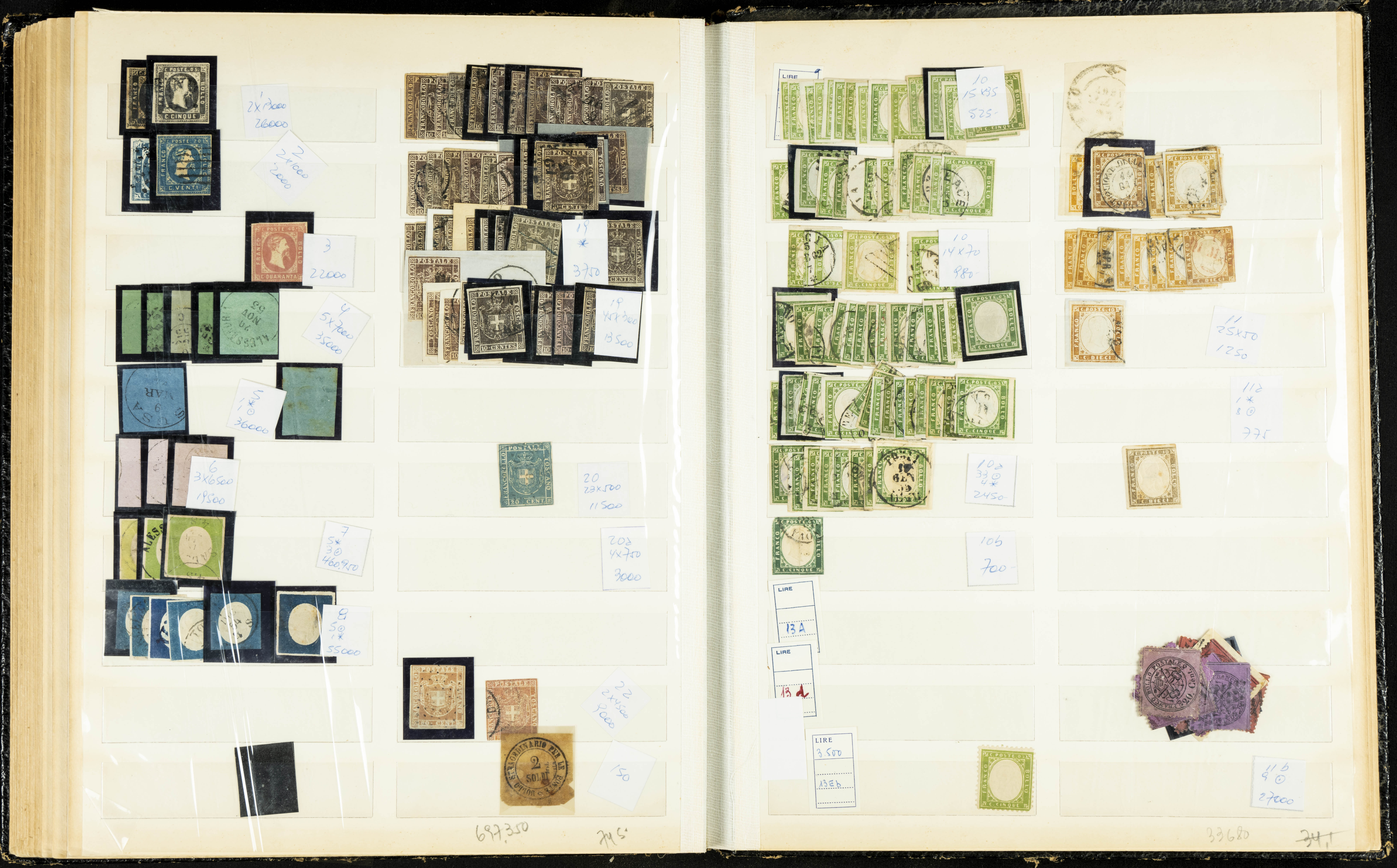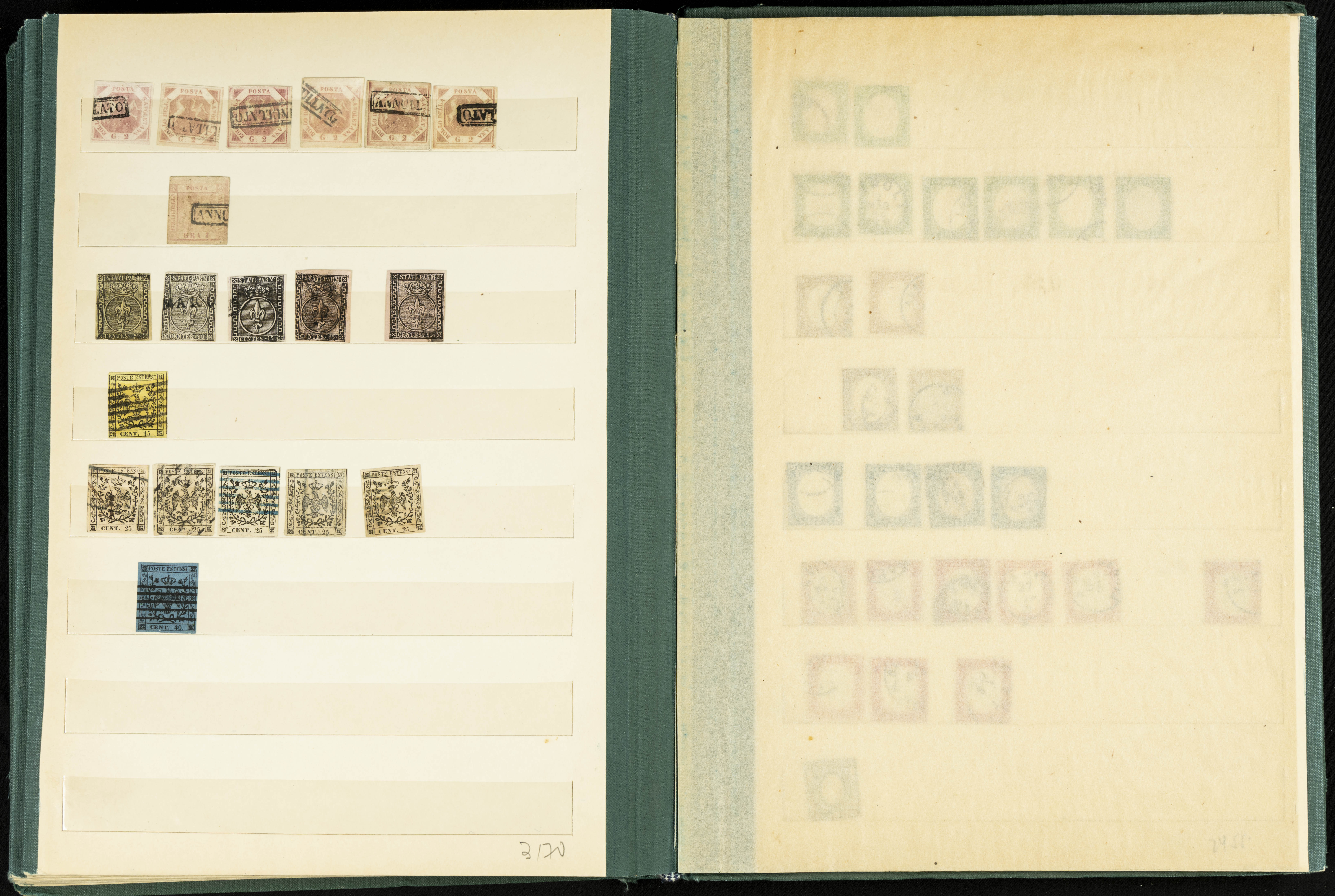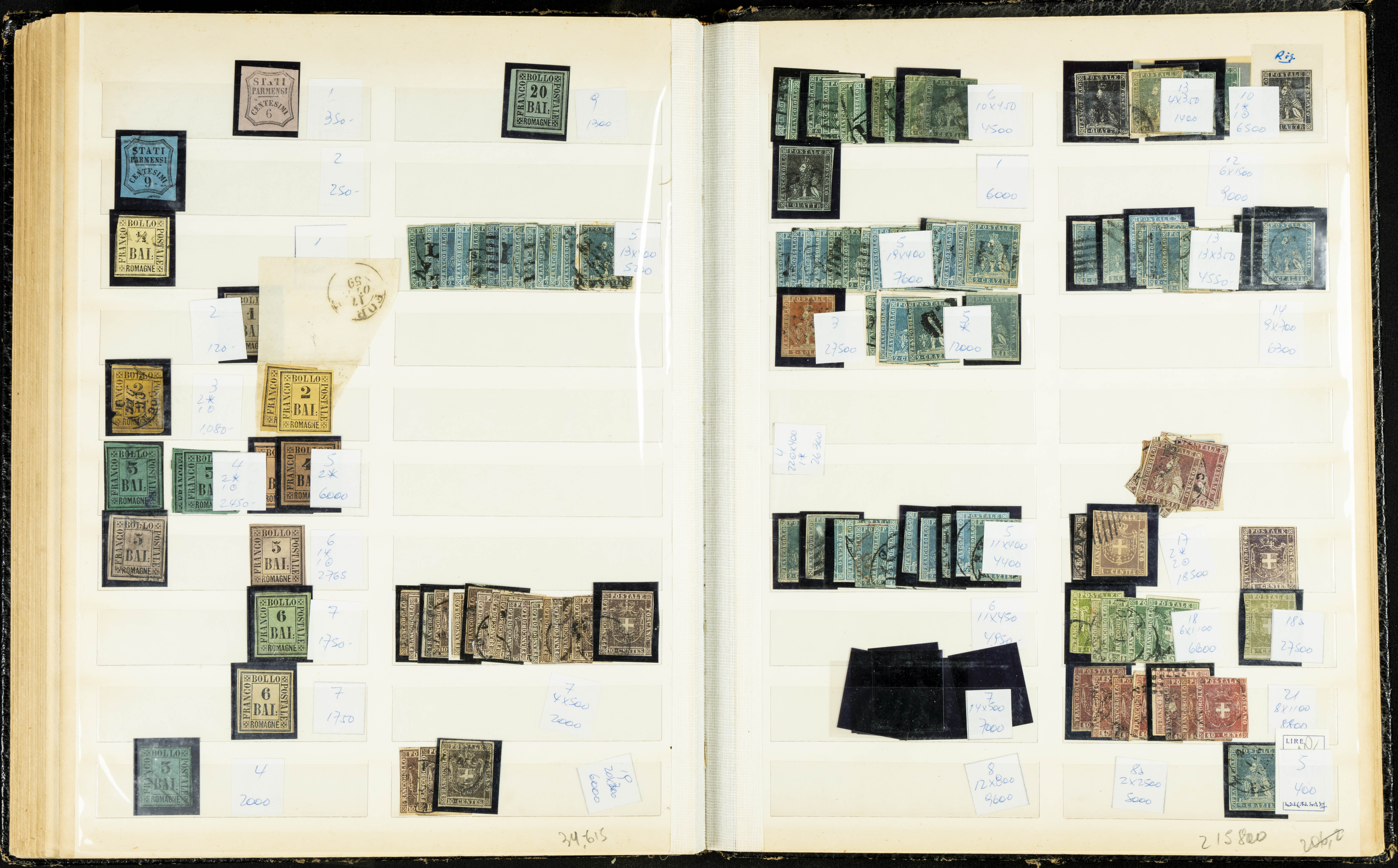 English (★)/(1851ca). Spectacular collection of classic stamps from Italian states, some in mint condition, with most repetitions. Includes some forgeries (especially those of very high value), some with linear postmarks and legible date stamps. EXTREMELY HIGH CATALOG VALUE. EXAMINATION IS ESSENTIAL.