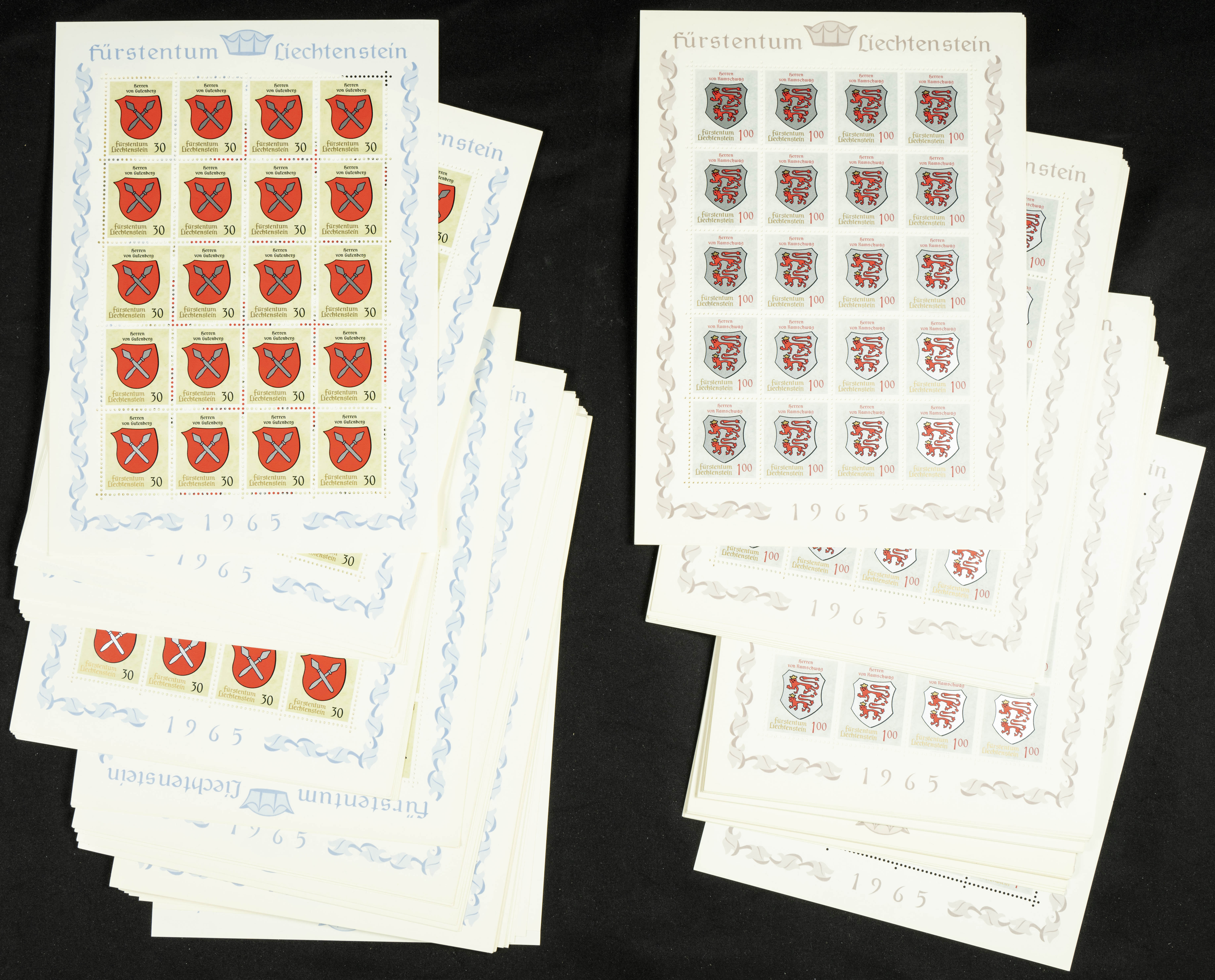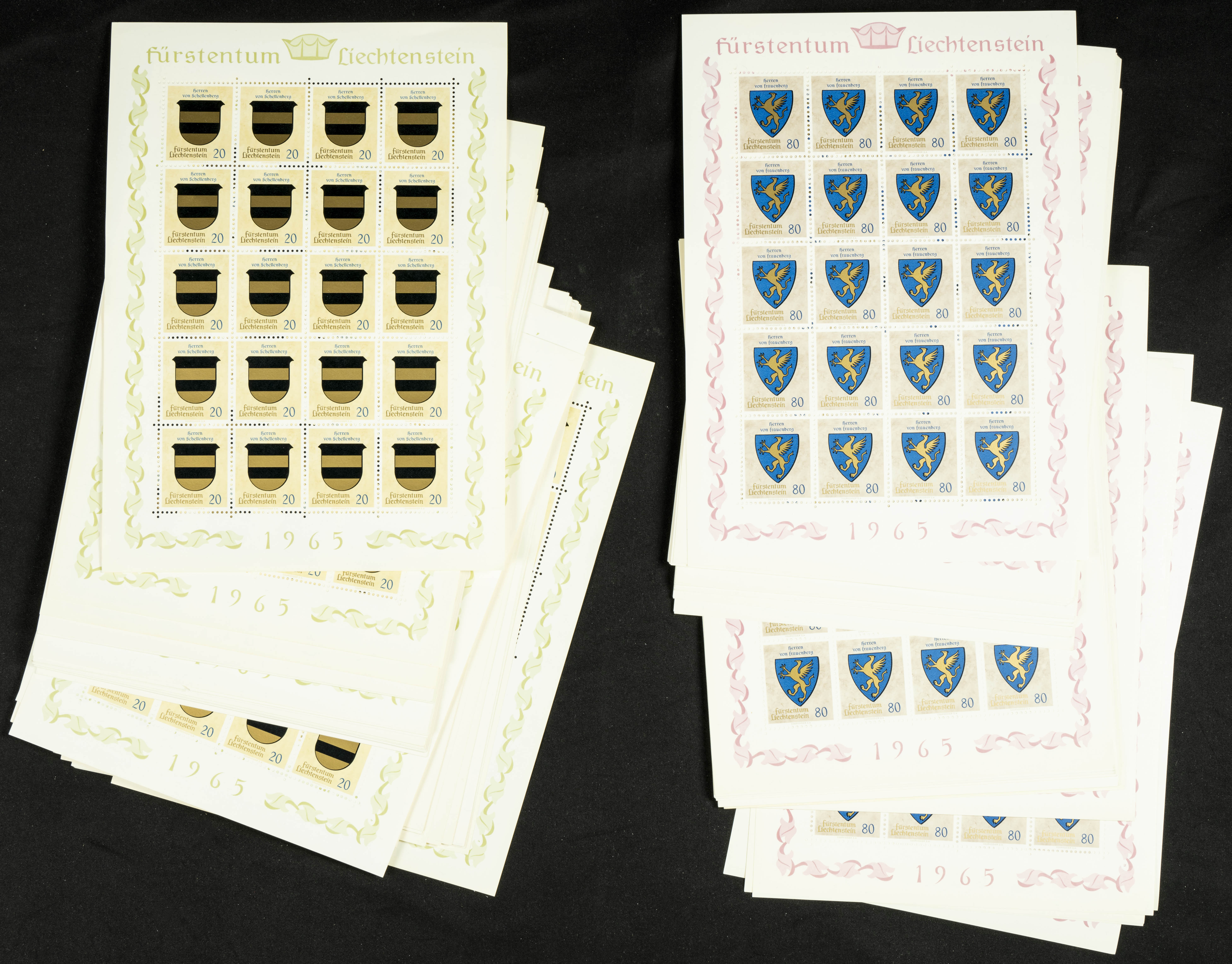 English Yvert 399/02(1500). 1965. Set of one thousand five hundred complete sets (Coats of Arms) of Liechtenstein 1965, mint and in sheets. TO BE EXAMINED. Yvert 2024: 4,125 Euros