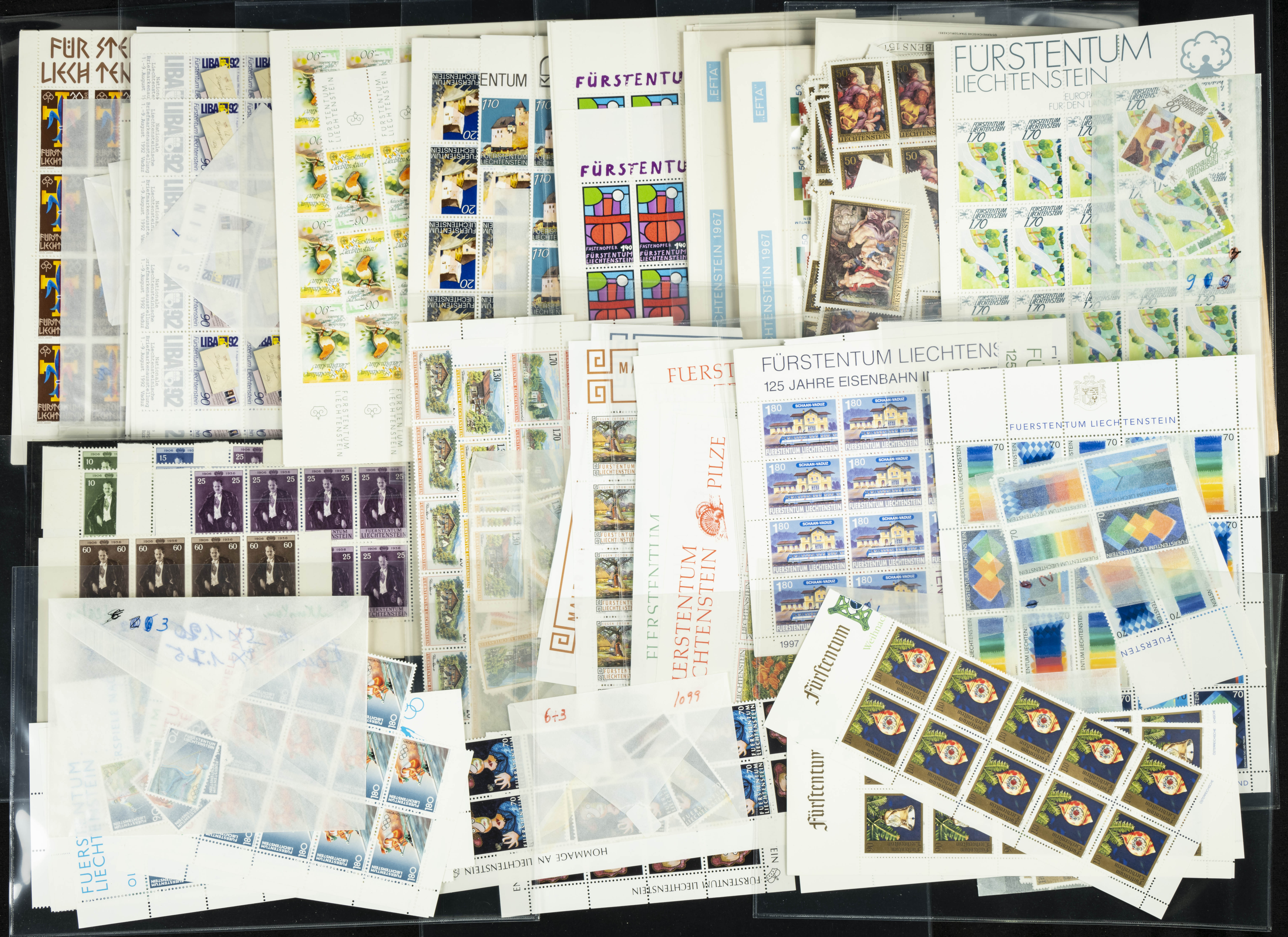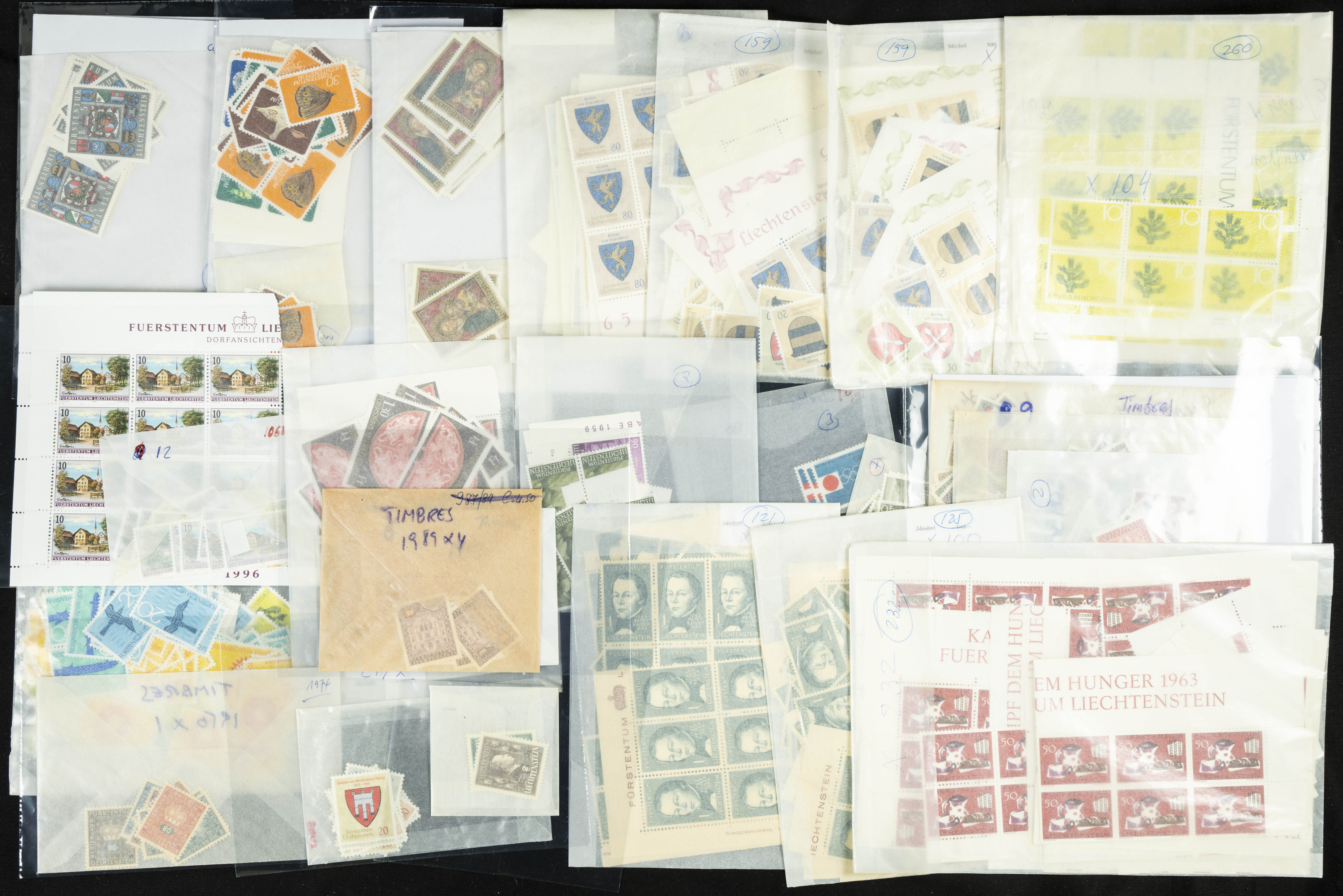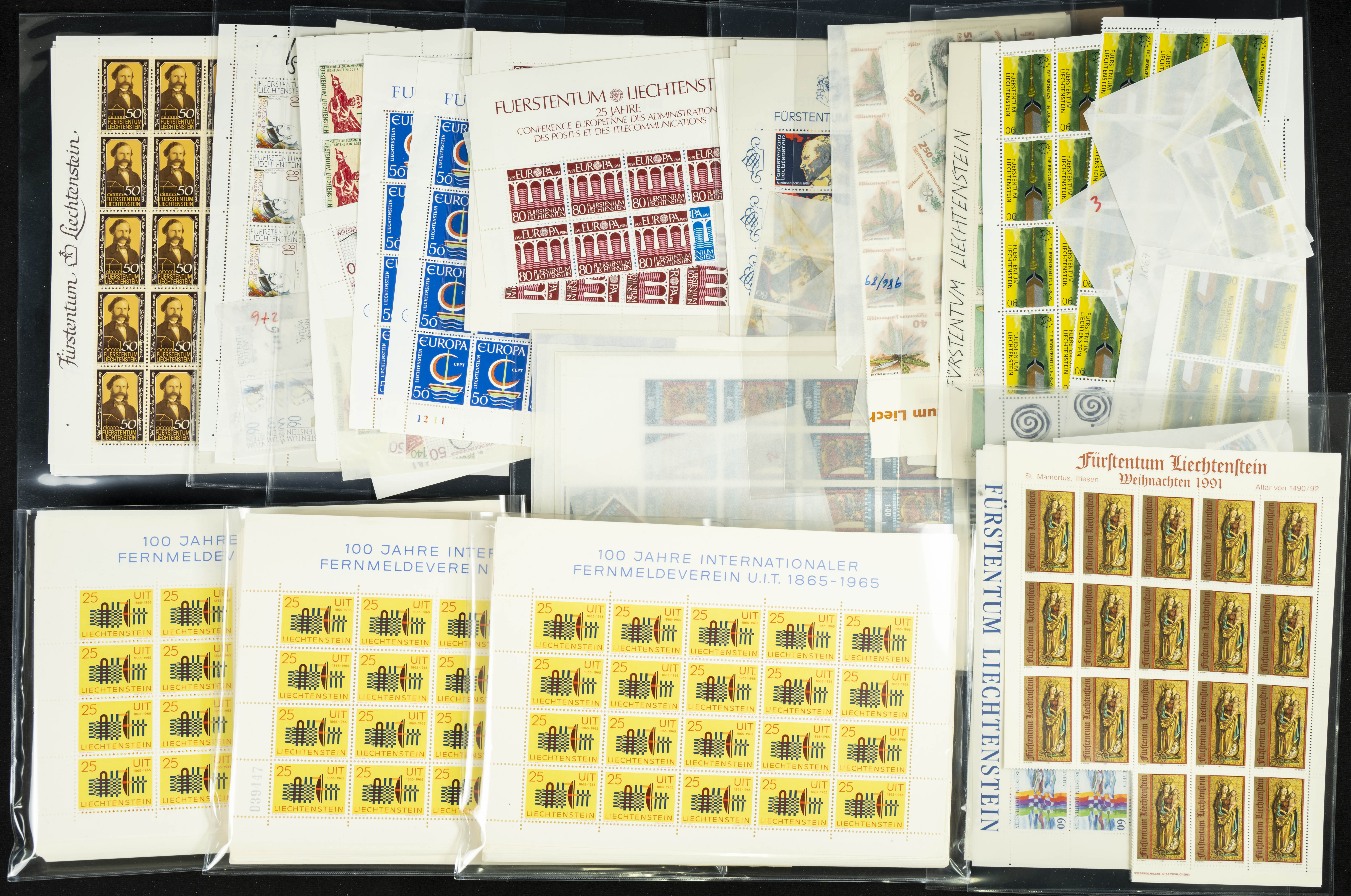English ★★(circa 1980). Spectacular Liechtenstein stock from between 1980 and 1998, mint condition and organized in envelopes, mostly miniature sheets, spreads, and large blocks (generally good quality). TO BE EXAMINED. Yvert 2024: 31,000 Euros