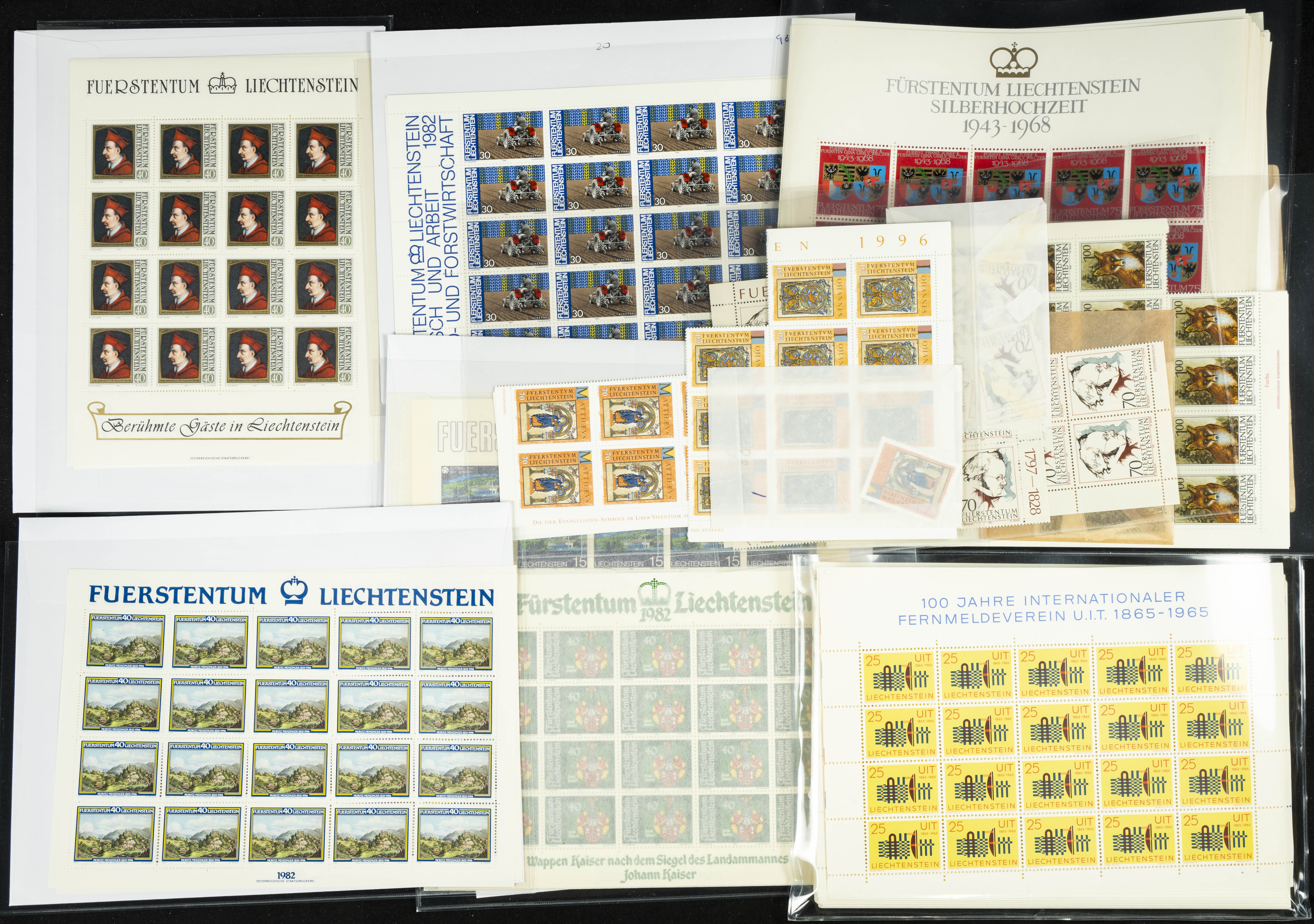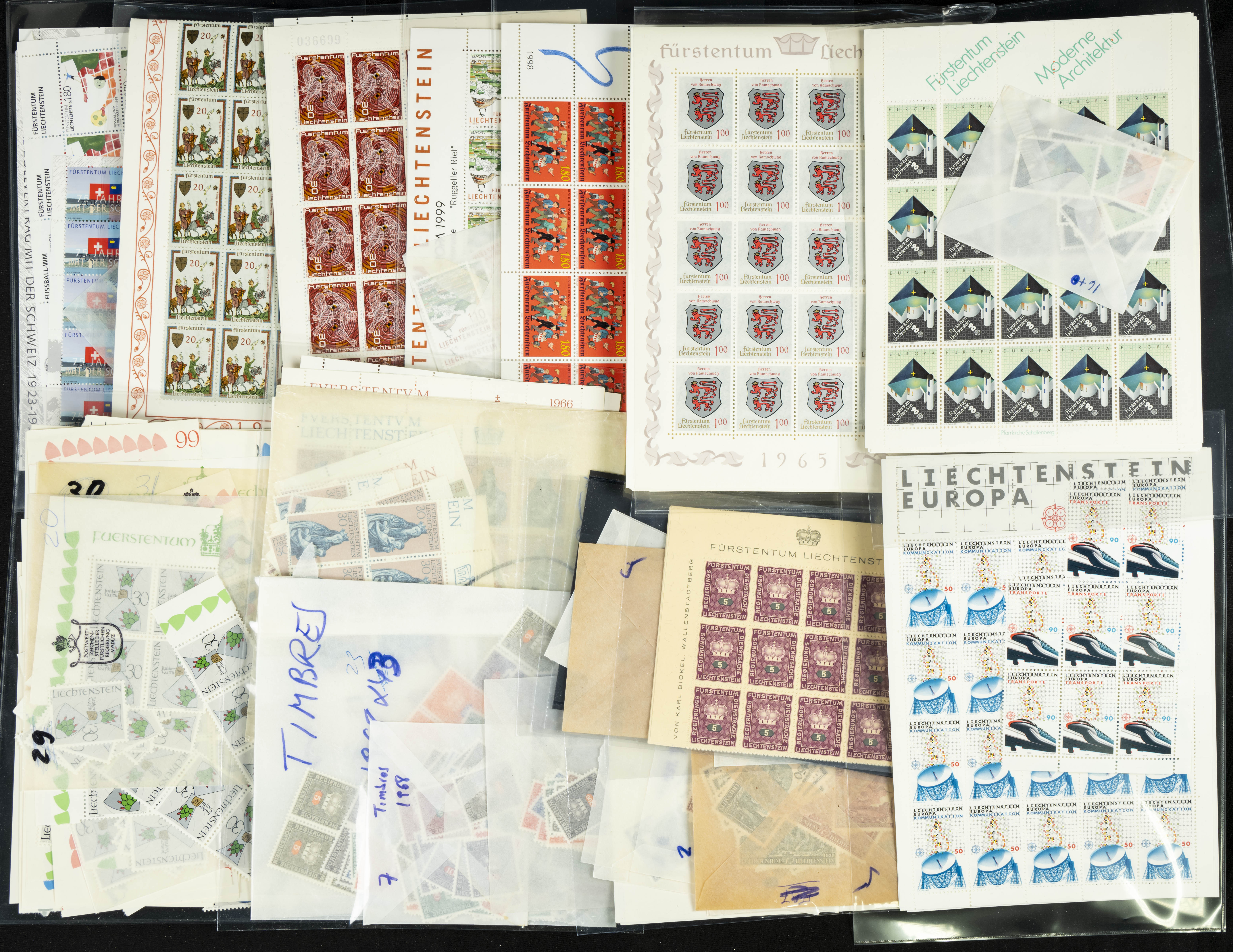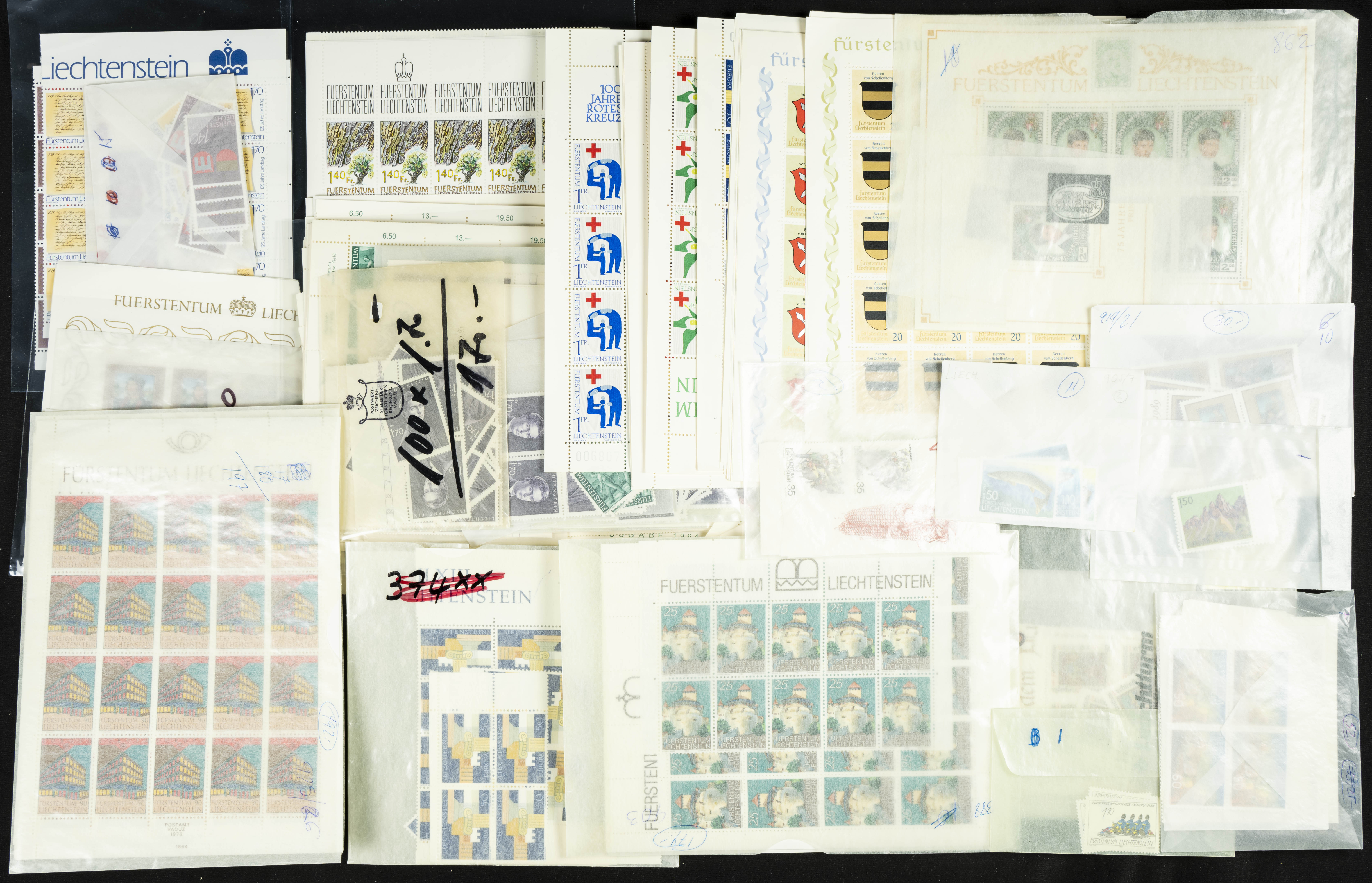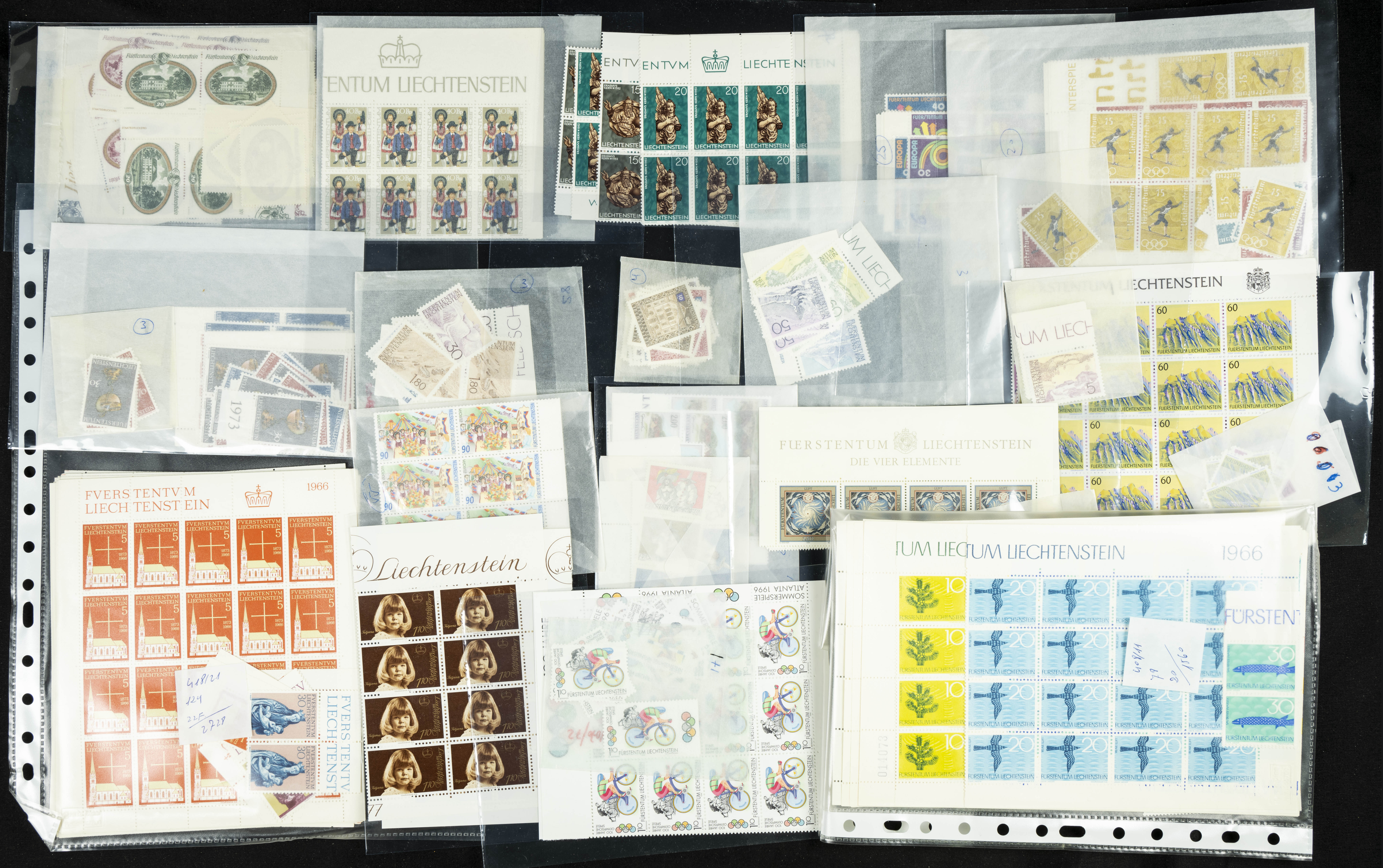 English ★★(circa 1980). Spectacular Liechtenstein stock from between 1980 and 1998, mint condition and organized in envelopes, mostly miniature sheets, spreads, and large blocks (generally good quality). TO BE EXAMINED. Yvert 2024: 31,000 Euros