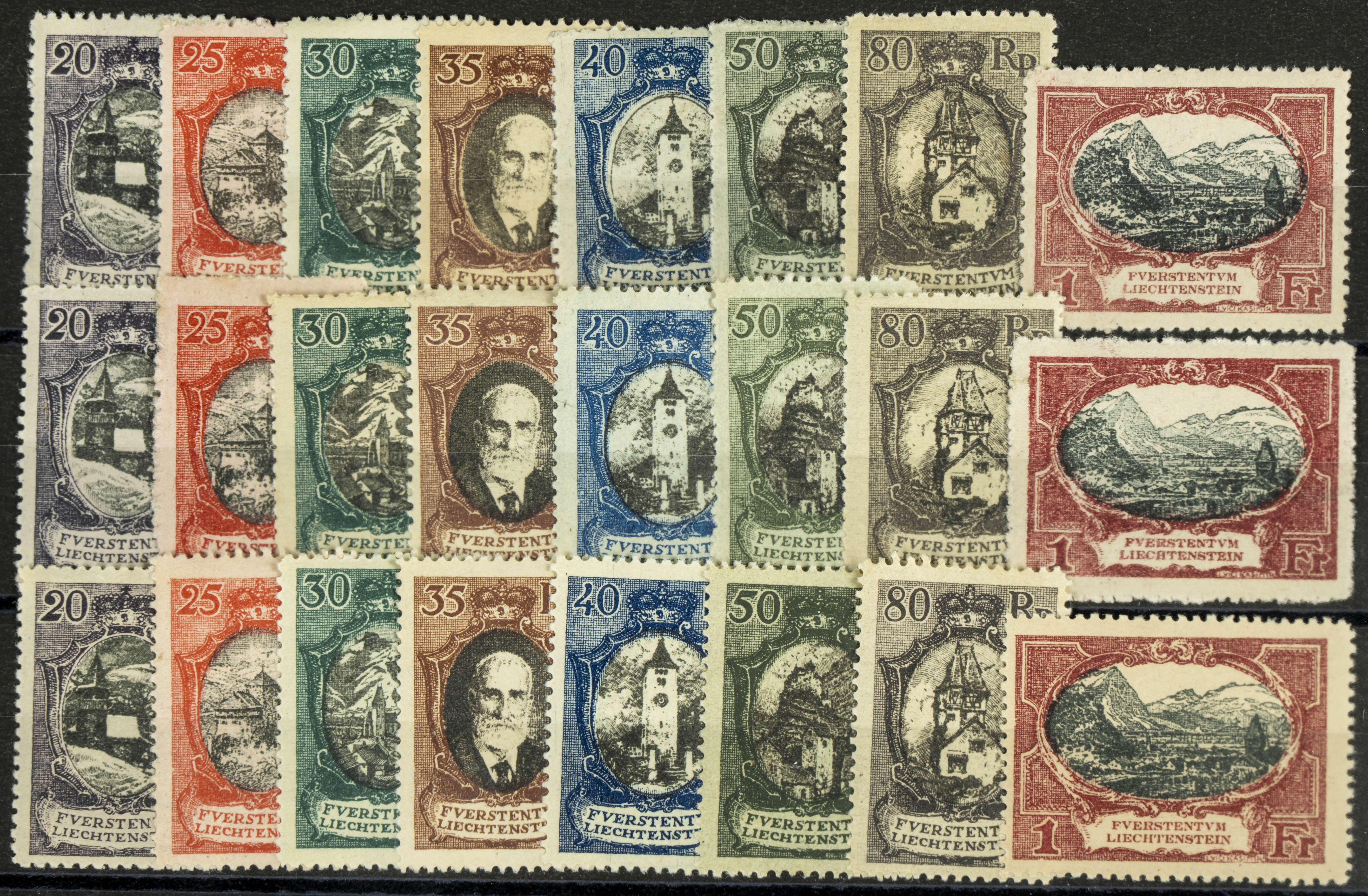 English Yvert 52/59(3). 1921. Set of three complete Liechtenstein series, VARIOUS MOTIFS, 1921, in mint condition (non-original gum). TO BE EXAMINED. Yvert 2024: 2,700 Euros