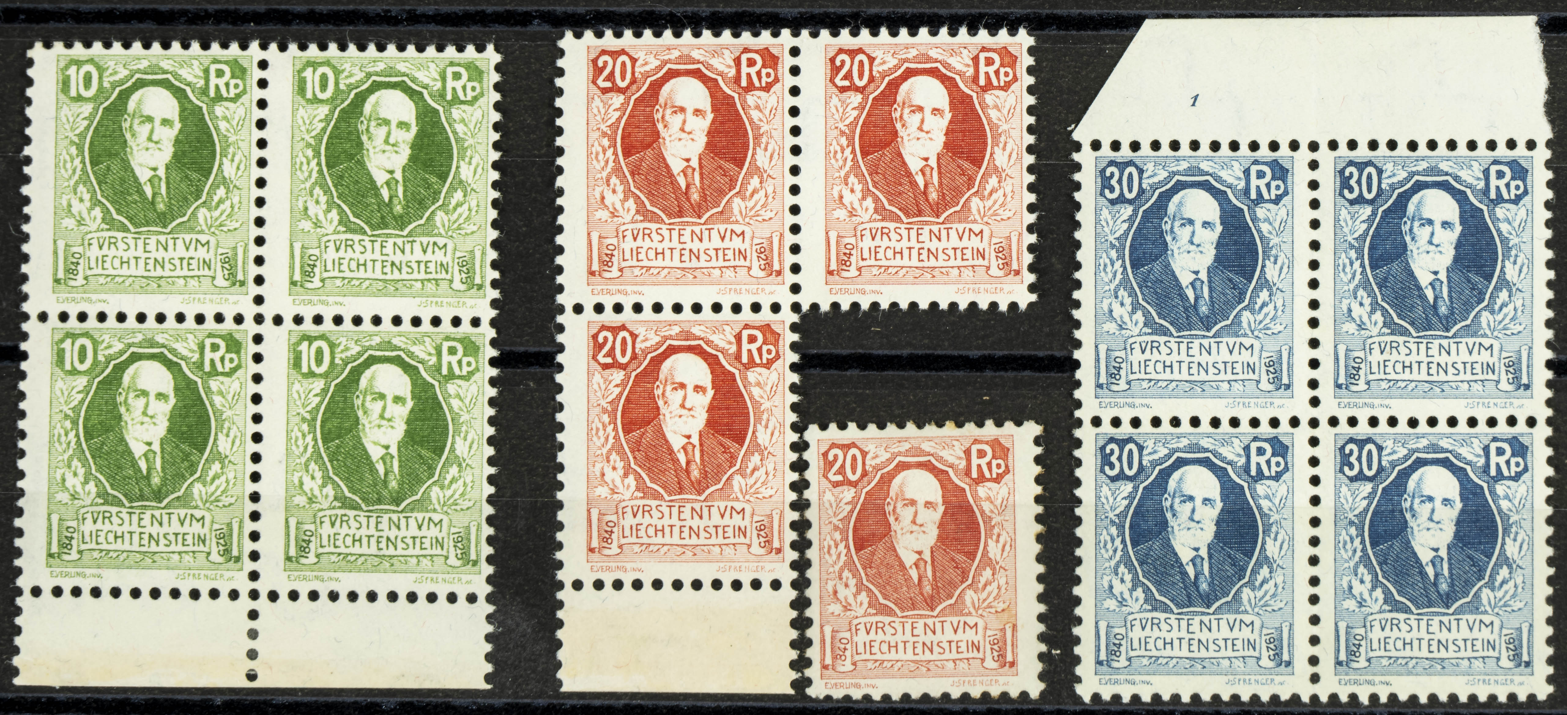 English Yvert 72/74(4). 1925. Set of four complete Liechtenstein 85th Anniversary Prince 1925 series, in mint condition. To be examined. Yvert 2024: 940 Euros
