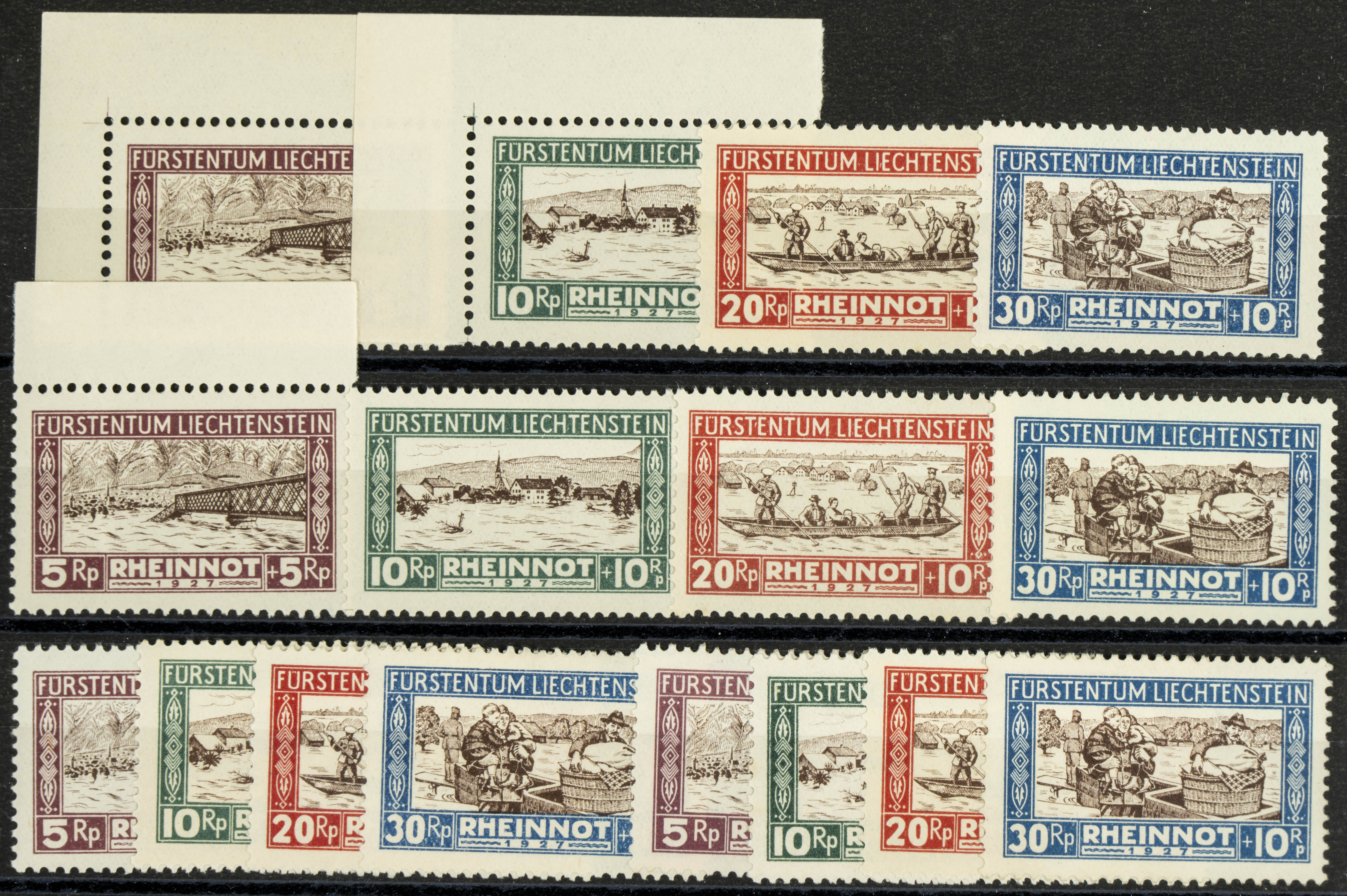 English Yvert 78/81(4). 1928. Set of four complete Liechtenstein RHEINNOT 1928 stamp series, mint condition (two with hinges). TO BE EXAMINED. Yvert 2024: 750 Euros