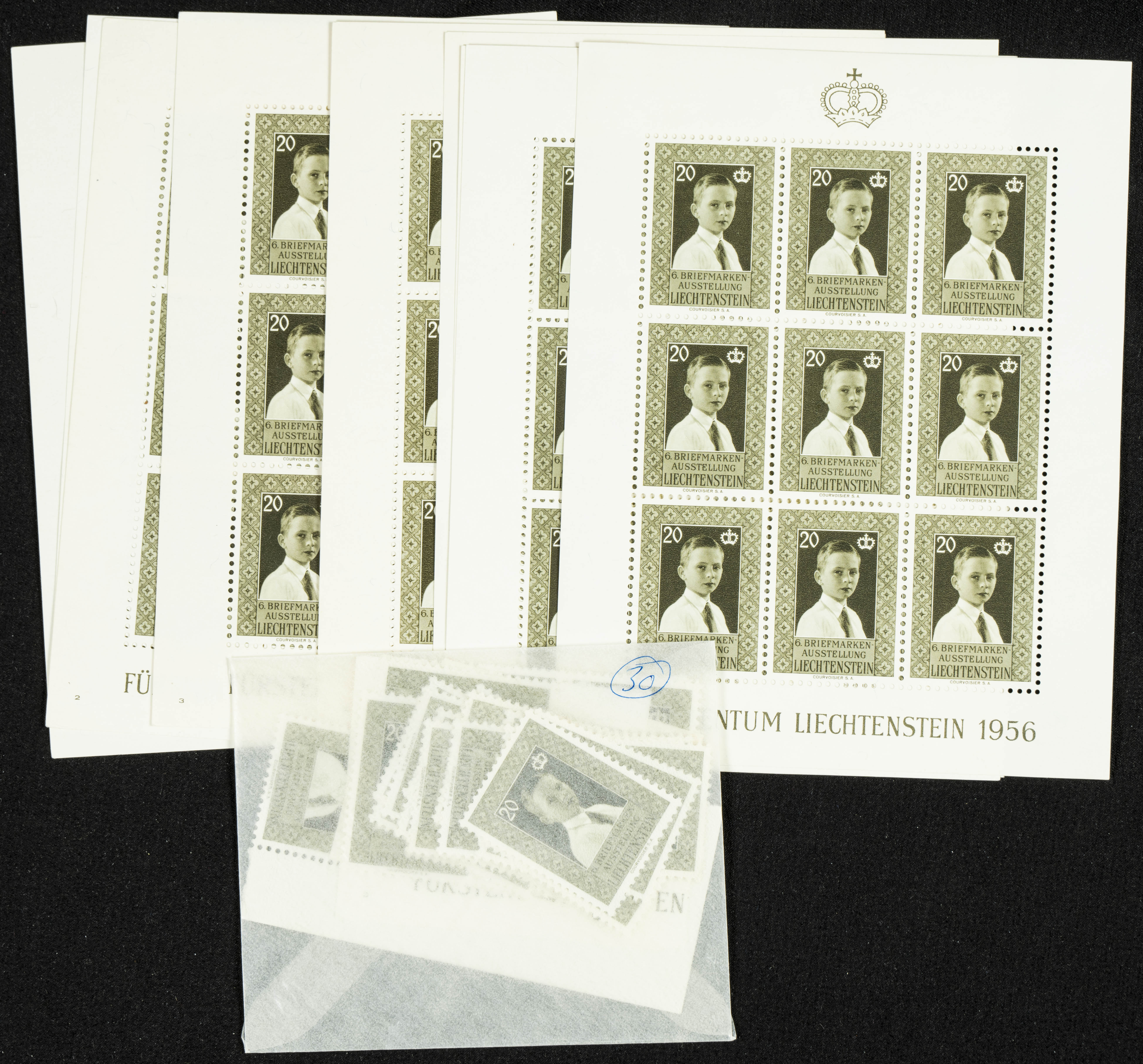 English Yvert 308(120). 1956. Set of one hundred and twenty Liechtenstein stamps, 6th Philatelic Exhibition 1956, mint condition. To be examined. Yvert 2024: 480 Euros
