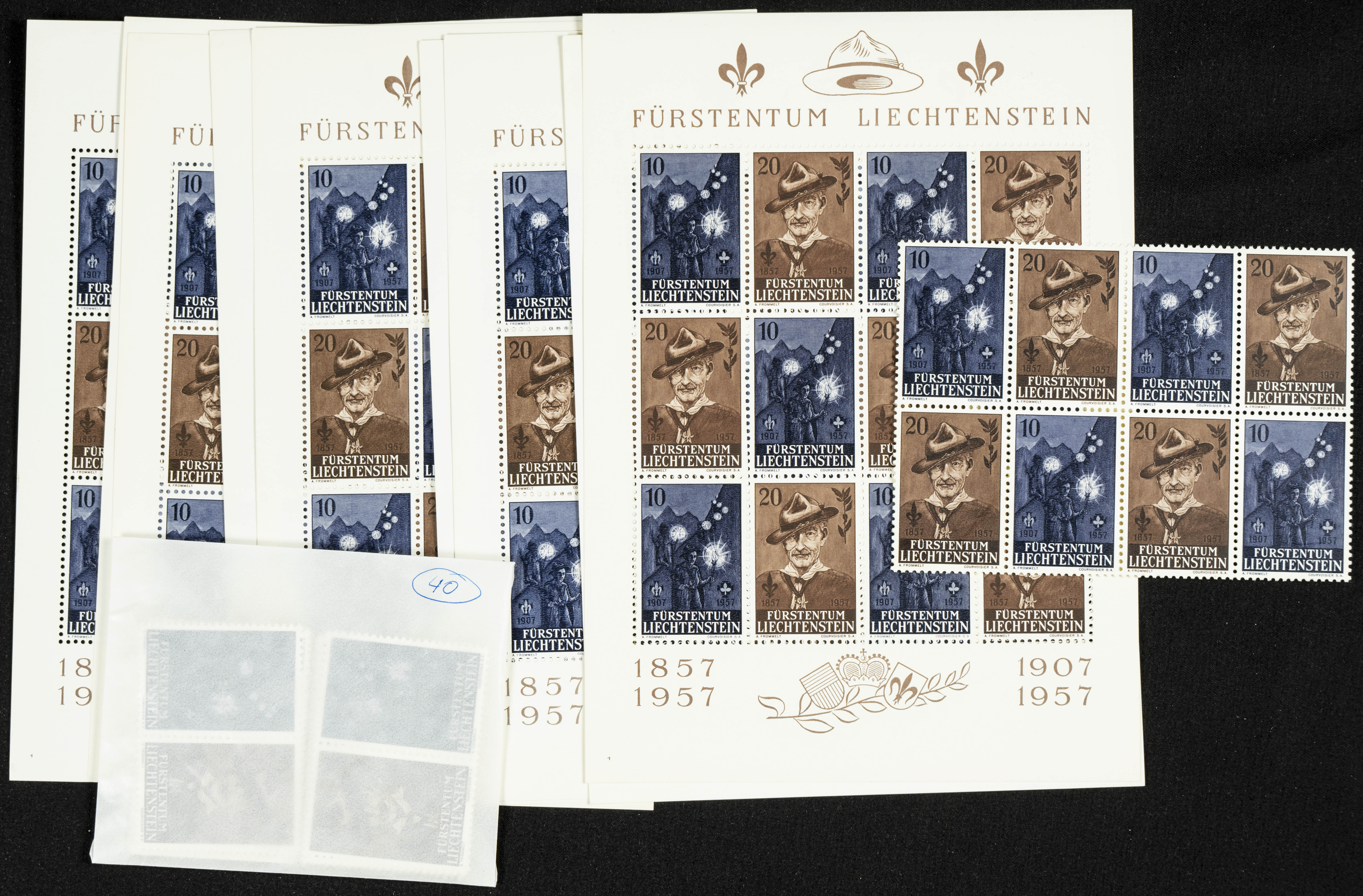 Yvert 322/23(100). 1957. Set of one hundred complete series, mostly miniature sheets, from Liechtenstein LORD BADEN POWELL 1957, in mint condition. TO BE EXAMINED. Yvert 2024: 500 Euros