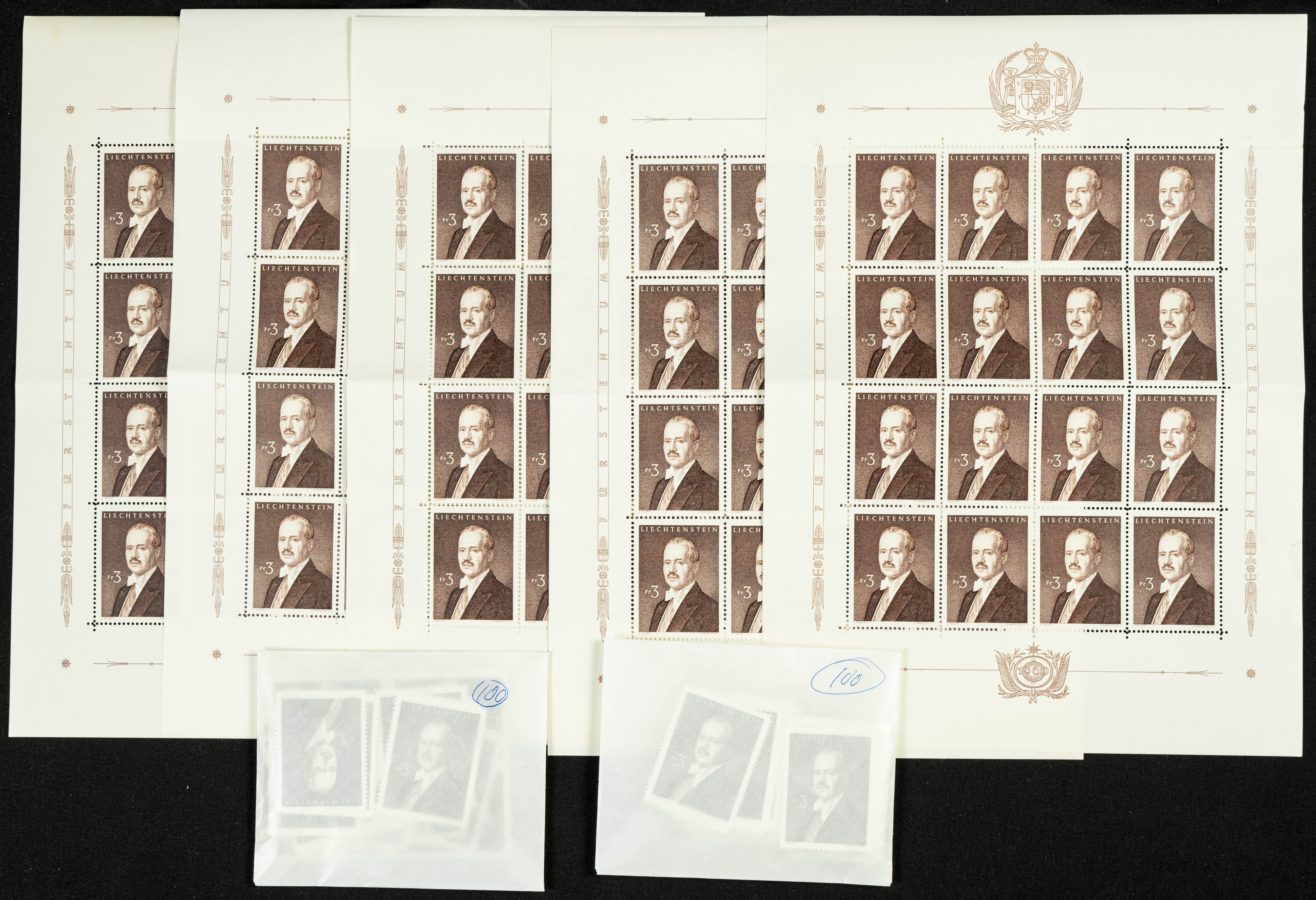 Yvert 349C(240). 1959. Set of two hundred and forty Liechtenstein 3f chestnut stamps, FRANCIUncirculatedO JOSE 1959, in mint condition. TO BE EXAMINED. Yvert 2024: 900 Euros