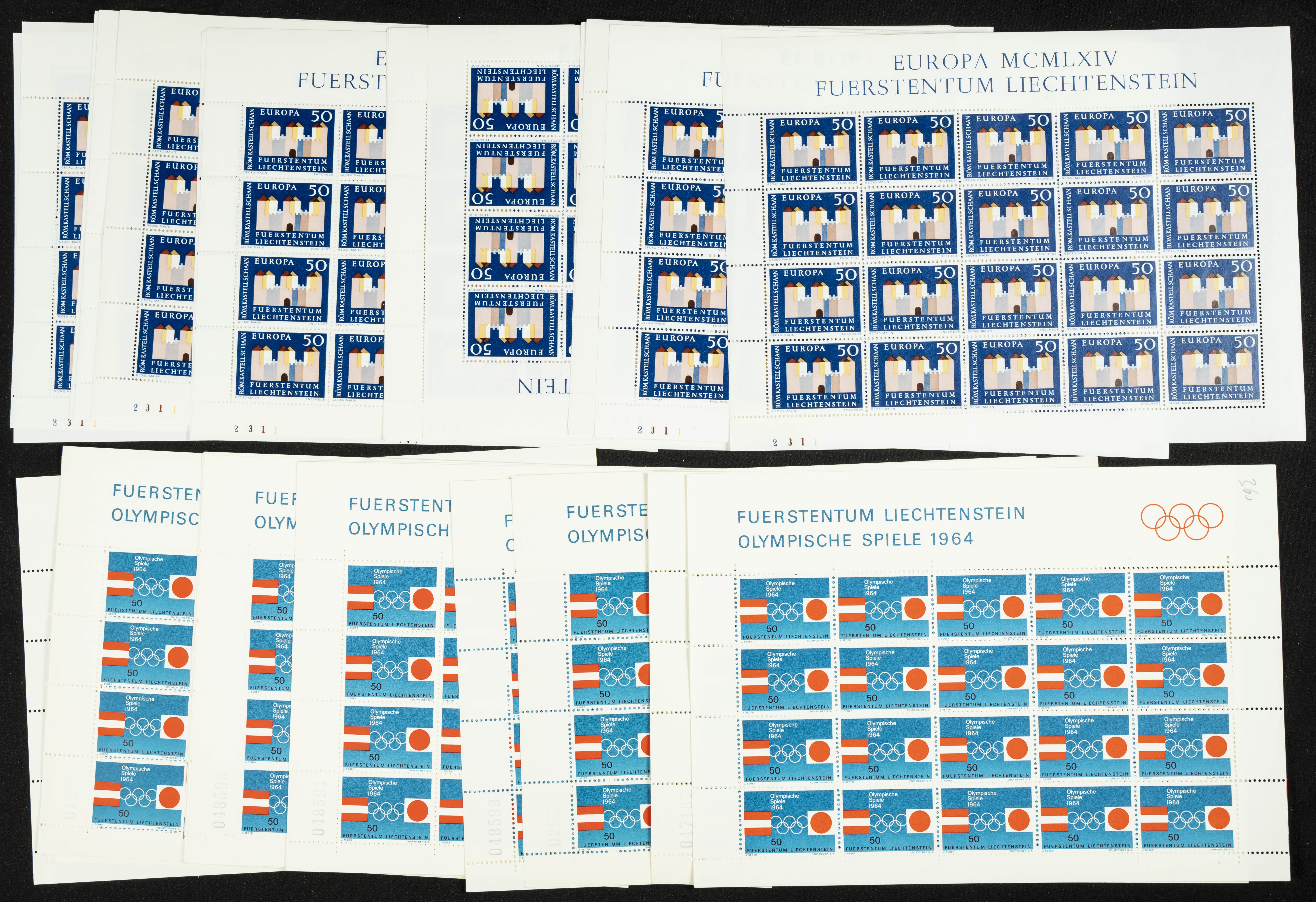 English Yvert 387(340), 388(340). 1964. Set of three hundred and forty stamps of each denomination in miniature sheets from Liechtenstein, Olympic Games and Europe 1964, in mint condition. TO BE EXAMINED. Yvert 2024: 782 Euros