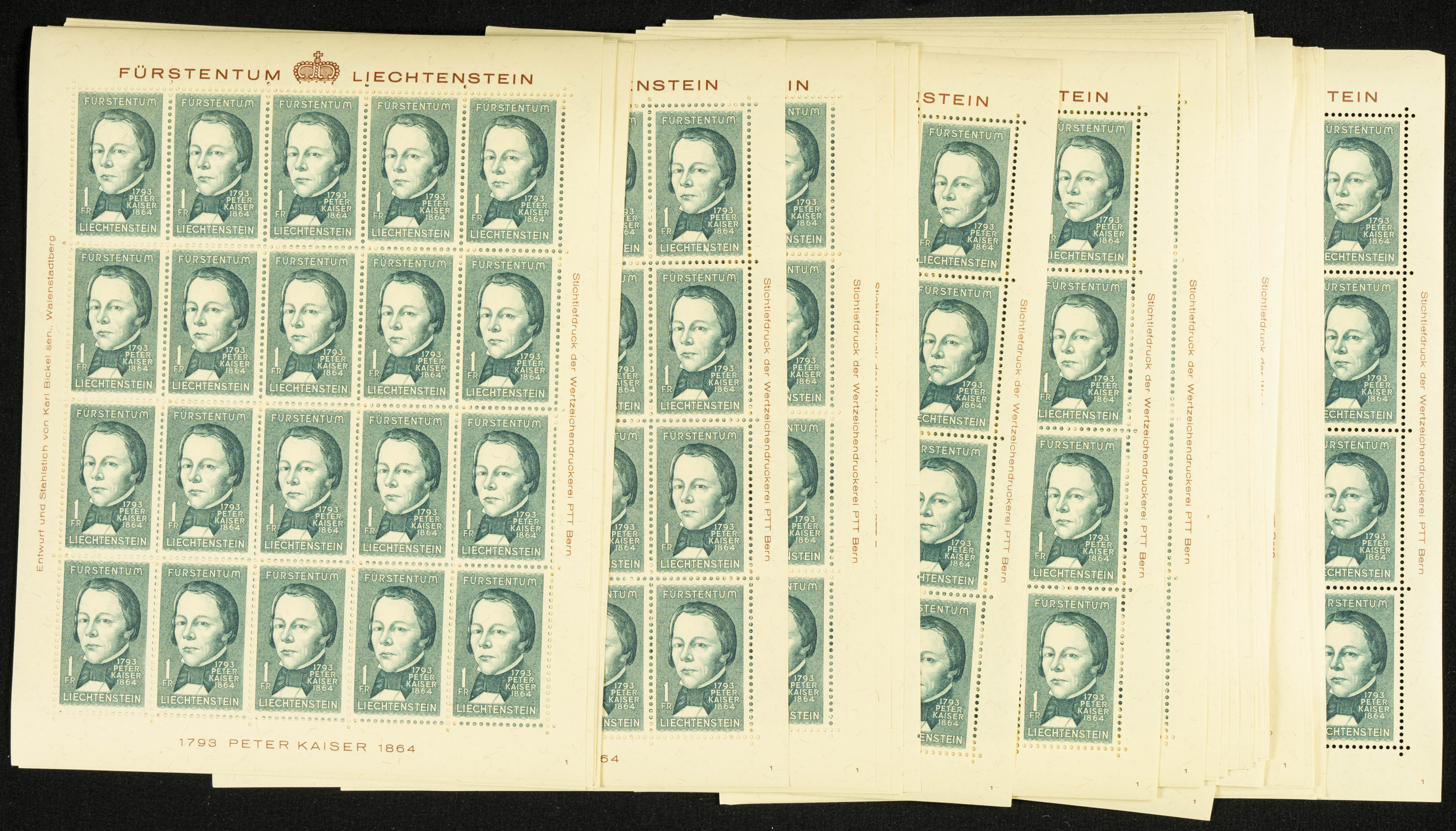 English Yvert 393 (1000). 1964. Set of one thousand Liechtenstein stamps, PETER KAISER 1964, in mint condition and miniature sheets. TO BE EXAMINED. Yvert 2024: 1,250 Euros