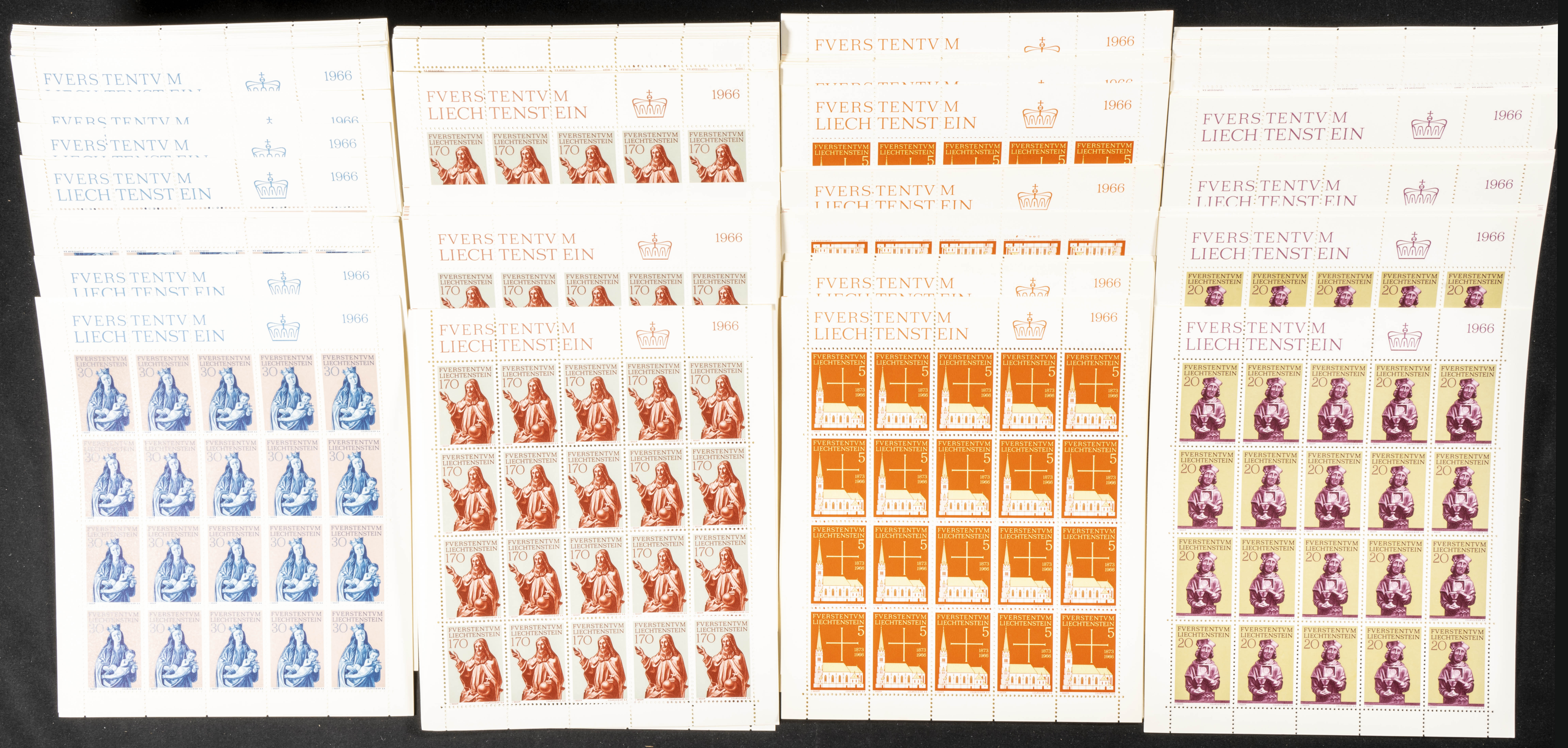Yvert 418/21(1000). 1966. Set of one thousand complete series (Vaduz Church) from Liechtenstein, 1966, in mint condition and mostly in sheets. TO BE EXAMINED. Yvert 2024: 3,000 Euros