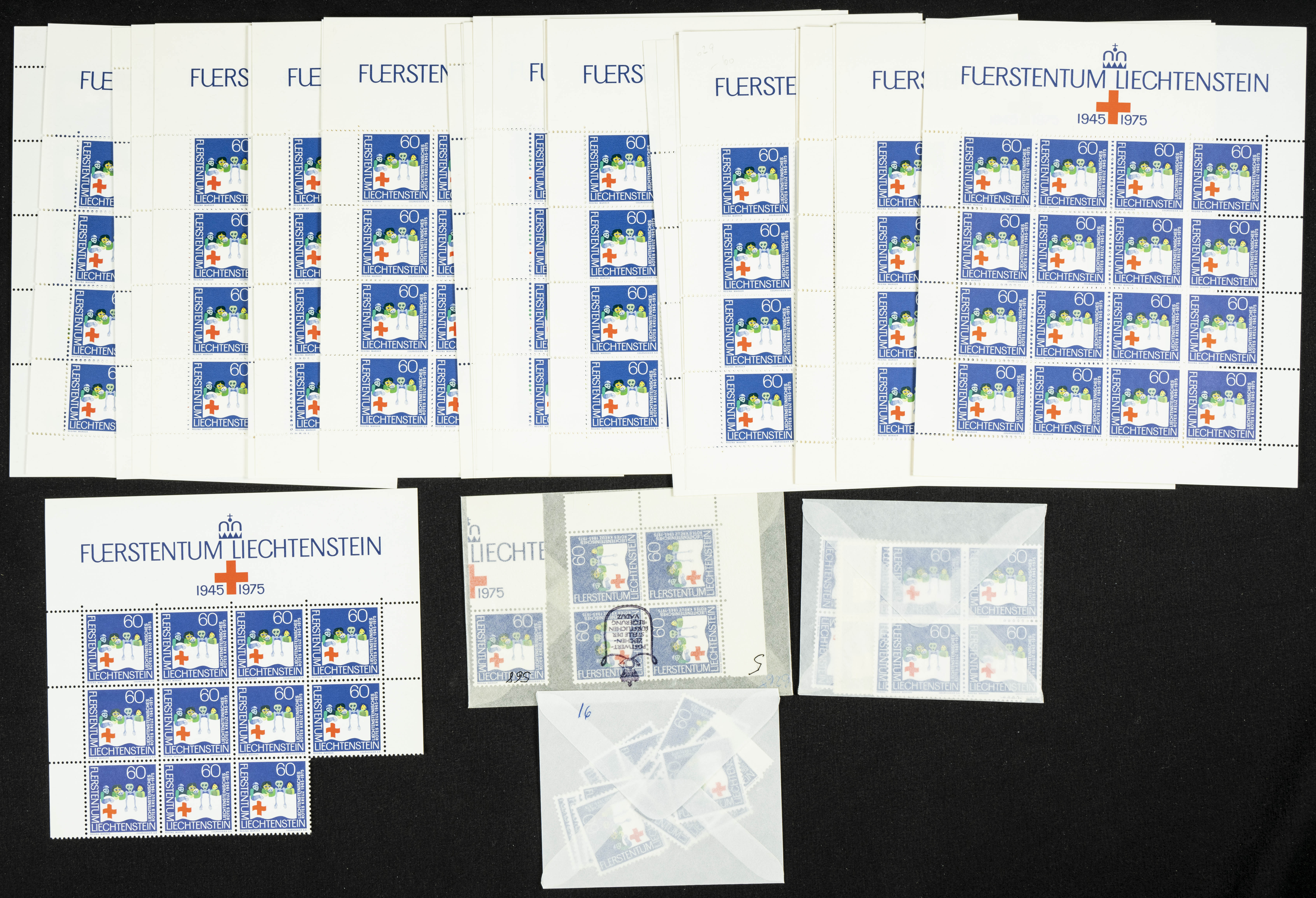 English Yvert 568 (500). 1975. Set of five hundred stamps, mostly in miniature sheets, from Liechtenstein. RED CROSS 1975, in mint condition. TO BE EXAMINED. Yvert 2024: 500 Euros
