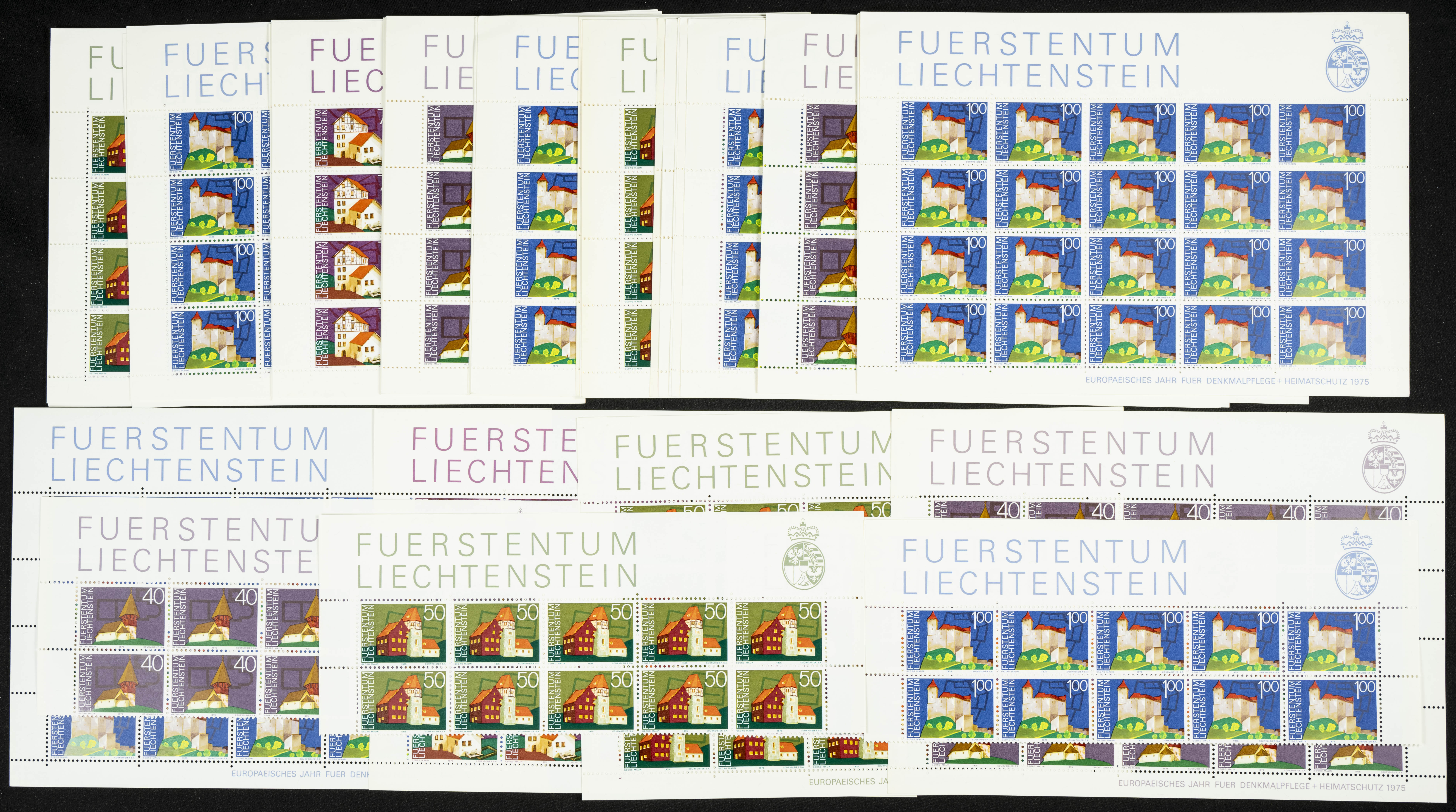English Yvert 573/76(190). 1975. Set of one hundred and ninety complete series, mostly on miniature sheets, of Liechtenstein AGoodHITECTURE 1975, in mint condition. TO BE EXAMINED. Yvert 2024: 760 Euros