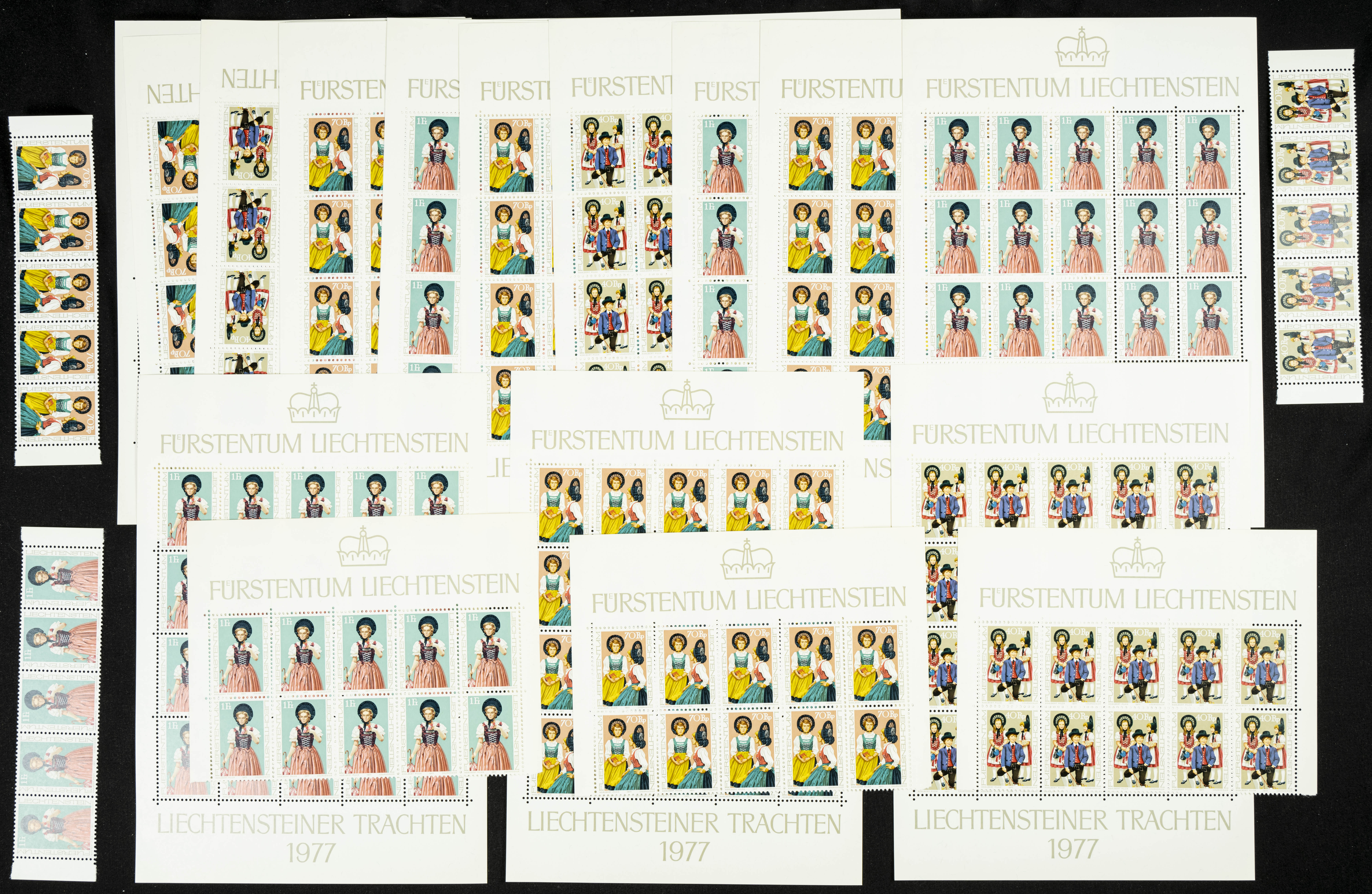 English Yvert 625/27(135). 1977. Set of one hundred and thirty-five complete series, mostly on miniature sheets, of Liechtenstein TRADITIONAL COSTUMES 1977, in new condition. TO BE EXAMINED. Yvert 2024: 472 Euros