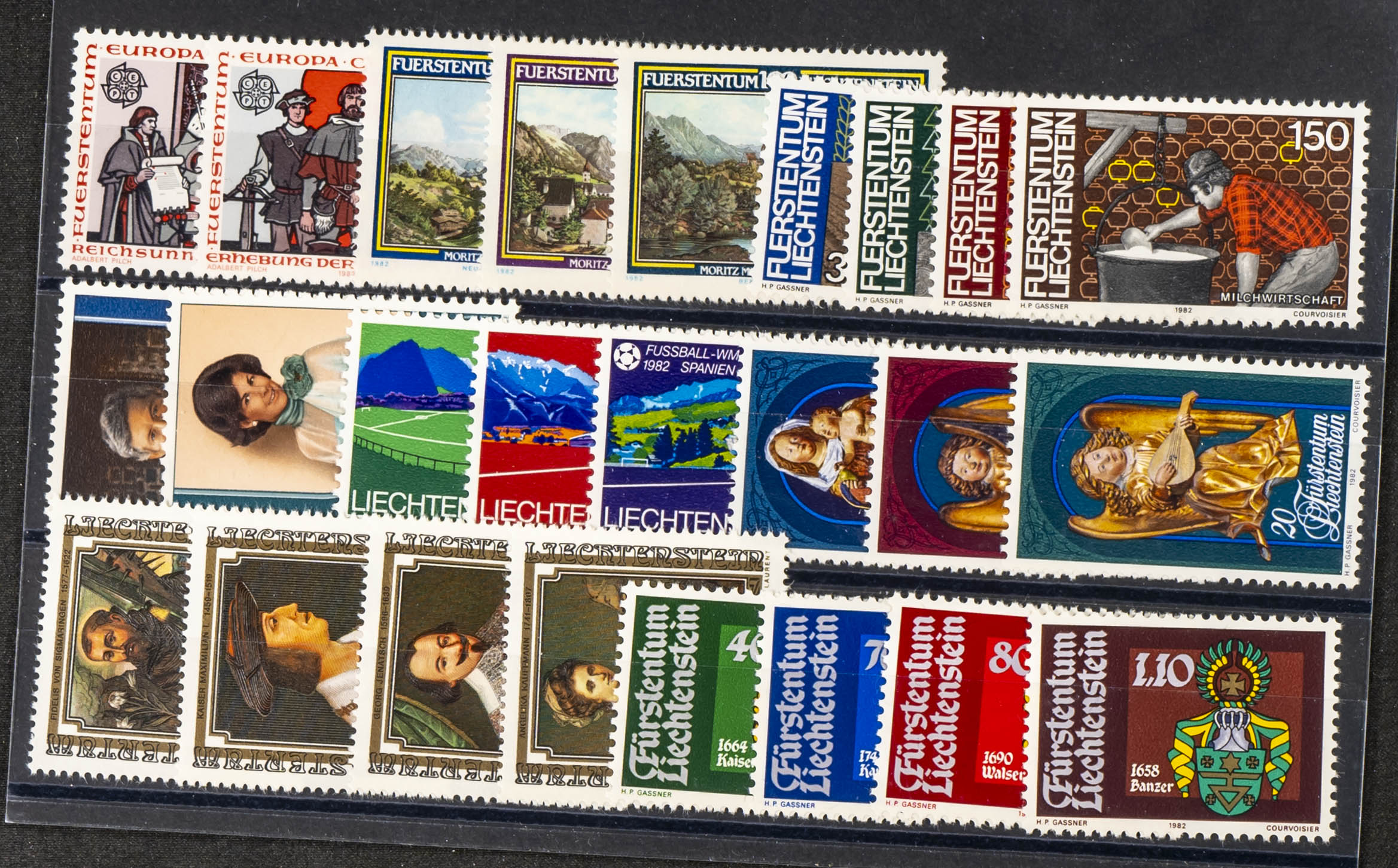 English Yvert 732/56(54). 1982. Complete set of fifty-four Liechtenstein banknotes from 1982 (mounted on cards). TO BE EXAMINED. Yvert 2024: 1,576 Euros