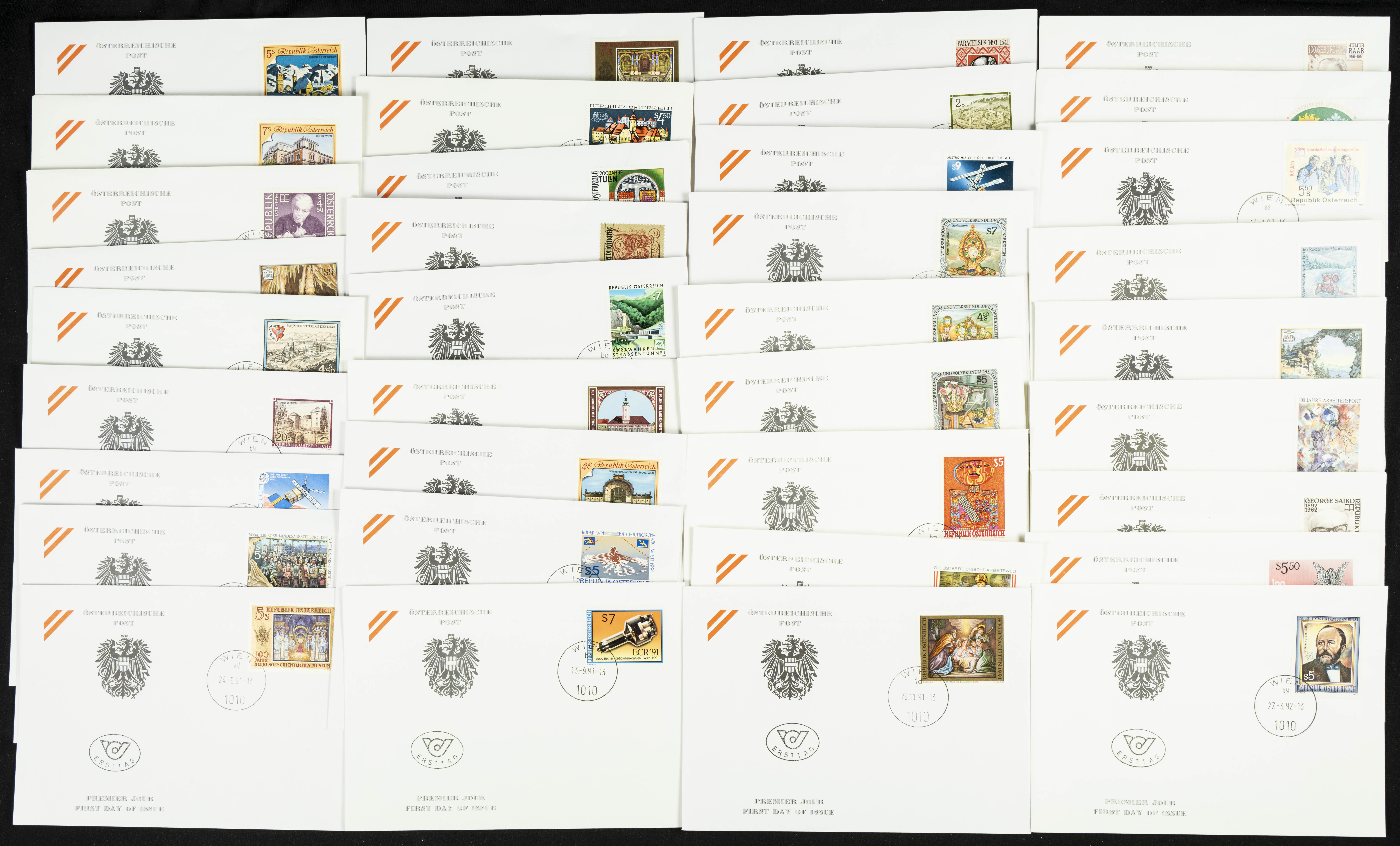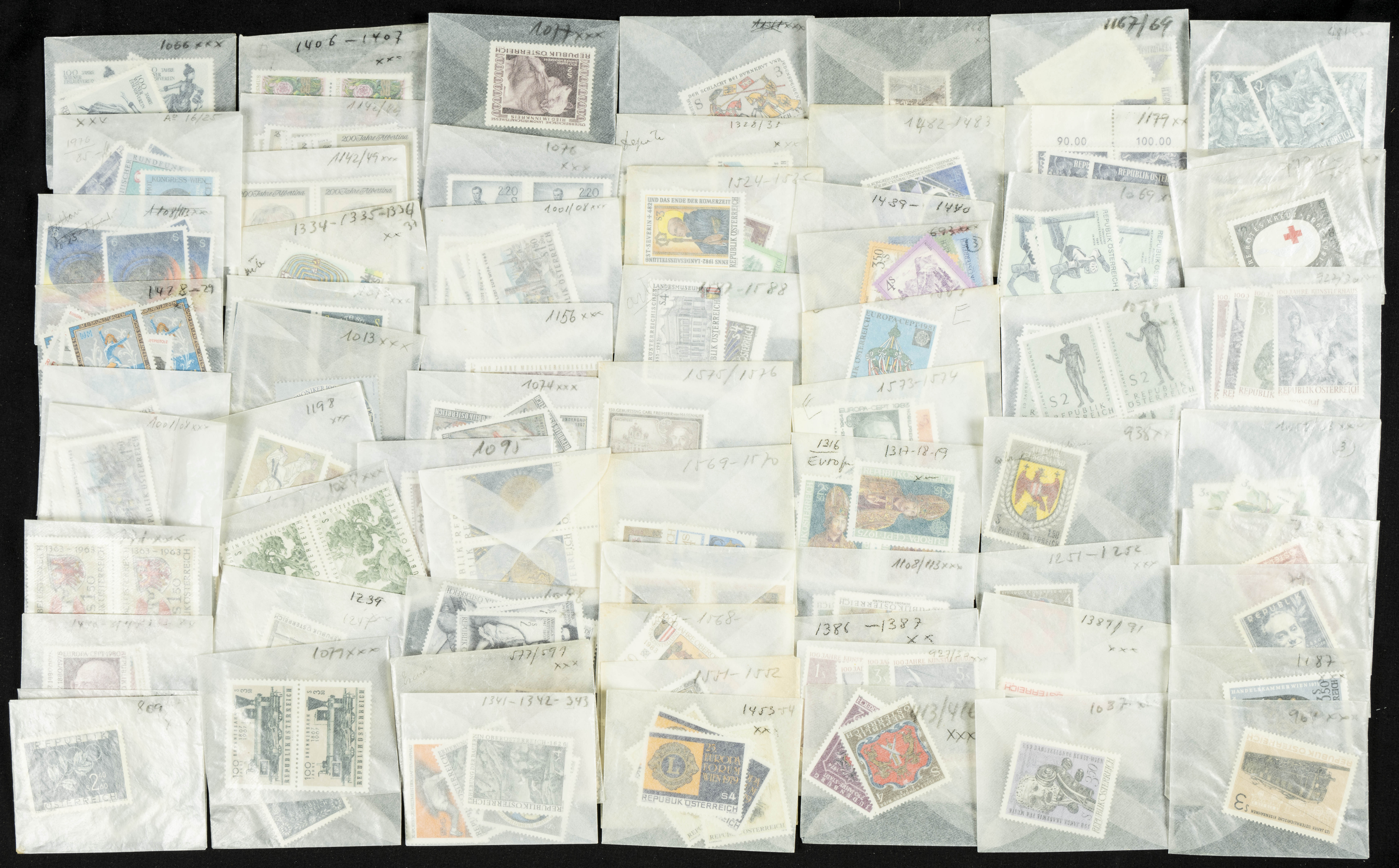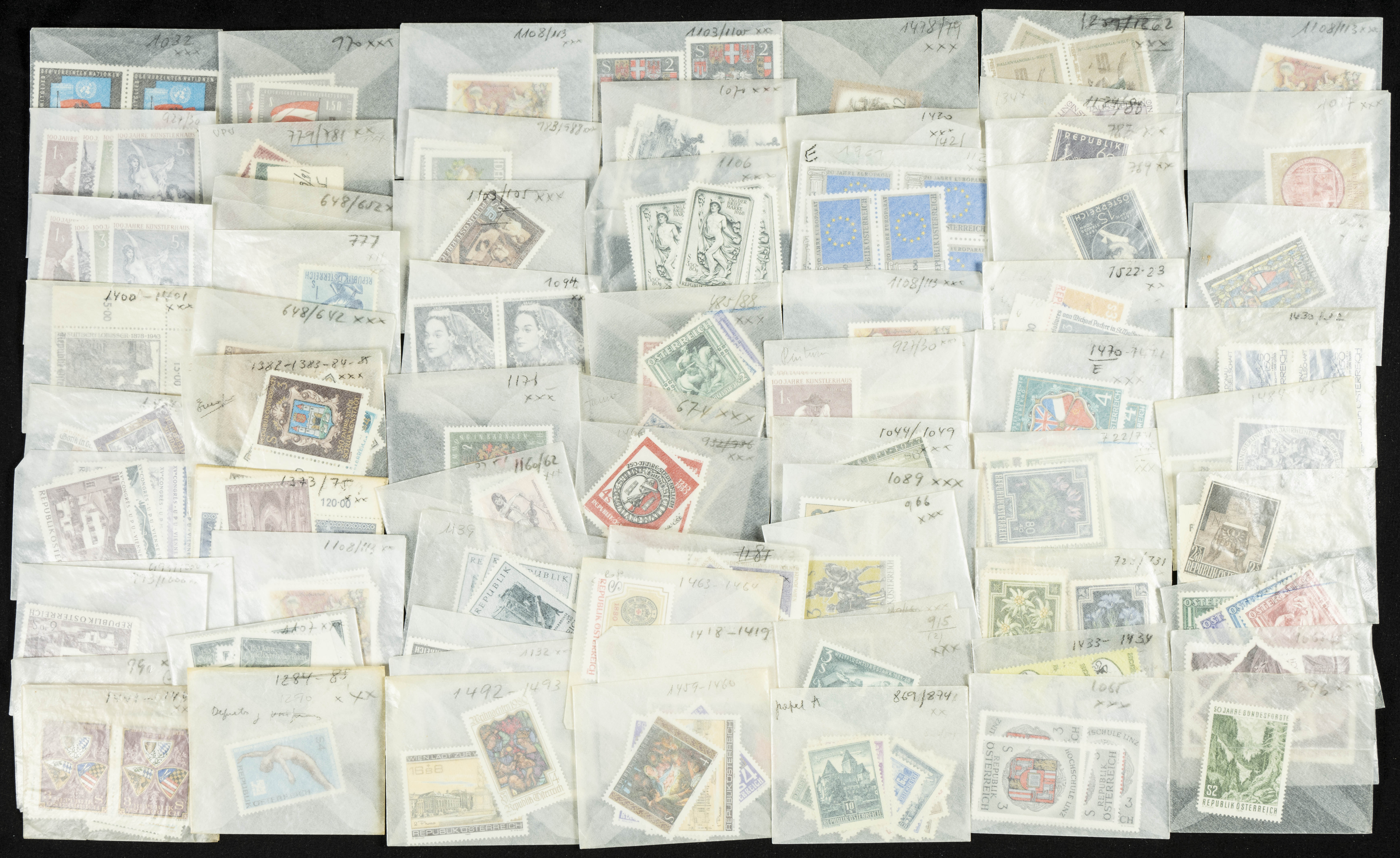 English ★★/★(1945ca). Complete set of Austrian stamps and series between 1945 and 1982, in mint condition, some stamps with hinges and some duplicates (mounted in glass envelopes), includes a set of First Day Covers between 1974 and 1992. HIGH CATALOG VALUE. TO BE EXAMINED.