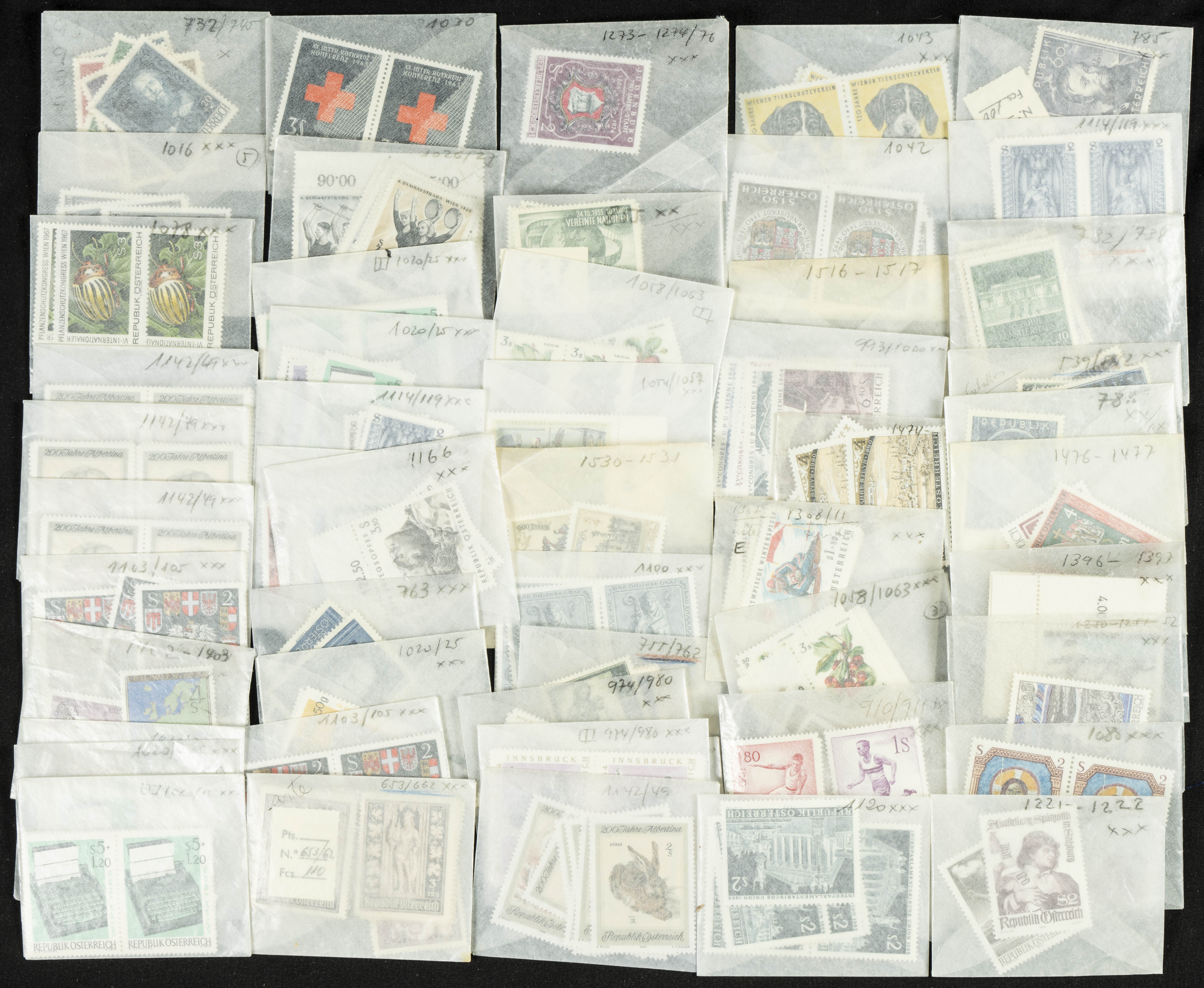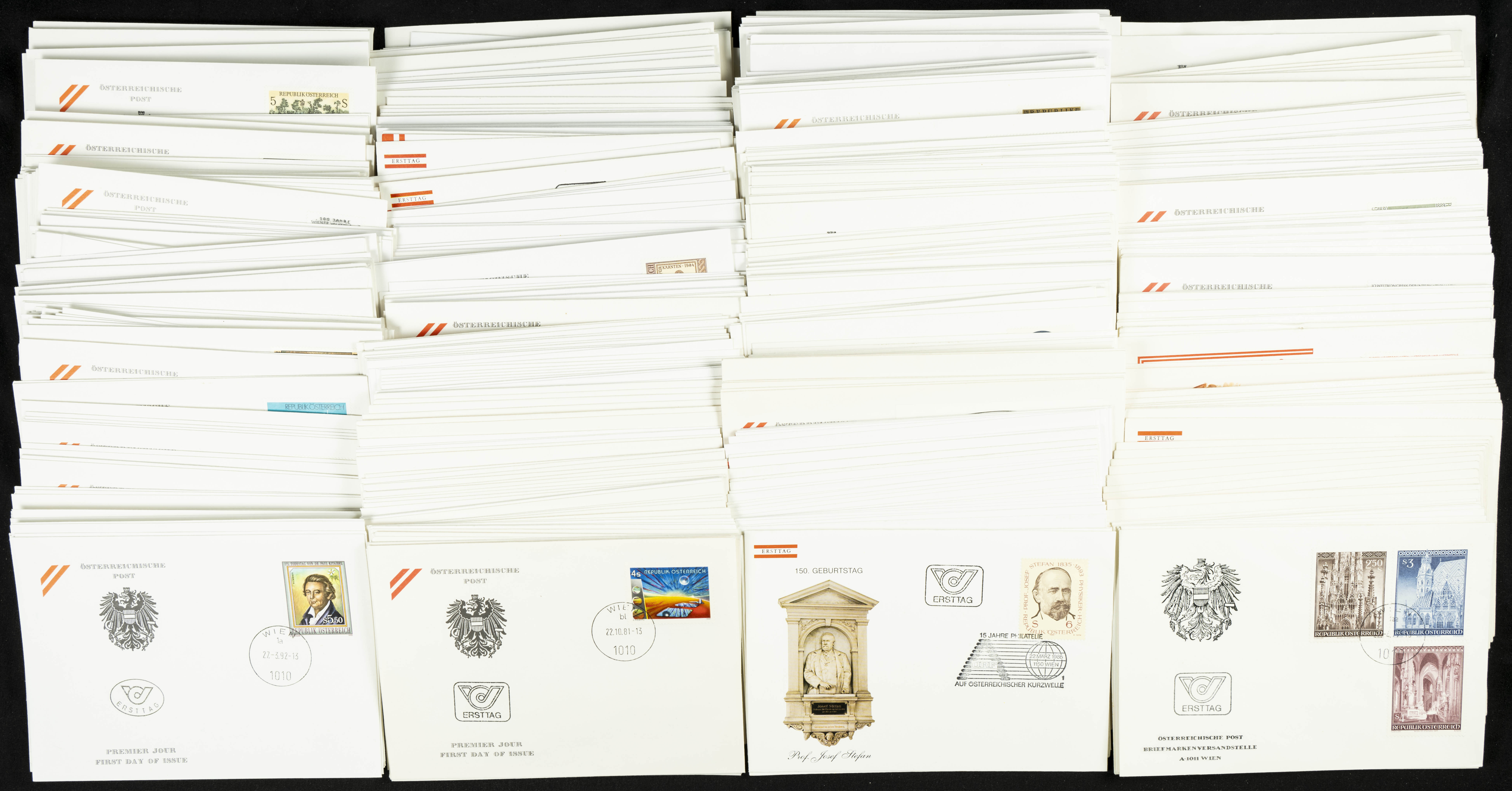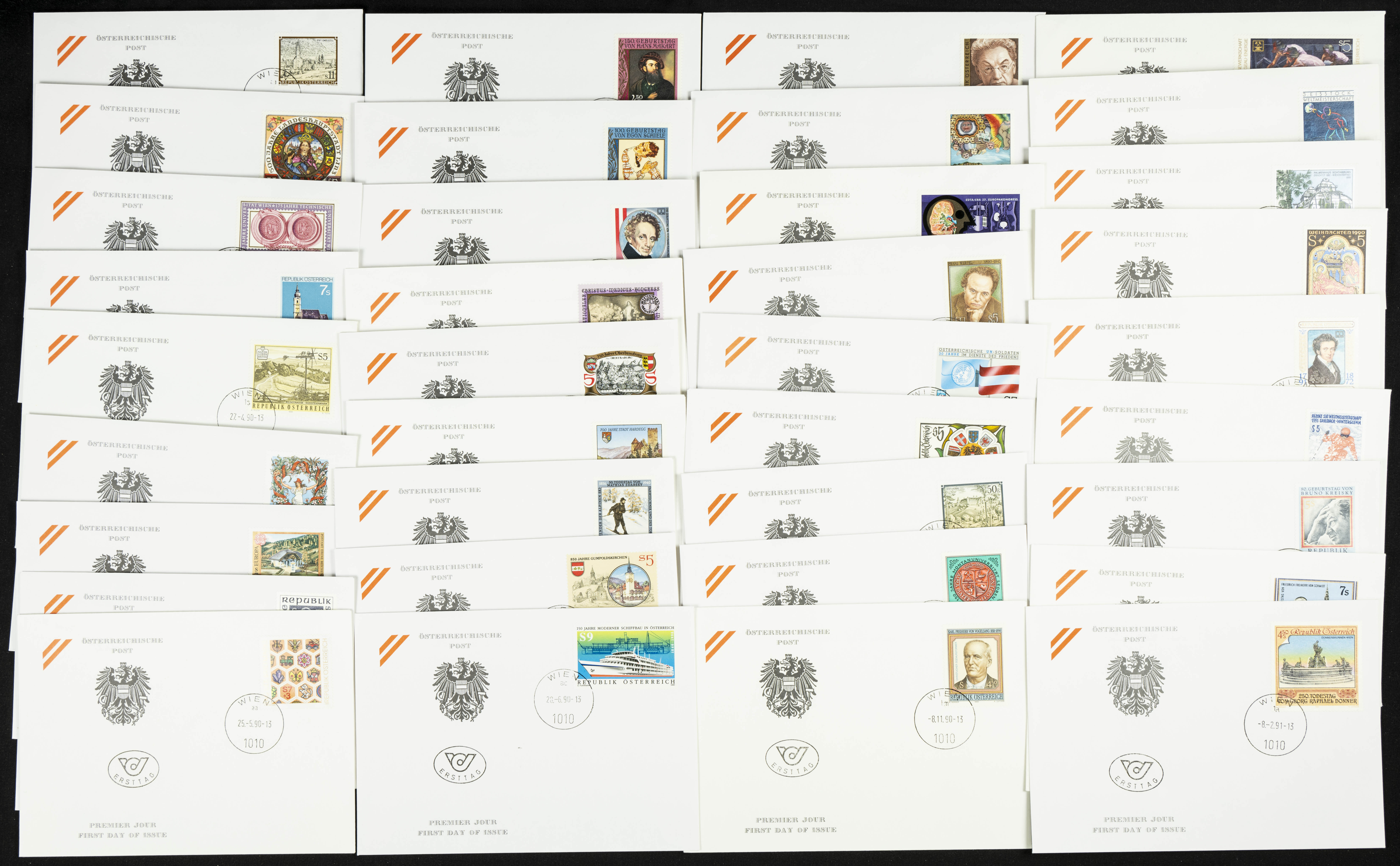English ★★/★(1945ca). Complete set of Austrian stamps and series between 1945 and 1982, in mint condition, some stamps with hinges and some duplicates (mounted in glass envelopes), includes a set of First Day Covers between 1974 and 1992. HIGH CATALOG VALUE. TO BE EXAMINED.