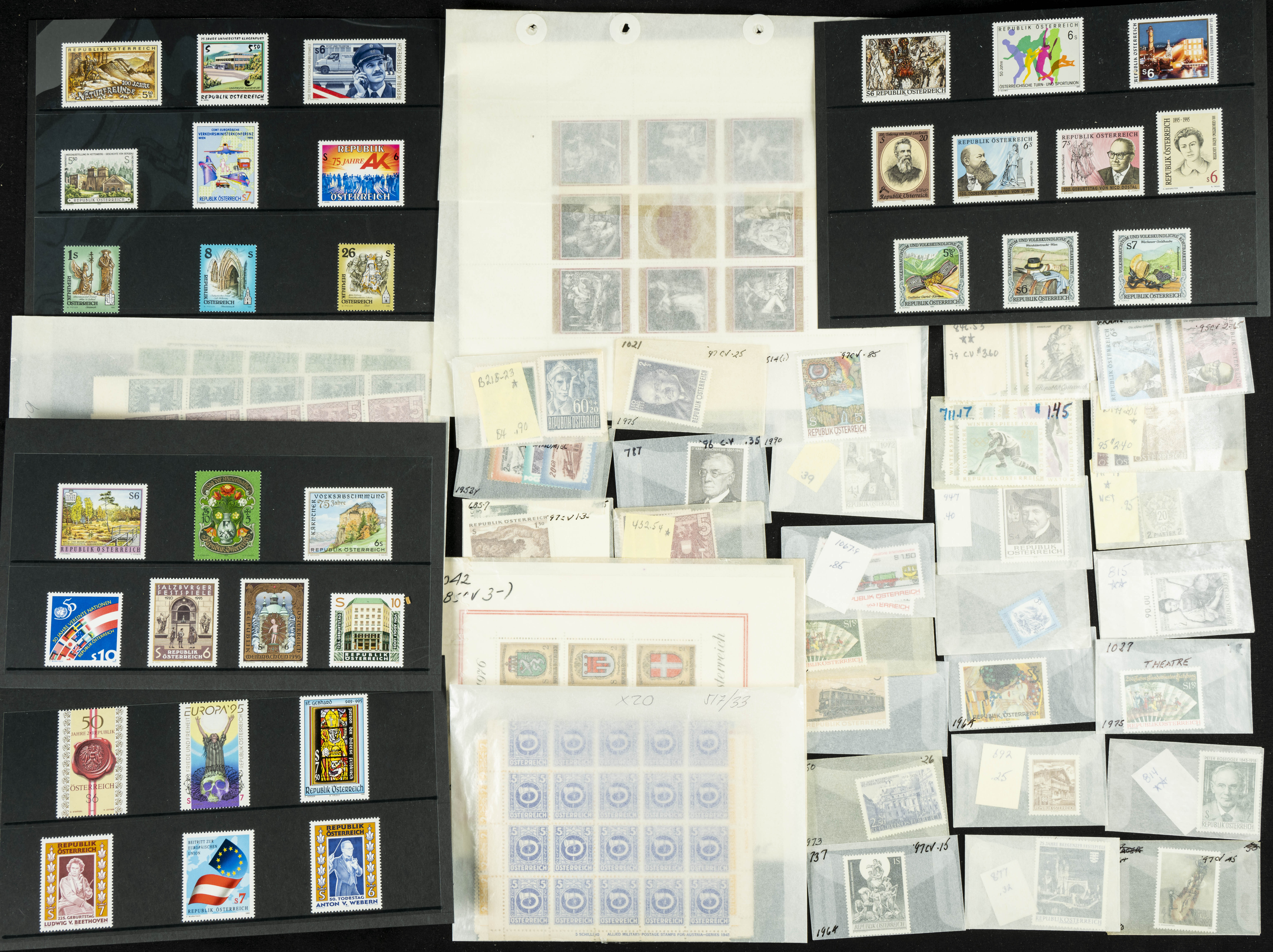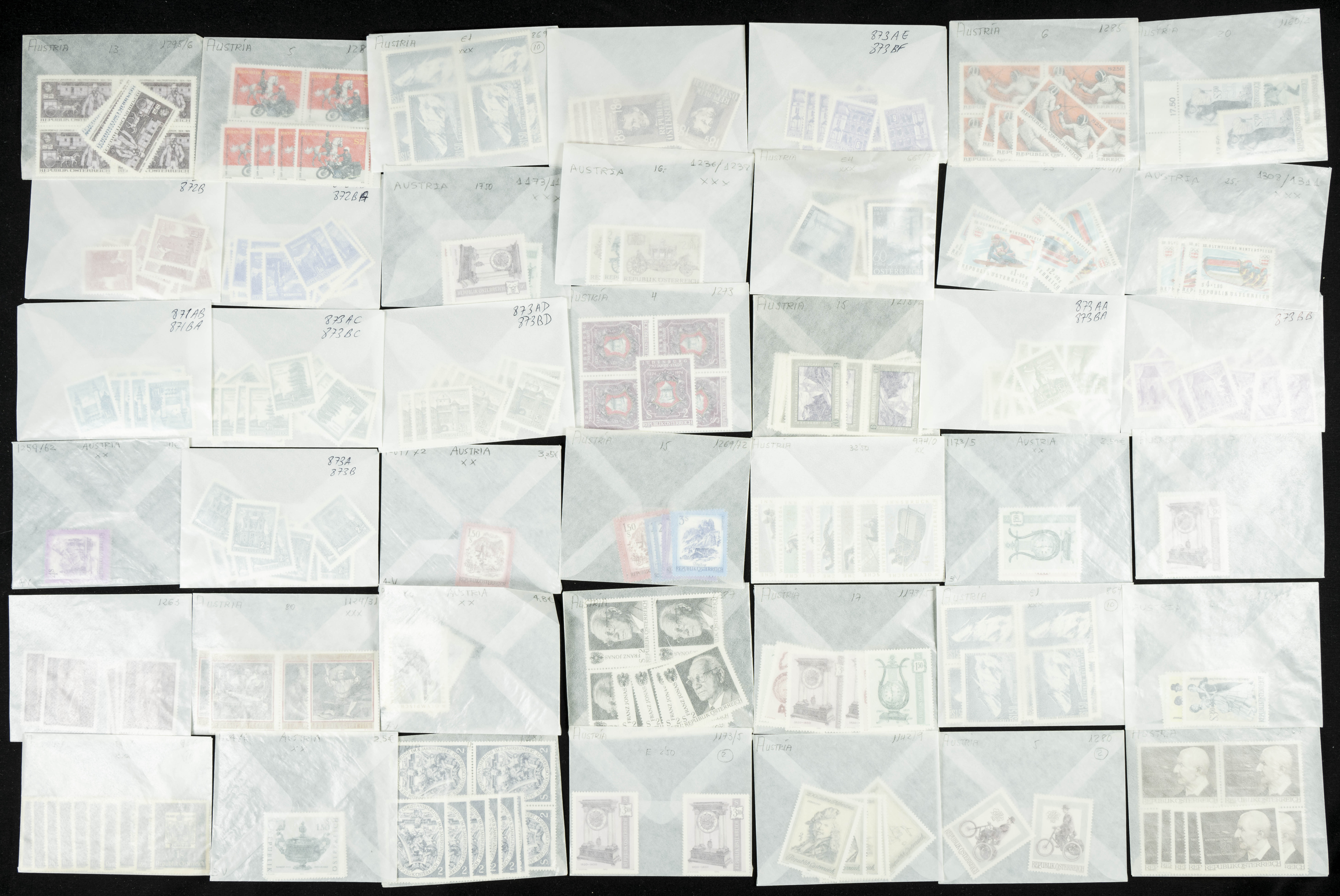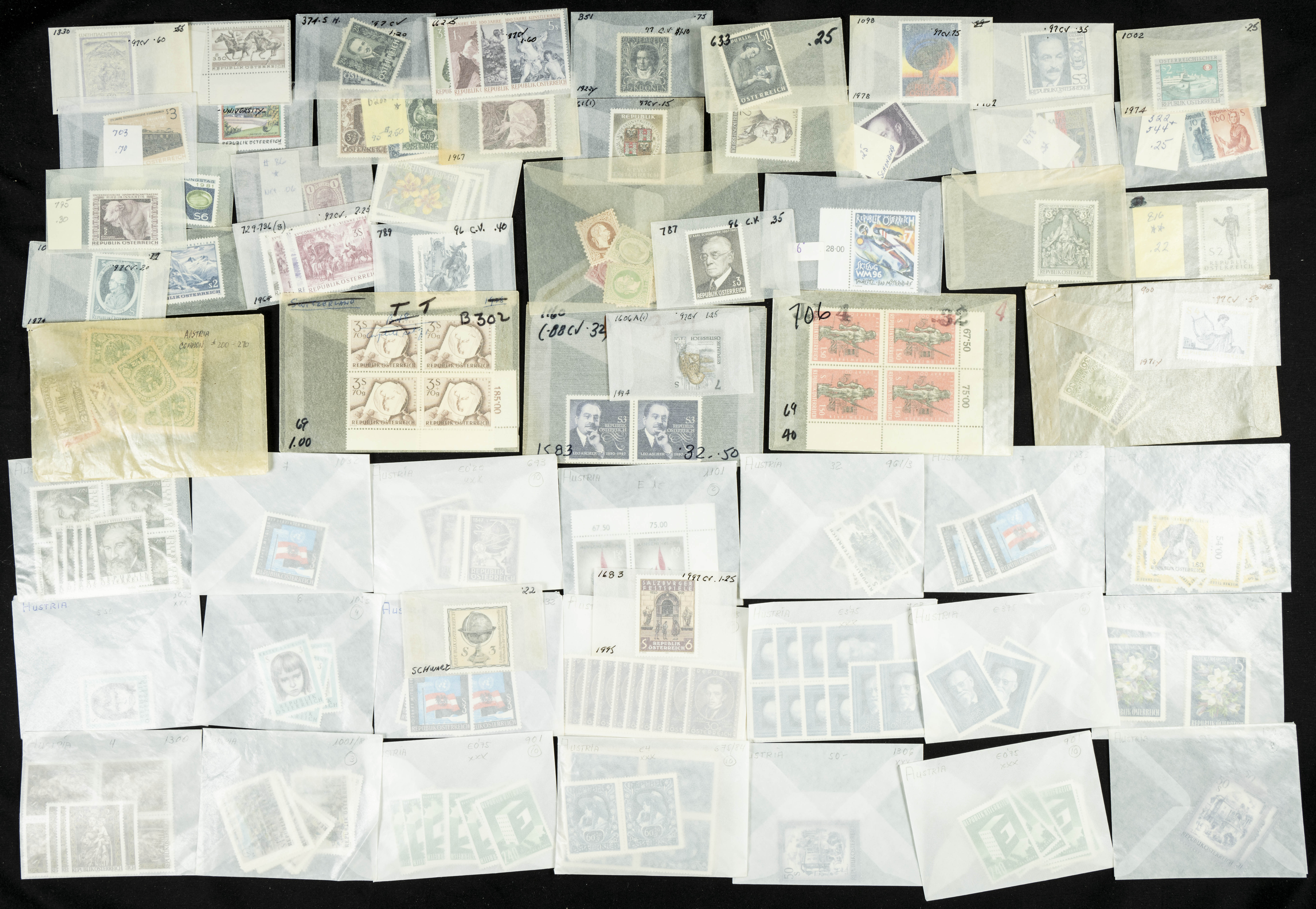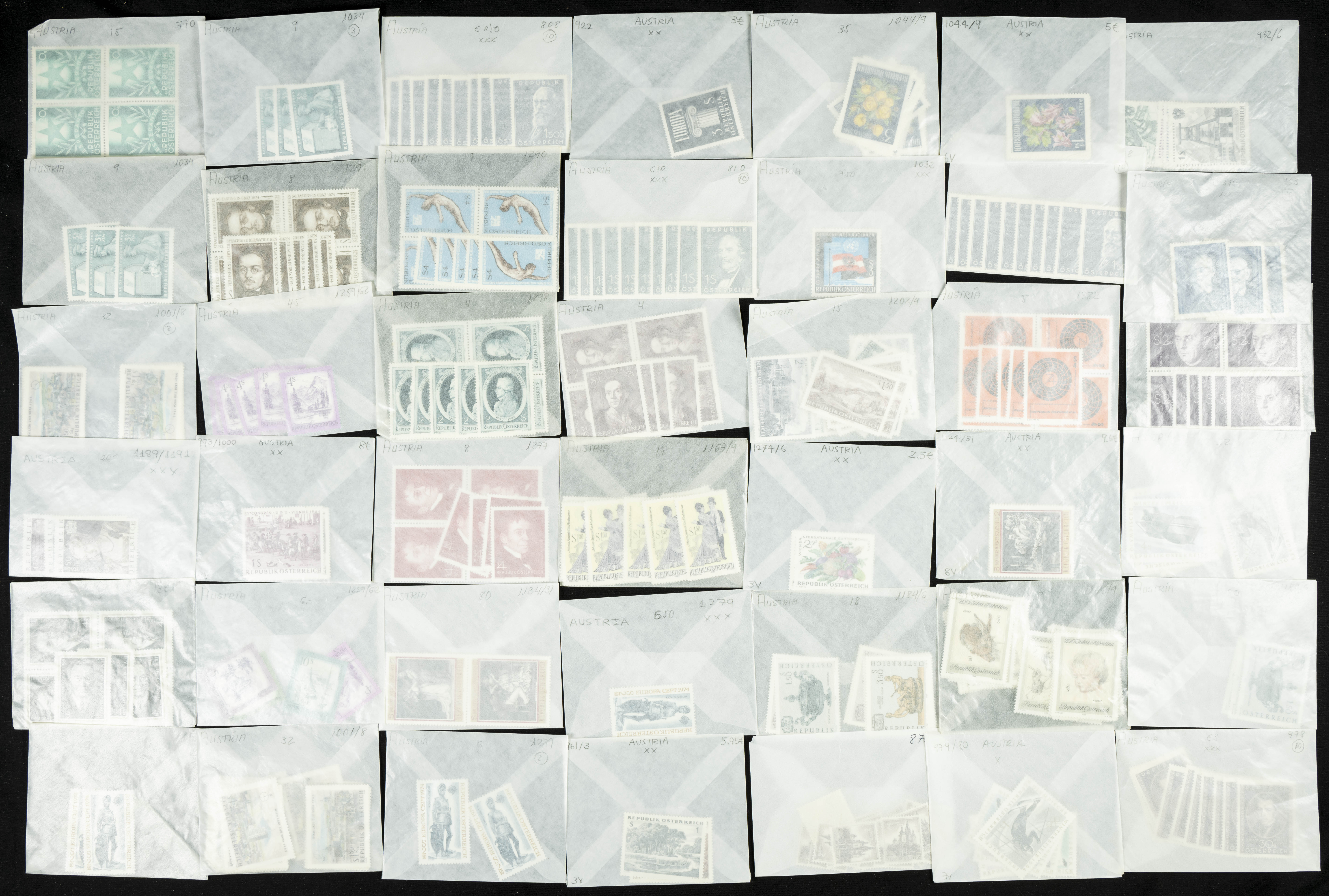 English ★★(1945ca). Interesting stock of Austrian stamps and complete series from 1945 to 1995, in mint condition and mostly without hinges, with varying quantities, arranged in glass envelopes with Yvert number markings. HIGH CATALOG VALUE. TO BE EXAMINED.