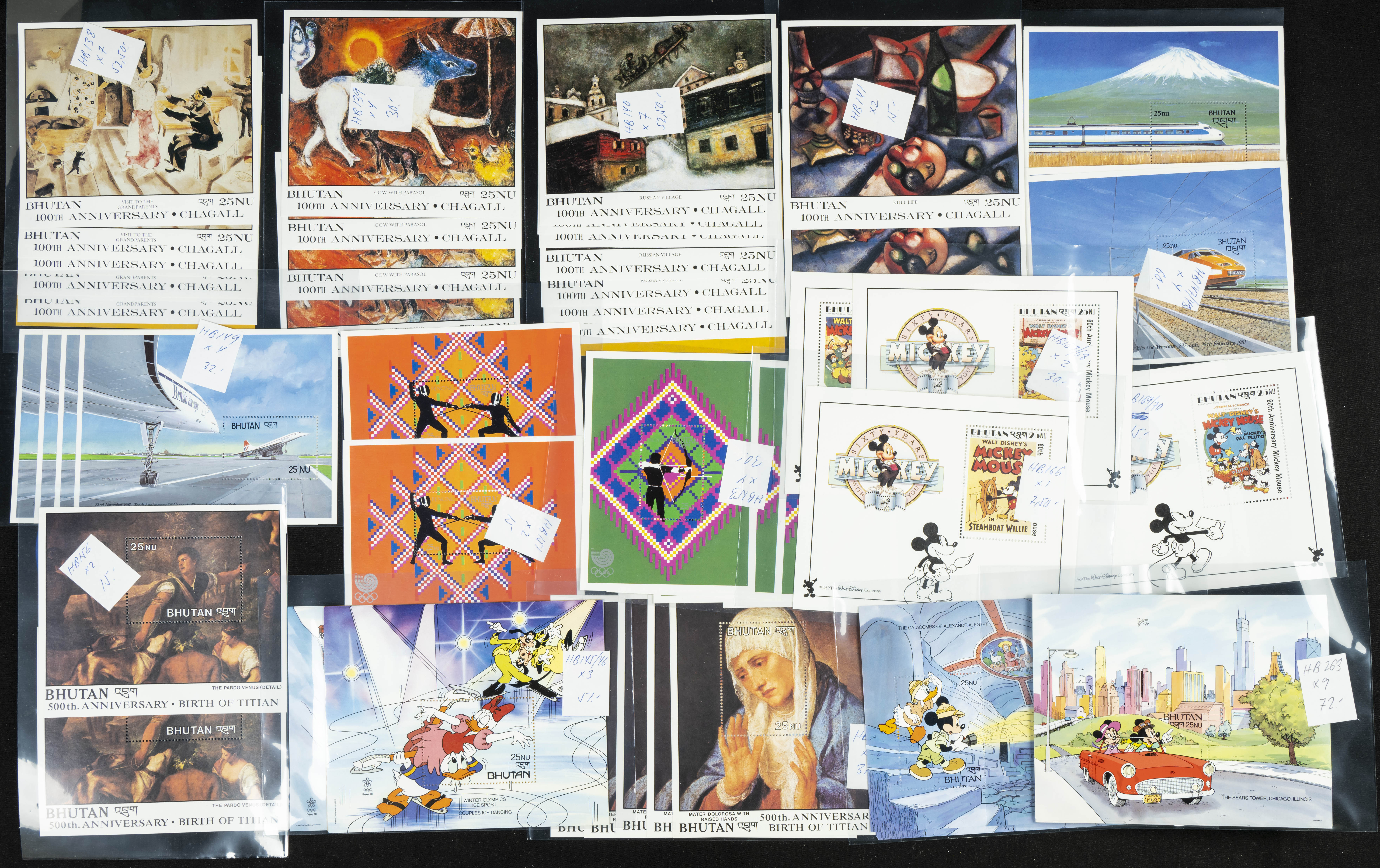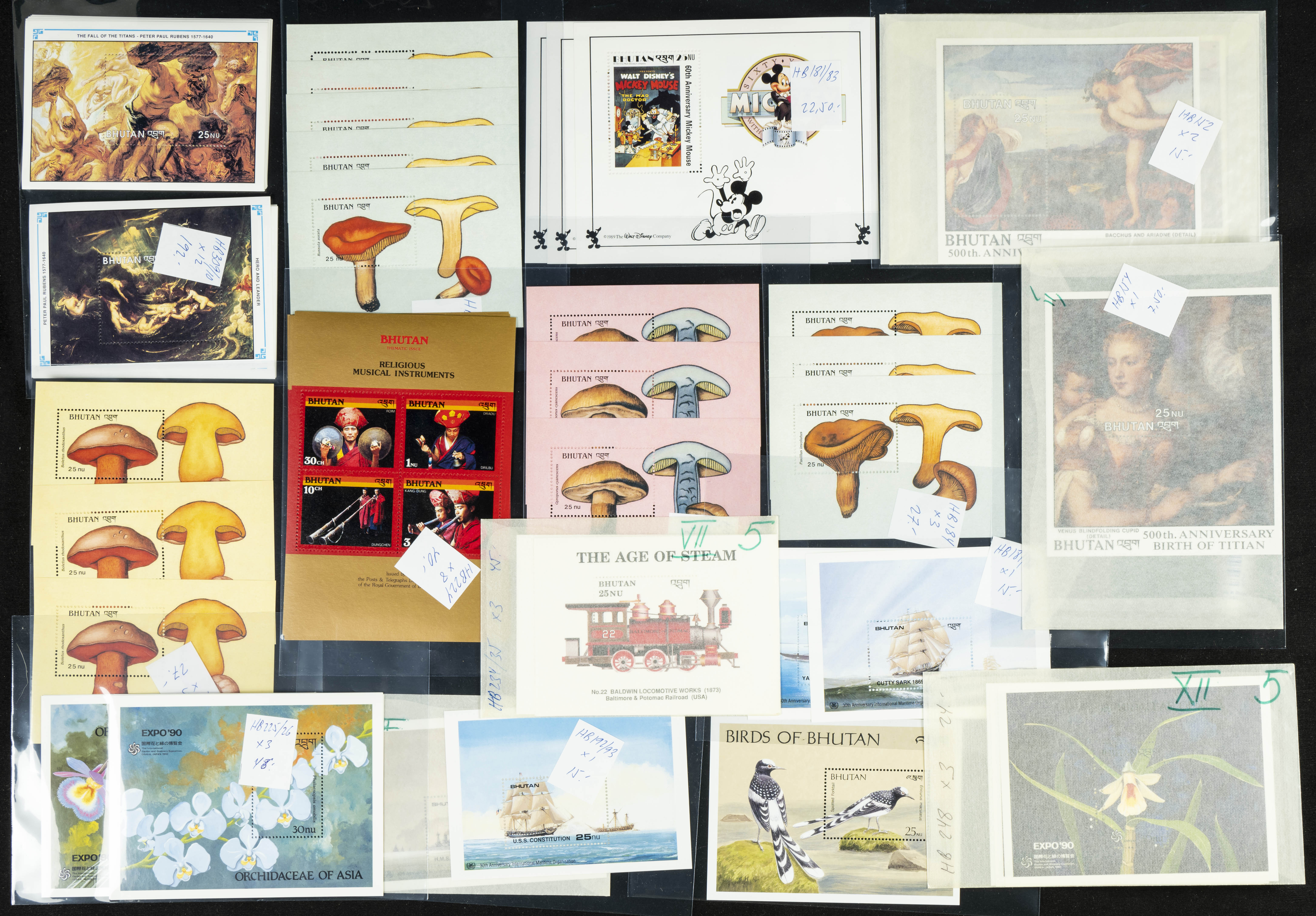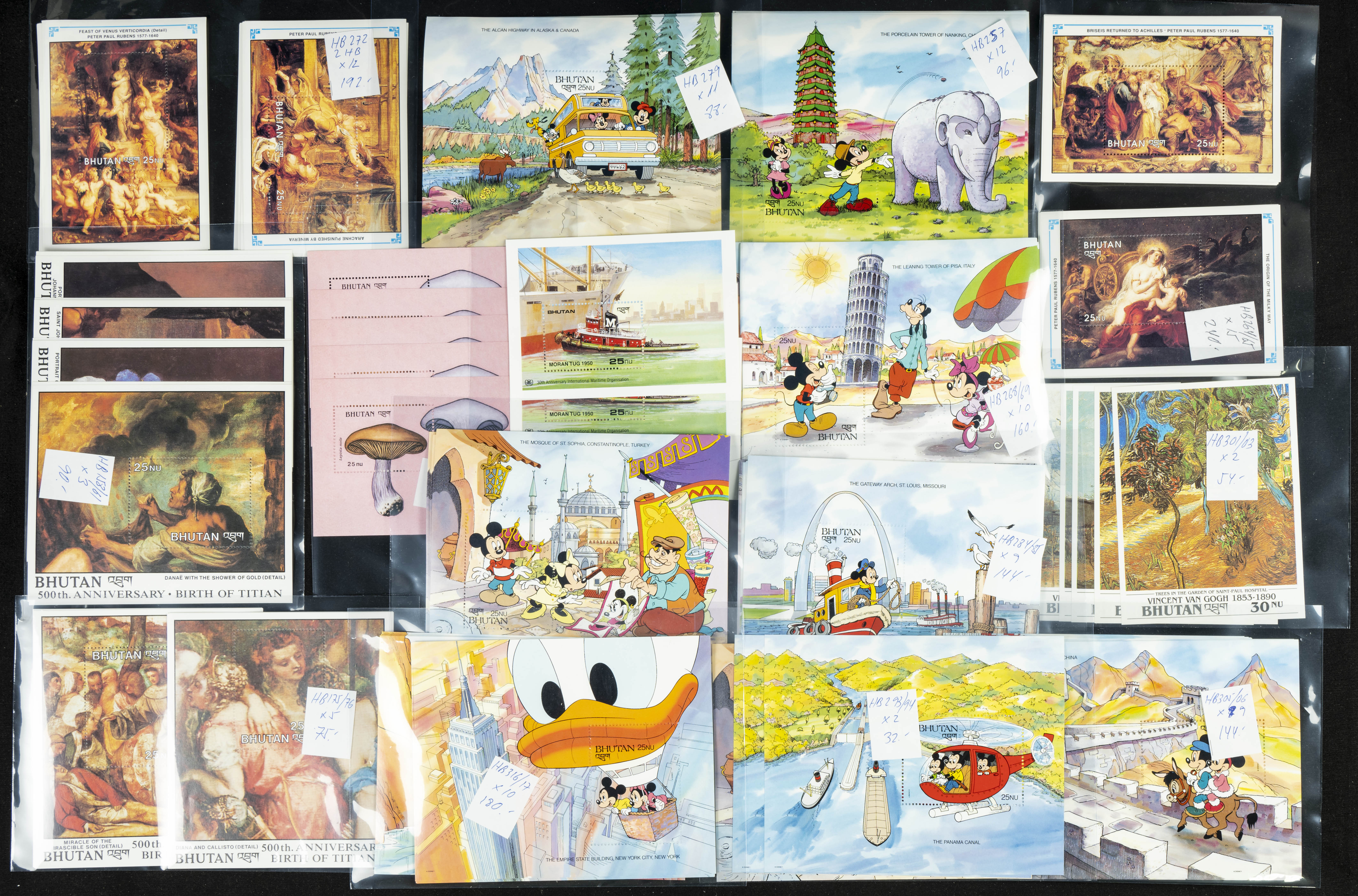 ★★(circa 1964). Interesting stock of Bhutanese souvenir sheets from 1964 to 1992, in mint condition and mostly themed, including Disney, Wildlife, Painting, and Sports, and including the 1964 series and some imperforate sheets (organized and labeled). TO BE EXAMINED. Yvert 2021: +9,000 Euros