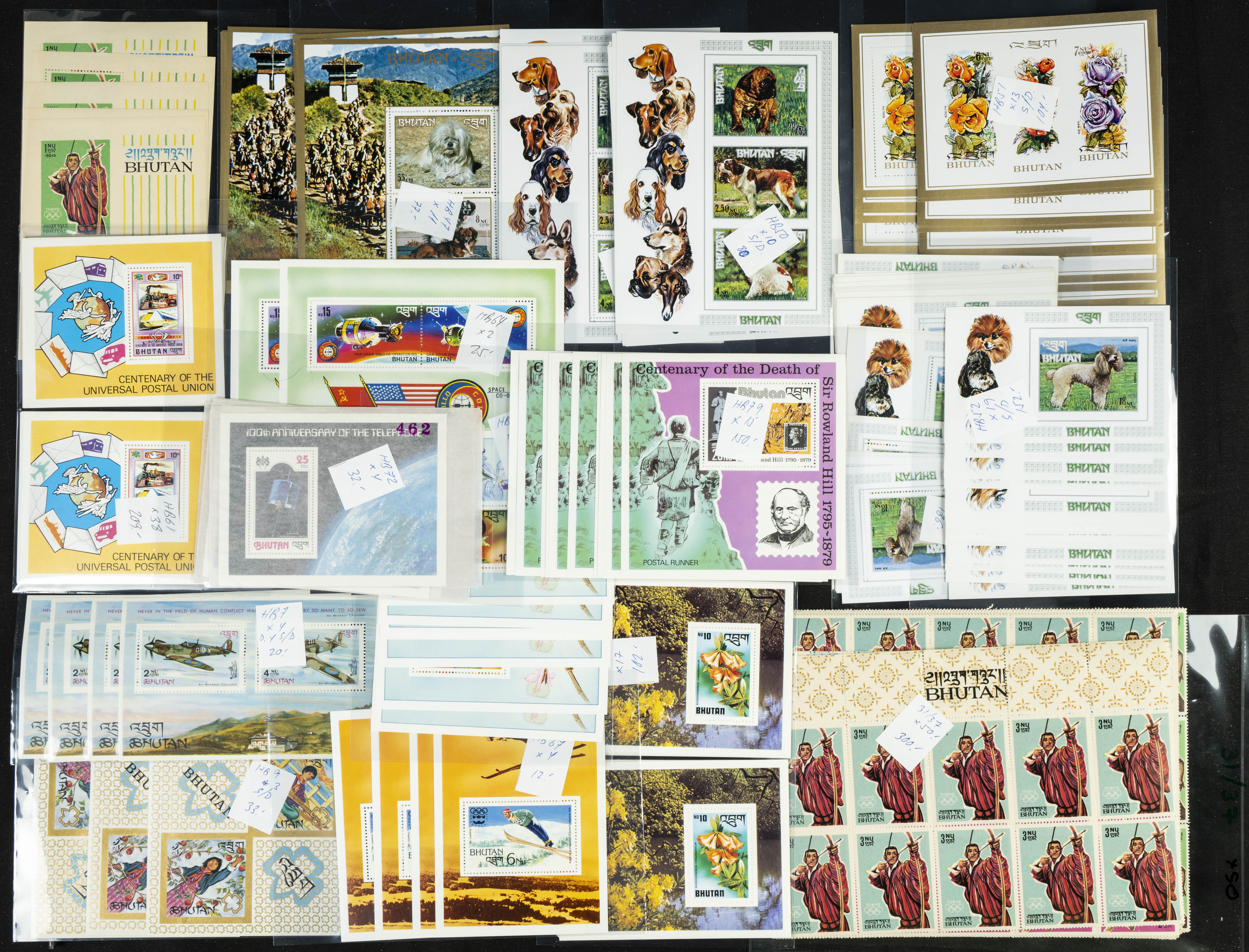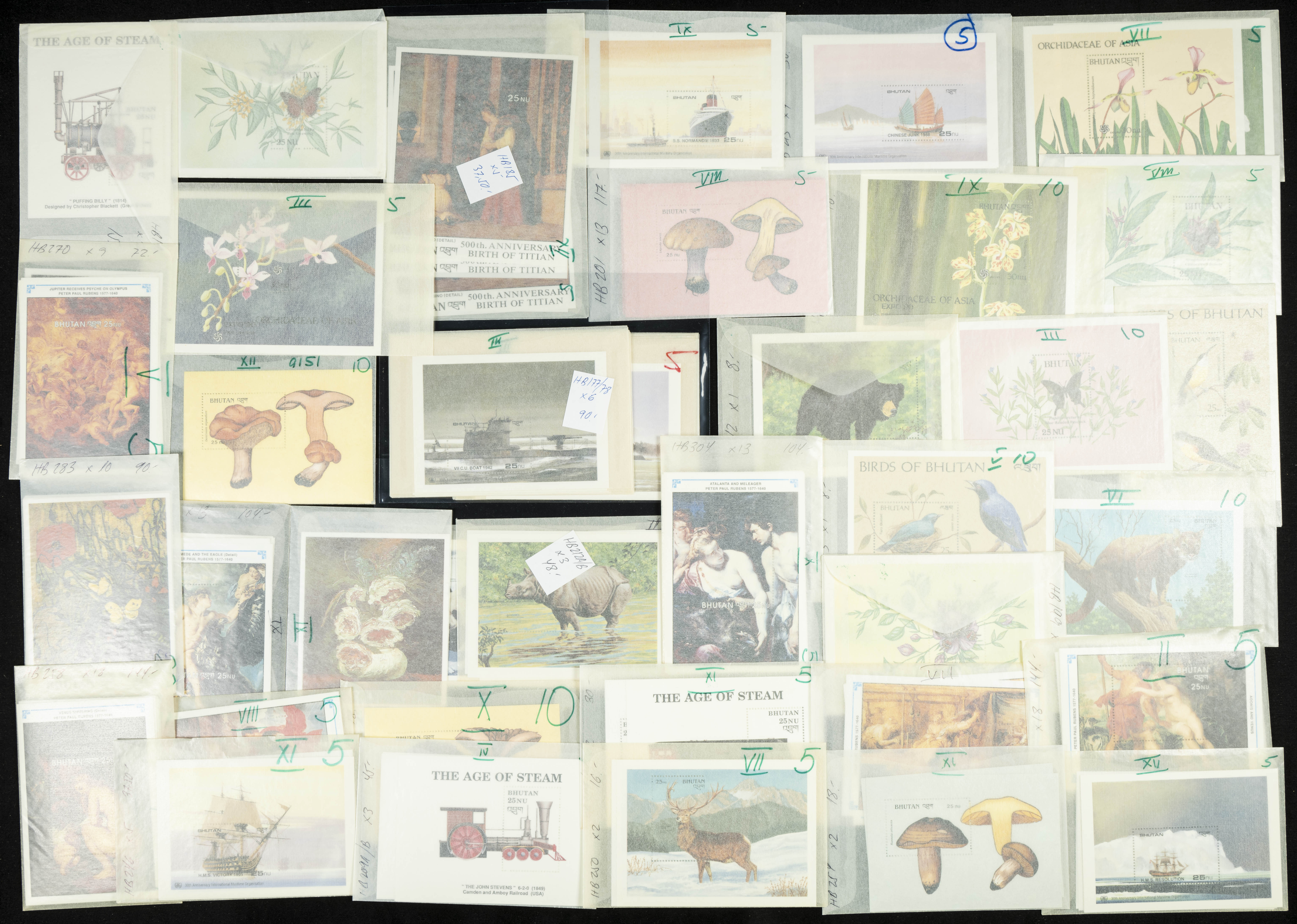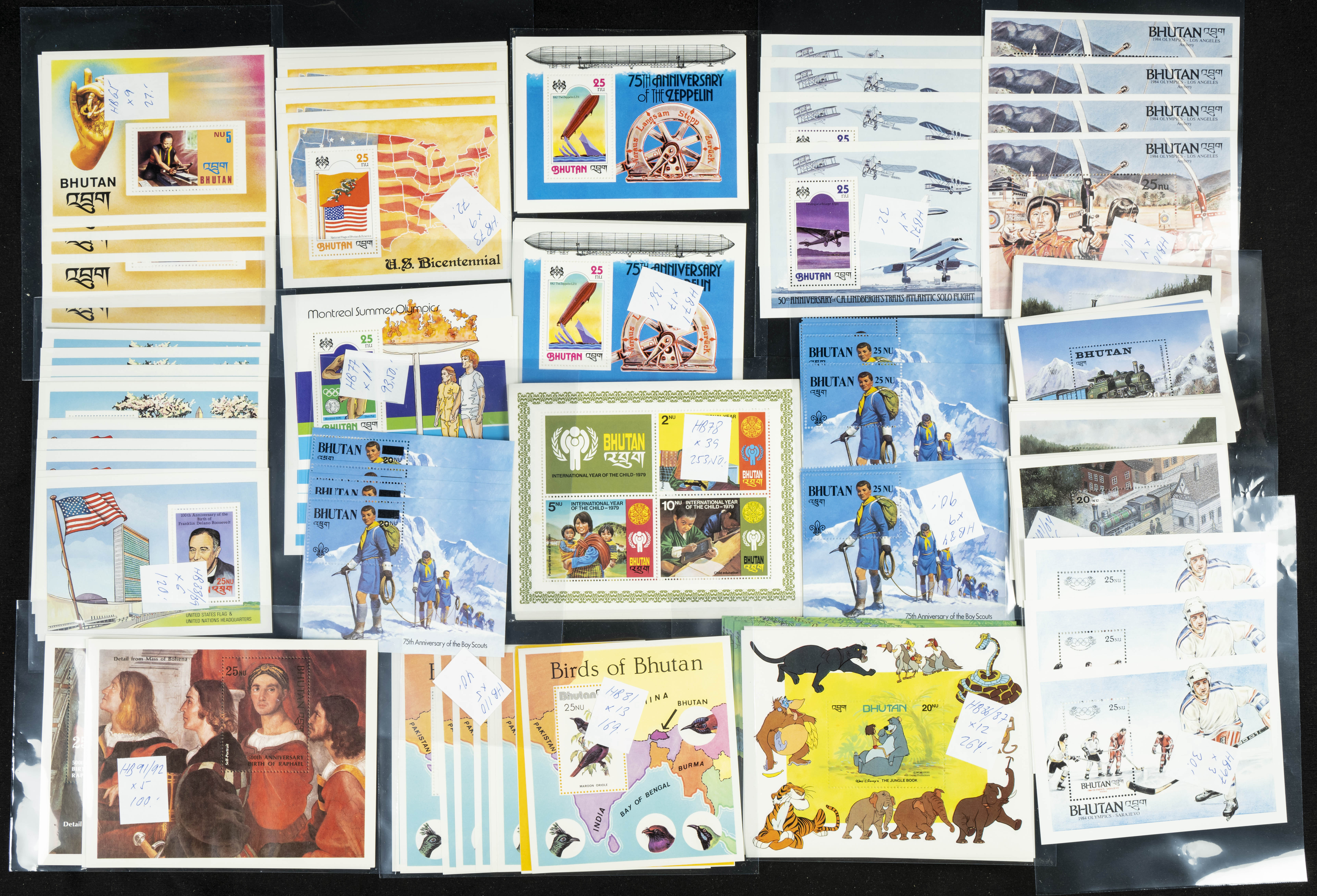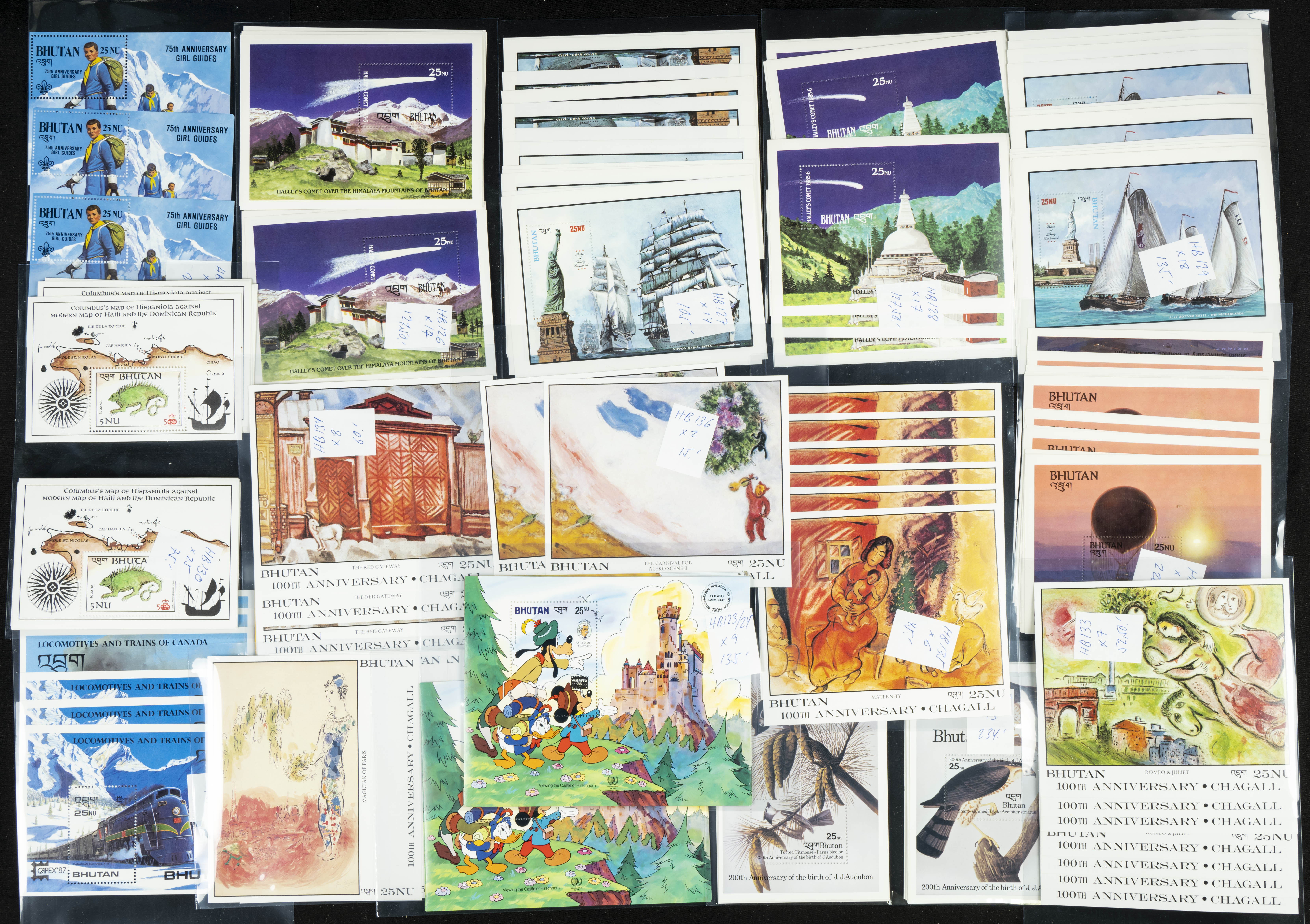 ★★(circa 1964). Interesting stock of Bhutanese souvenir sheets from 1964 to 1992, in mint condition and mostly themed, including Disney, Wildlife, Painting, and Sports, and including the 1964 series and some imperforate sheets (organized and labeled). TO BE EXAMINED. Yvert 2021: +9,000 Euros
