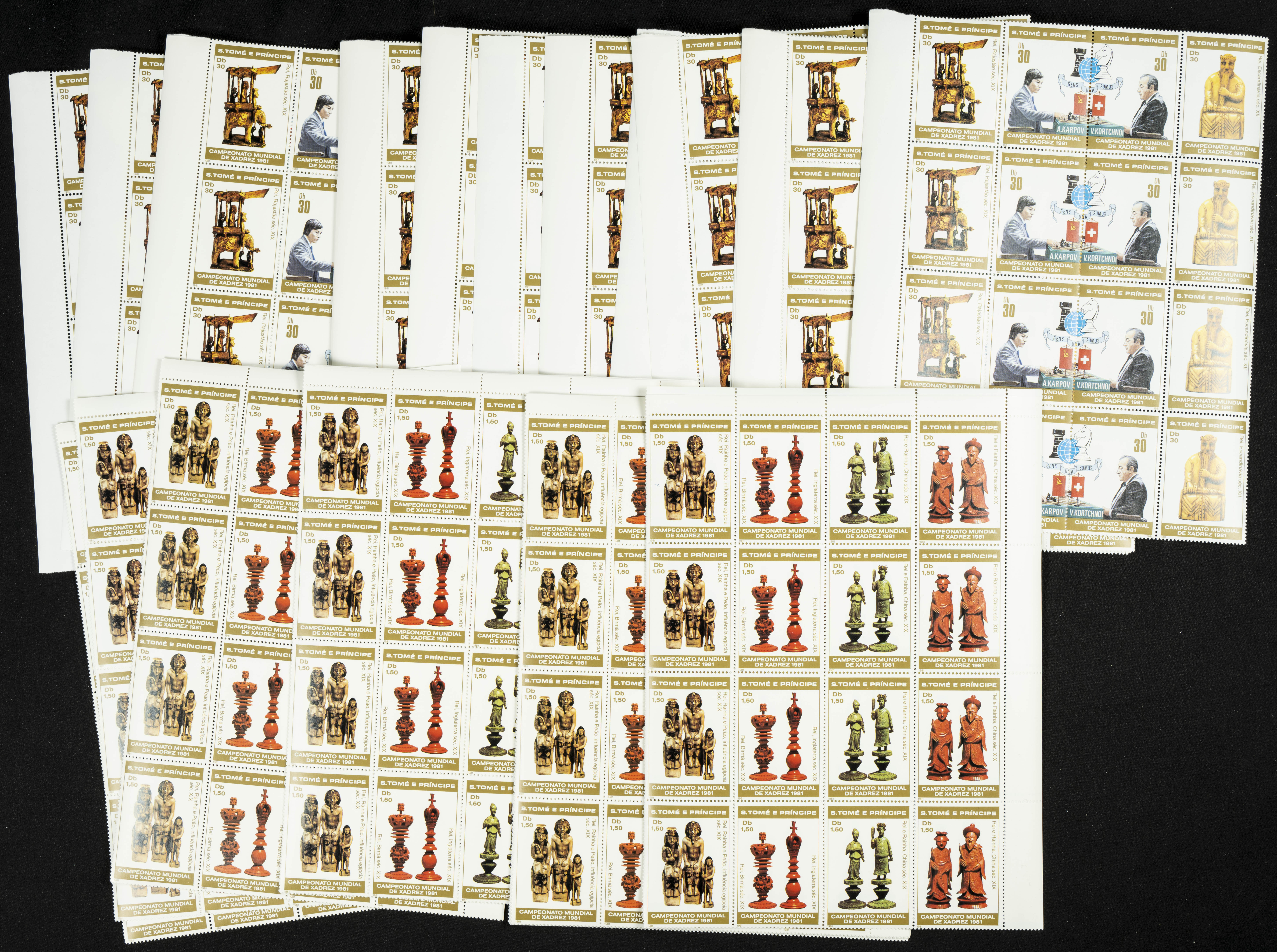 English Yvert 638/45(100). 1981. Set of one hundred complete chess sets from 1981, published by Santo Tomás y Príncipe, in mint condition. TO BE EXAMINED. Yvert 2018: 1,700 Euros