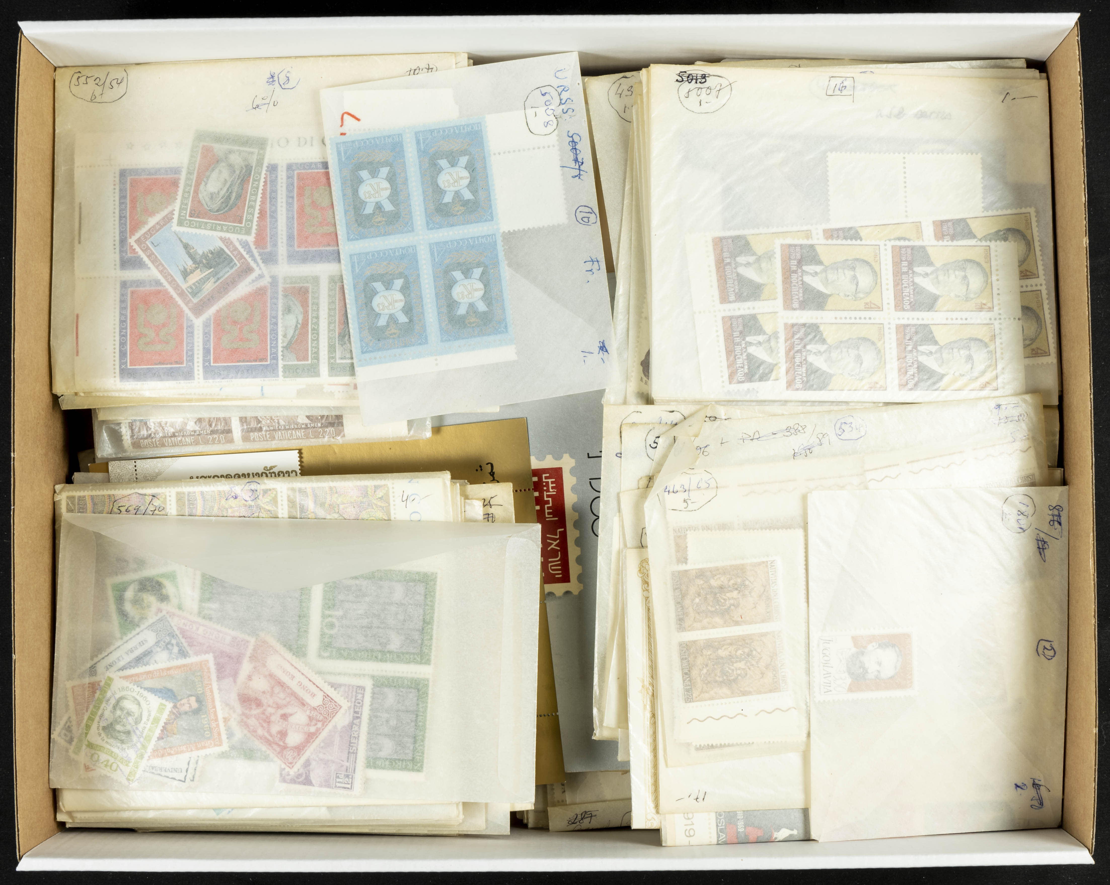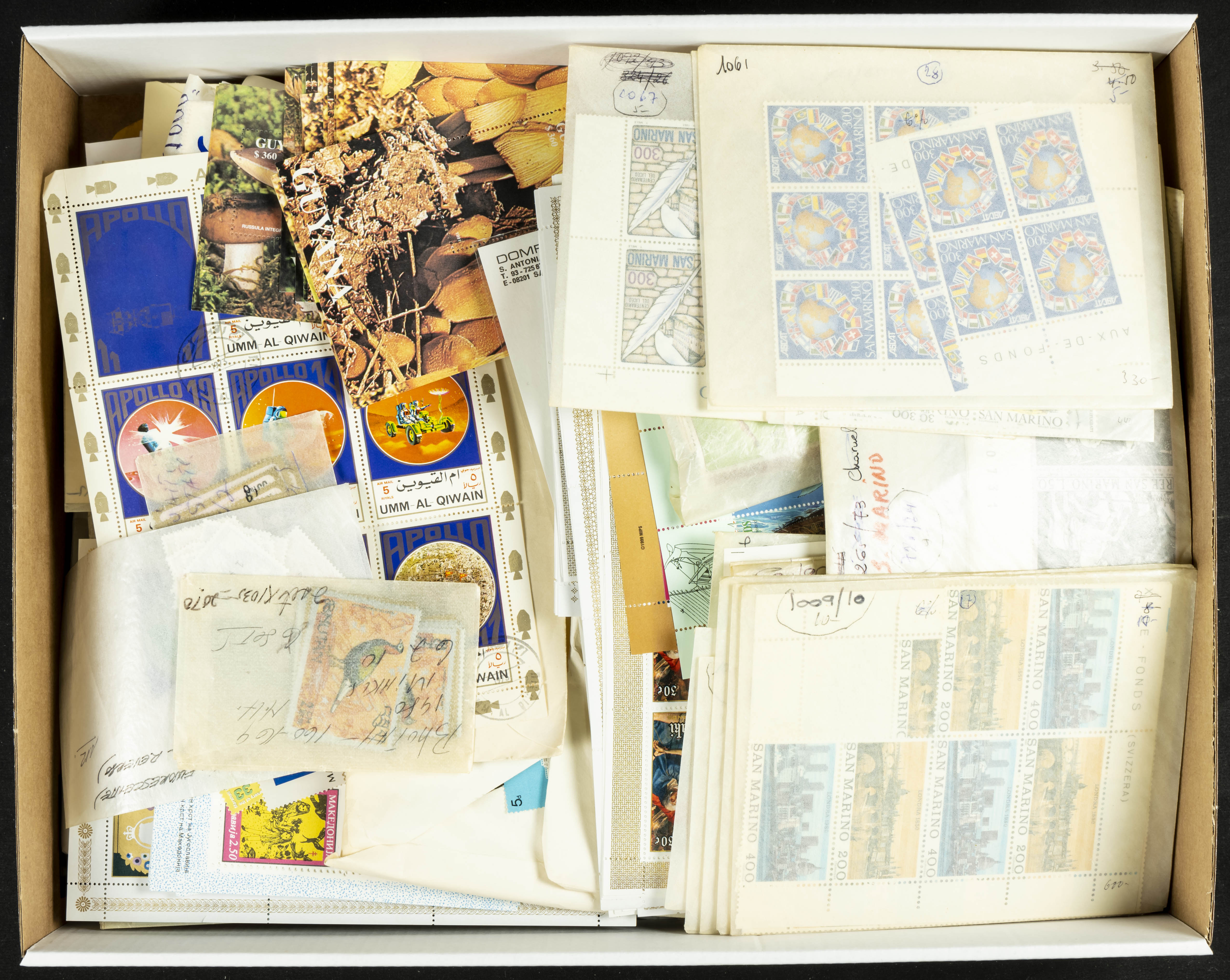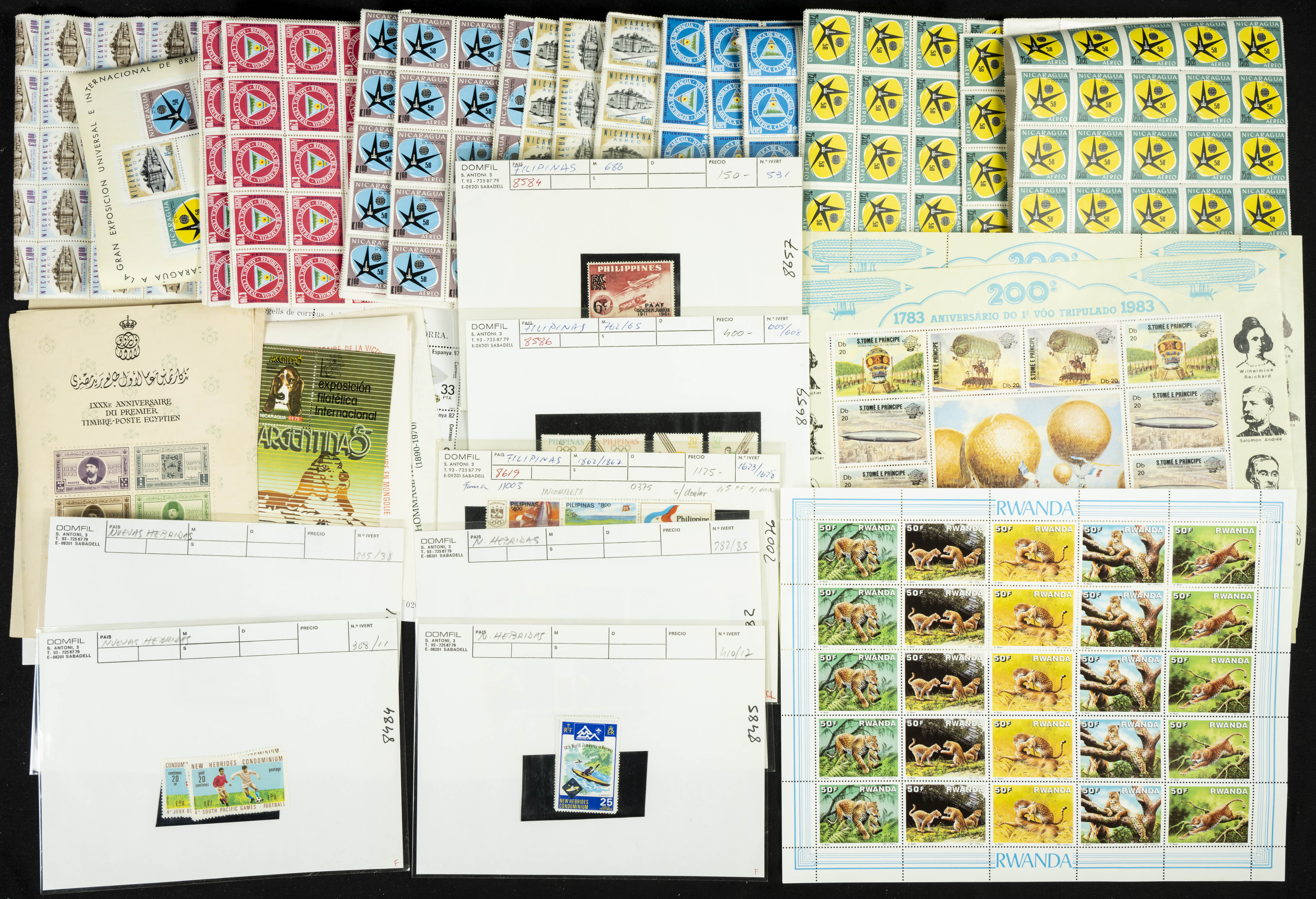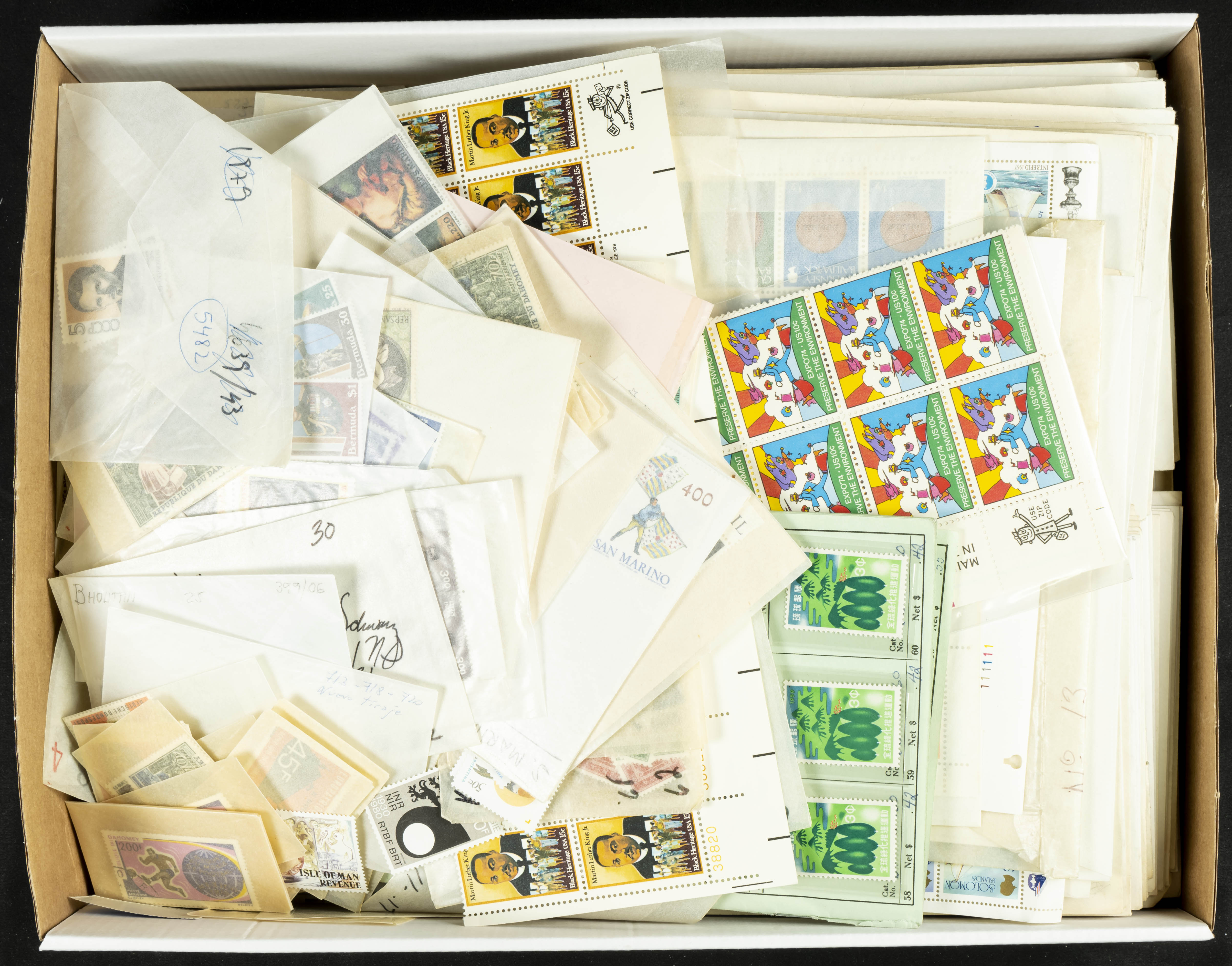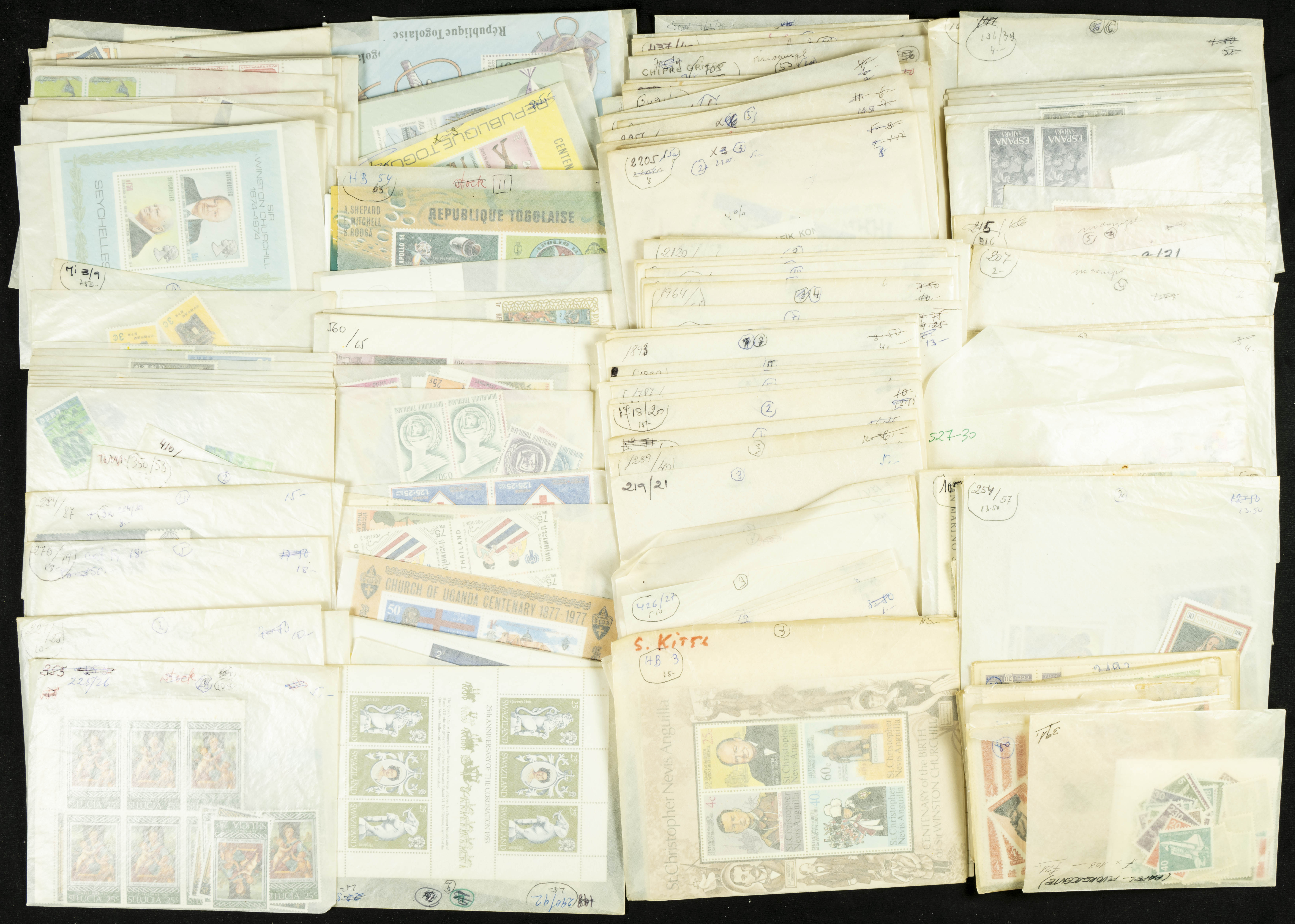 ★★/★(1950ca). An interesting collection of thousands of individual stamps, complete series, and souvenir sheets from various countries, generally dating from 1950 to 1990 and including numerous thematic series. Most are mint, and a large portion are organized in envelopes or on cards. Extremely high catalog value. For examination.