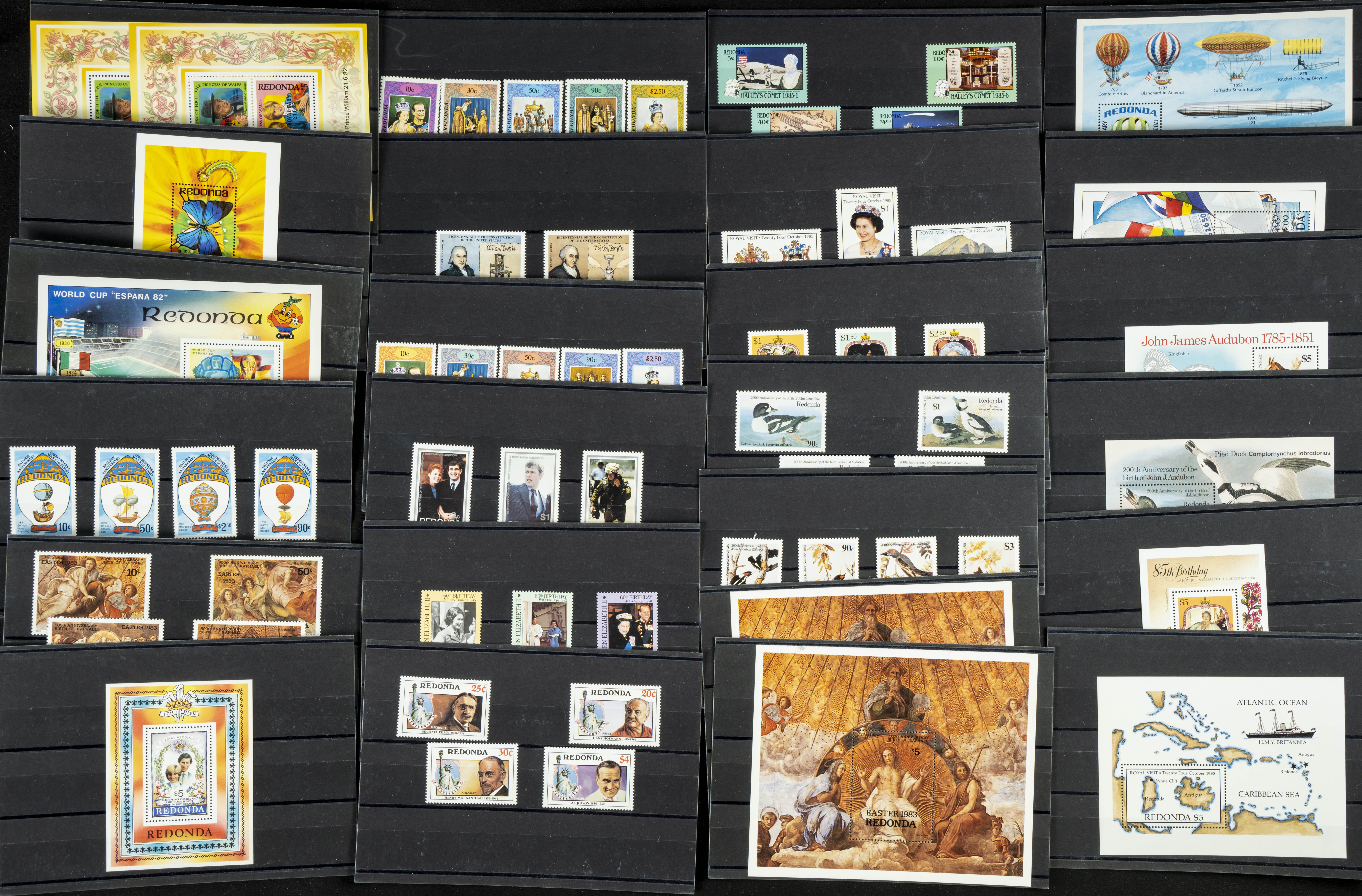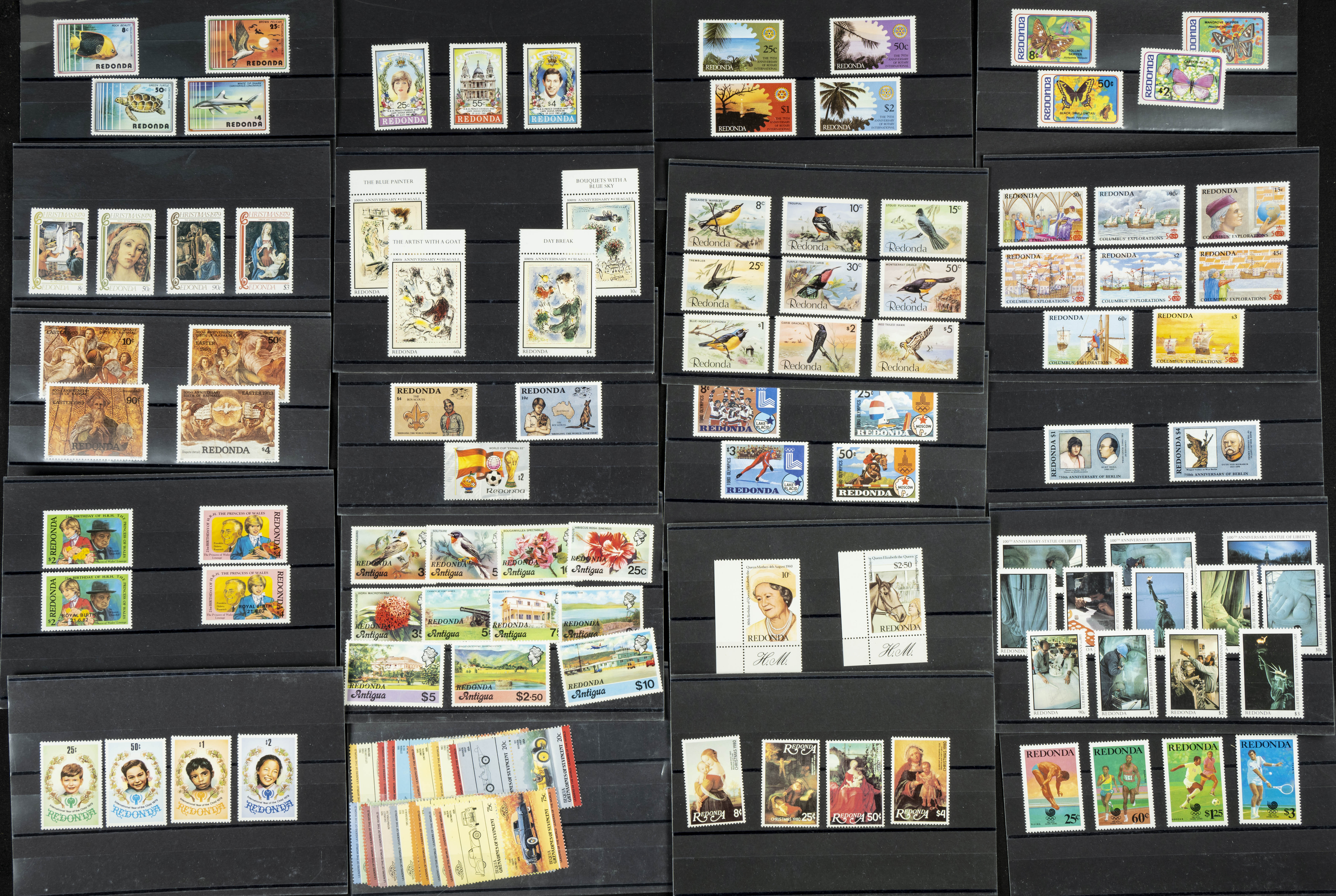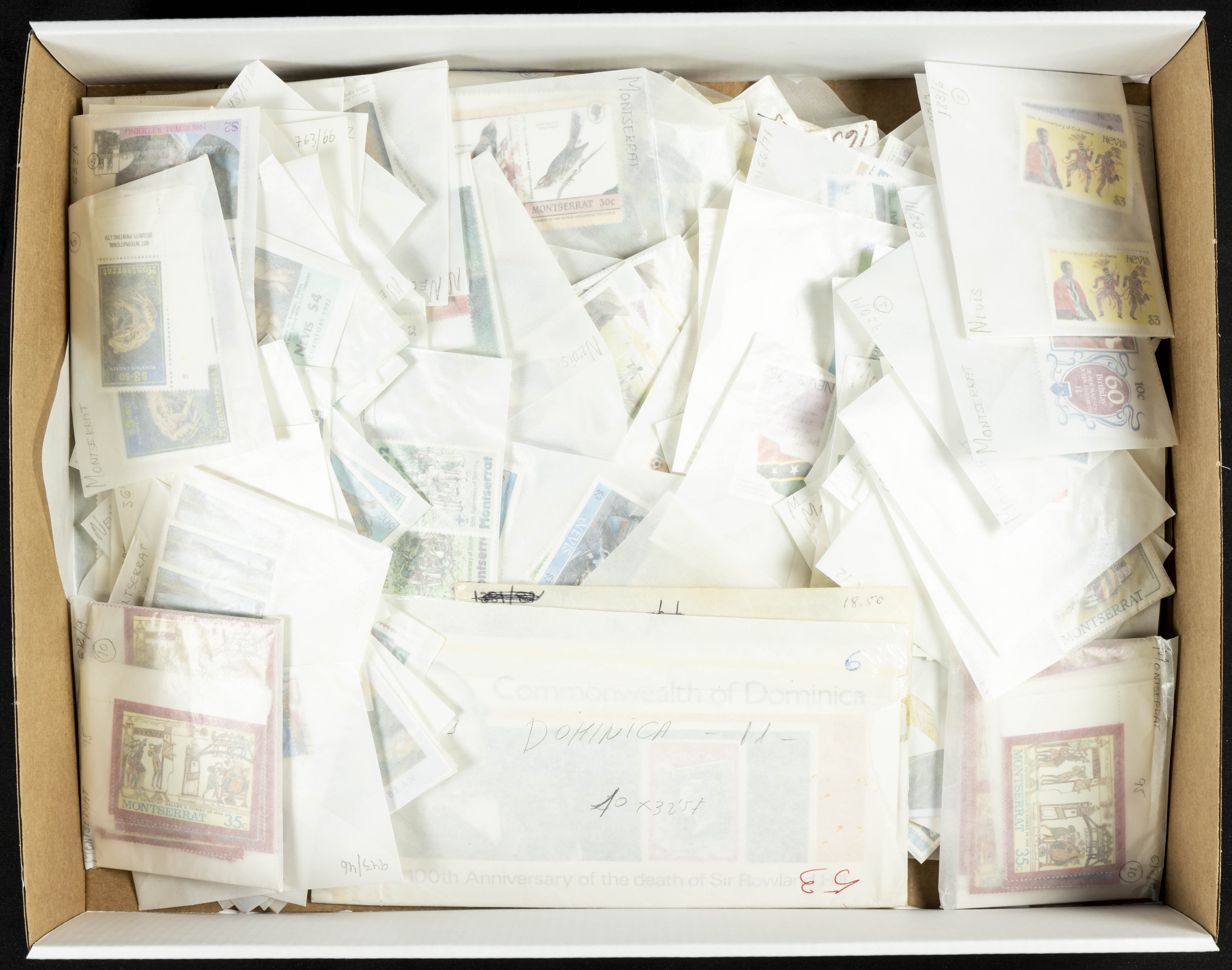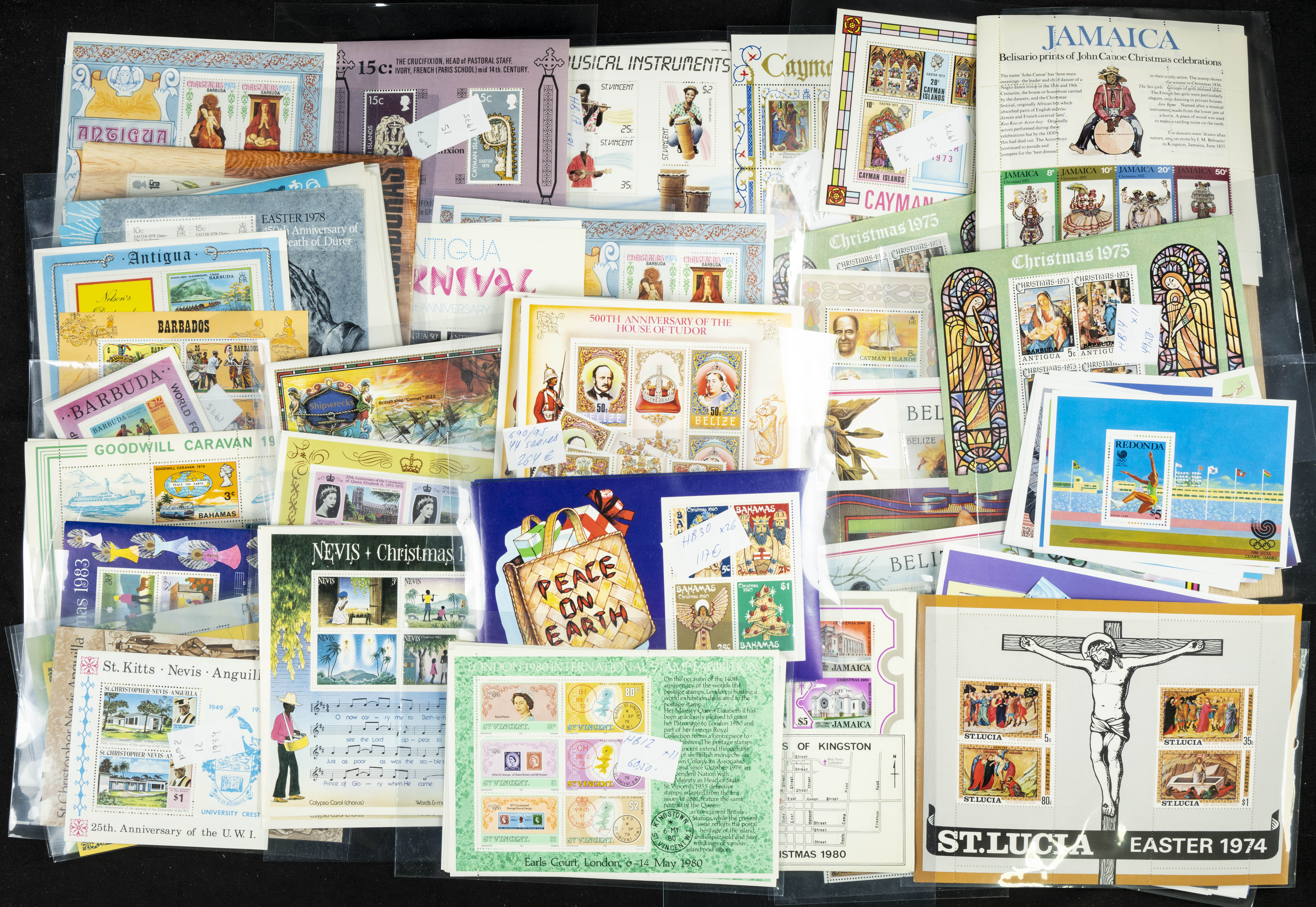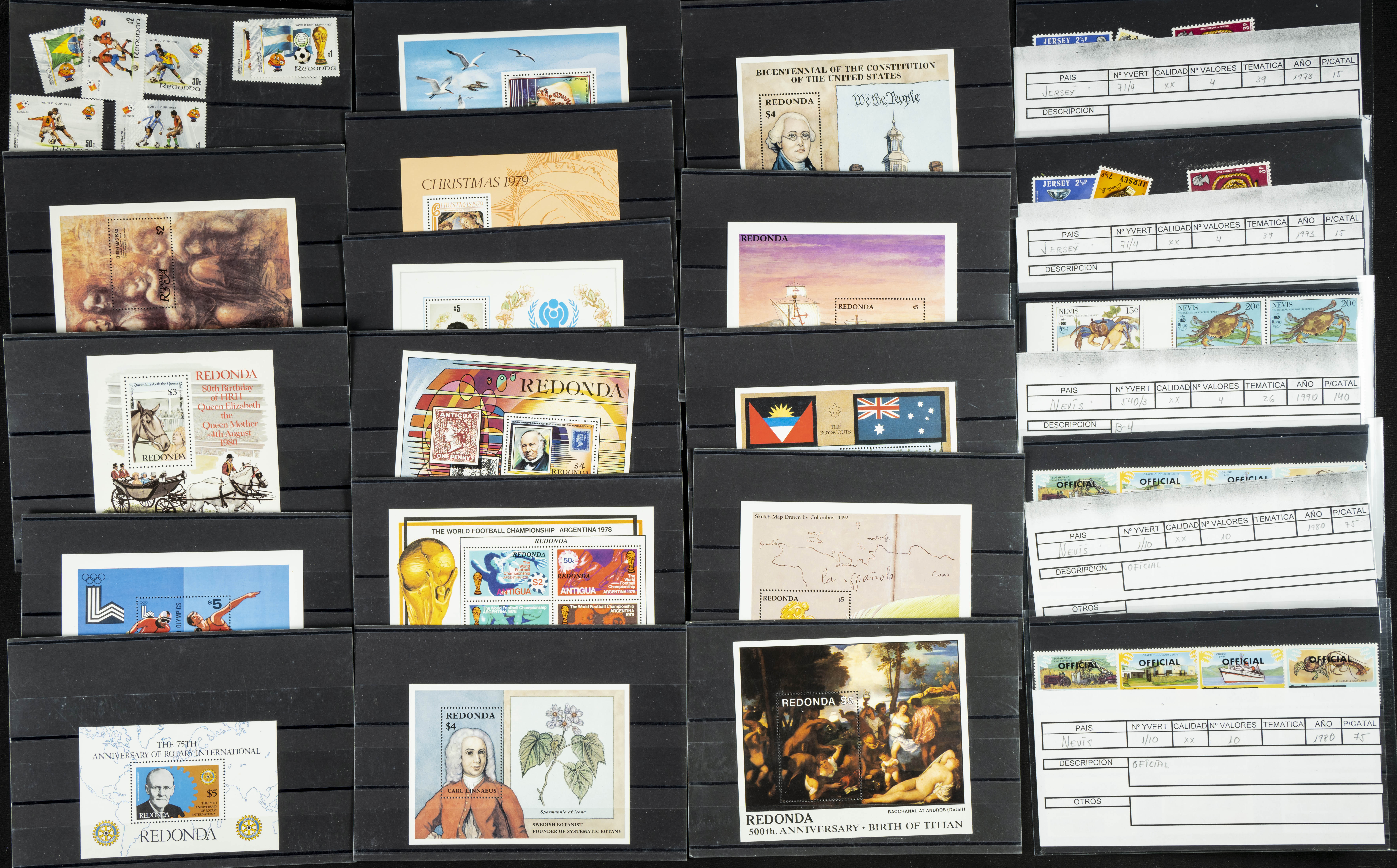 ★★(1970ca). Interesante conjunto de series completas y hojas bloque de diversos países del Caribe (Montserrat, Nevis, San Vicente, Grenada, San Cristobal, etc), la mayoría comprendidas entre 1970 y 1990 con numerosas repeticiones, en nuevo y la mayor parte clasificado en sobres y fichas con indicación del número de catálogo. A EXAMINAR.