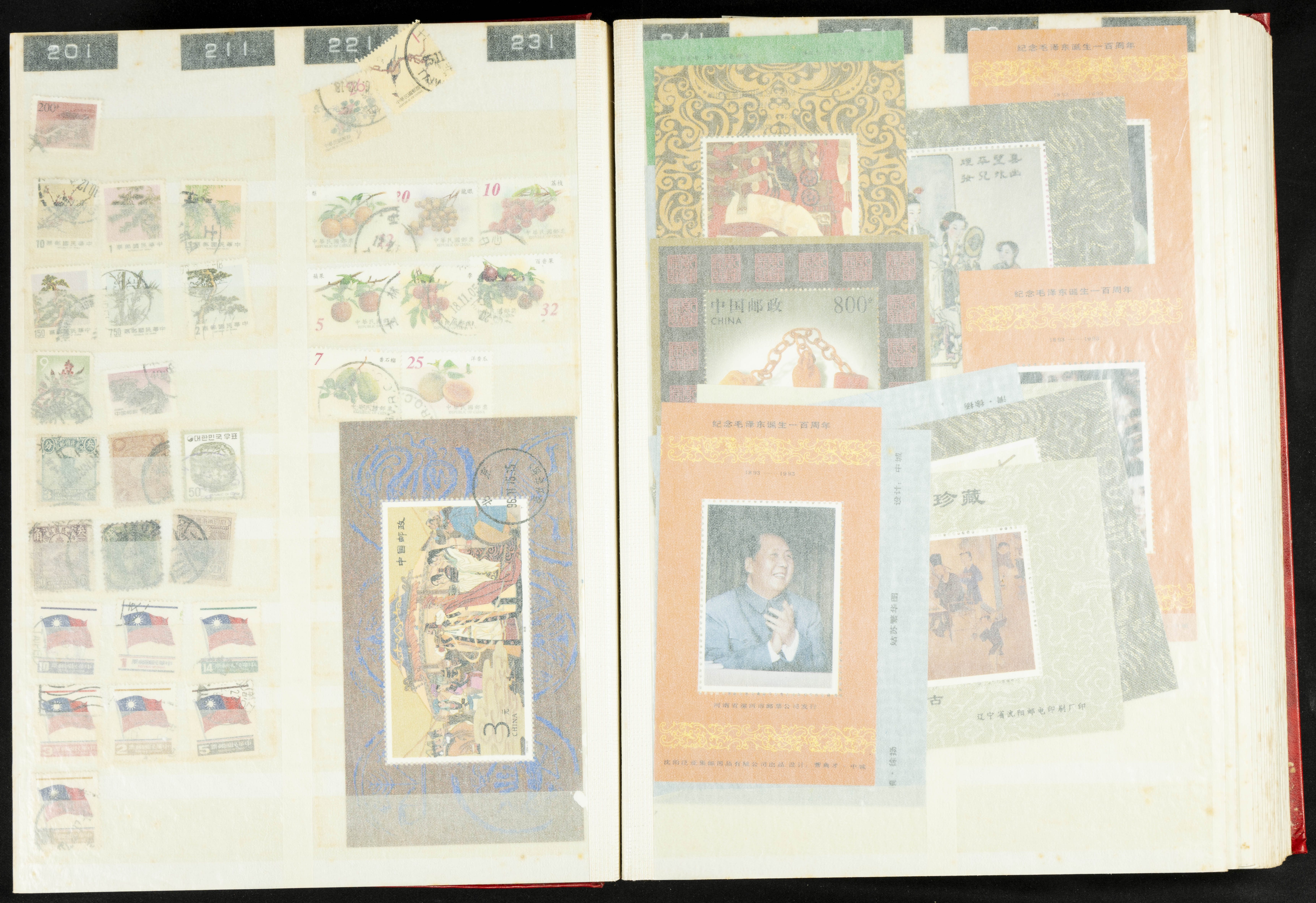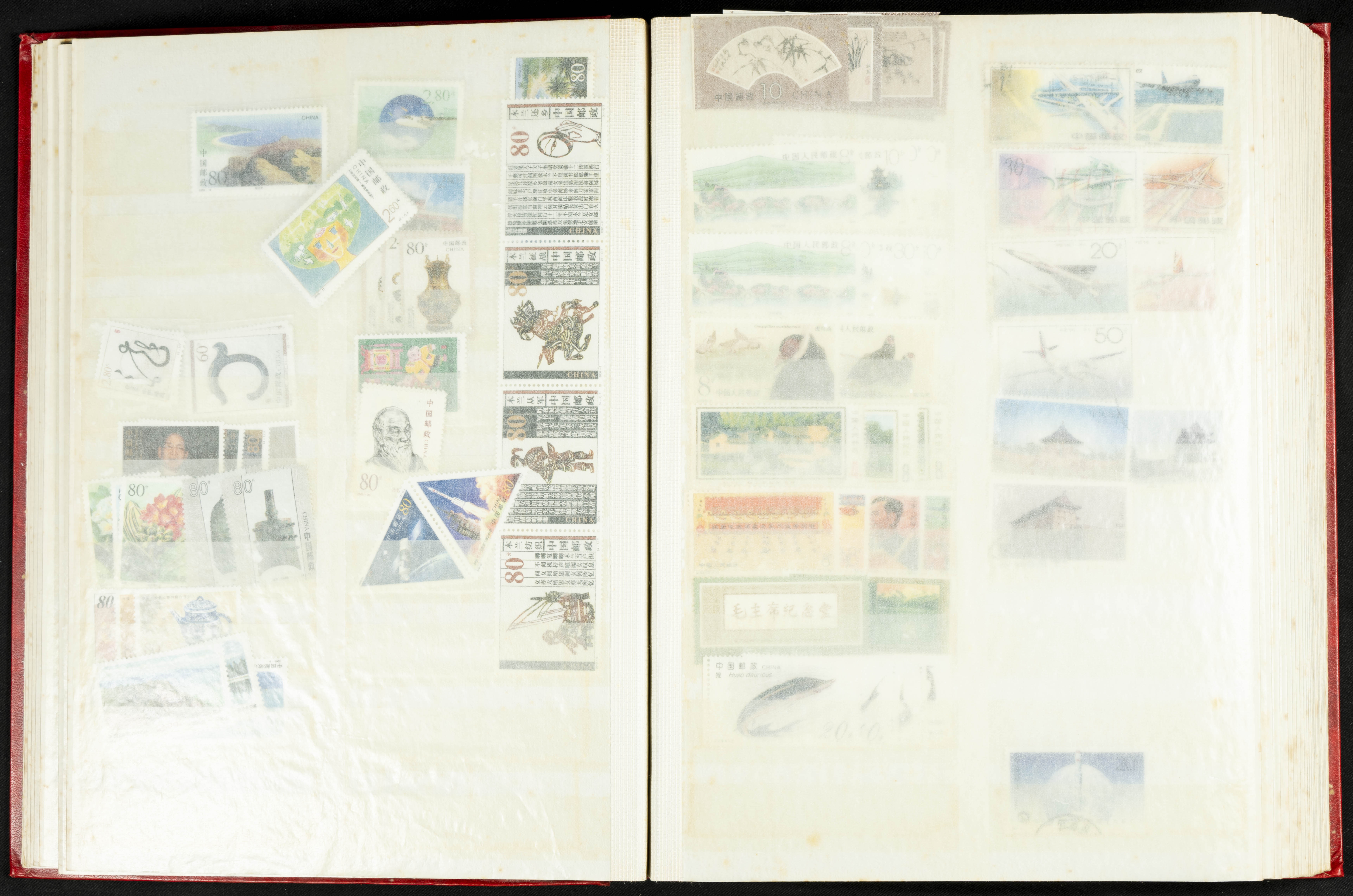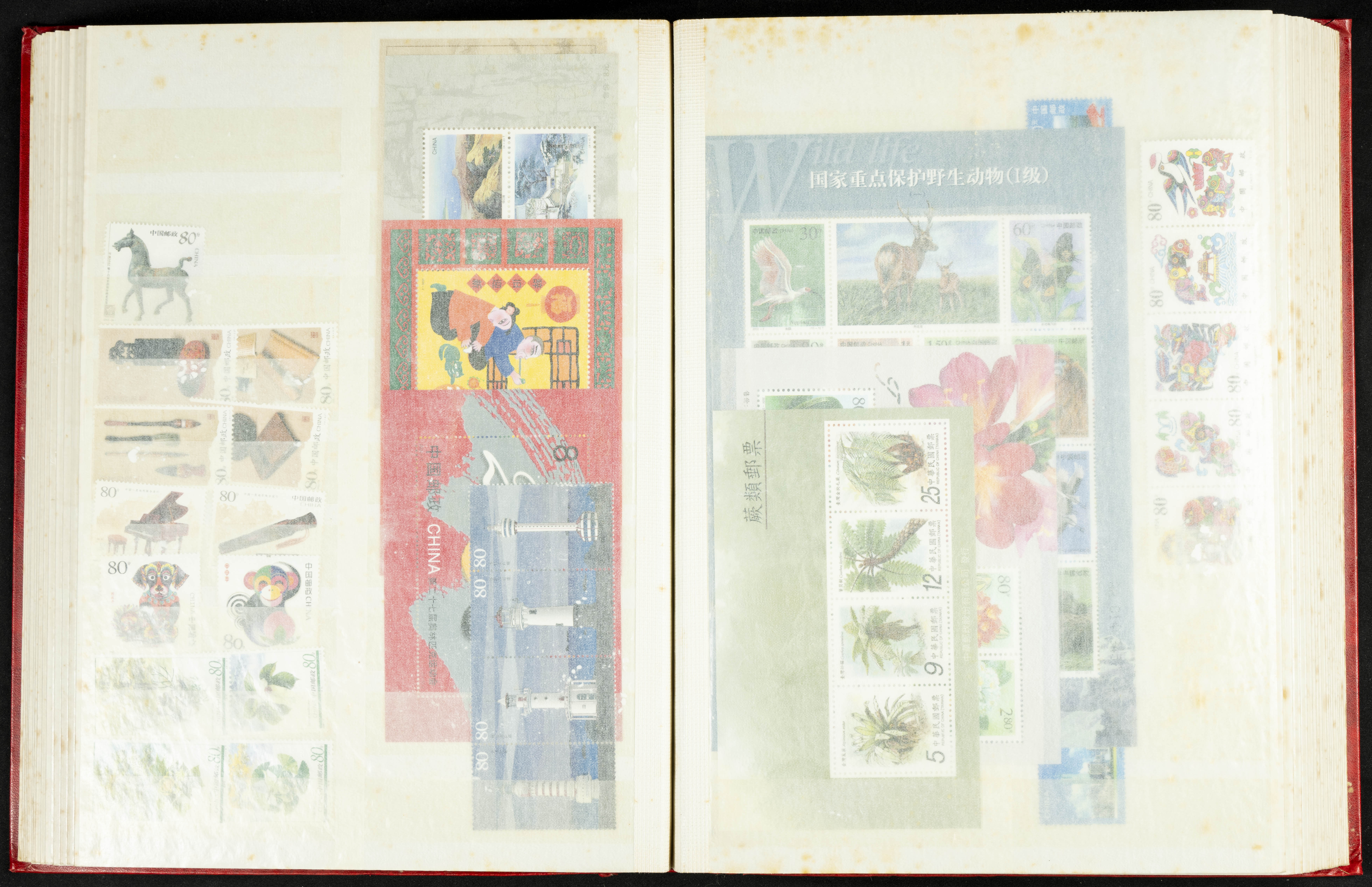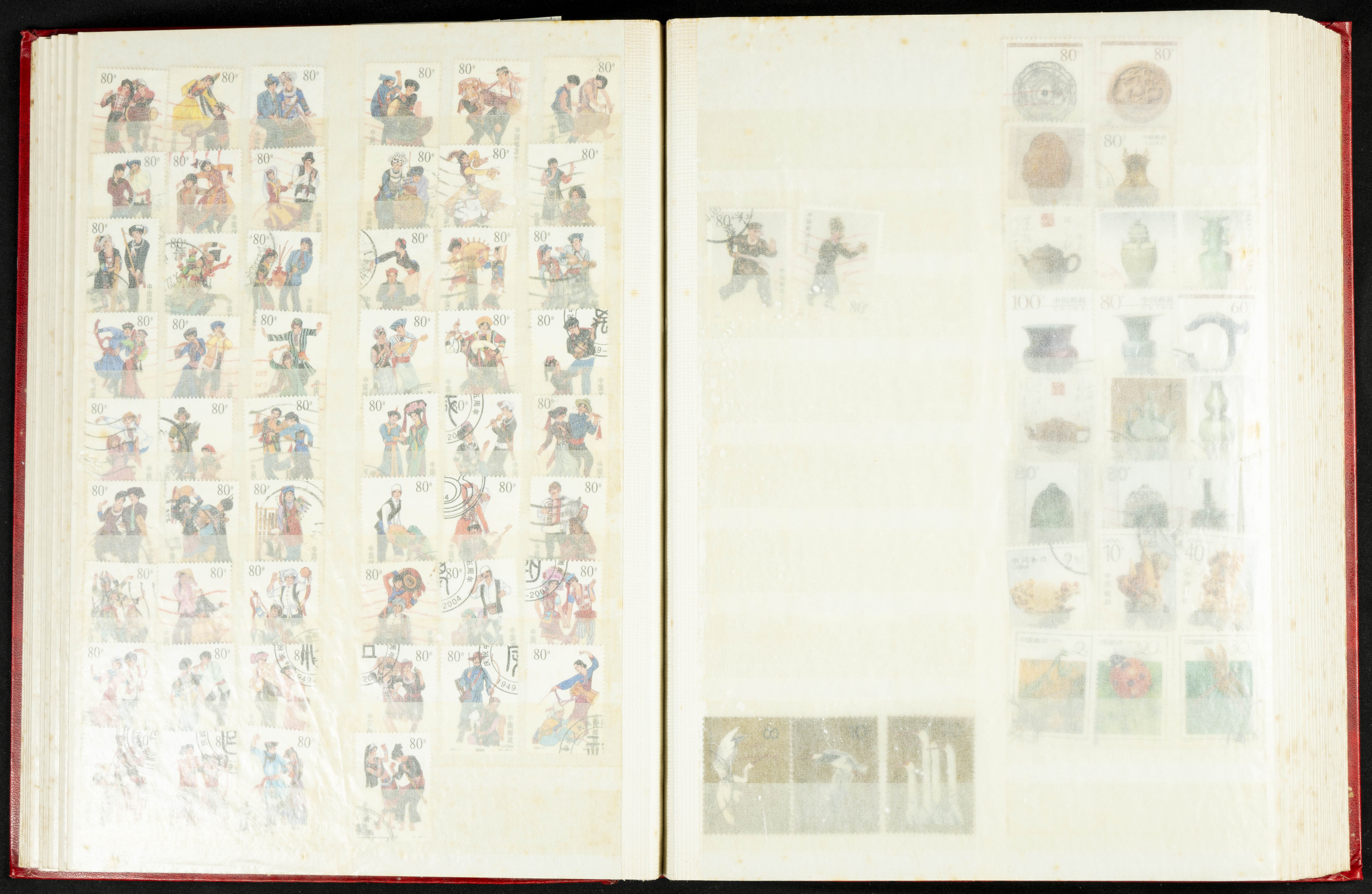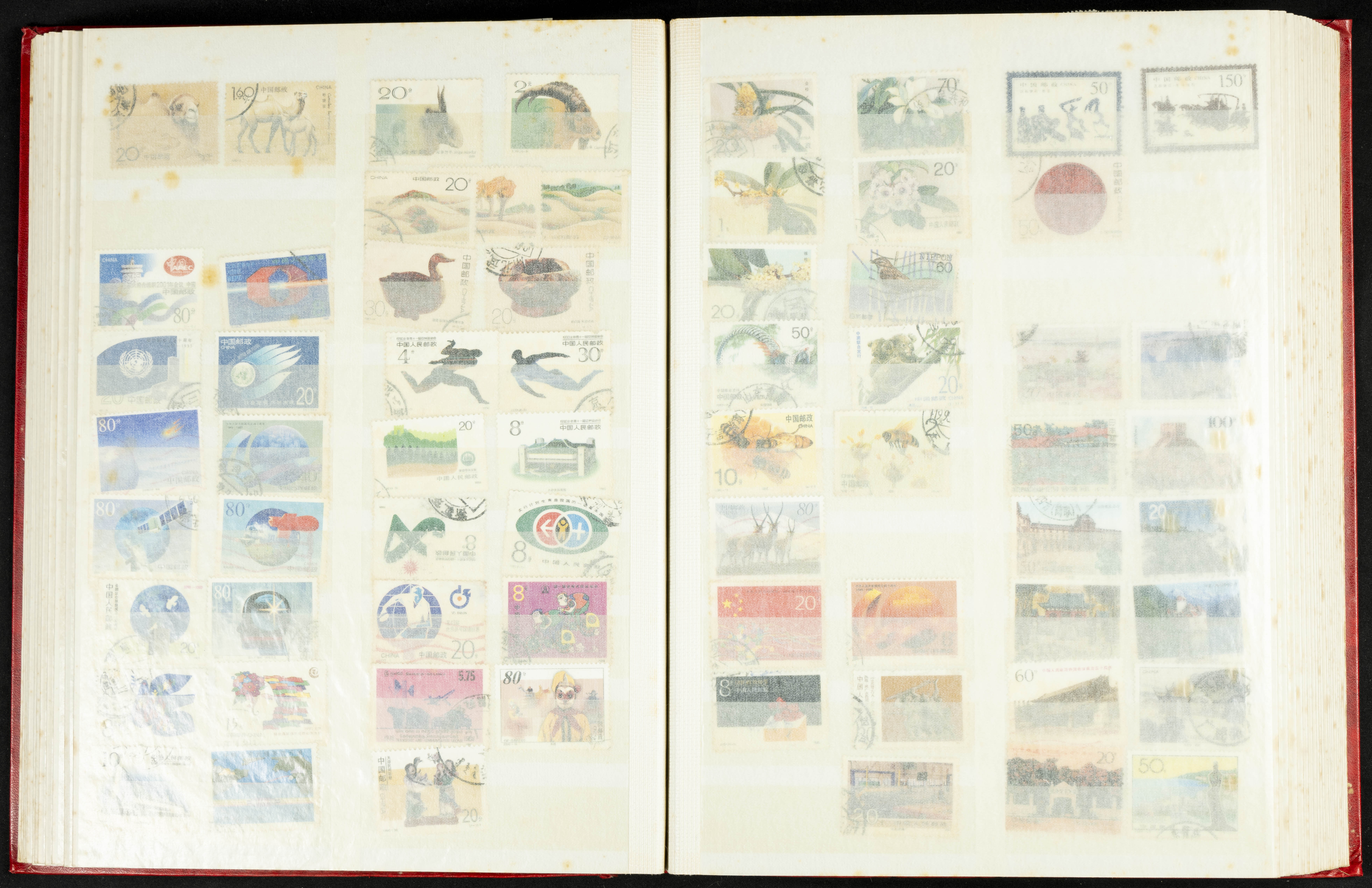 ★★/(1960ca). Interesante conjunto de sellos sueltos, series completas y hojas bloque de diversos países de Asia (China, Japón, India, Hong Kong) la mayoría comprendidos entre 1960 y 2005, en nuevo y usado y por lo general la parte más moderna en nuevo con algunas repeticiones (el noventa por ciento de los sellos están montados en clasificadores y con polvo de talco para reducir la humedad), incluye alguna carpeta o libros conmemorativos de China y un clasificador con sellos de Egipto. ALTISIMO VALOR DE CATALOGO. A EXAMINAR.