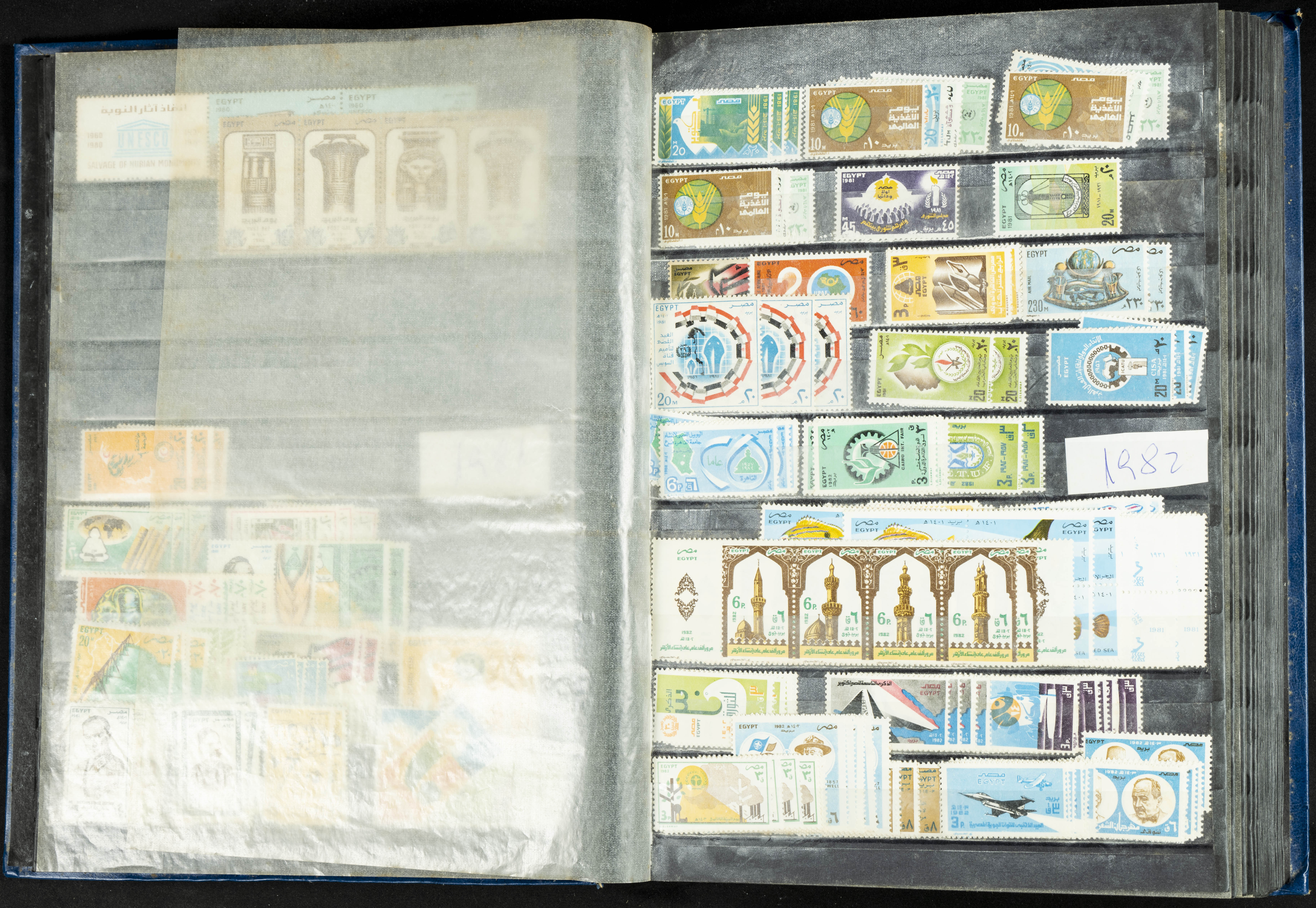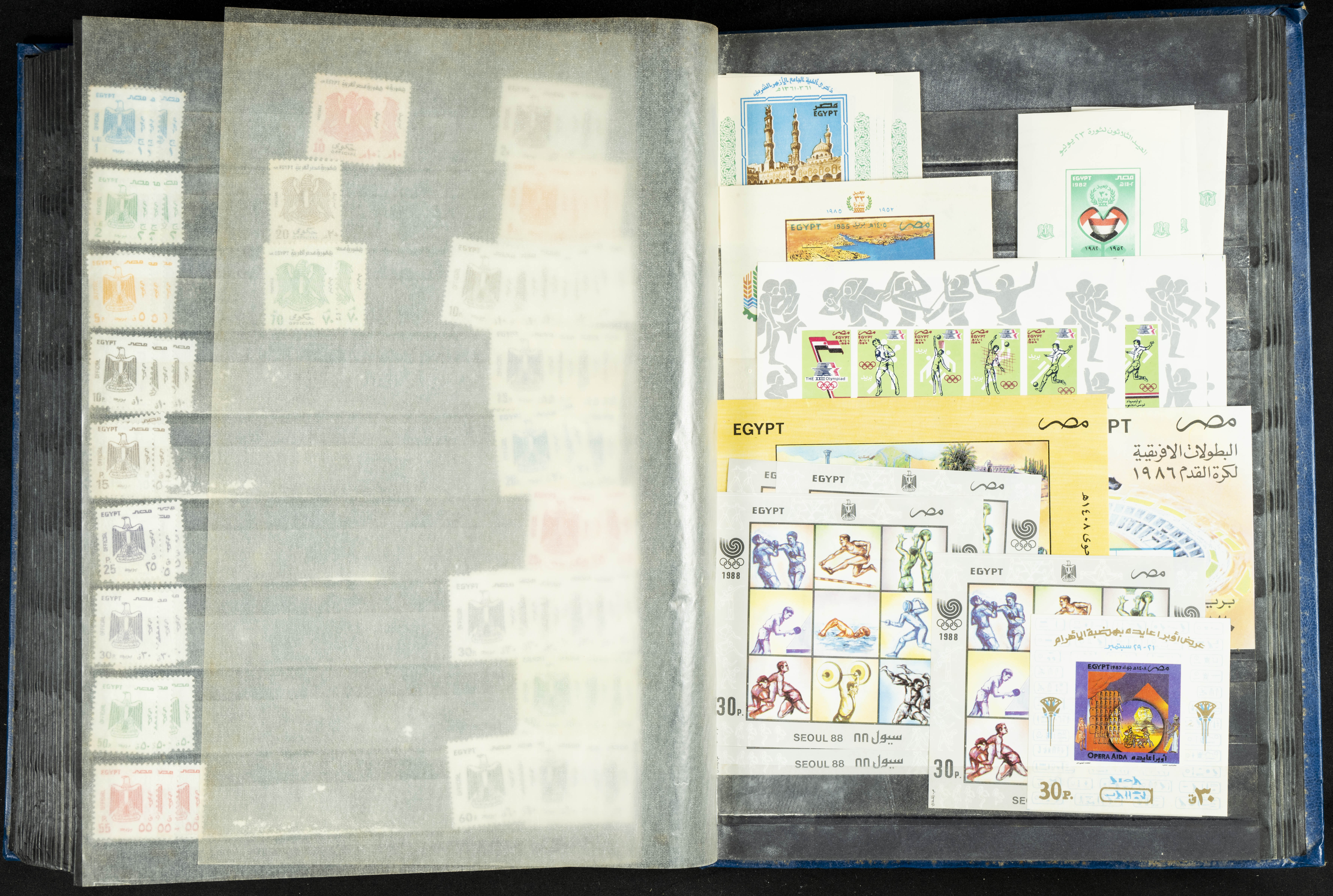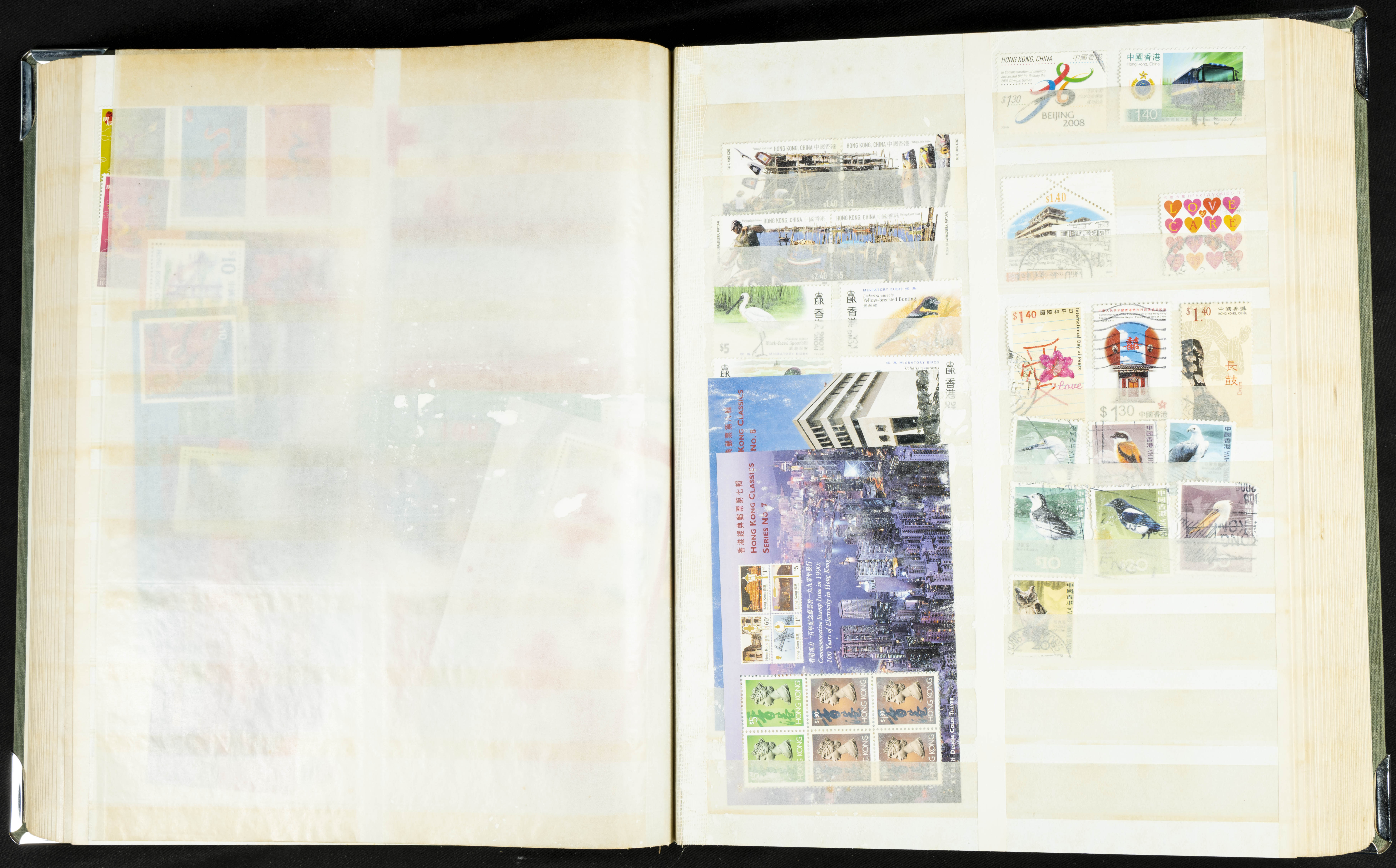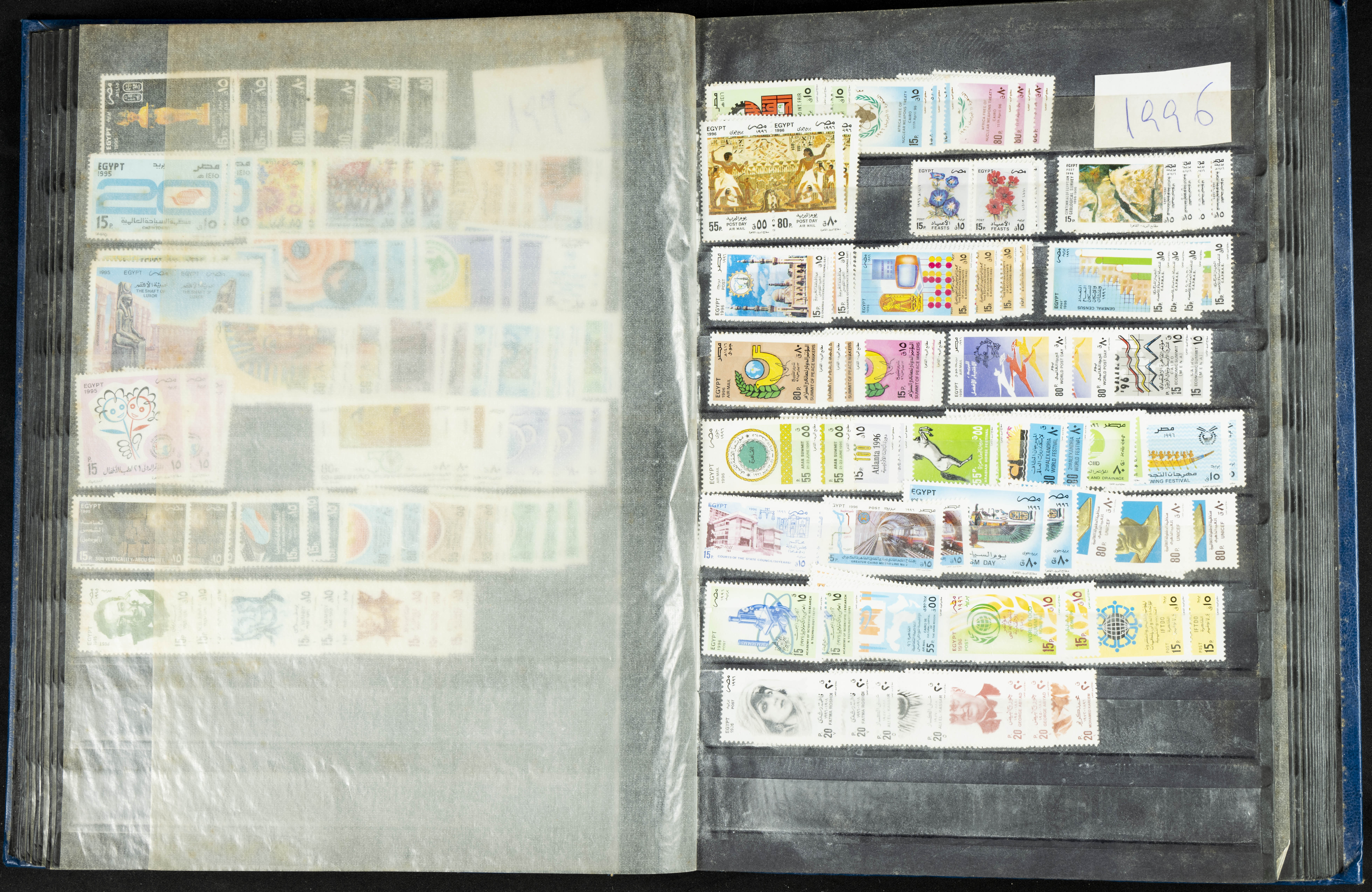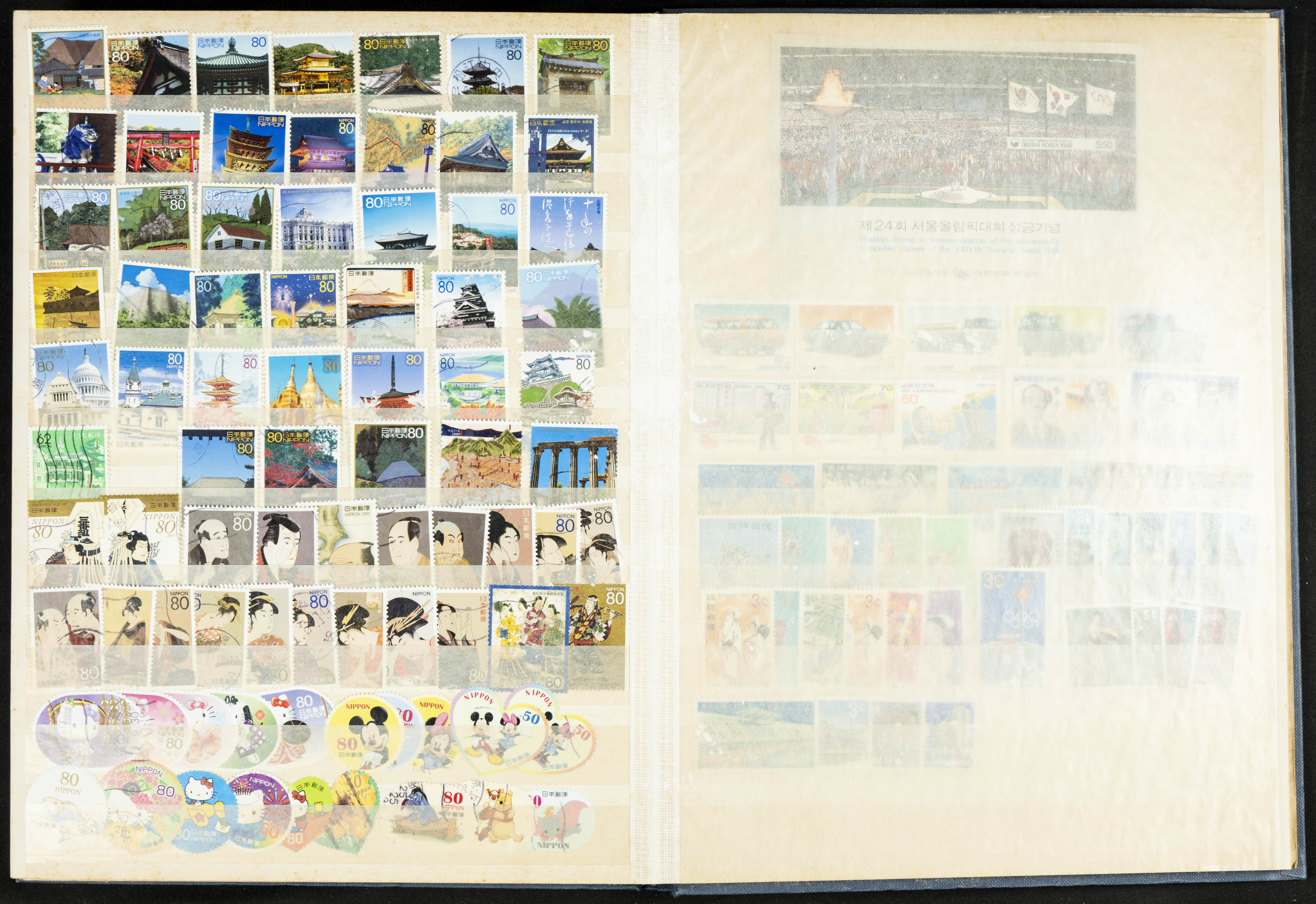 ★★/(1960ca). Interesante conjunto de sellos sueltos, series completas y hojas bloque de diversos países de Asia (China, Japón, India, Hong Kong) la mayoría comprendidos entre 1960 y 2005, en nuevo y usado y por lo general la parte más moderna en nuevo con algunas repeticiones (el noventa por ciento de los sellos están montados en clasificadores y con polvo de talco para reducir la humedad), incluye alguna carpeta o libros conmemorativos de China y un clasificador con sellos de Egipto. ALTISIMO VALOR DE CATALOGO. A EXAMINAR.