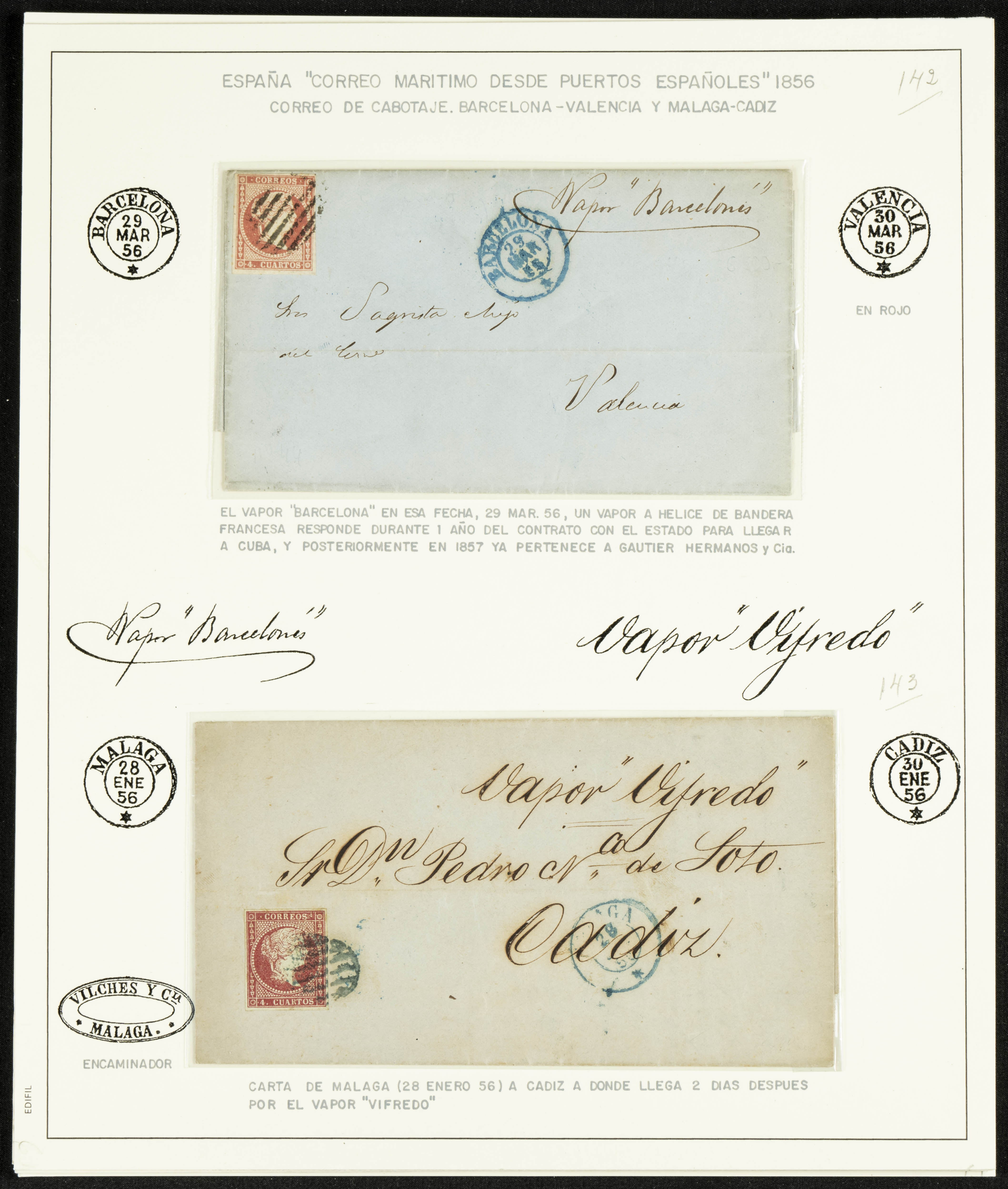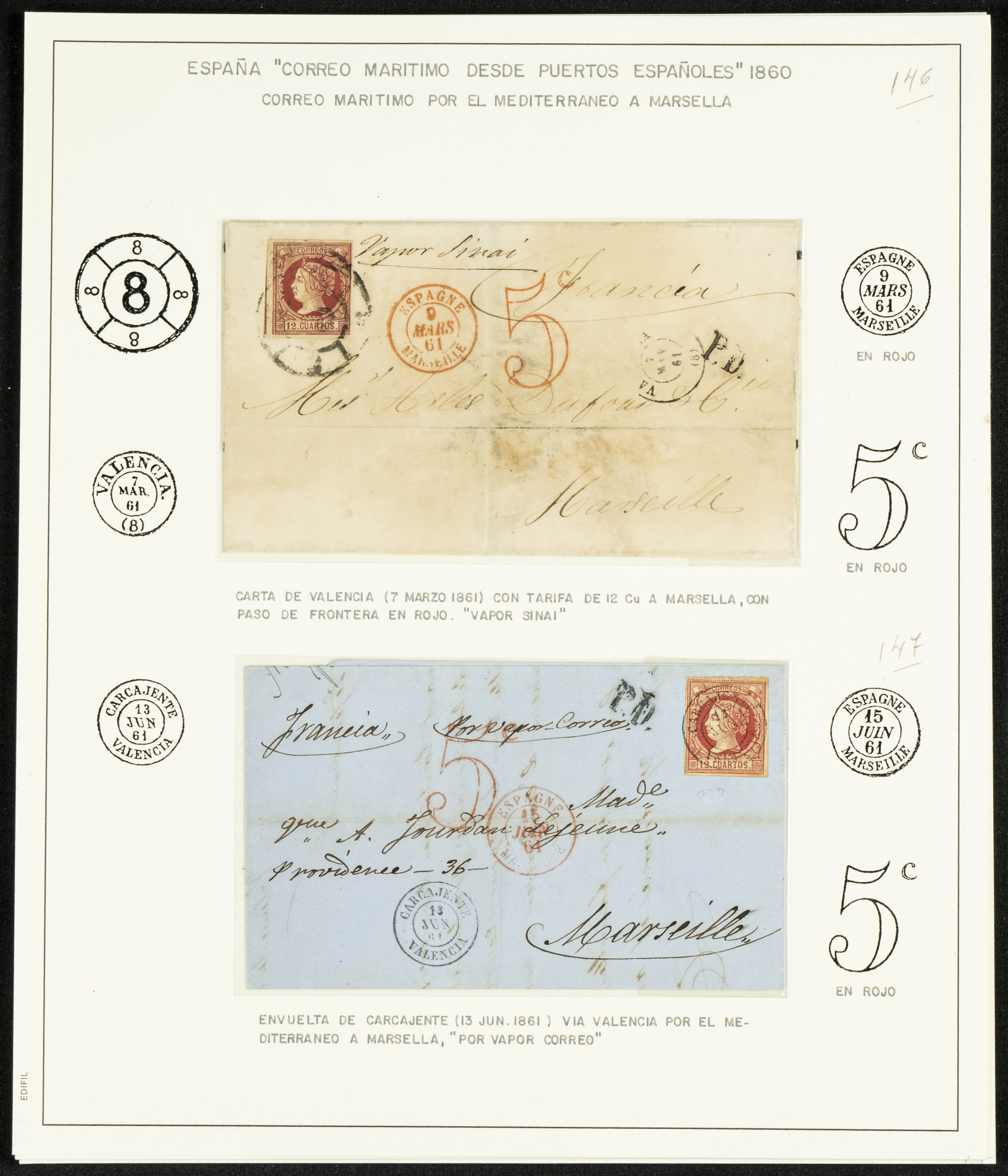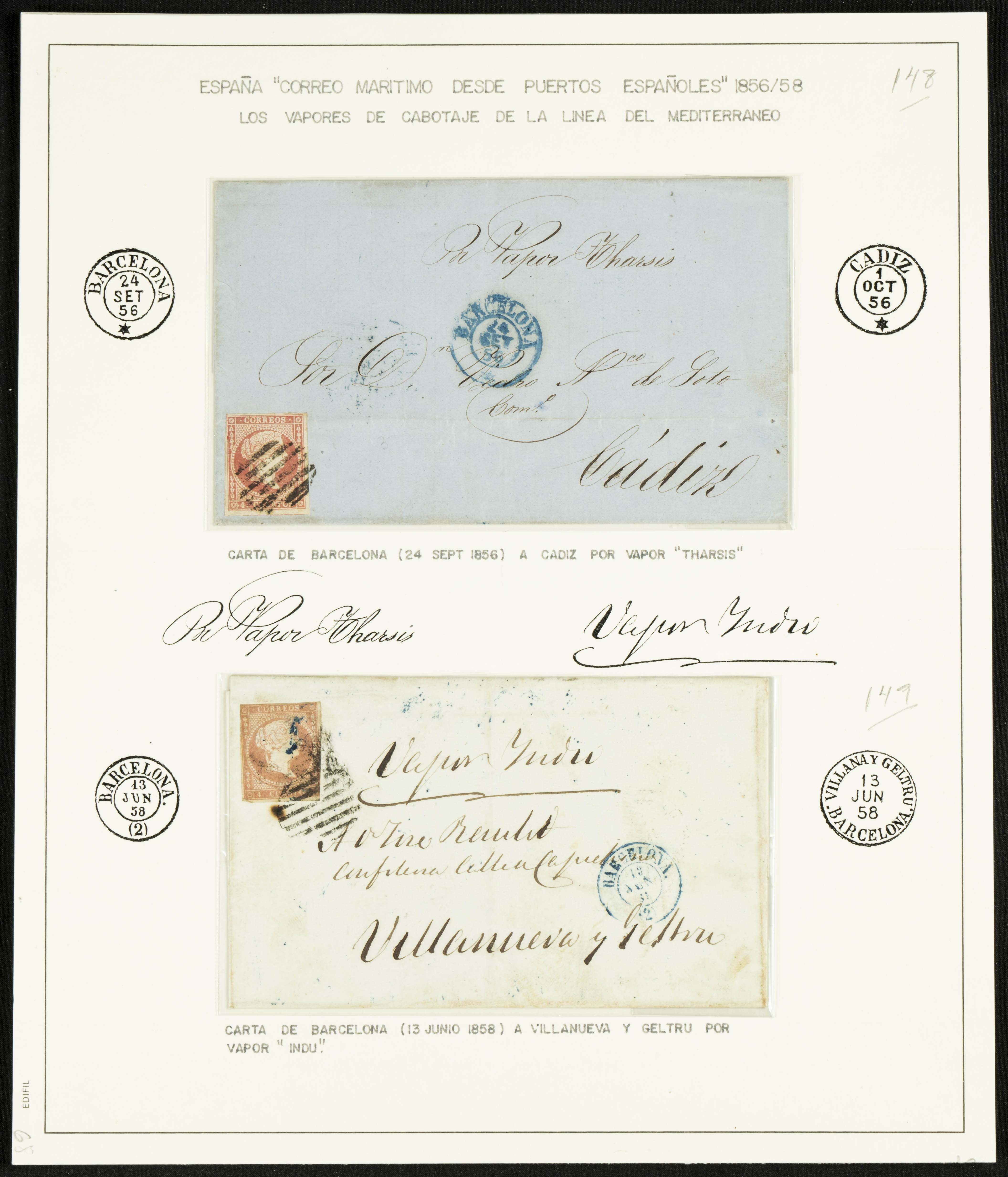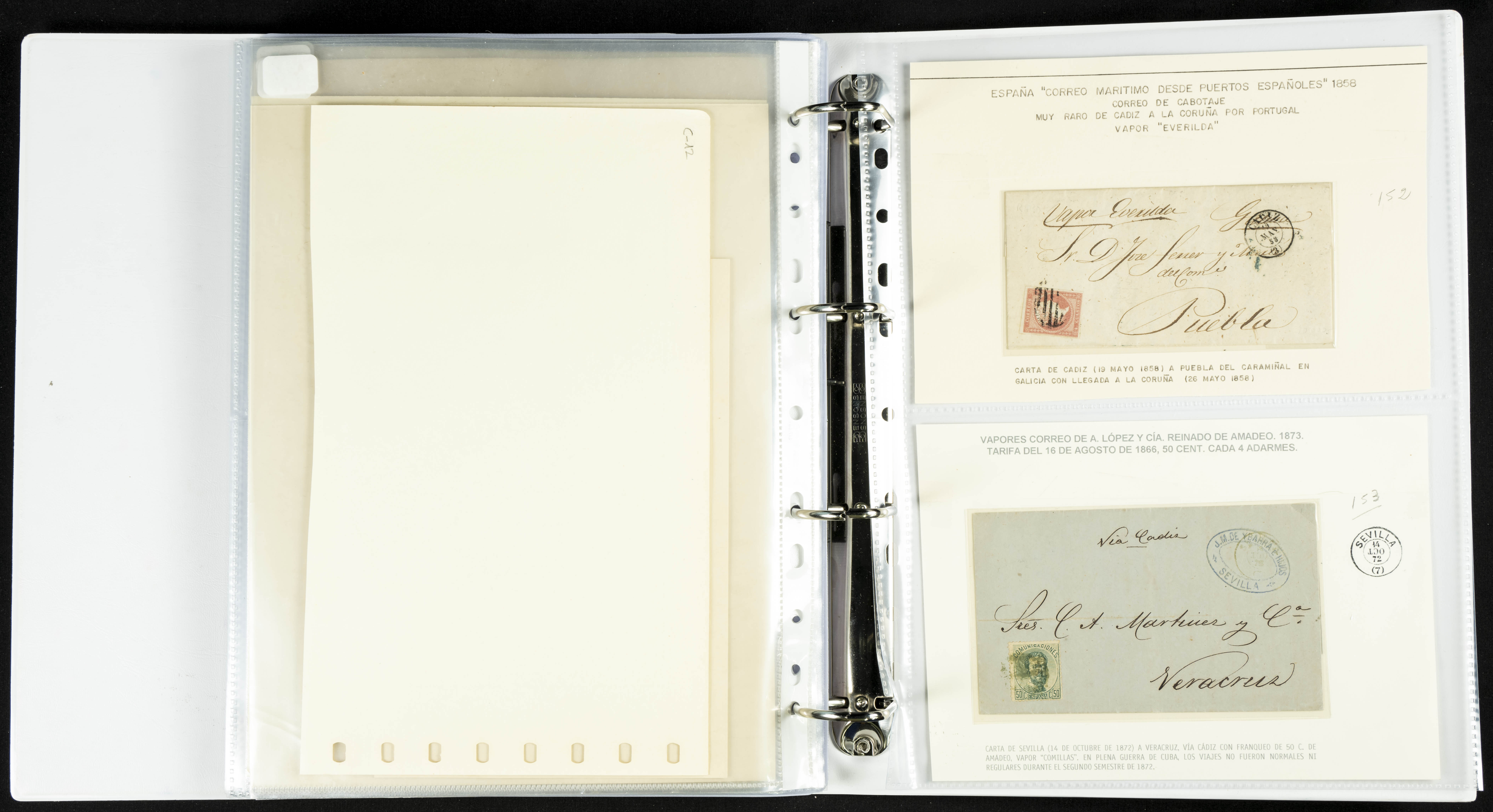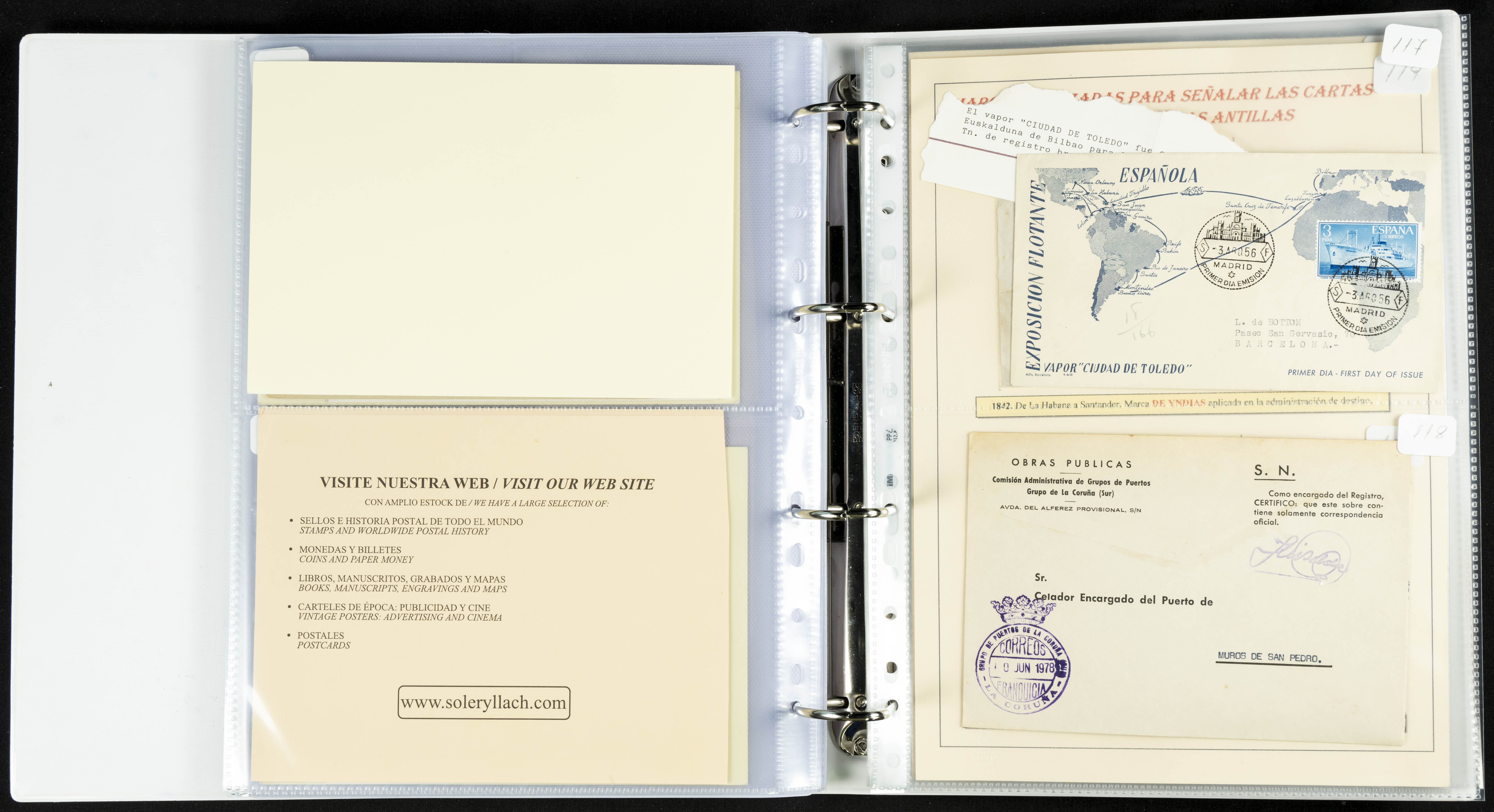 (1816ca). An impressive collection of correspondence transported by steamship between 1816 and 1940 from Spain and abroad. From Spain, highlights include letters from coastal steamships of different periods, letters from Cuba with various markings, pre-philatelic items, maritime mail markings, etc. From abroad, noteworthy are some letters from French steamships (Messageries Maritimes) with octagonal and British date stamps, as well as some shipping manifests. This is a very advanced collection that serves as a foundation for completing a large collection in this area of postal history. A MUST-SEE.