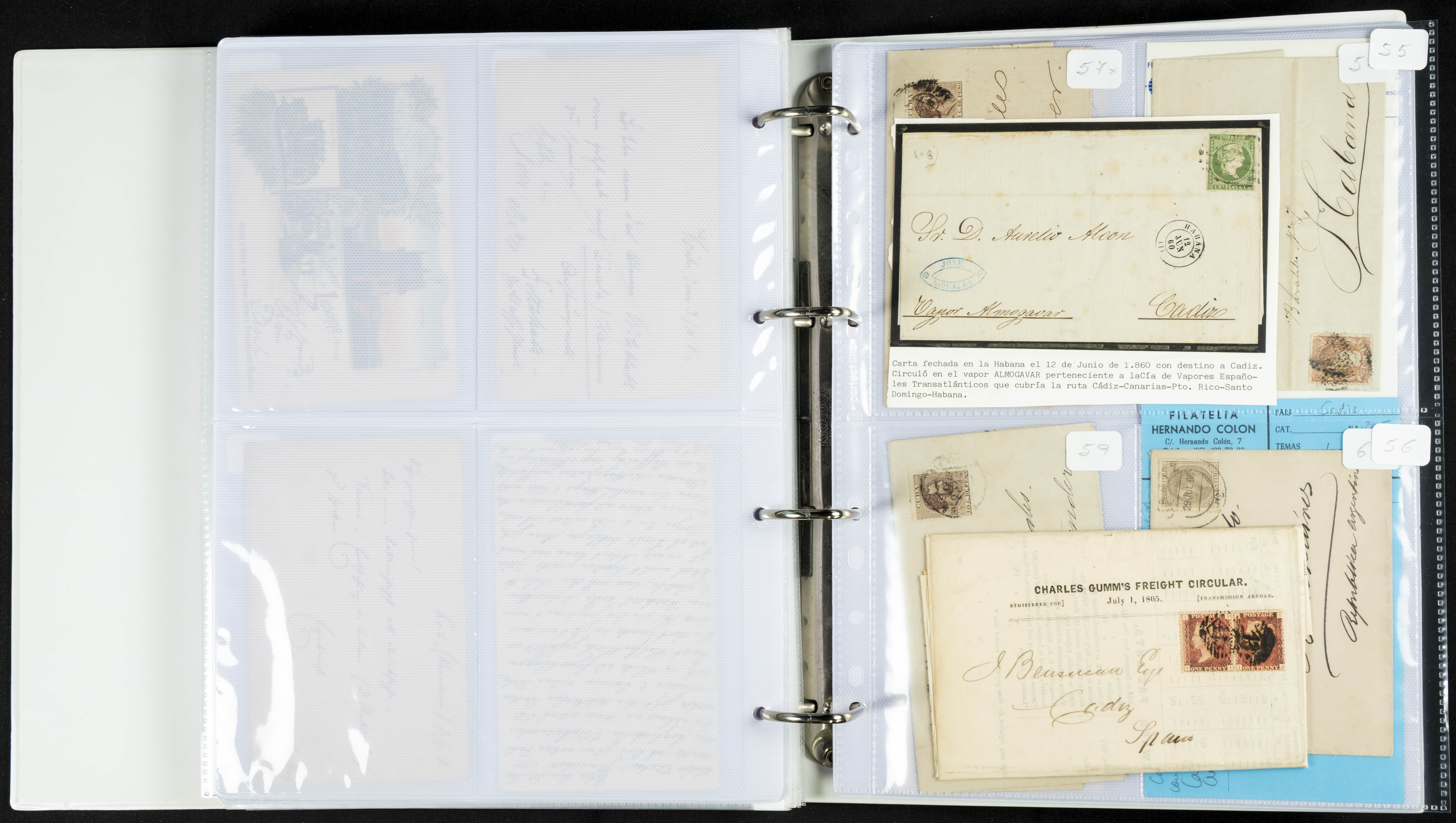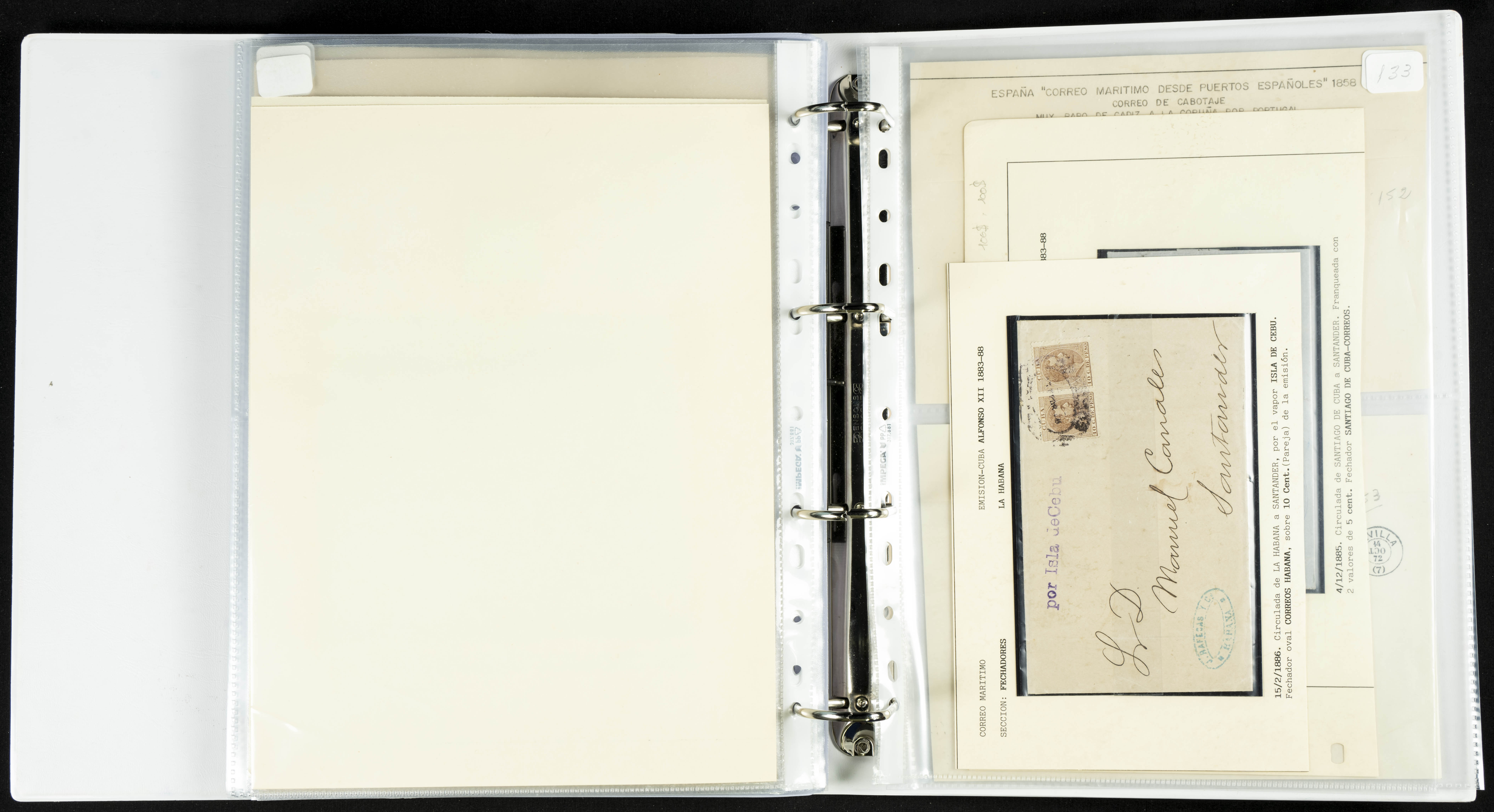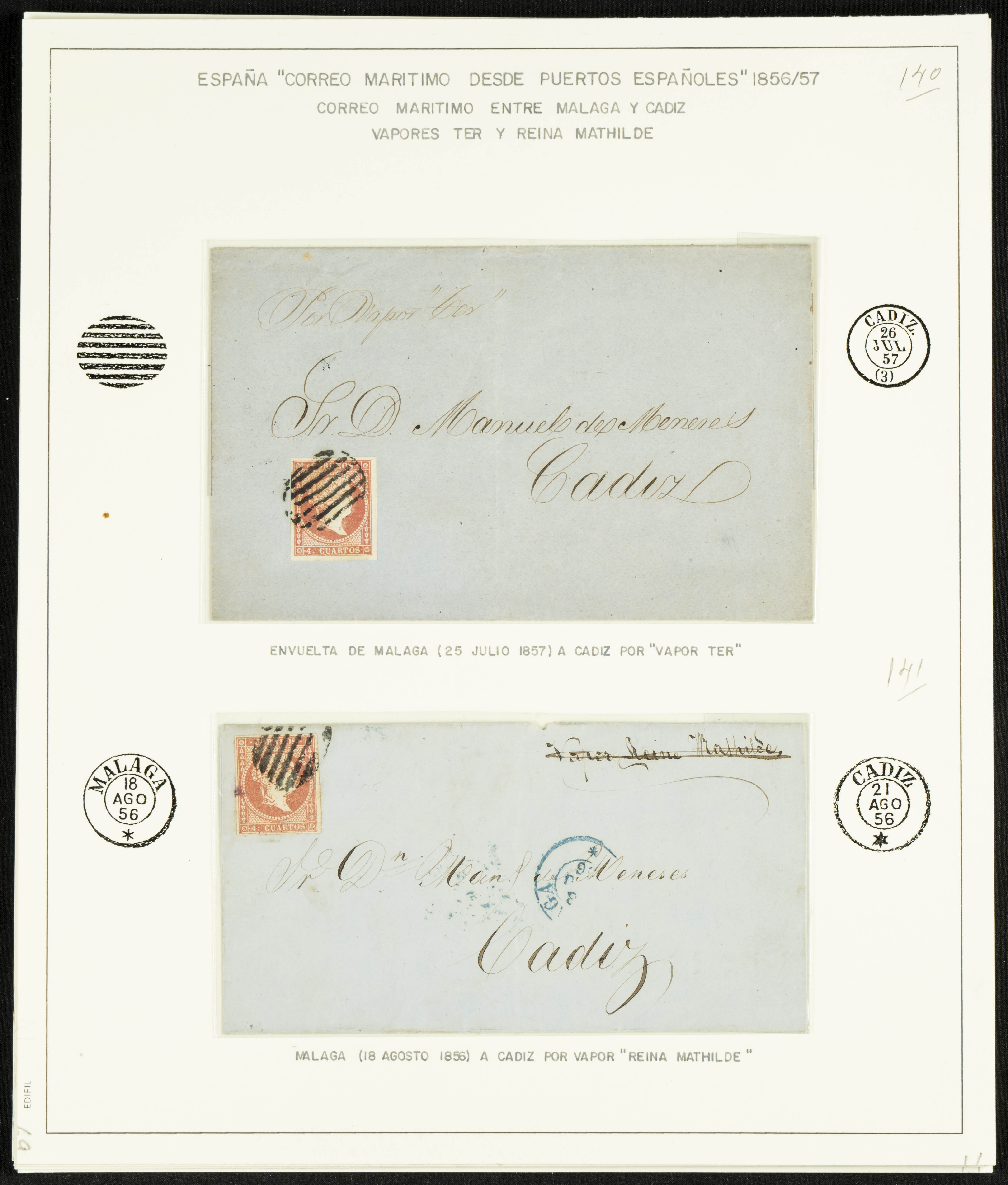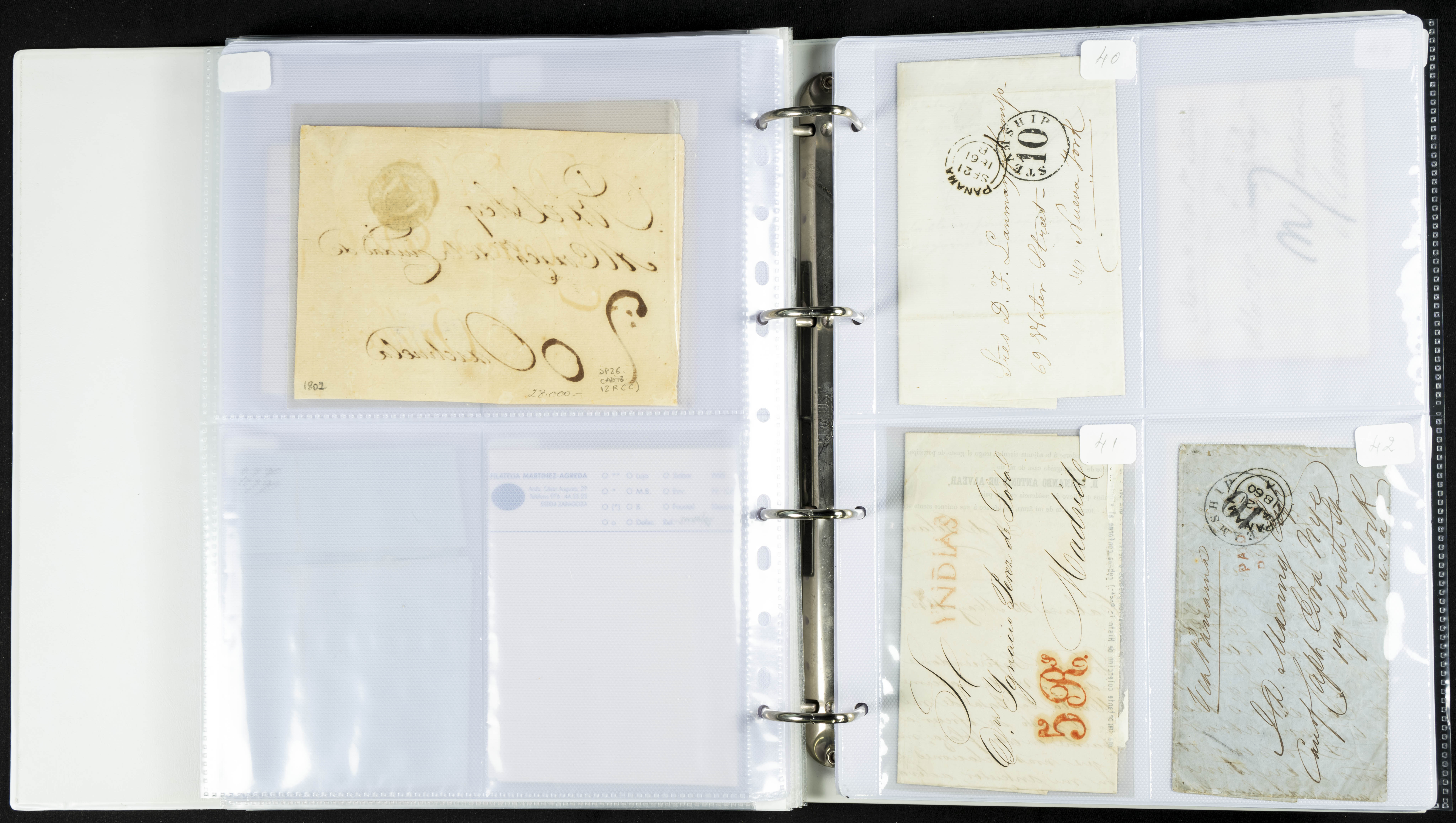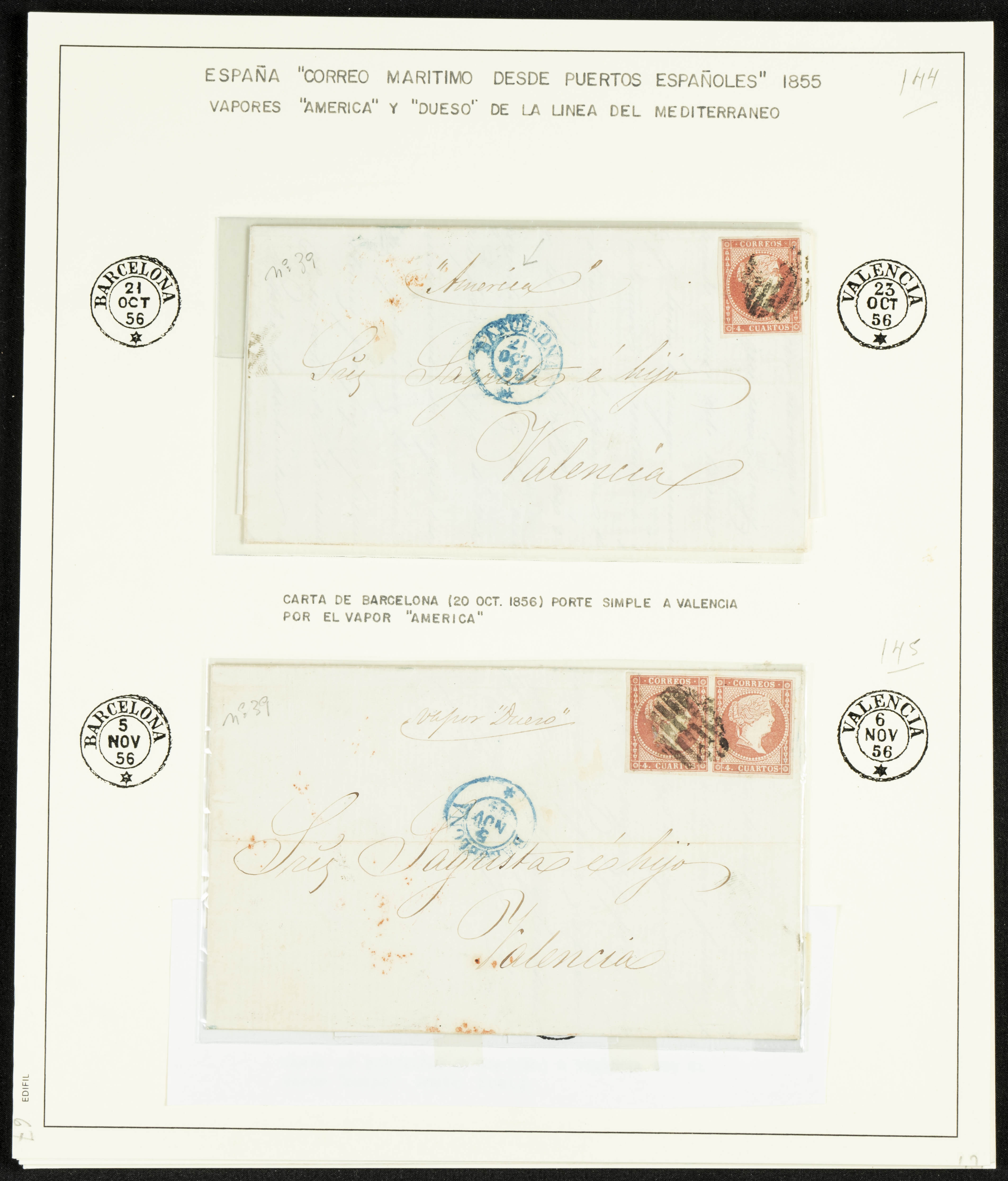 (1816ca). An impressive collection of correspondence transported by steamship between 1816 and 1940 from Spain and abroad. From Spain, highlights include letters from coastal steamships of different periods, letters from Cuba with various markings, pre-philatelic items, maritime mail markings, etc. From abroad, noteworthy are some letters from French steamships (Messageries Maritimes) with octagonal and British date stamps, as well as some shipping manifests. This is a very advanced collection that serves as a foundation for completing a large collection in this area of postal history. A MUST-SEE.