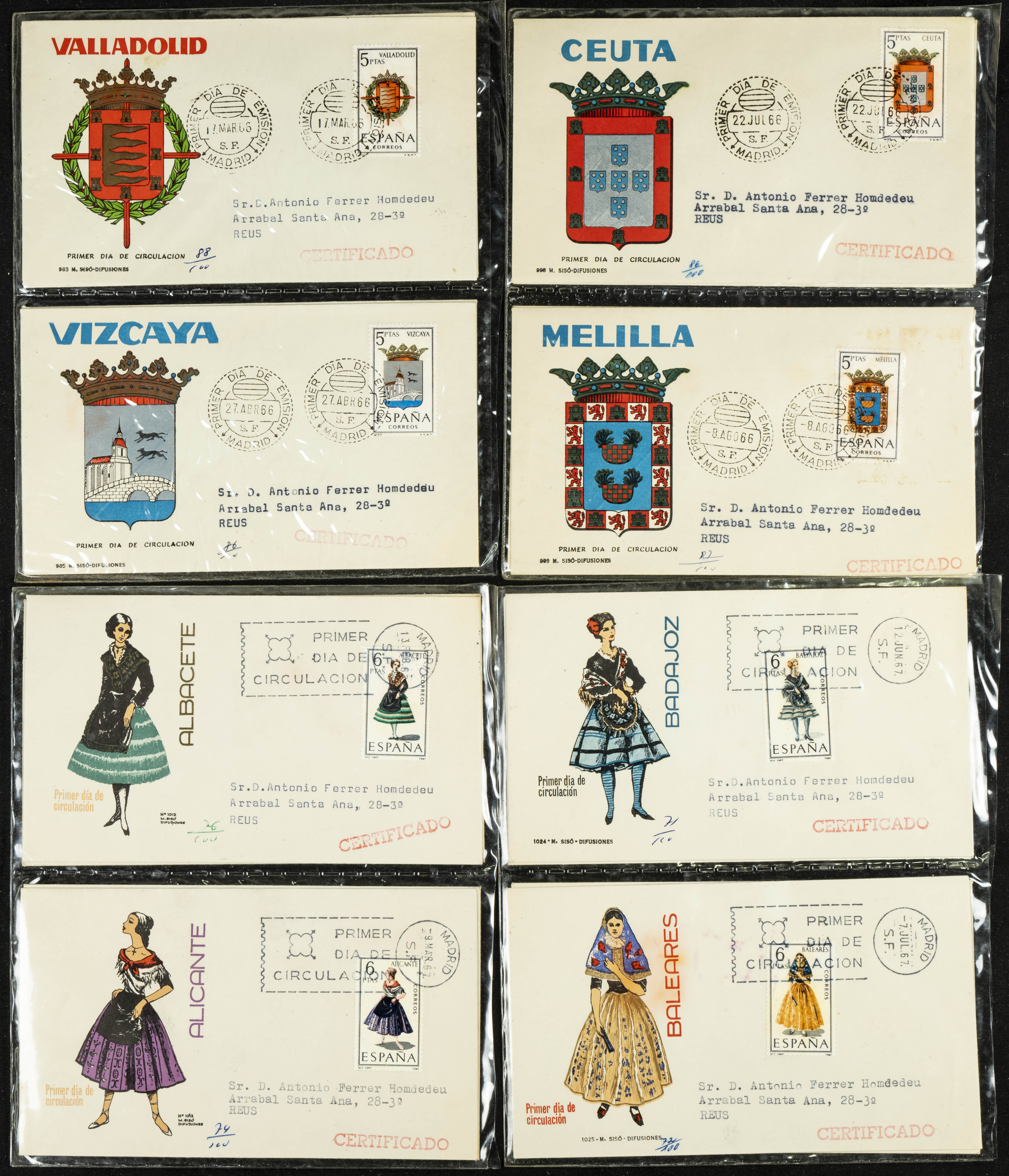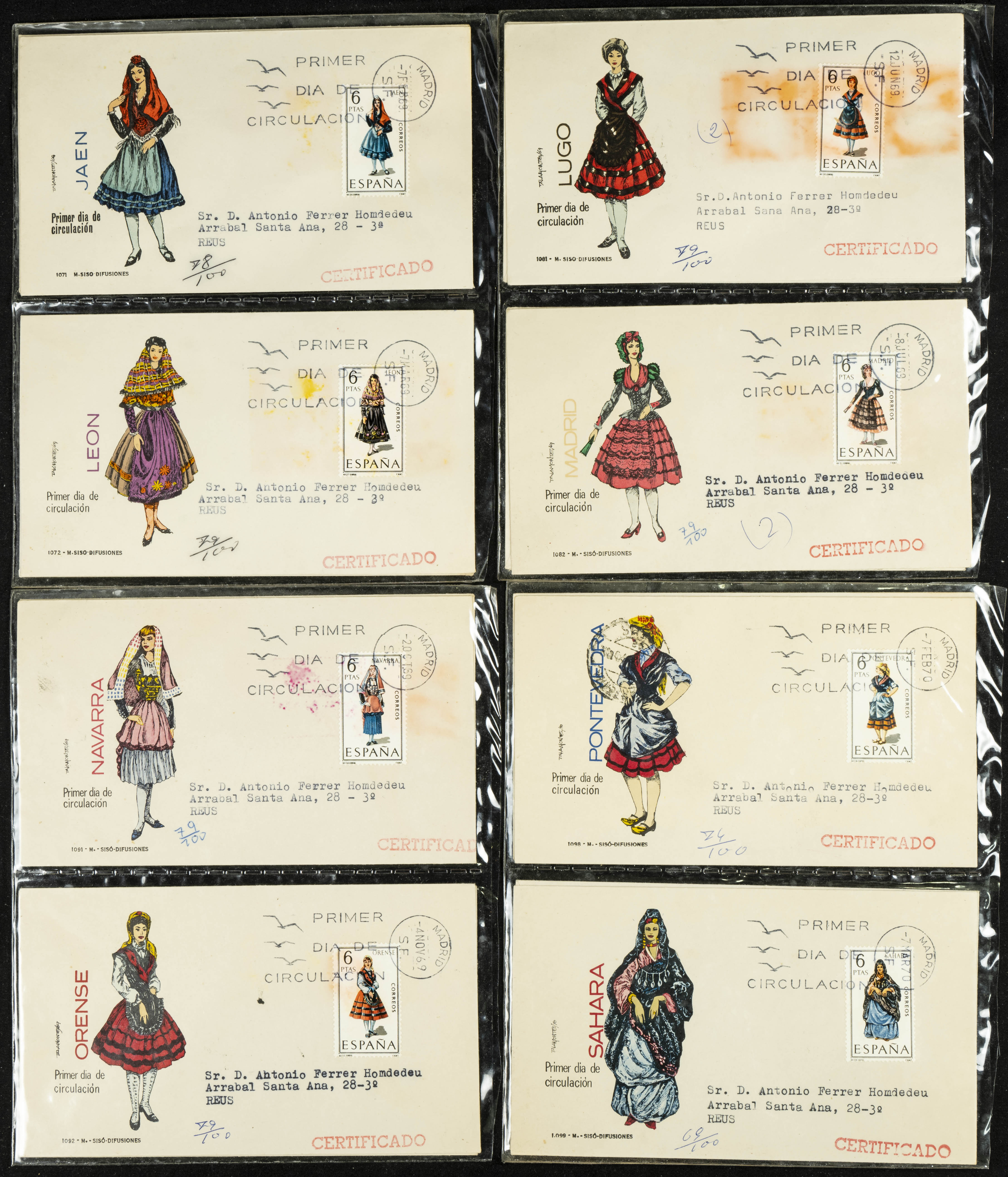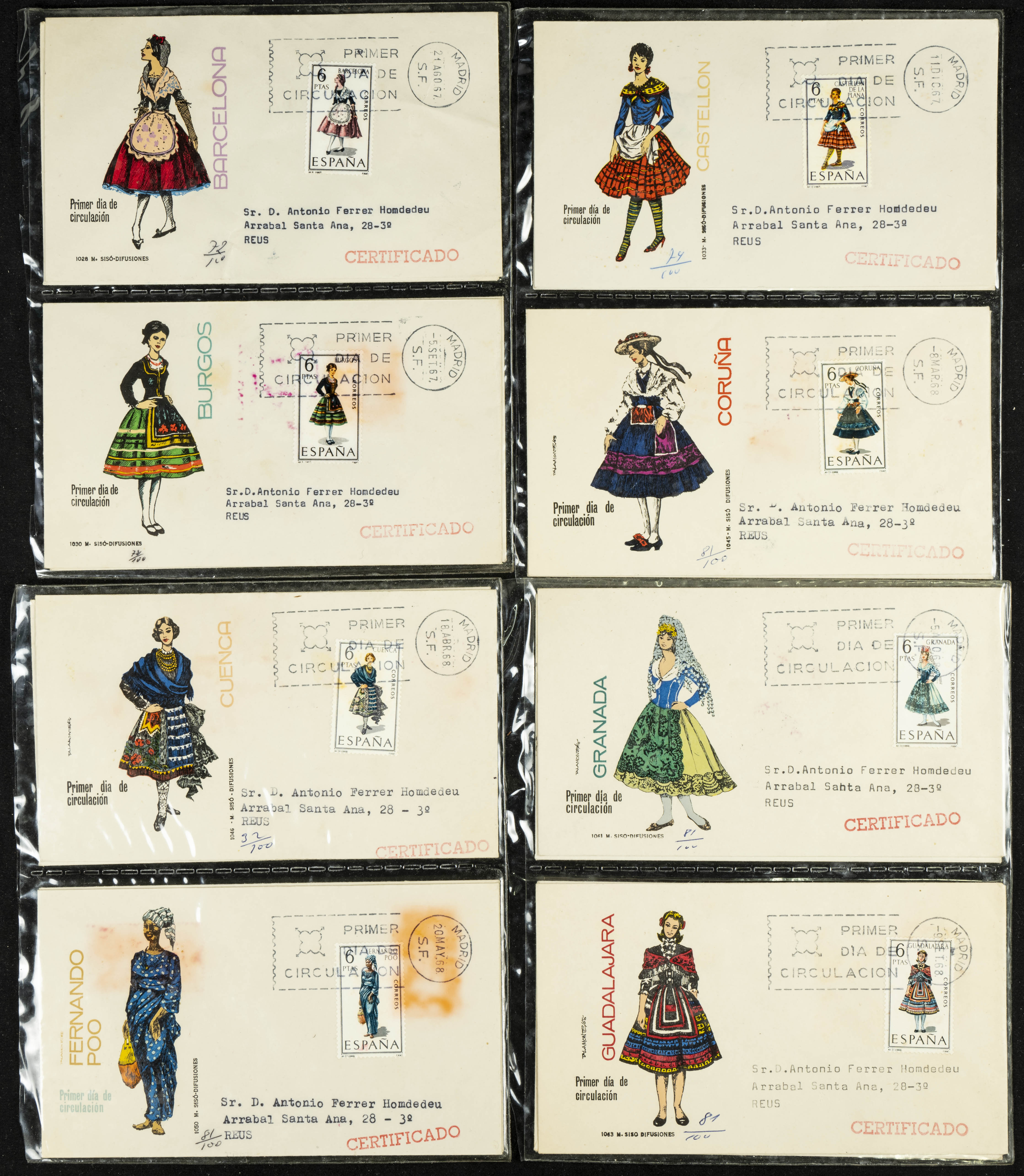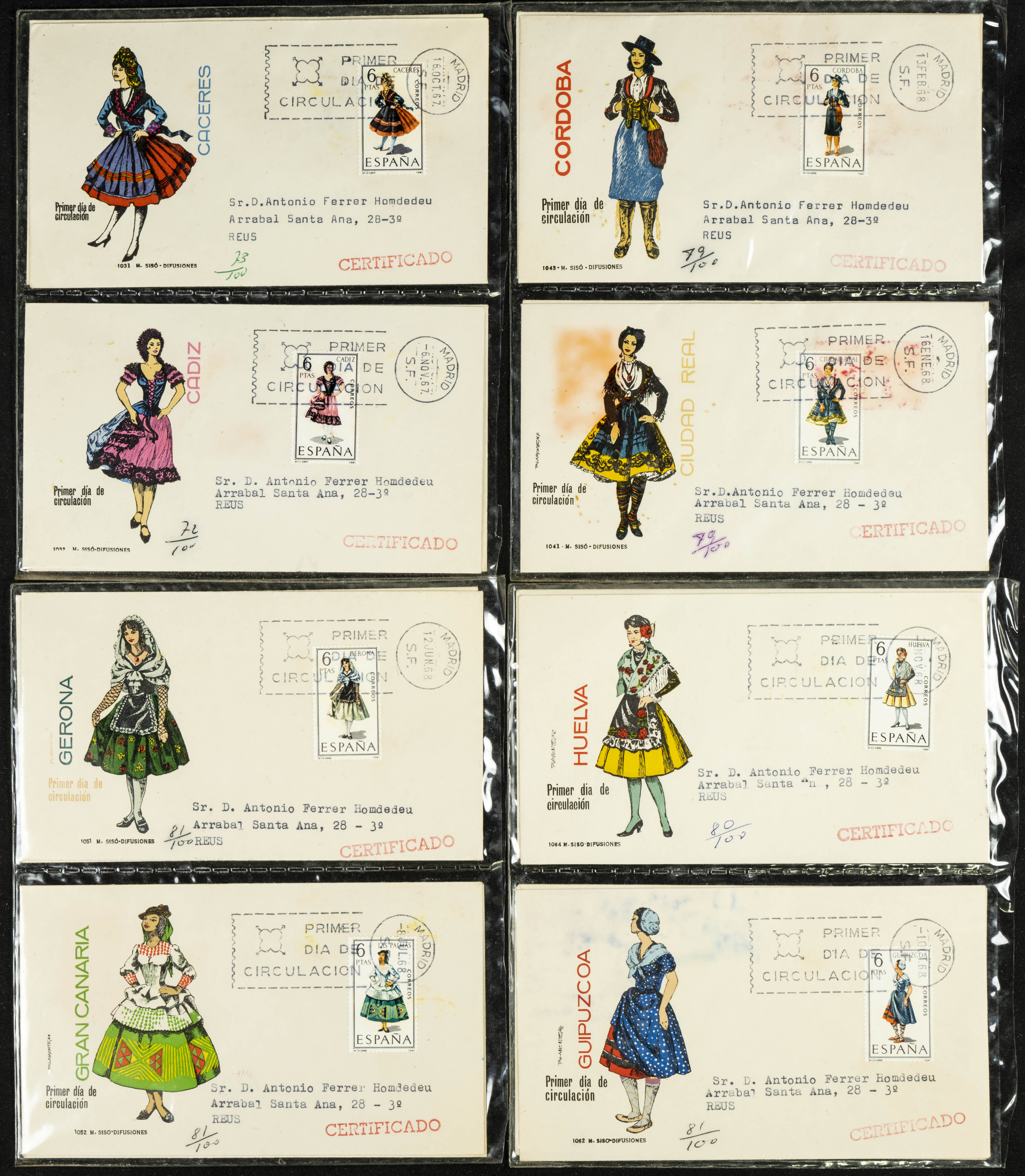 (circa 1838). Set of eight letters from various periods, four pre-philatelic (one from France, two with the FRANCE mark from Jaca, one with the ALMODOBAR / MANCHA VAJA mark, and one with 50 mils from 1868 postmarked Alaejos), and three from the 1930s and 1940s, one franked with three 4-pt pink stamps addressed to Palestine. Includes an album with complete sets of circulated First Day Covers of Coats of Arms and Suits. TO BE EXAMINED.