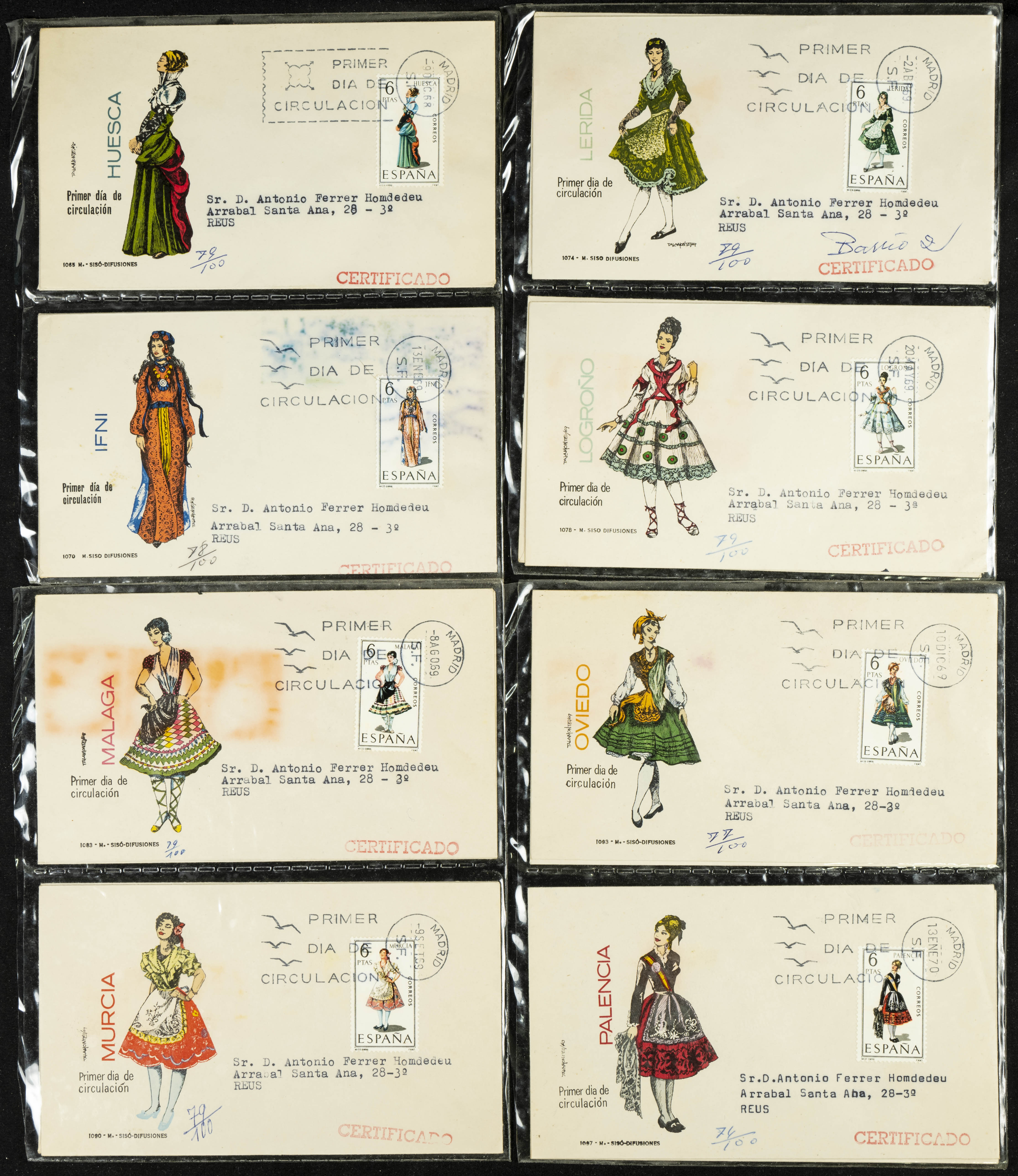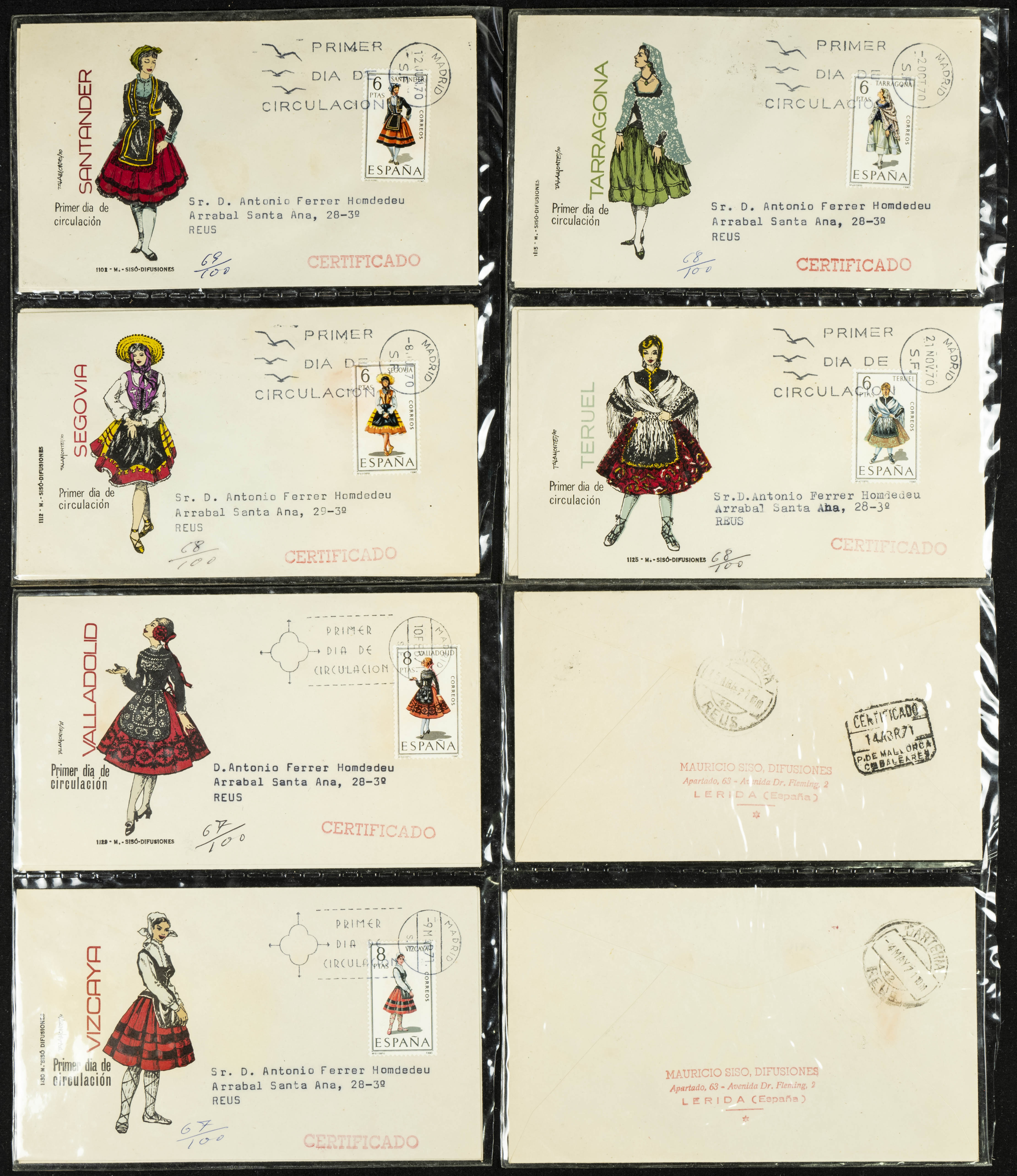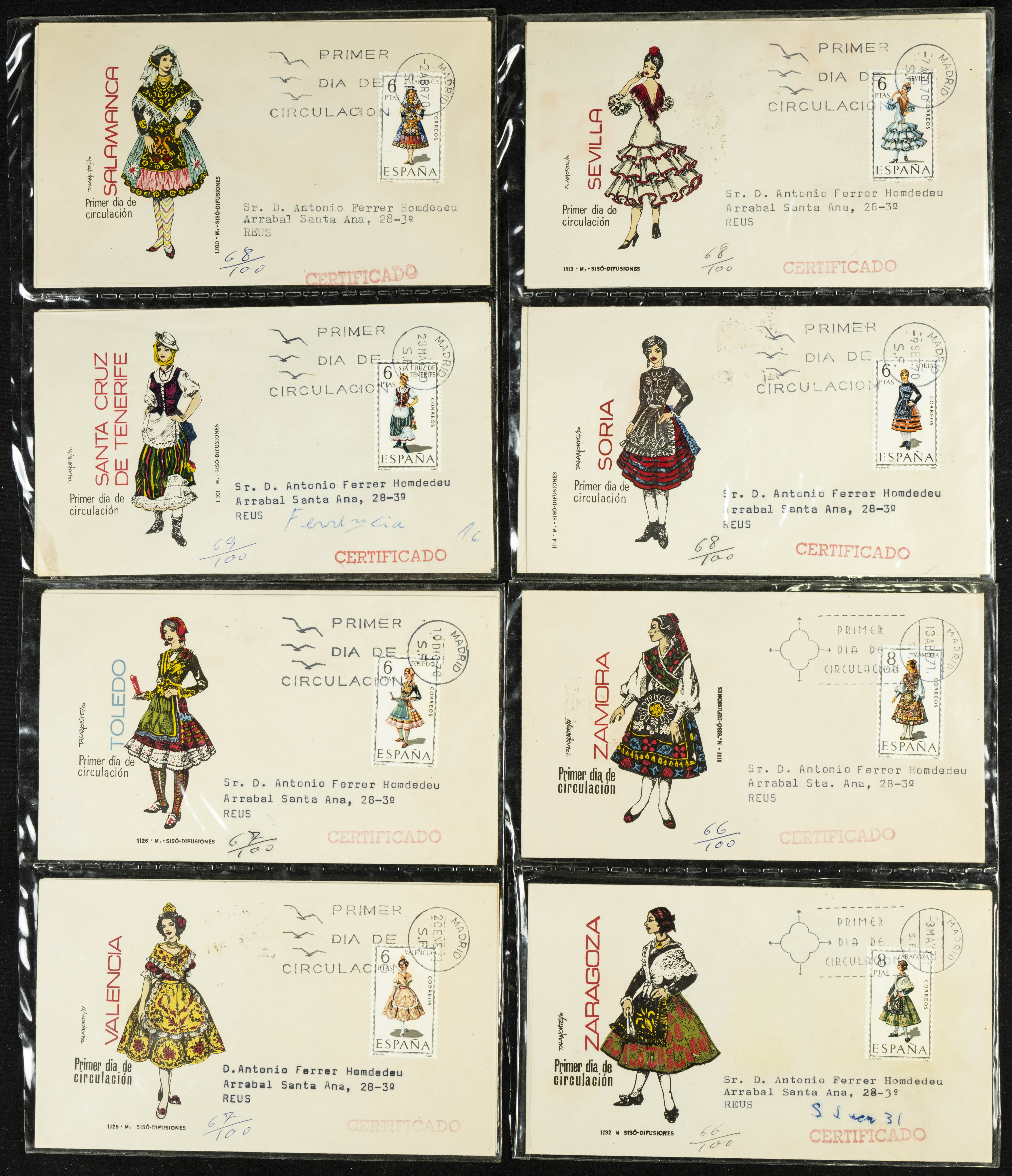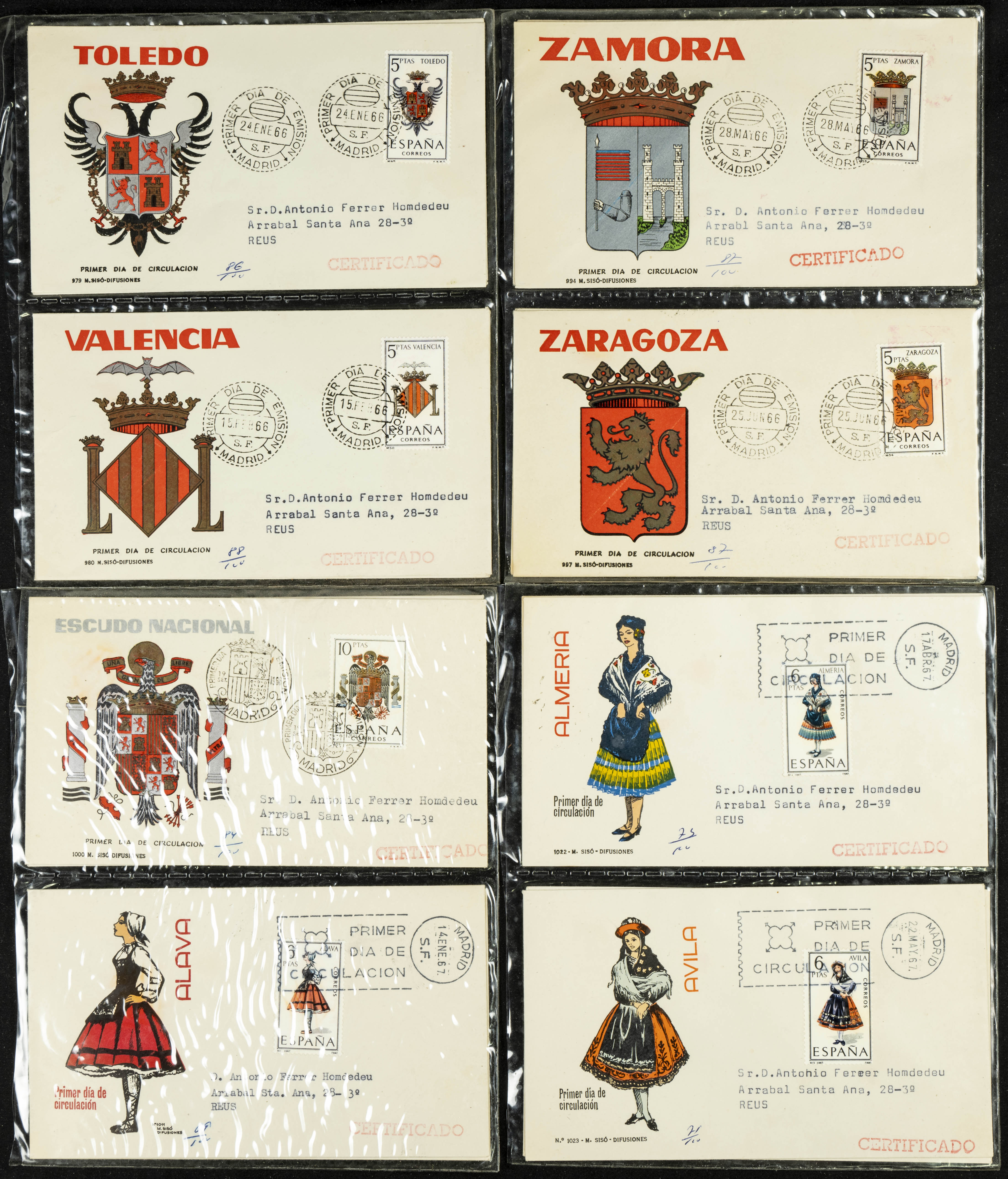 (circa 1838). Set of eight letters from various periods, four pre-philatelic (one from France, two with the FRANCE mark from Jaca, one with the ALMODOBAR / MANCHA VAJA mark, and one with 50 mils from 1868 postmarked Alaejos), and three from the 1930s and 1940s, one franked with three 4-pt pink stamps addressed to Palestine. Includes an album with complete sets of circulated First Day Covers of Coats of Arms and Suits. TO BE EXAMINED.