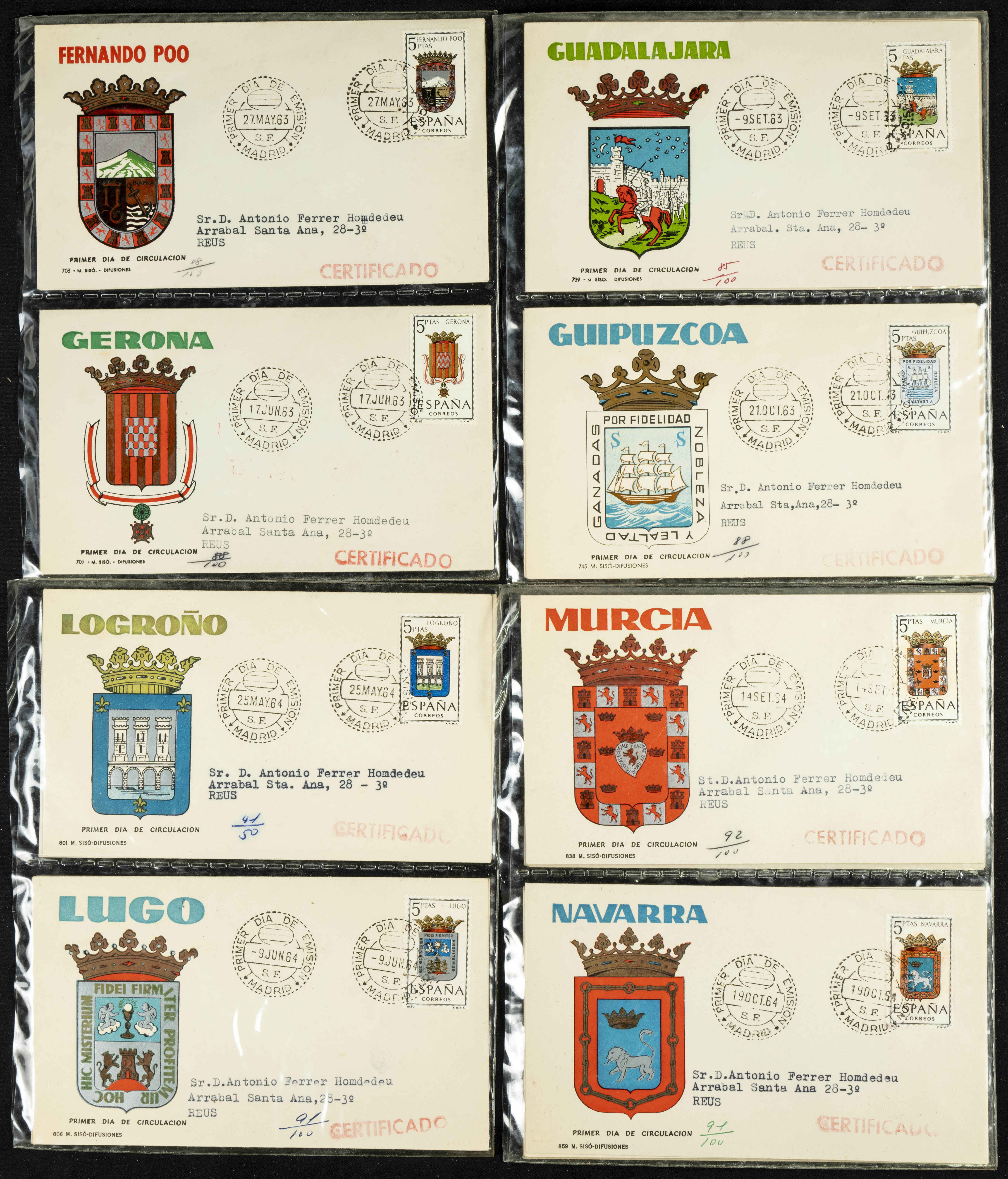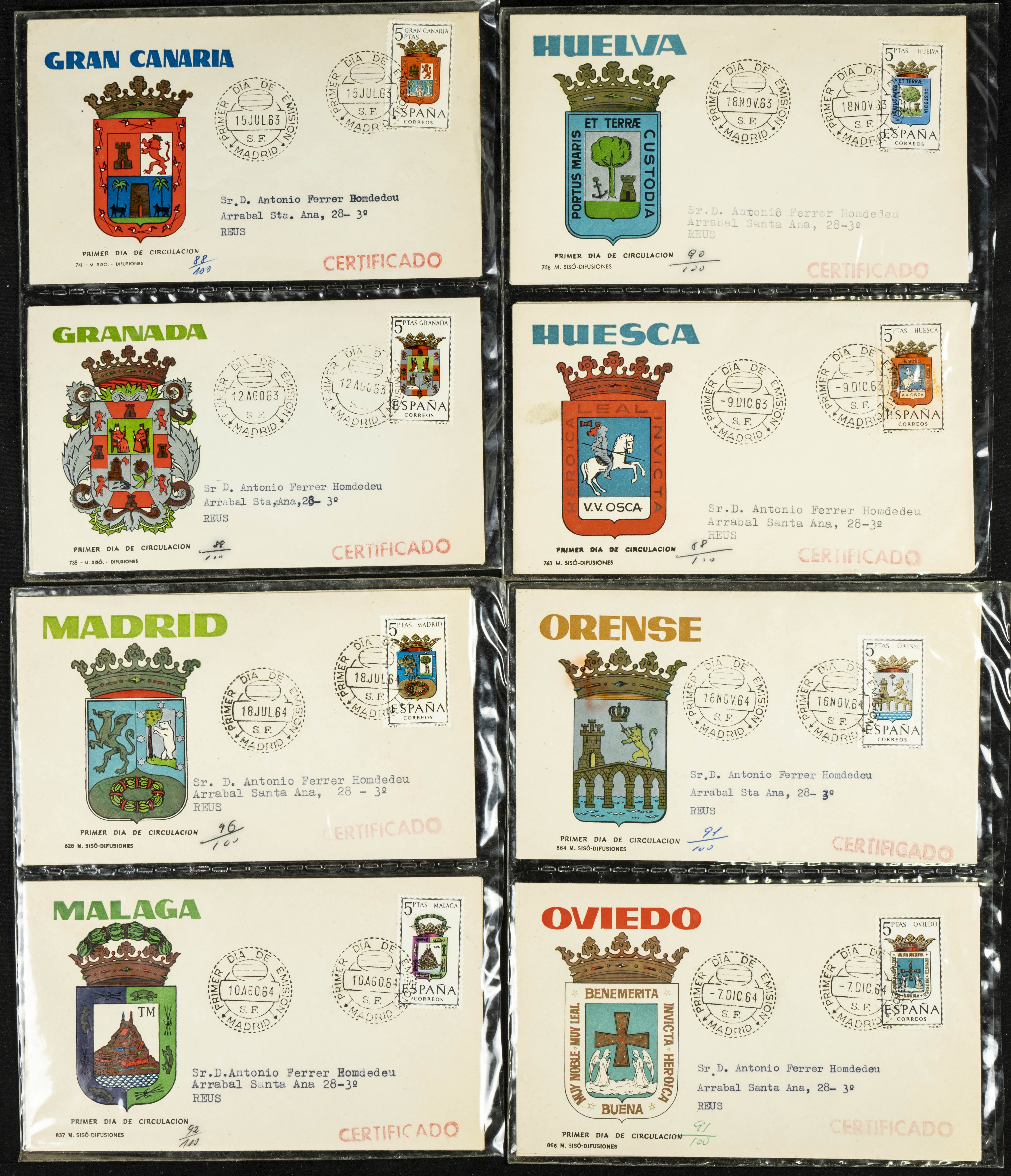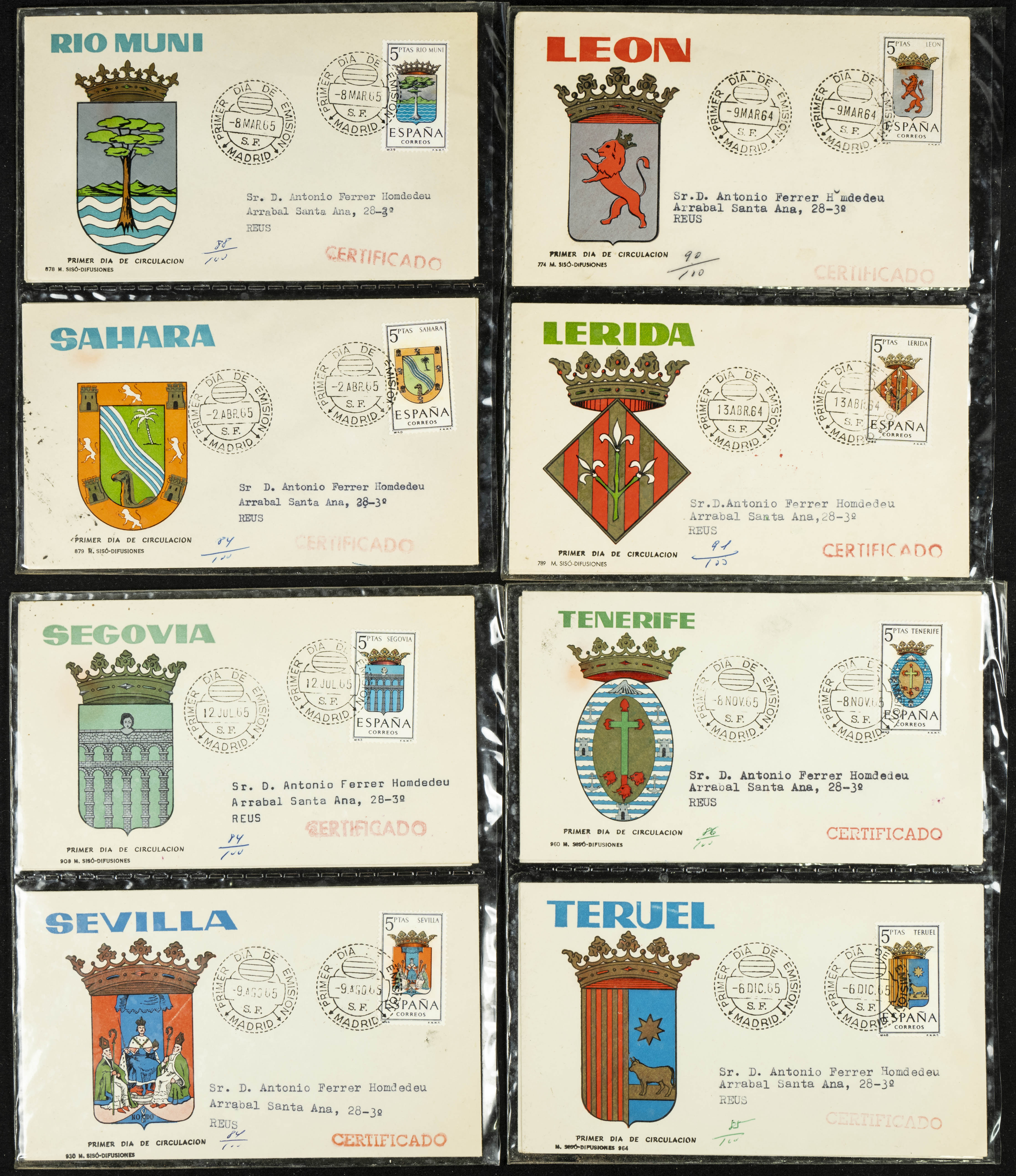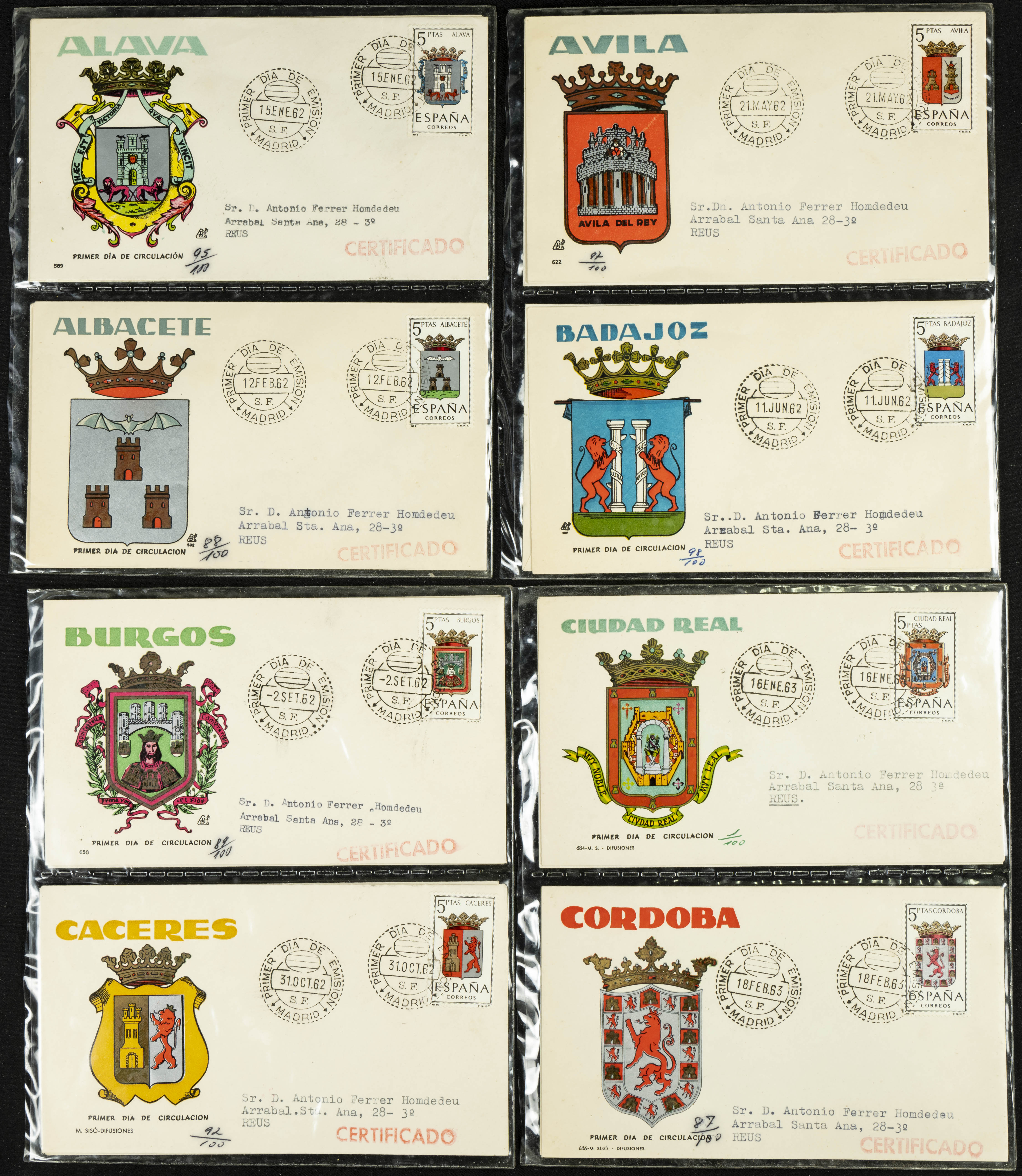 (circa 1838). Set of eight letters from various periods, four pre-philatelic (one from France, two with the FRANCE mark from Jaca, one with the ALMODOBAR / MANCHA VAJA mark, and one with 50 mils from 1868 postmarked Alaejos), and three from the 1930s and 1940s, one franked with three 4-pt pink stamps addressed to Palestine. Includes an album with complete sets of circulated First Day Covers of Coats of Arms and Suits. TO BE EXAMINED.