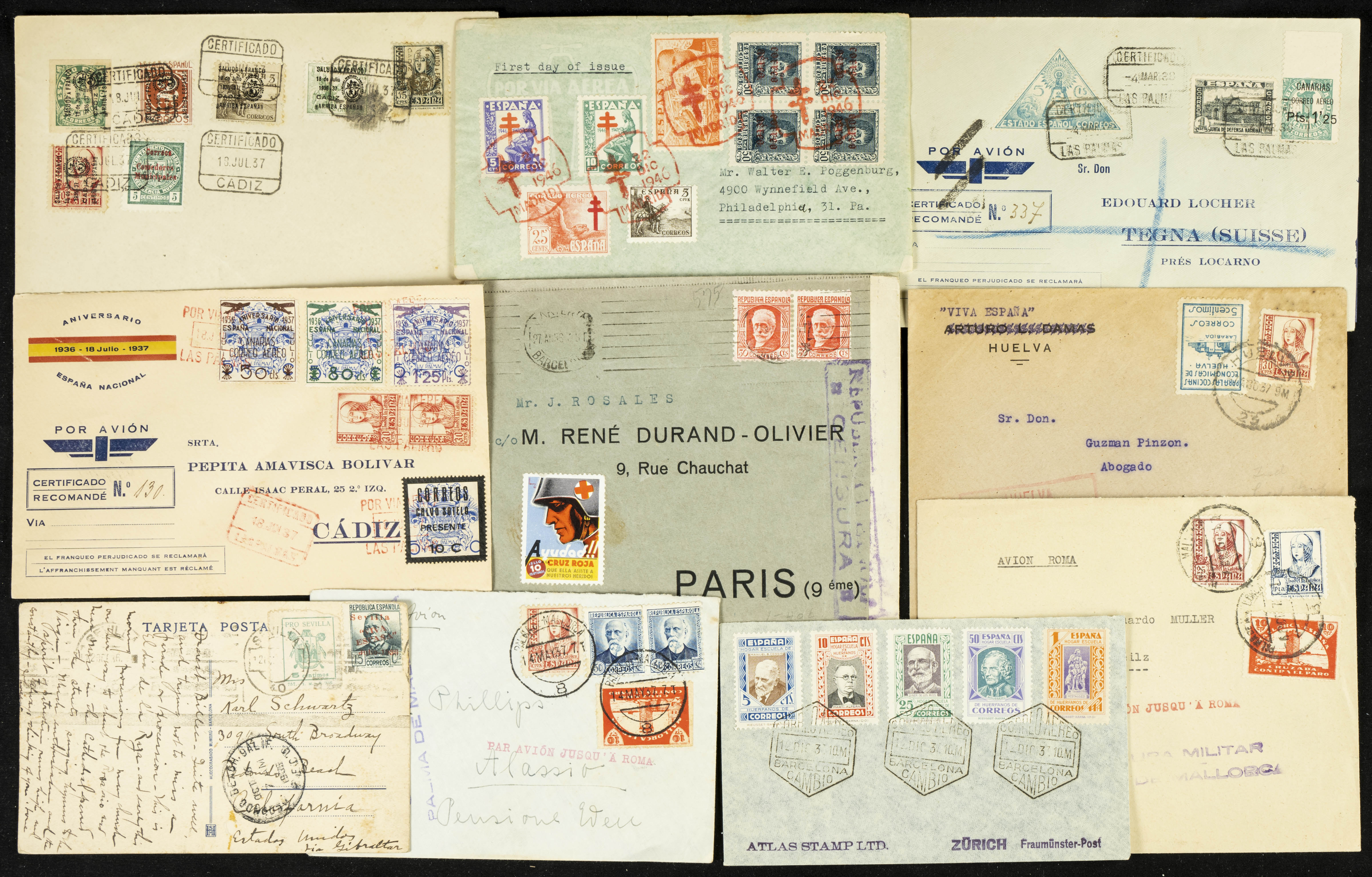 (1936ca). Collection of more than eighty letters and postal stationery cards, circulated between 1936 and 1939, including various postages, Patriotic, Canary Islands, souvenir sheets, etc. TO BE EXAMINED.
