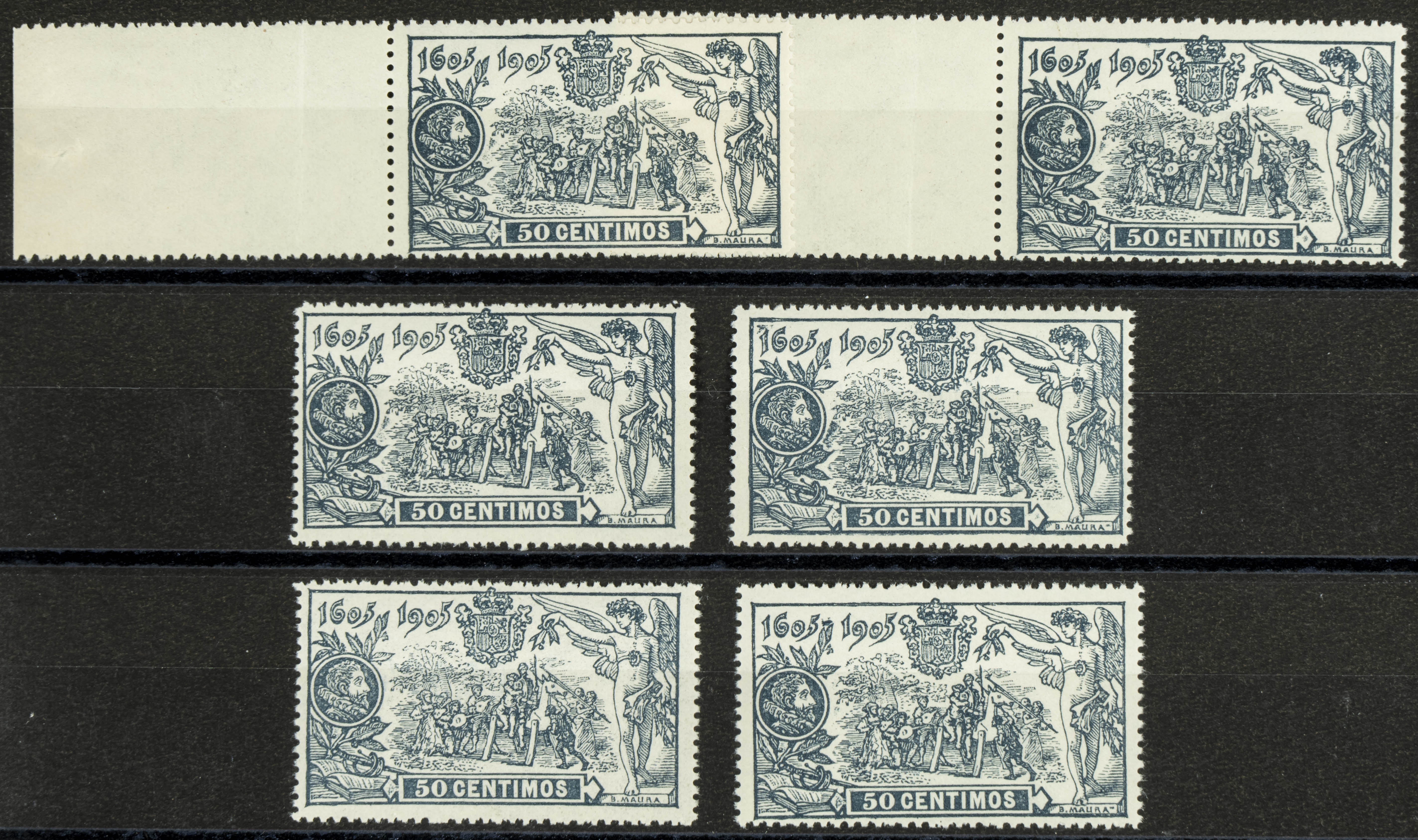 ★★ 263(6). 1905. Six 50-cent blue-gray stamps. QUIXOTE (some well-centered). TO BE EXAMINED. Edifil 2026: 312 Euros