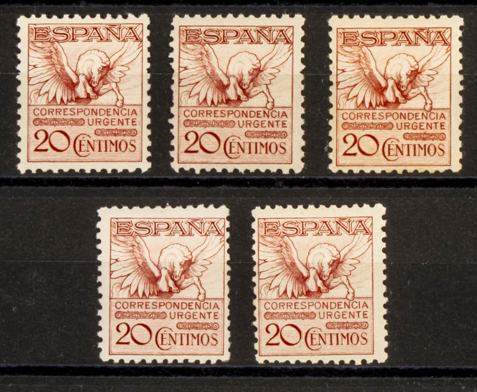 English ★★/★ 592A(5). 1931. 20 cts pink, five stamps (two with hinges). PEGASO. TO BE EXAMINED. Edifil 2026: 510 Euros