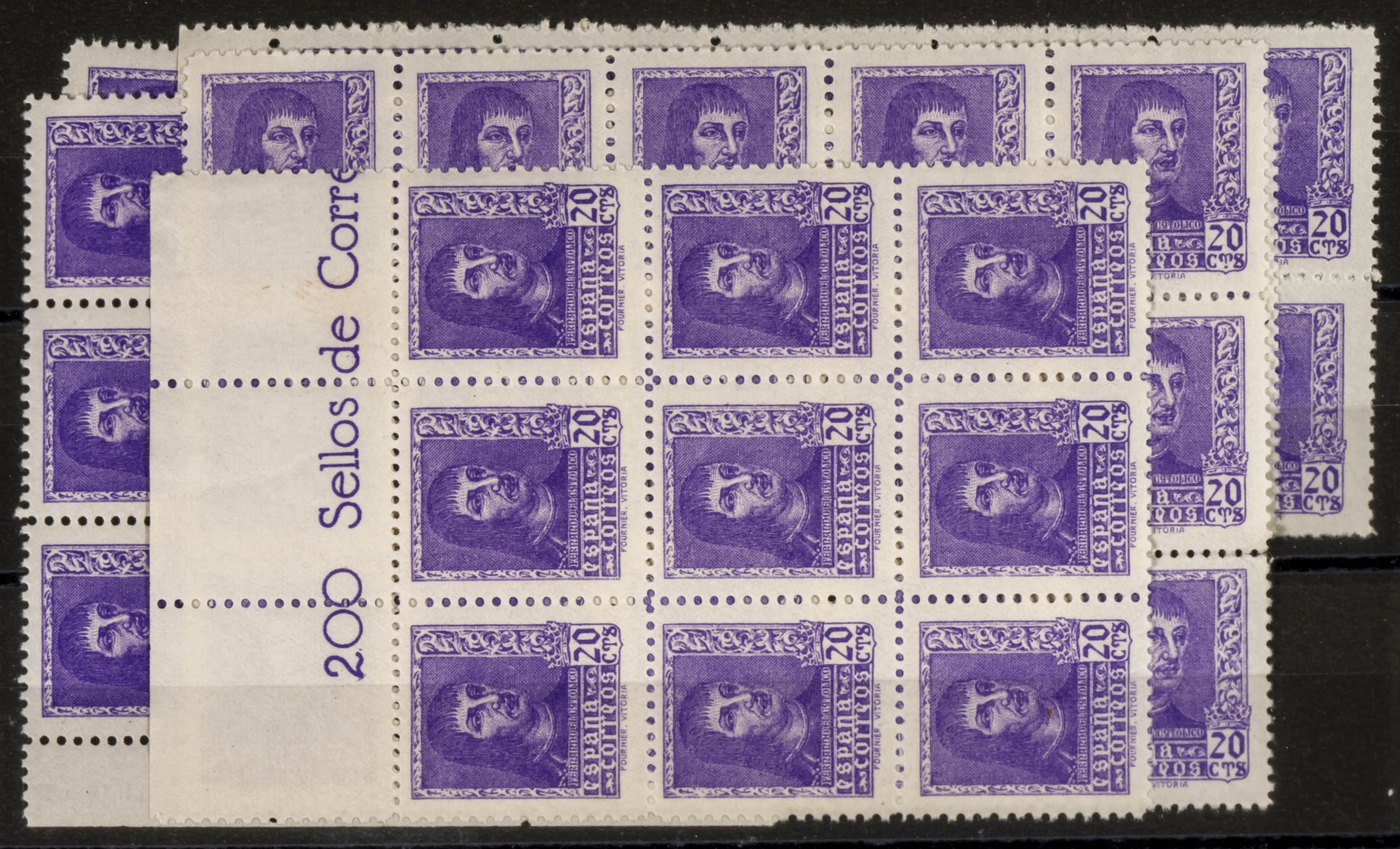 English ★★ 842(50). 1938. 20 cts violet, fifty stamps. FERNANDO (good quality overall). TO BE EXAMINED. Edifil 2026: 1,050 Euros