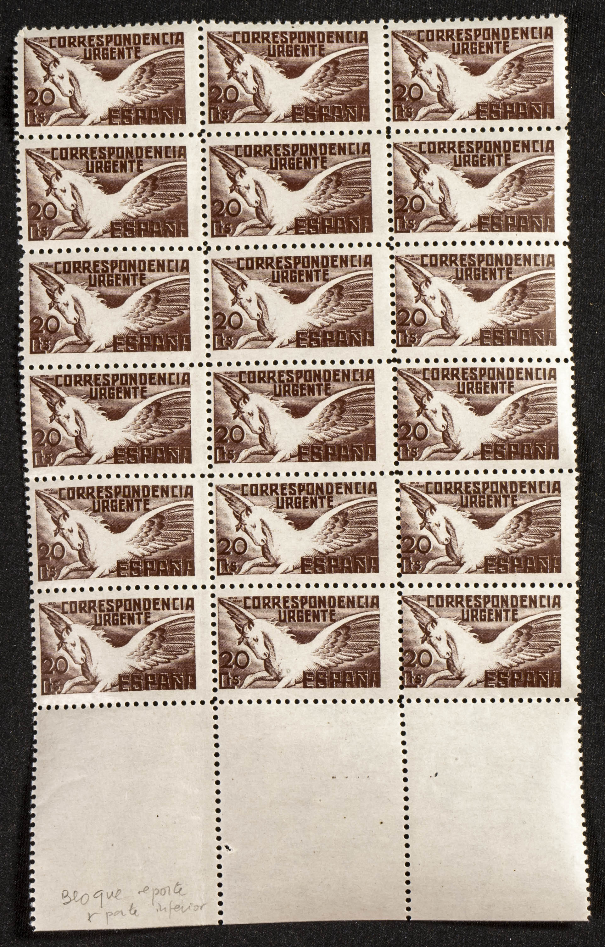 ★★ 861(18). 1938. 20 cts chestnut PEGASO, block of eighteen and leaf edge (good quality overall). MAGNIFICENT. Edifil 2026: 72 Euros